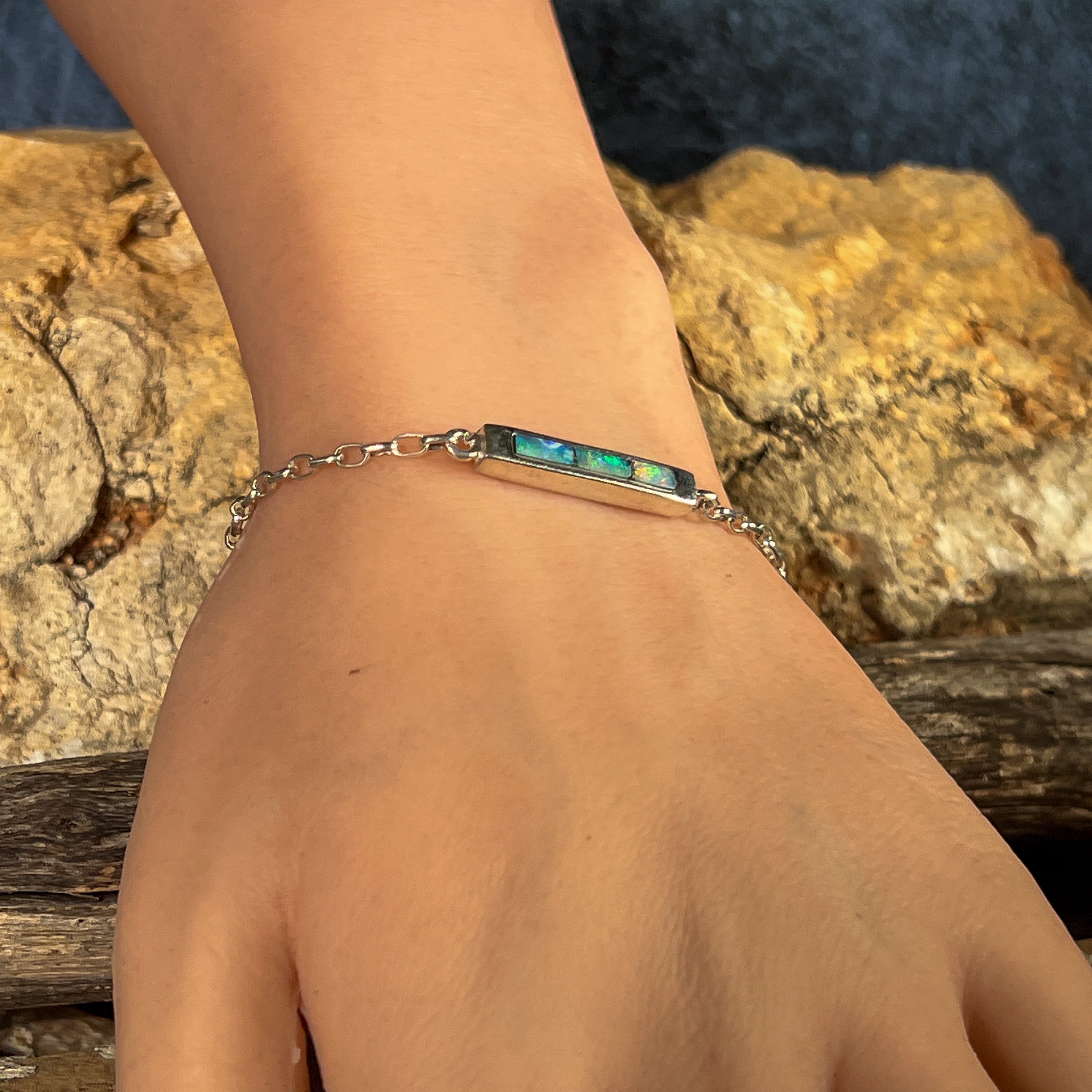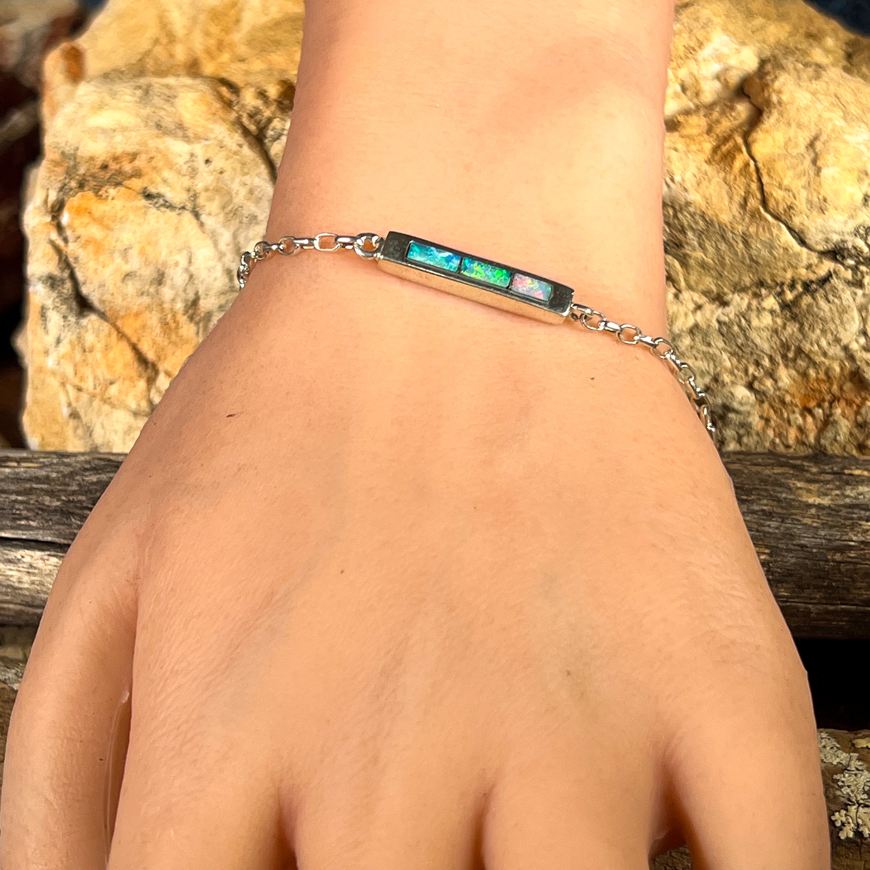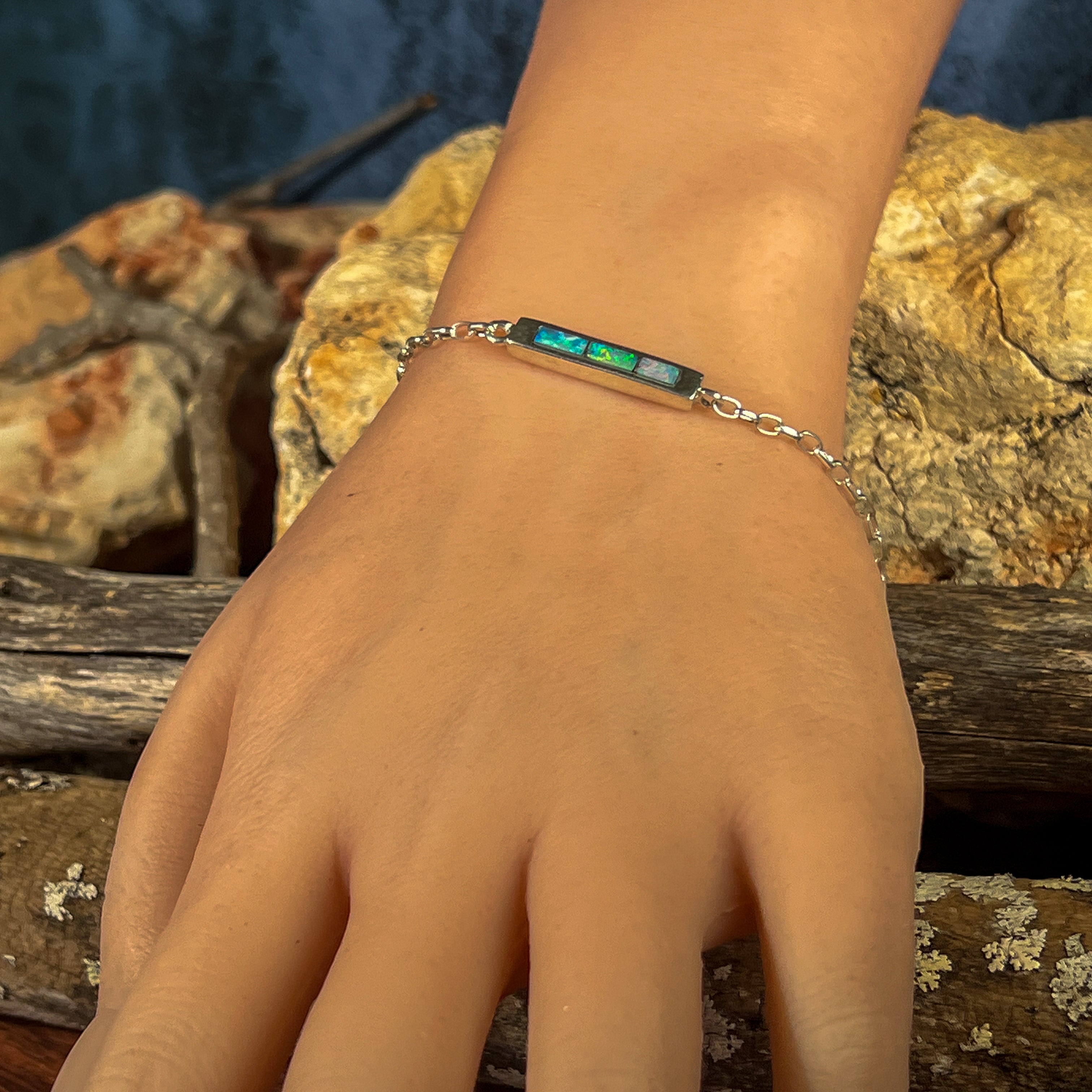 Elevate your collection with this Sterling Silver Opal Inlay 3 Box Bracelet, expertly crafted to showcase the iridescent beauty of natural opal. The intricate opal inlay is set within a durable sterling silver framework, offering both elegance and lasting quality. Its refined design is perfect for sophisticated styling, seamlessly complementing both casual and formal attire with a subtle play of colour and light. This bracelet is a timeless piece for those who appreciate fine craftsmanship and natural gemstone allure.