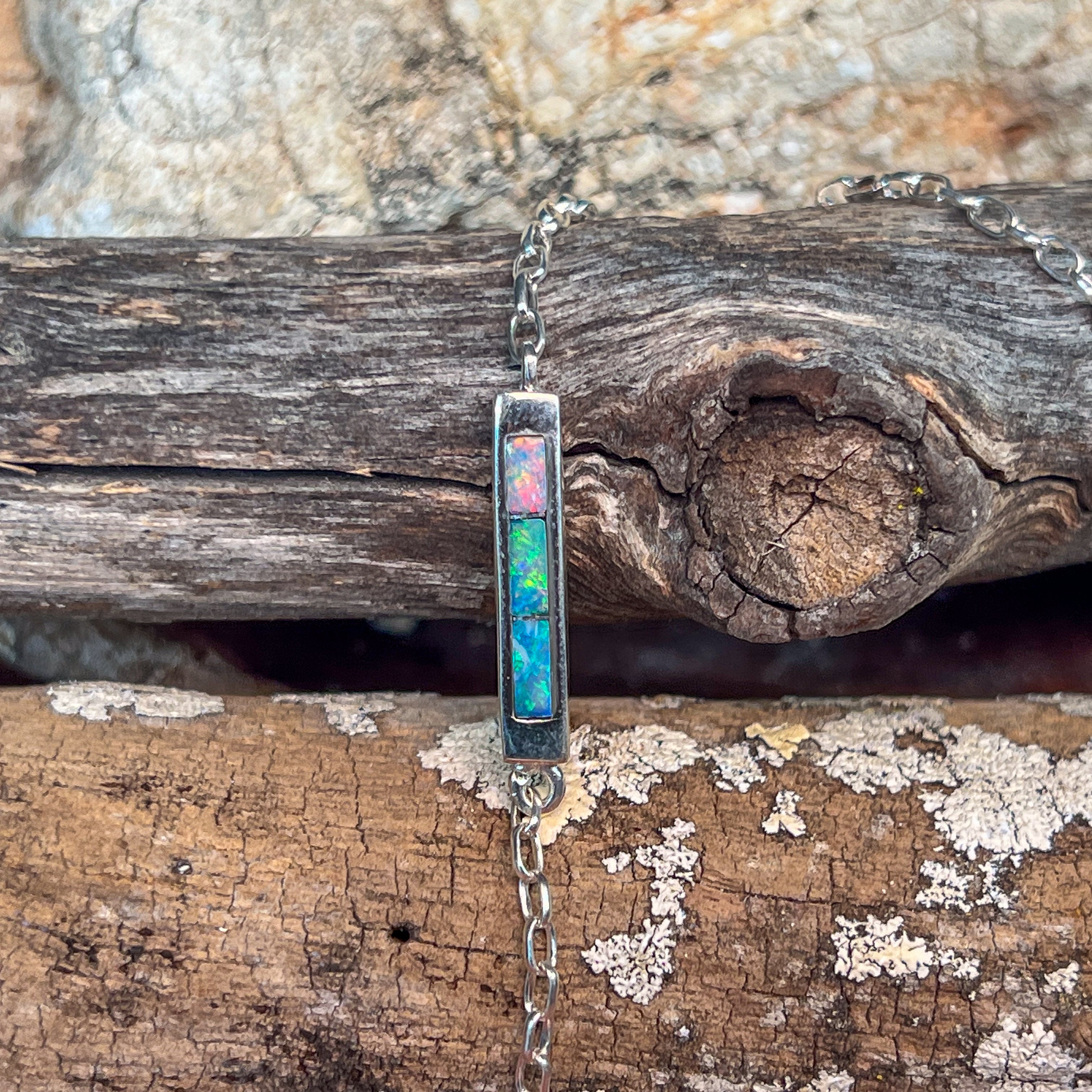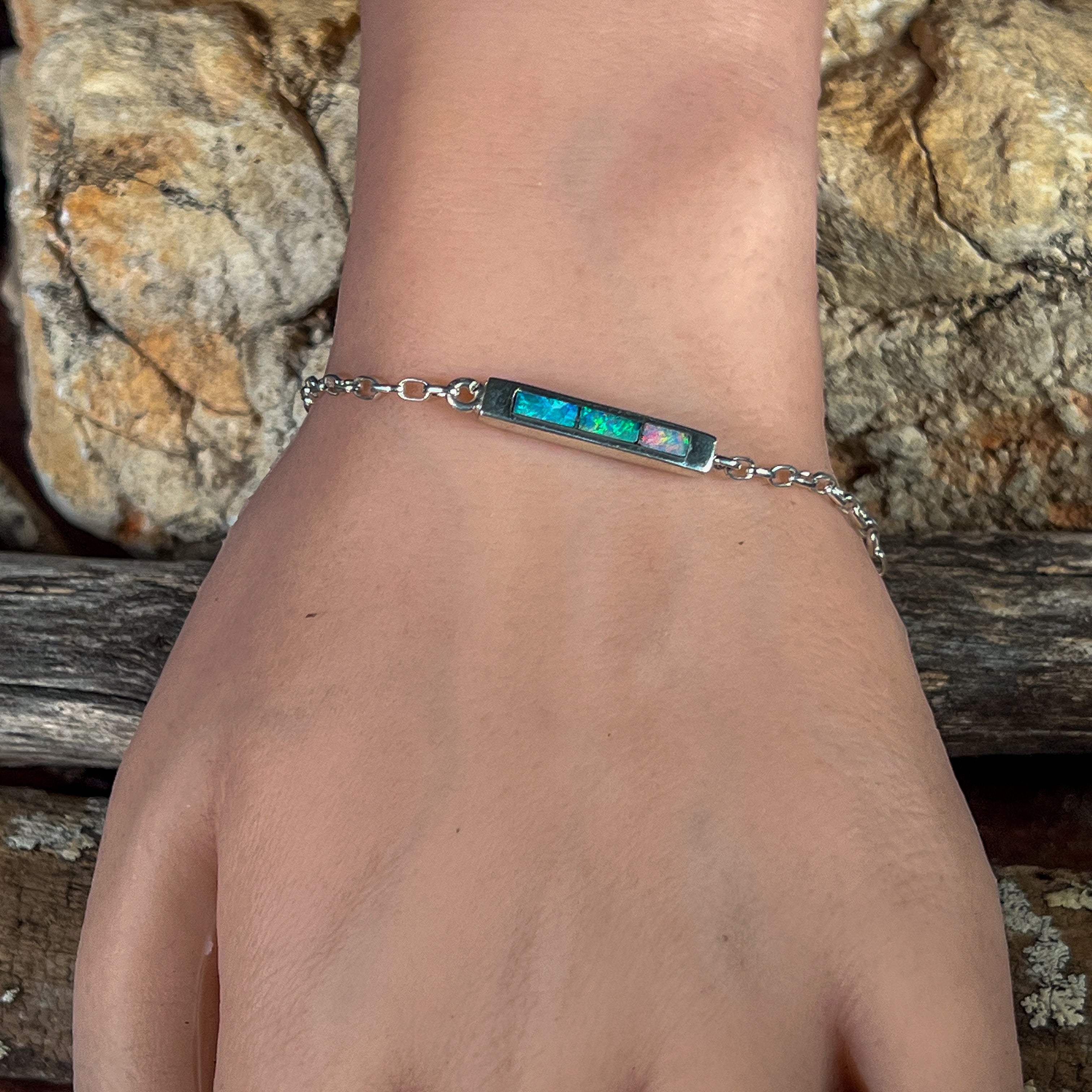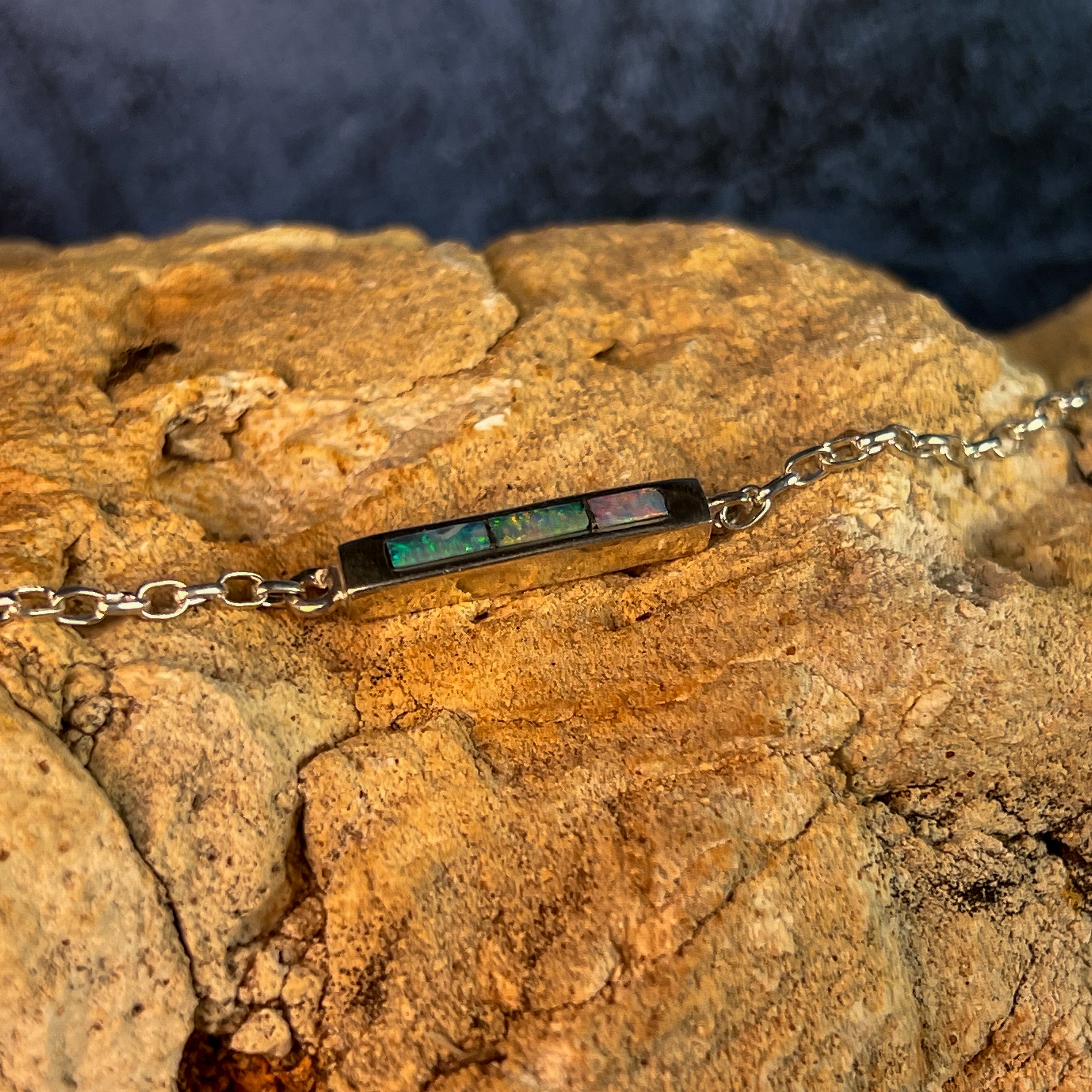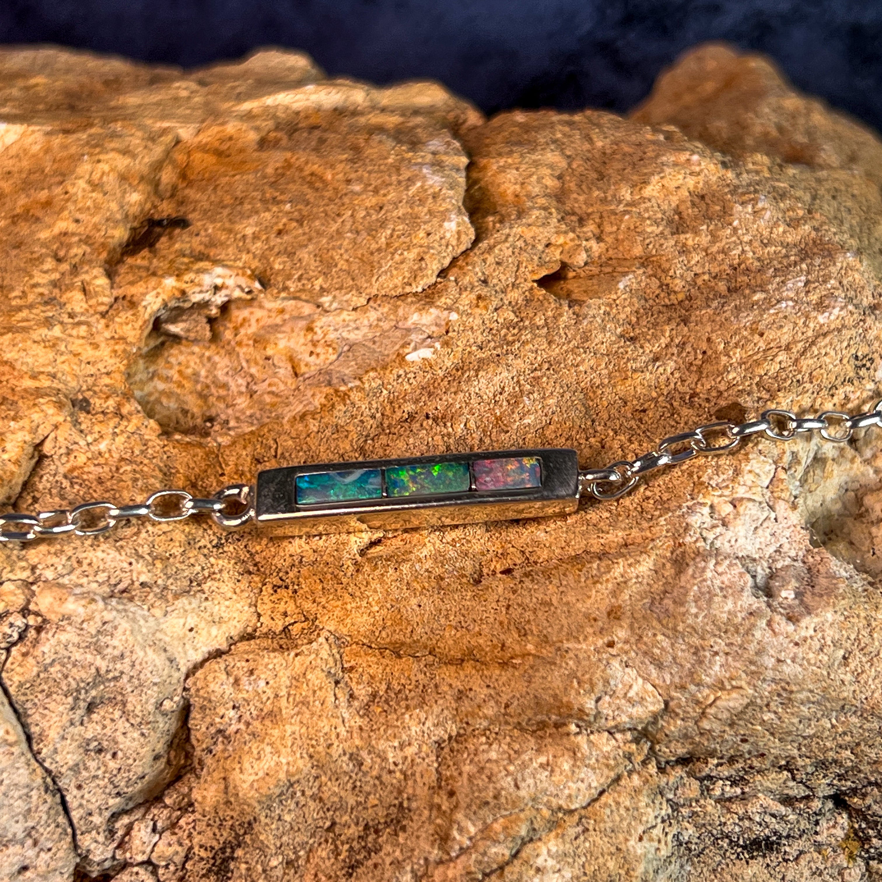 Elevate your collection with this Sterling Silver Opal Inlay 3 Box Bracelet, expertly crafted to showcase the iridescent beauty of natural opal. The intricate opal inlay is set within a durable sterling silver framework, offering both elegance and lasting quality. Its refined design is perfect for sophisticated styling, seamlessly complementing both casual and formal attire with a subtle play of colour and light. This bracelet is a timeless piece for those who appreciate fine craftsmanship and natural gemstone allure.