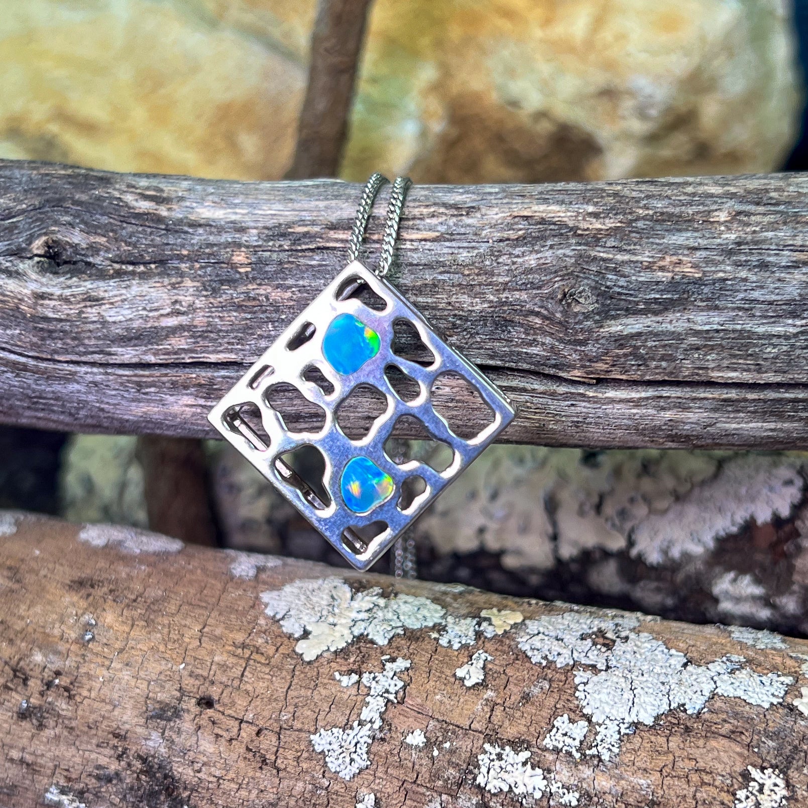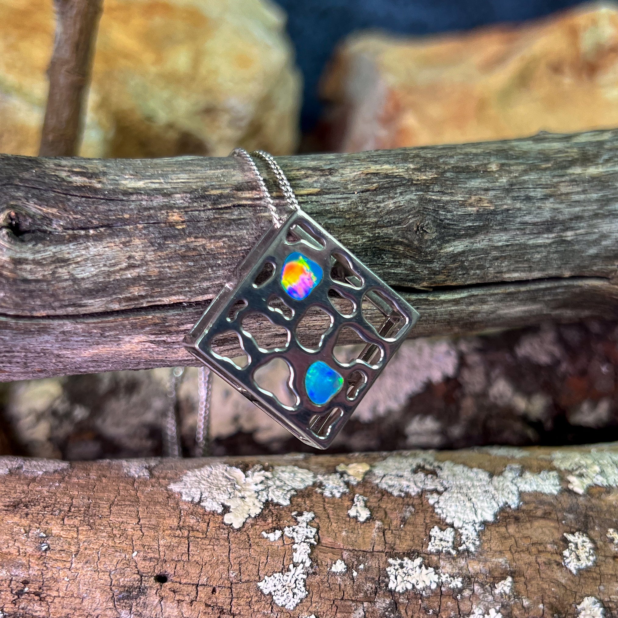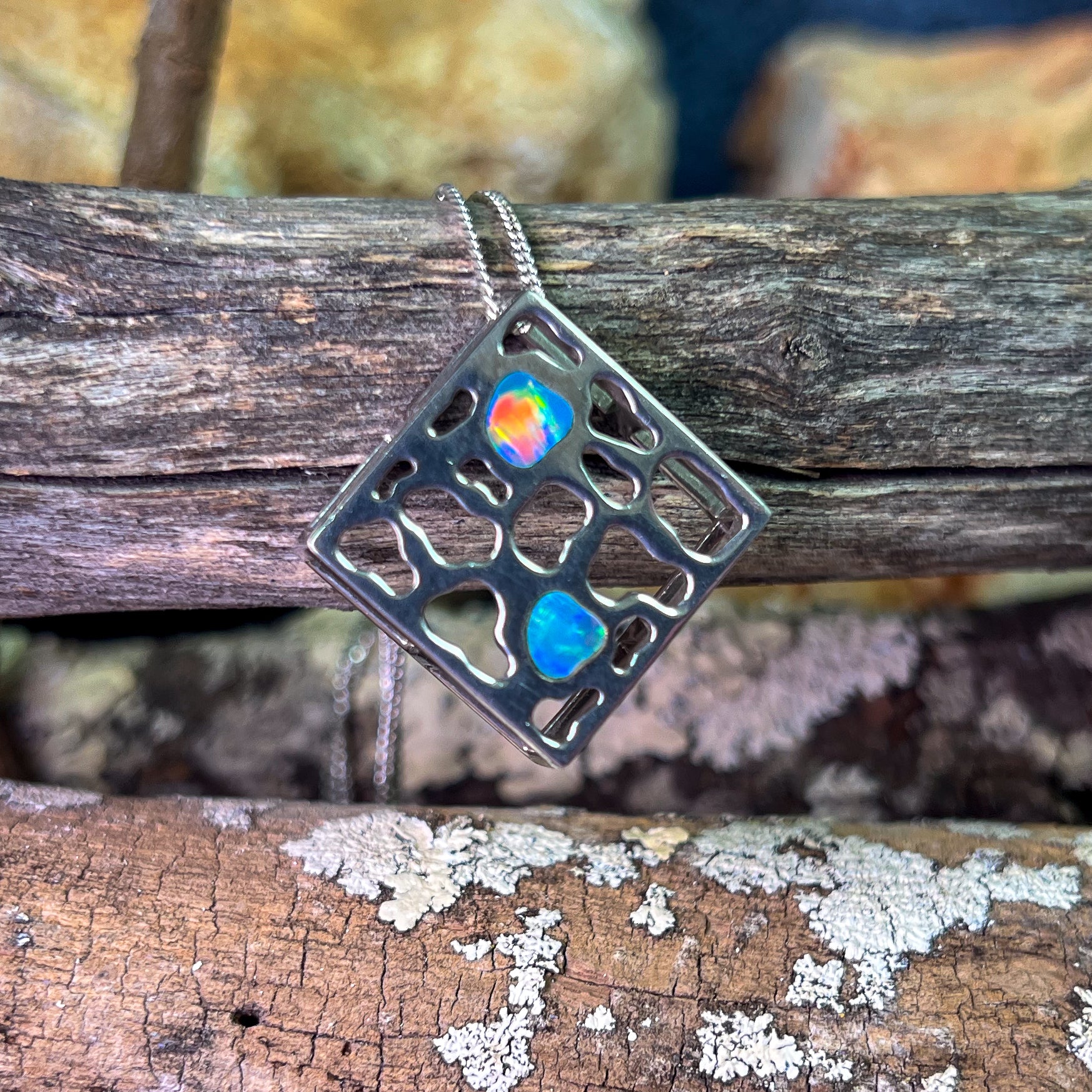 This Sterling Silver Opal pendant features a mesmerizing geometrical shaped opal inlay, perfect for adding a unique touch to any outfit. Crafted with quality sterling silver, this pendant is a timeless piece that will effortlessly elevate your style. Embrace the ethereal beauty of opal with this stunning pendant.