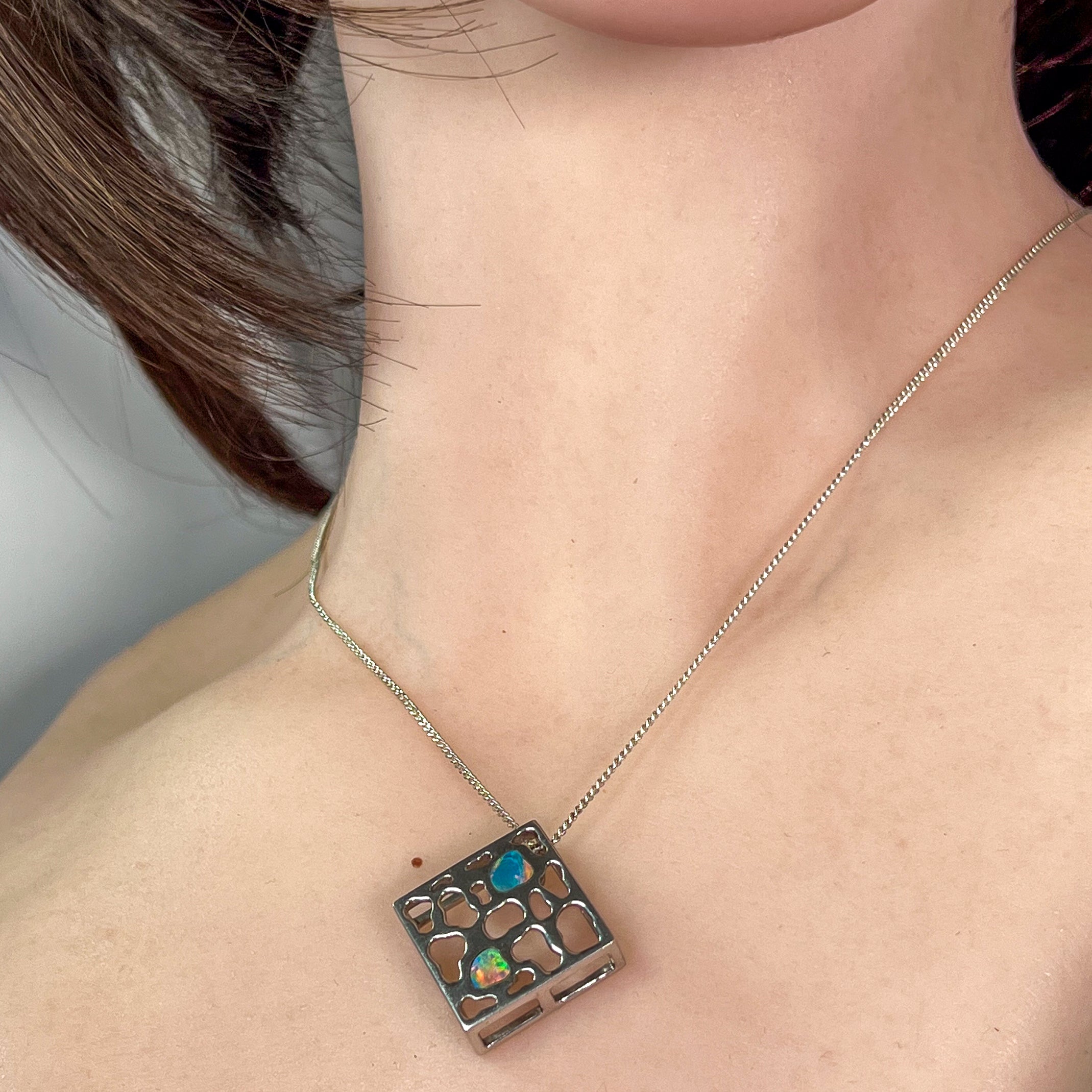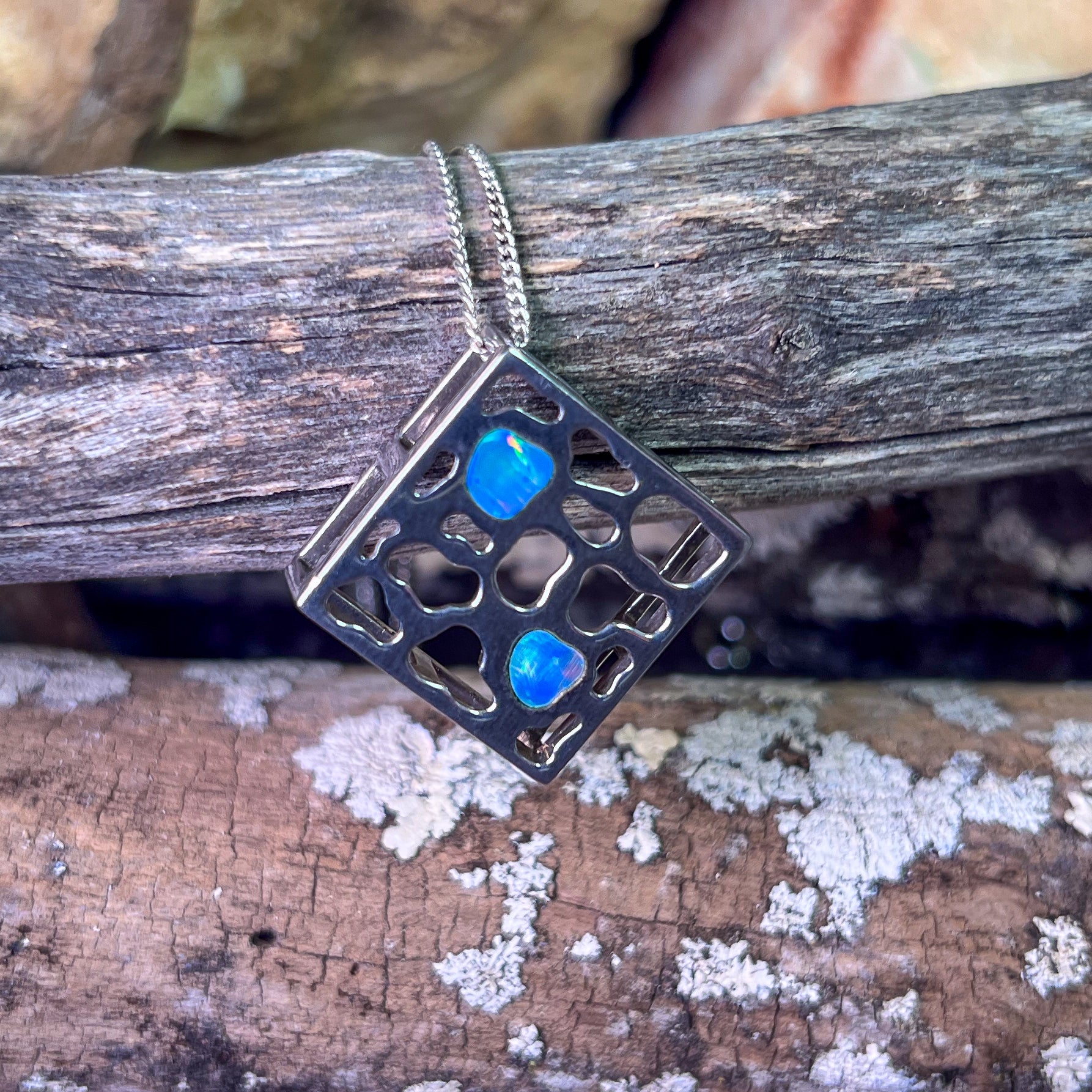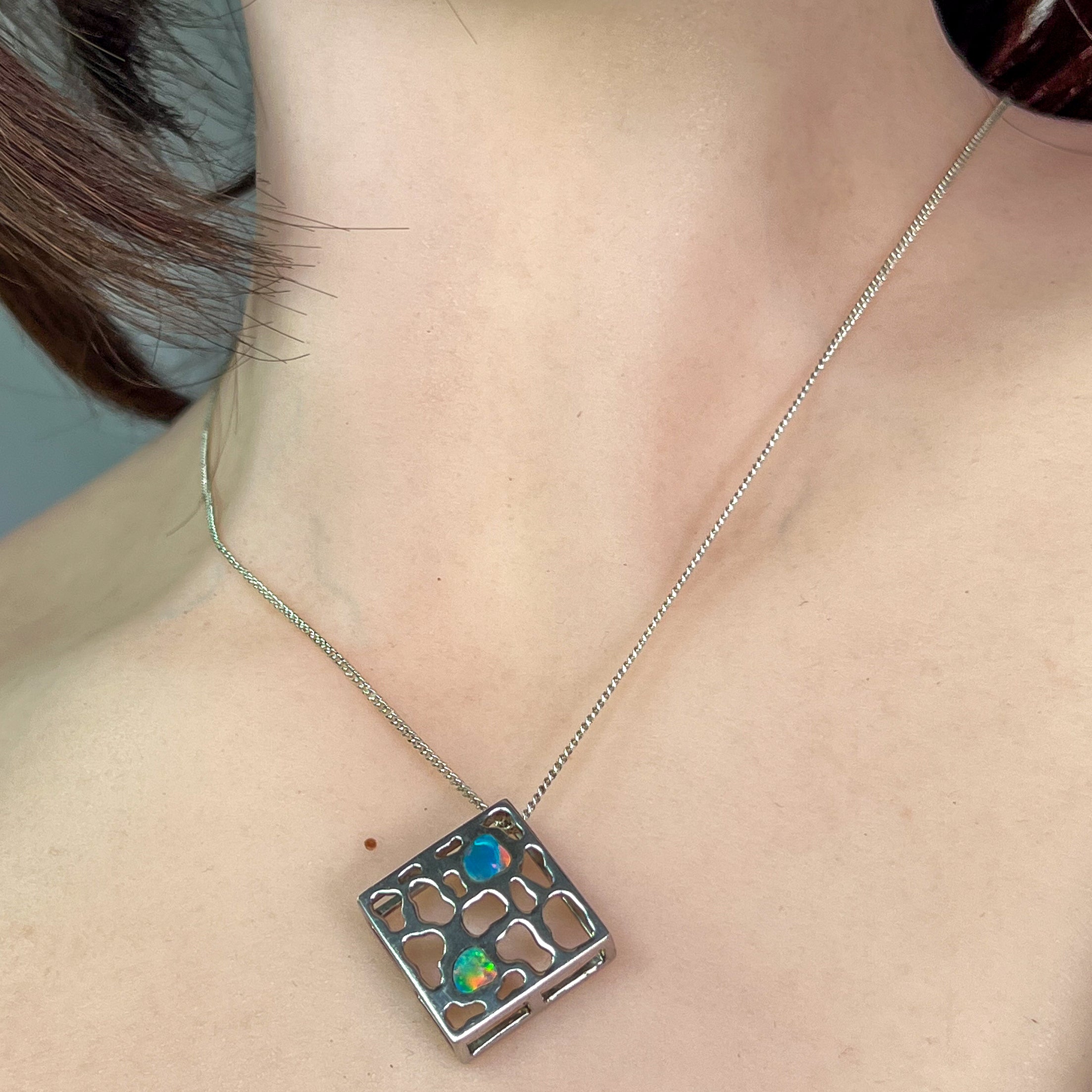 This Sterling Silver Opal pendant features a mesmerizing geometrical shaped opal inlay, perfect for adding a unique touch to any outfit. Crafted with quality sterling silver, this pendant is a timeless piece that will effortlessly elevate your style. Embrace the ethereal beauty of opal with this stunning pendant.