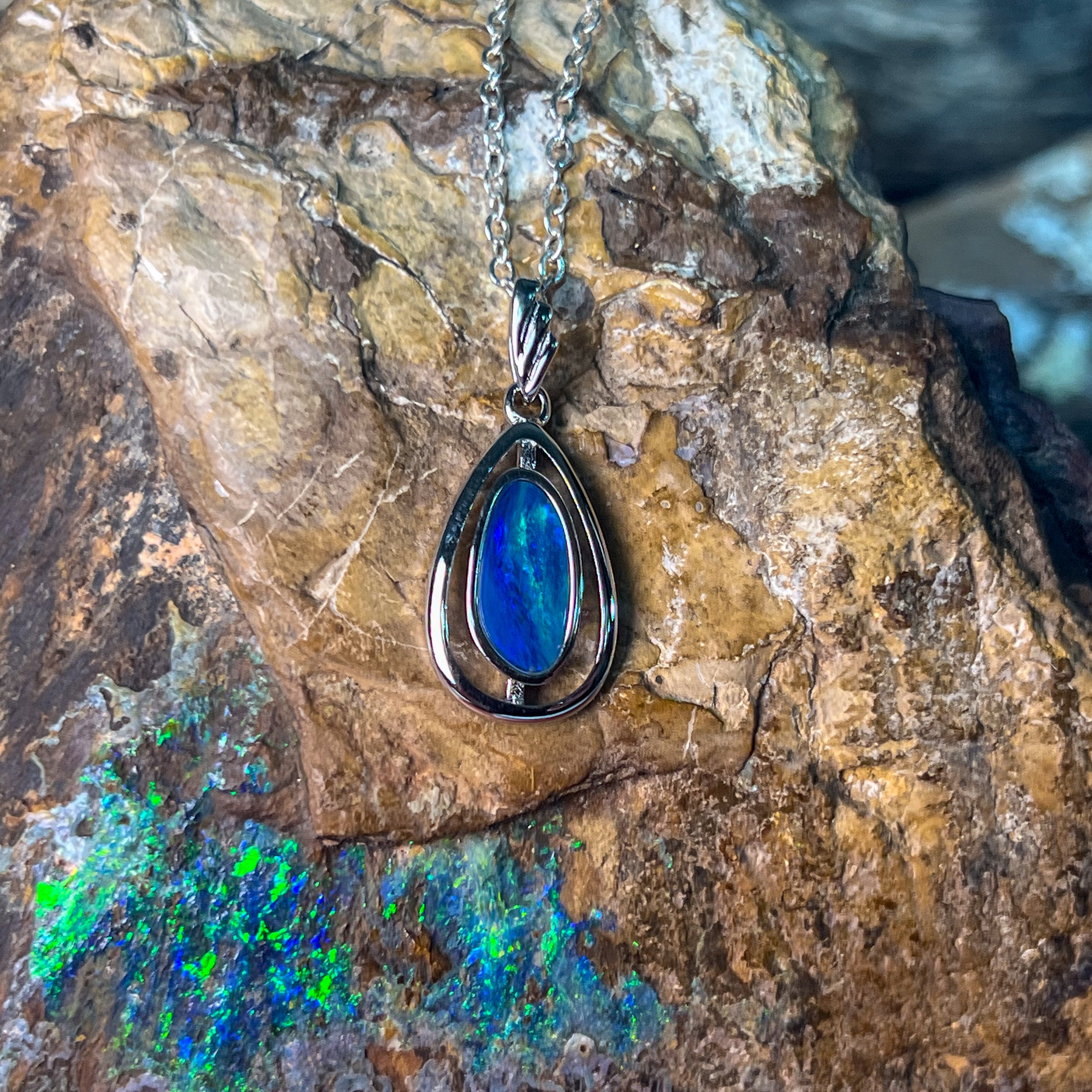 Elevate your style with this sterling silver pendant featuring a pear-shaped opal doublet in a striking teardrop cut-out design. Its modern silhouette enhances the opal’s vibrant hues, making it a captivating centerpiece. Perfect for adding a touch of sophistication and unique elegance to any outfit.