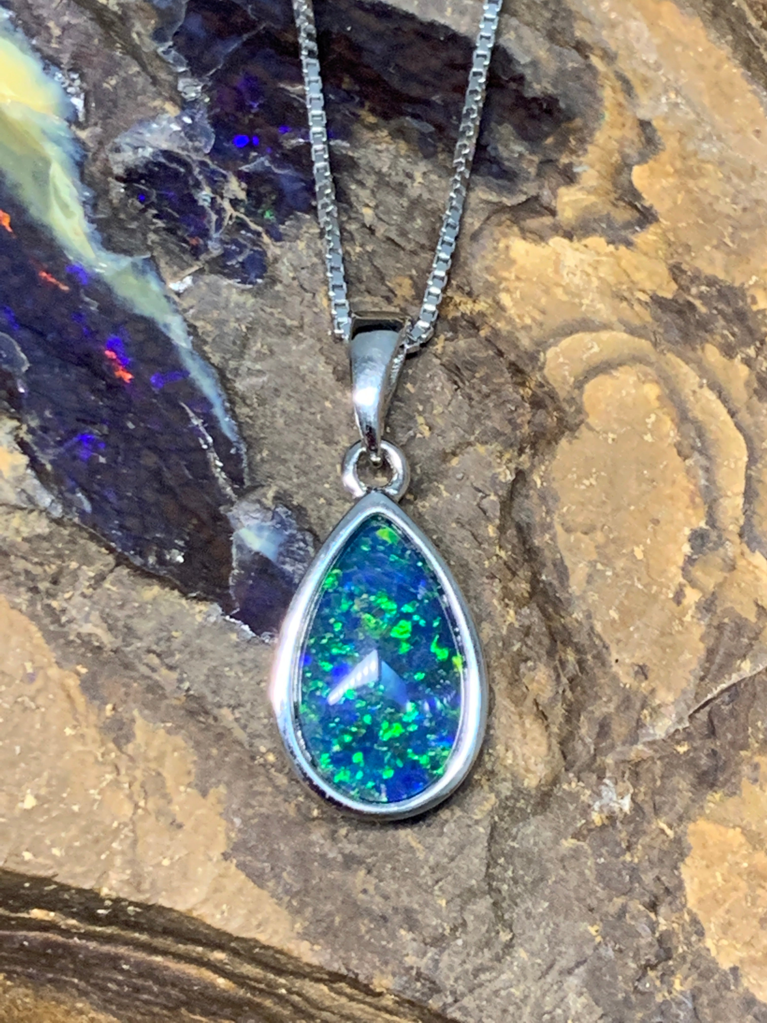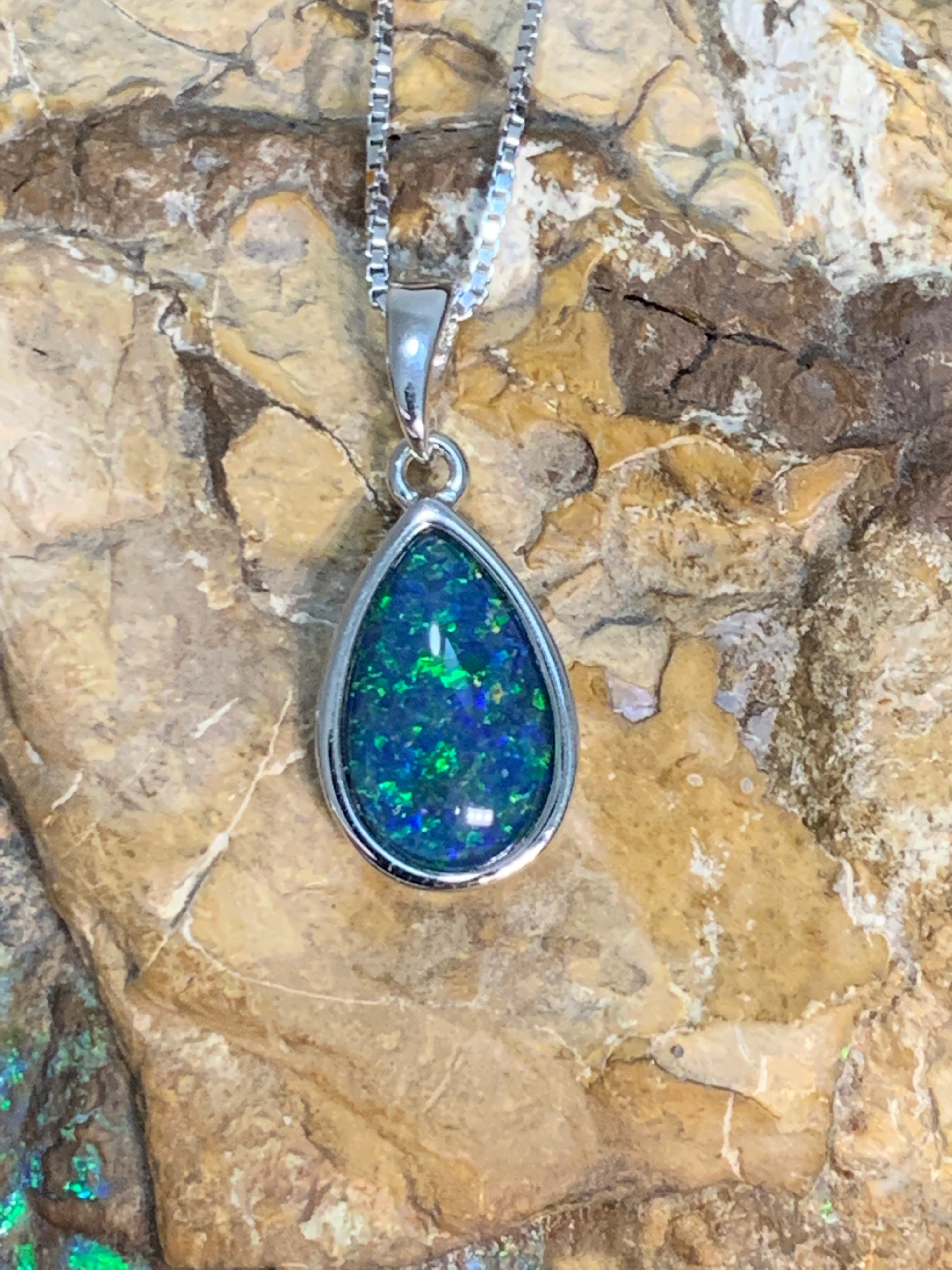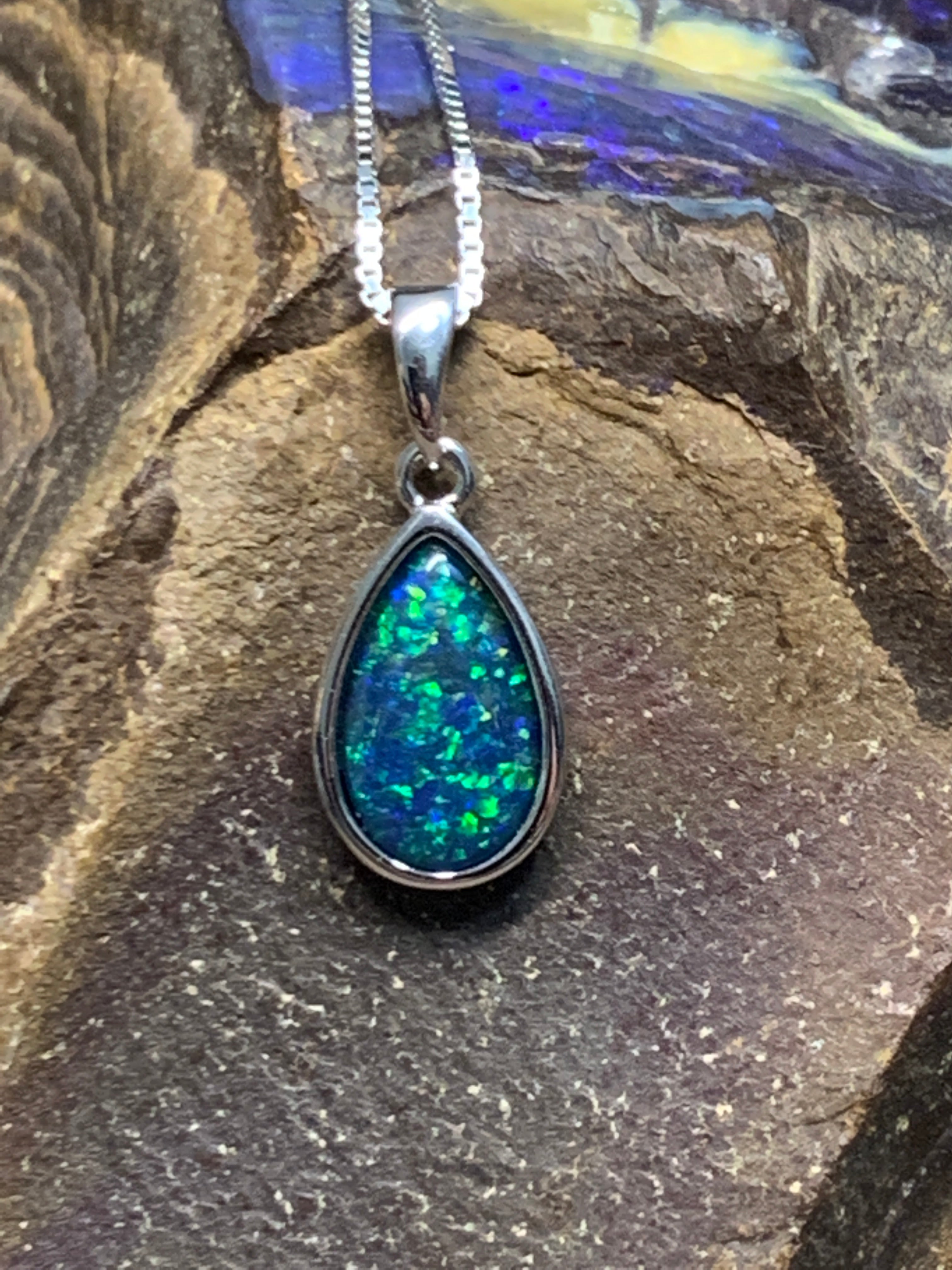 One Sterling Silver teardrop shape Australian Opal 13x8mm Triplet pendant bezel set.