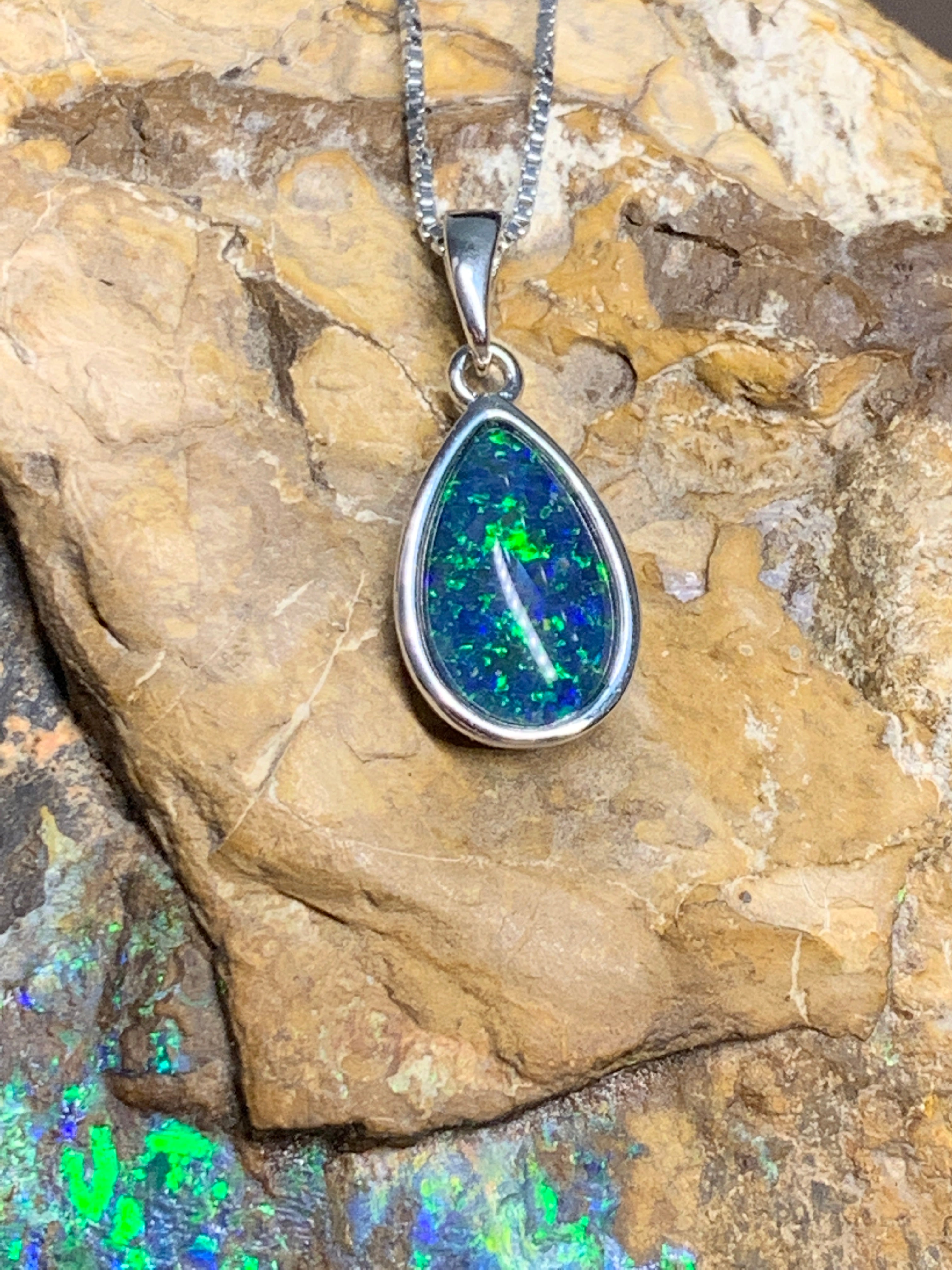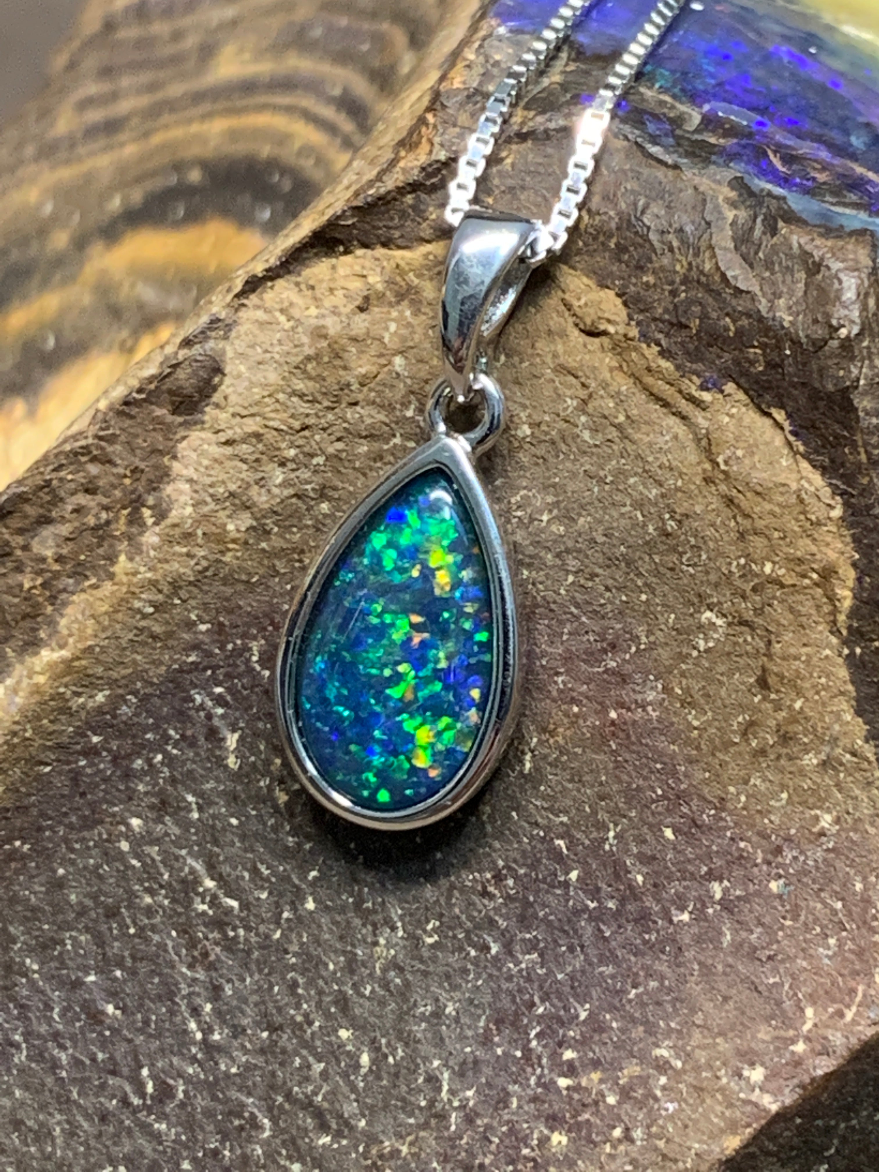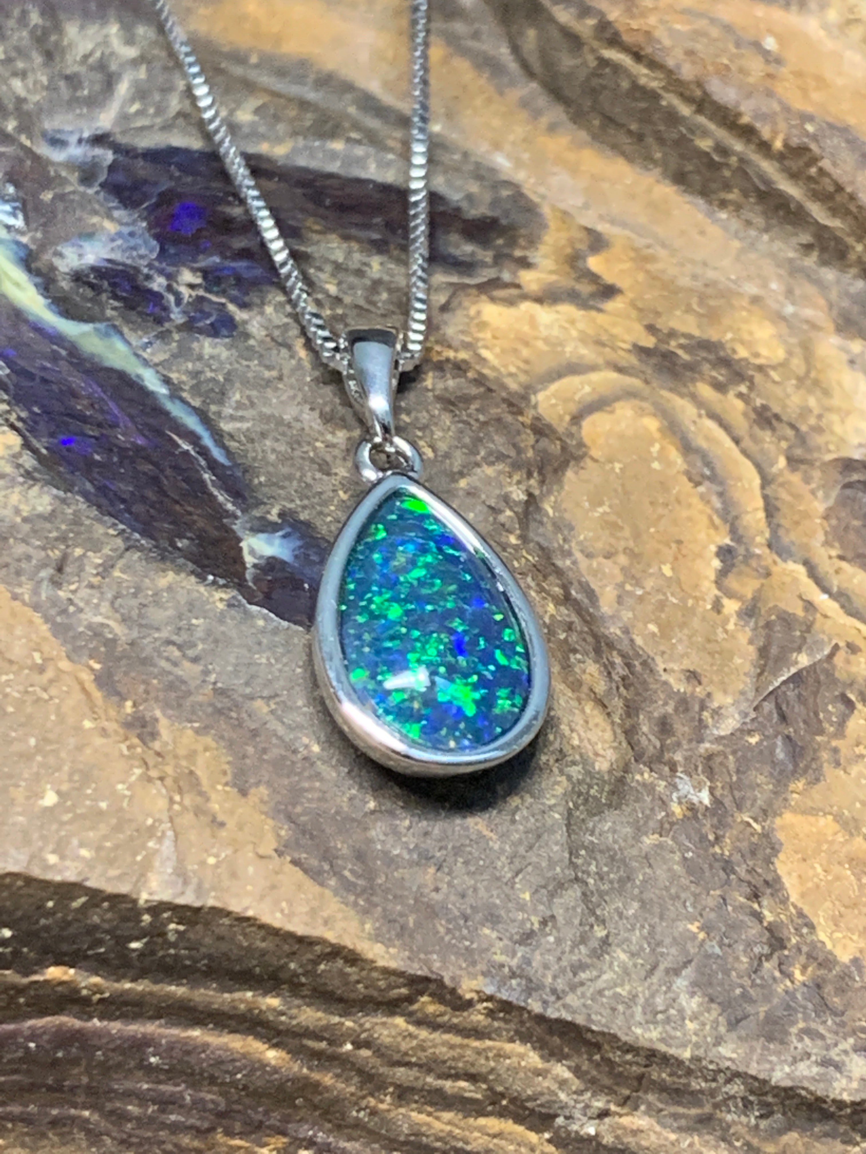 One Sterling Silver teardrop shape Australian Opal 13x8mm Triplet pendant bezel set.