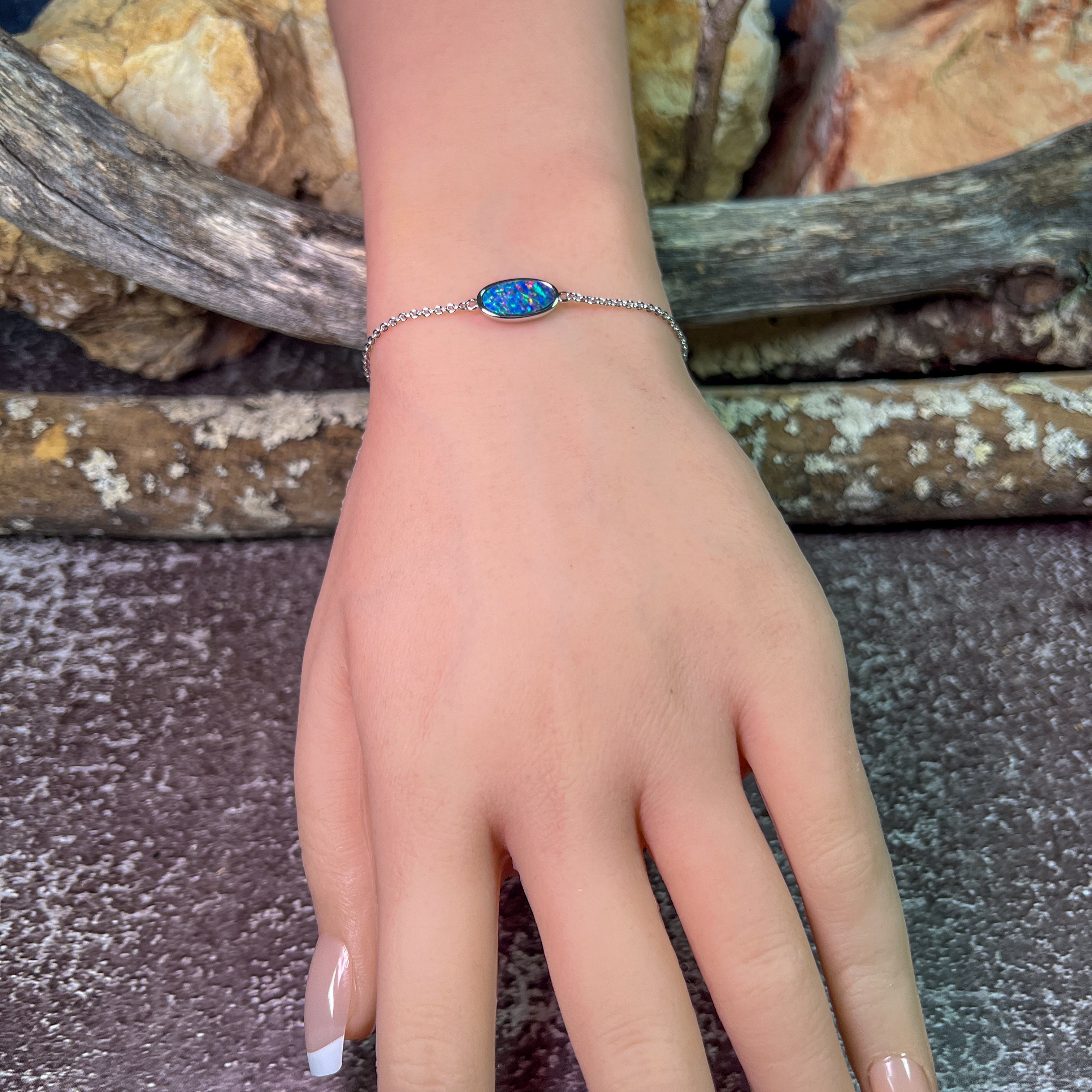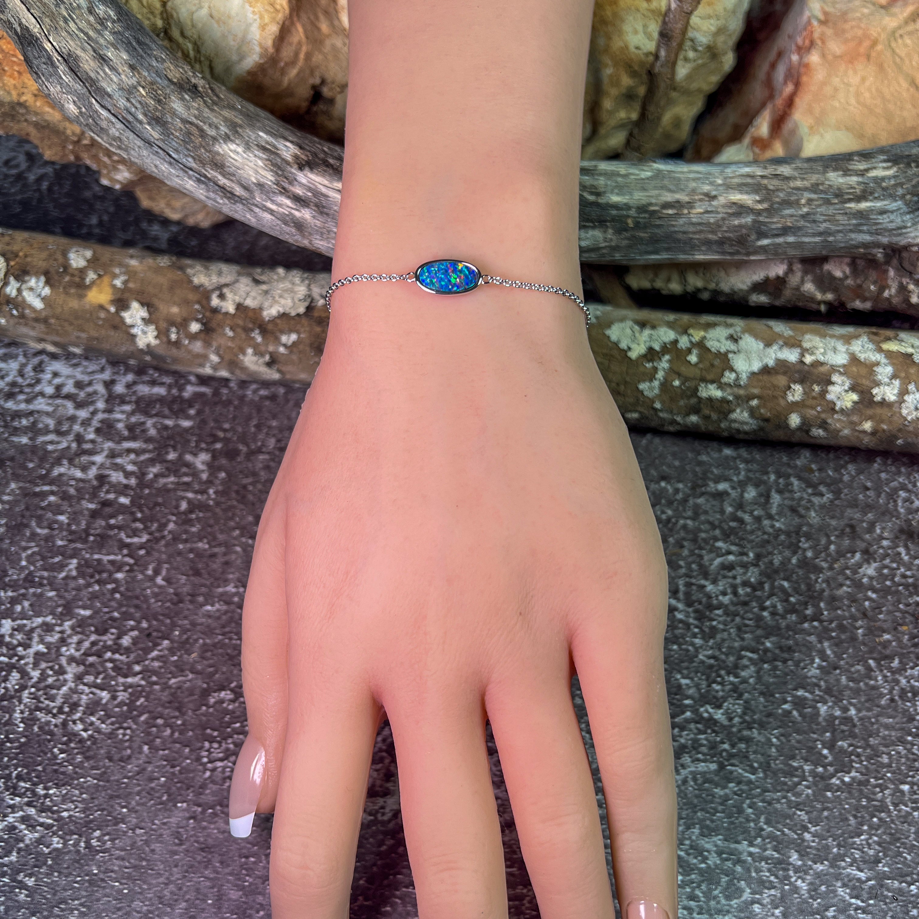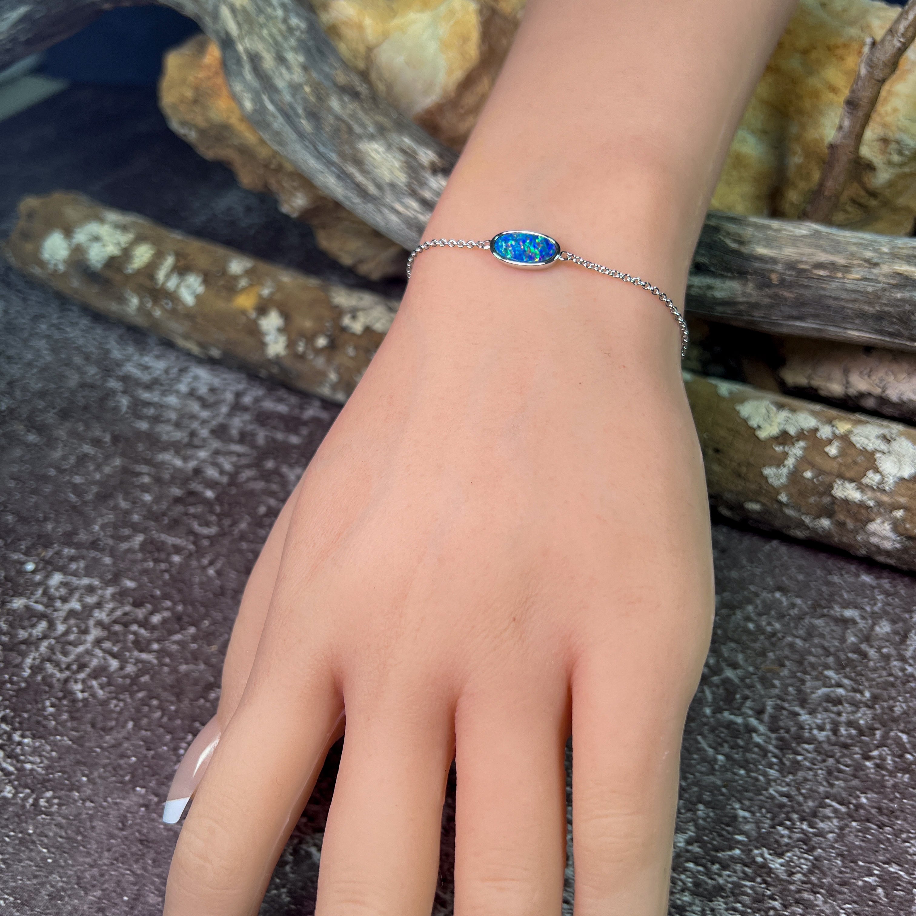 Experience the stunning beauty of our Sterling Silver Oval Opal doublet bracelet. Featuring a solitaire oval design, this 12x6mm bracelet is crafted with quality sterling silver for a luxurious touch. Adorn your wrist with the brilliance and elegance of this opal doublet piece.