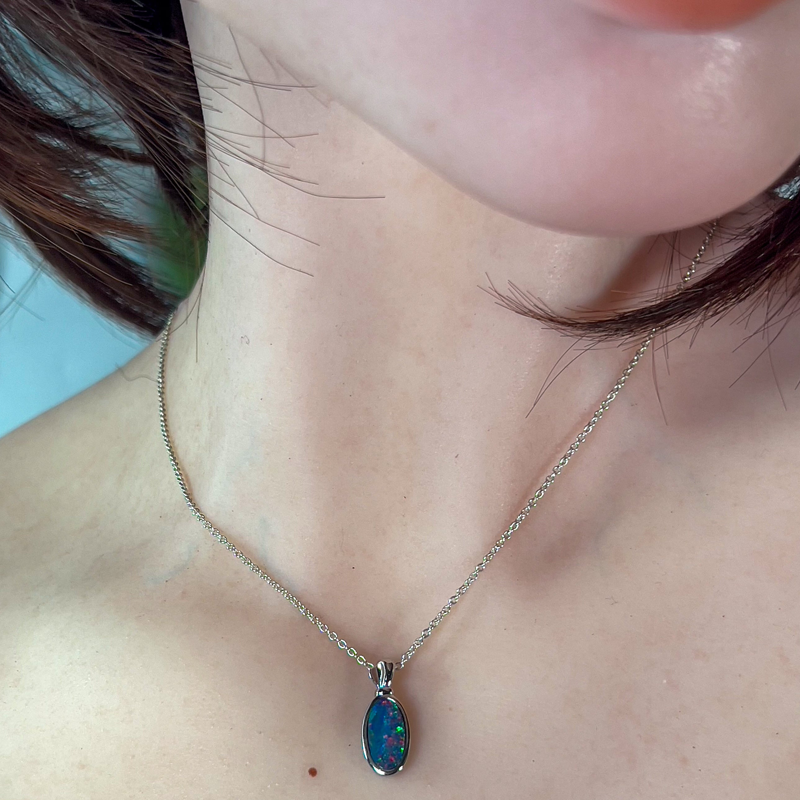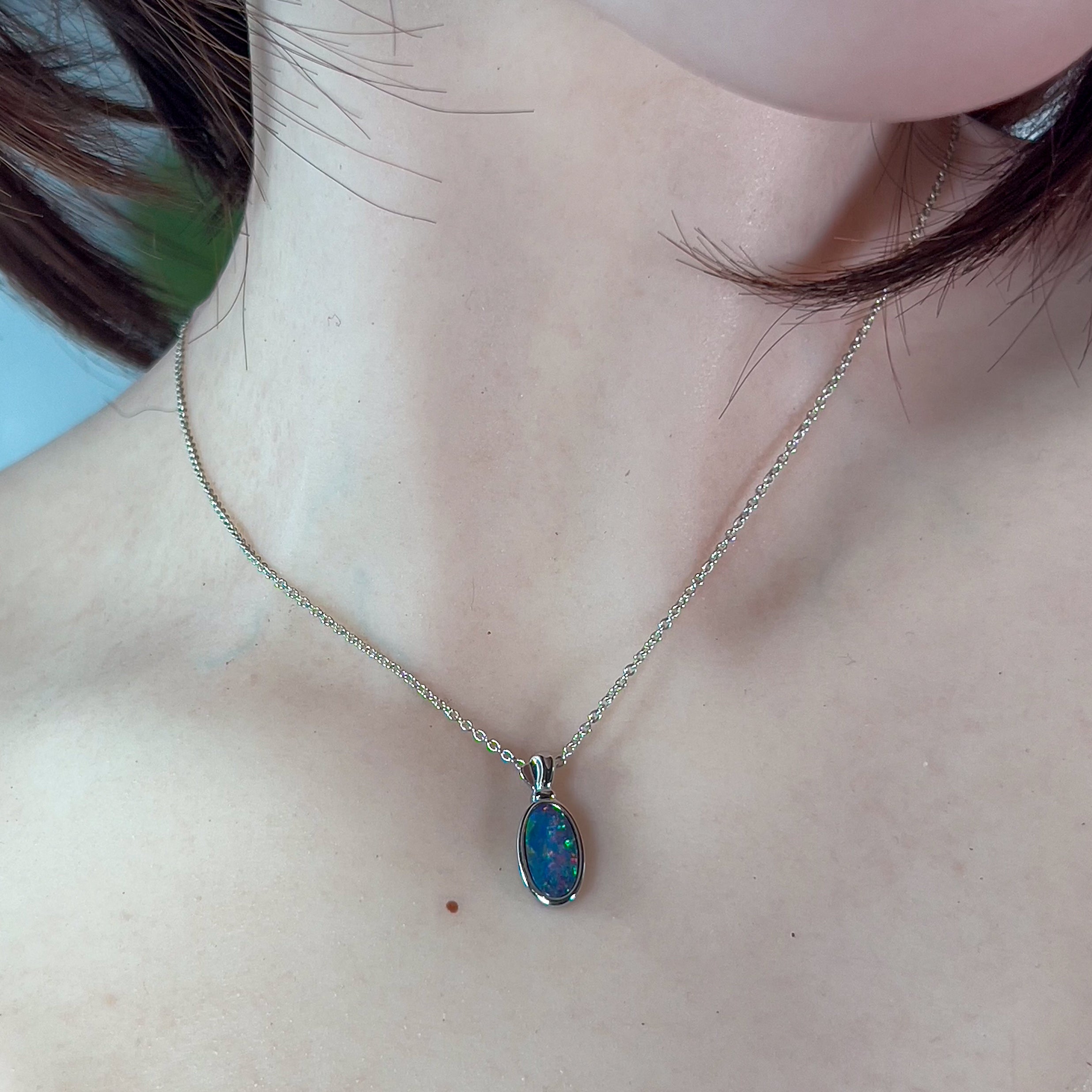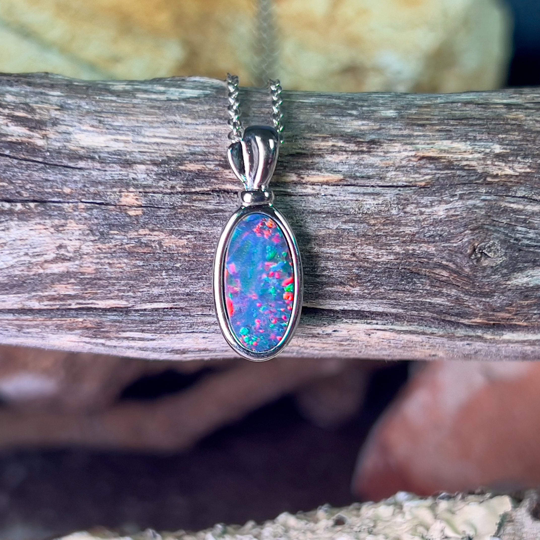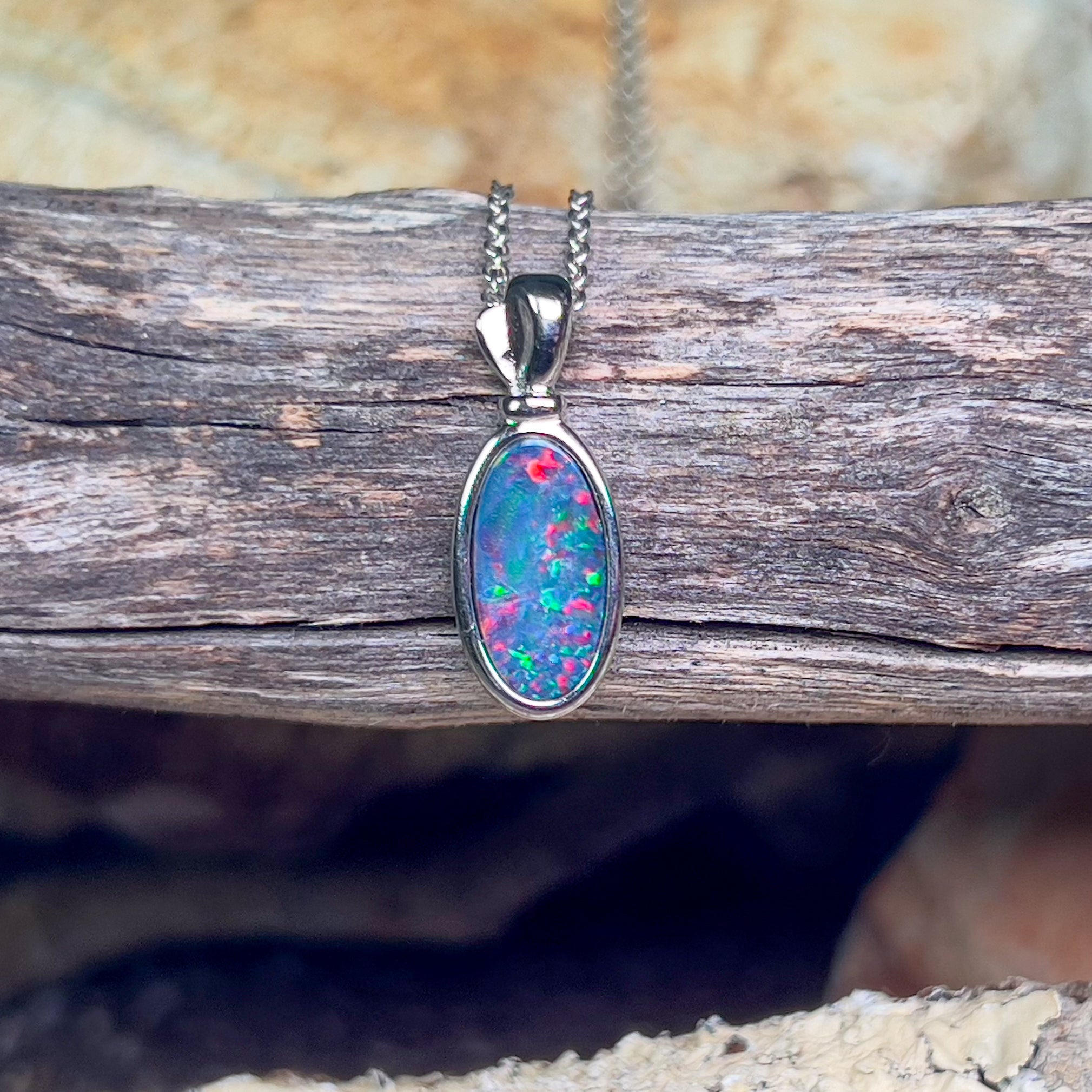 This Sterling Silver Oval Red Blue Opal doublet pendant is a classic piece that will add a touch of elegance to any outfit. Featuring a beautiful red and blue opal doublet, this pendant is the perfect accessory for any occasion. Elevate your look with this timeless and sophisticated pendant.