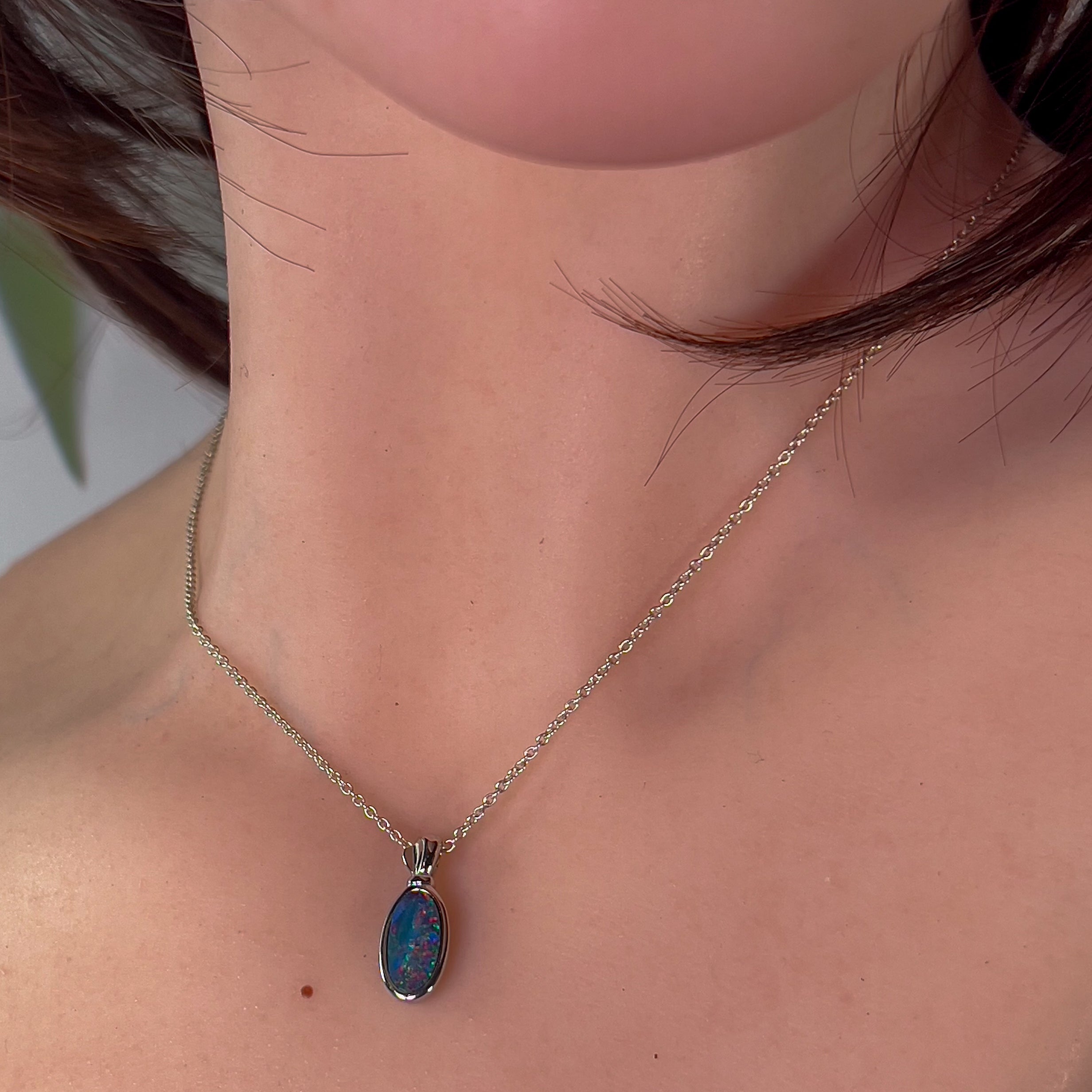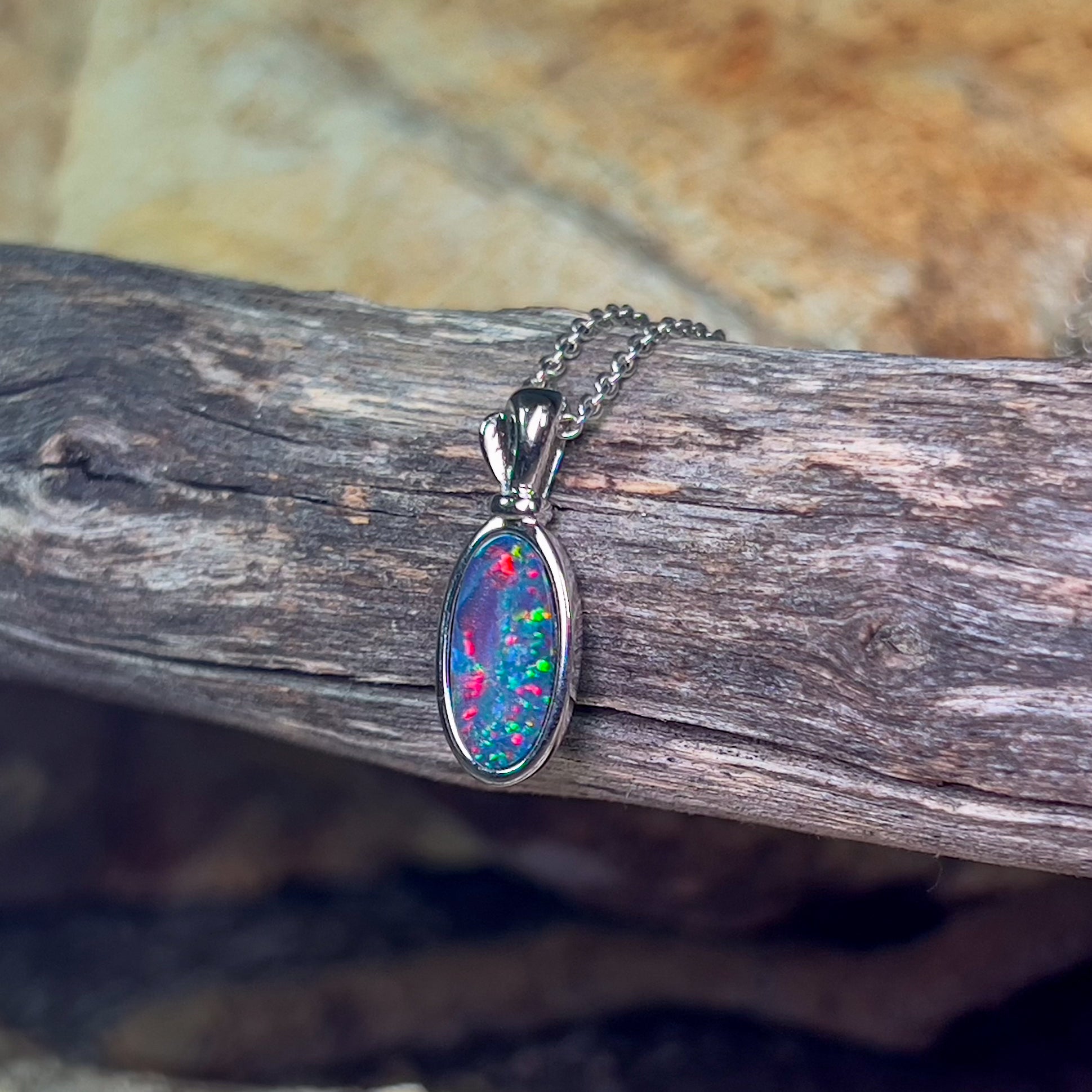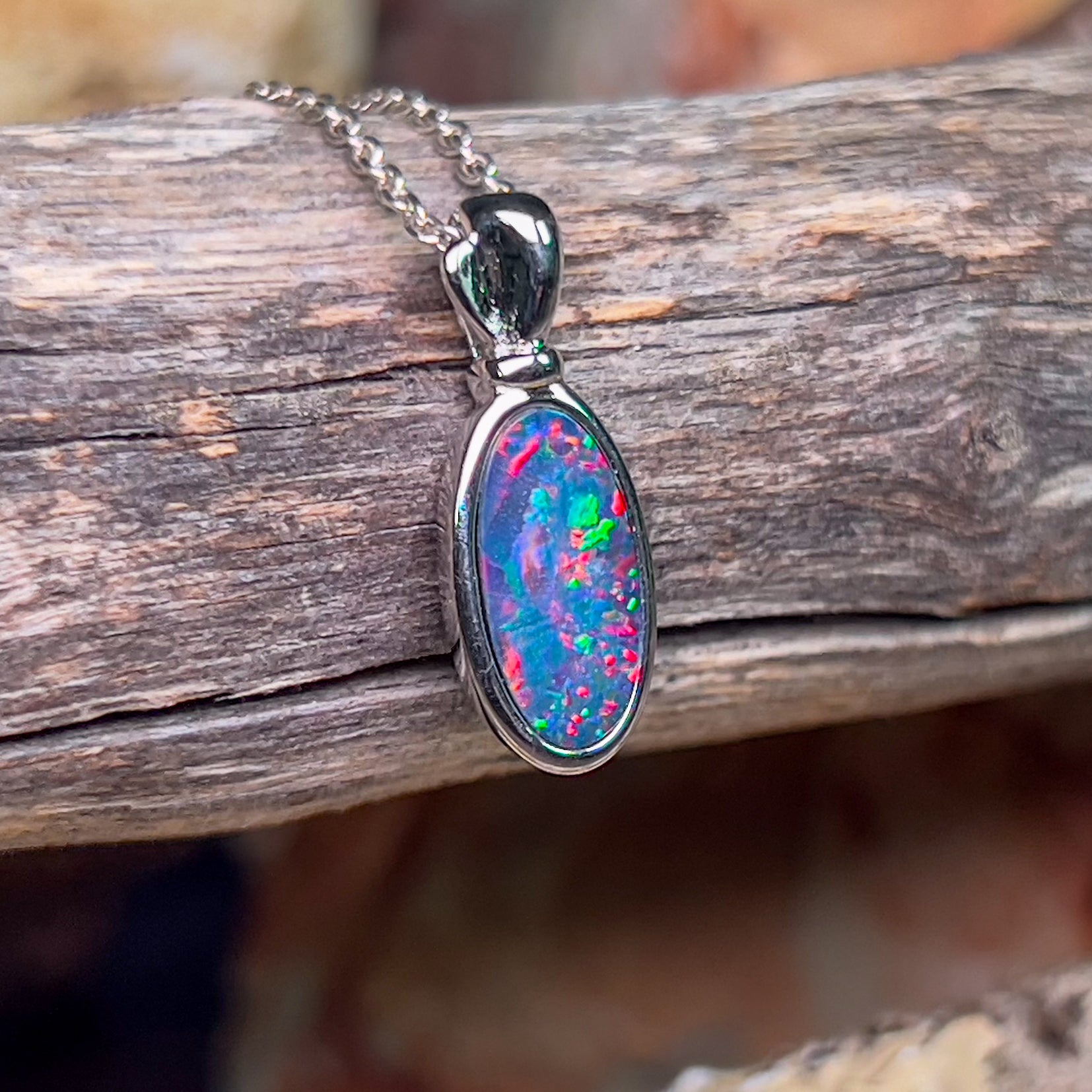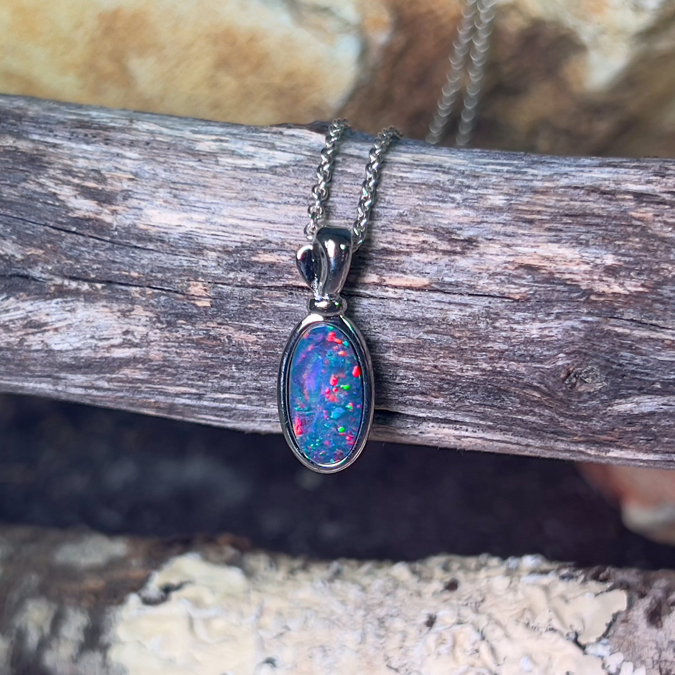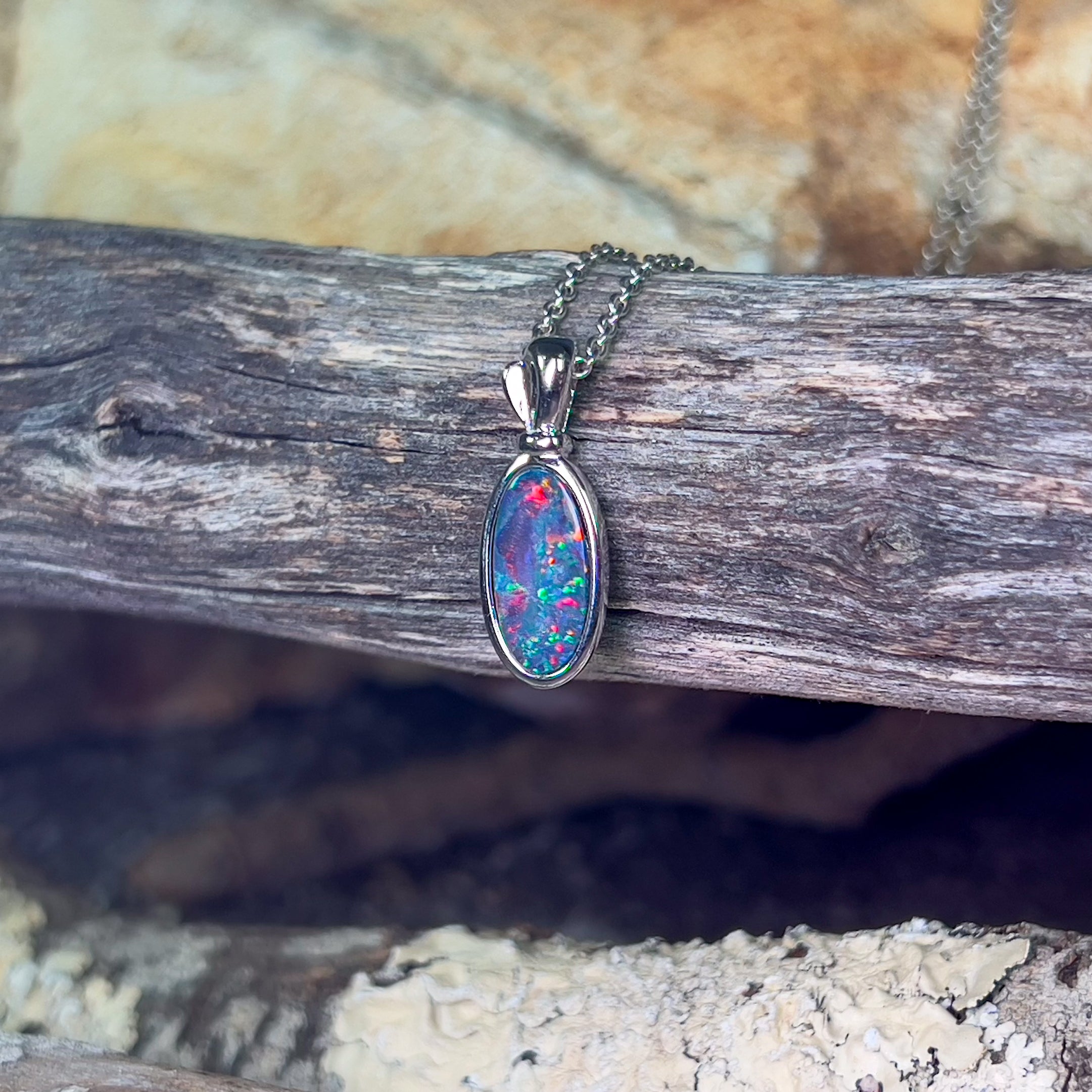 This Sterling Silver Oval Red Blue Opal doublet pendant is a classic piece that will add a touch of elegance to any outfit. Featuring a beautiful red and blue opal doublet, this pendant is the perfect accessory for any occasion. Elevate your look with this timeless and sophisticated pendant.