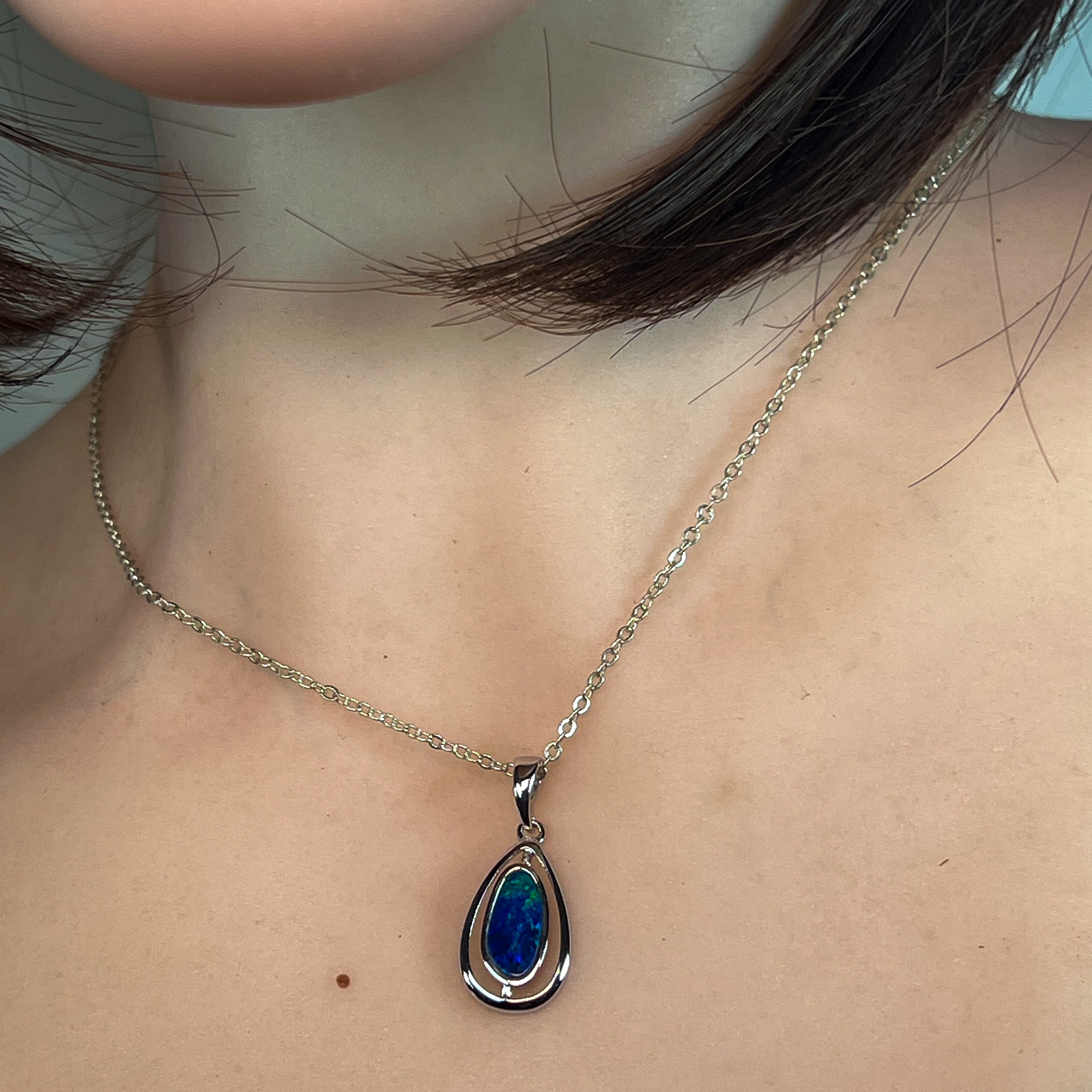 This stunning sterling silver pendant features a pear-shaped cutout design that beautifully showcases a blue-green opal doublet. Its elegant teardrop shape highlights the opal’s vibrant play of colors, making it a captivating accessory for any occasion. Crafted with precision, this pendant adds a touch of sophistication and unique charm to your jewelry collection.