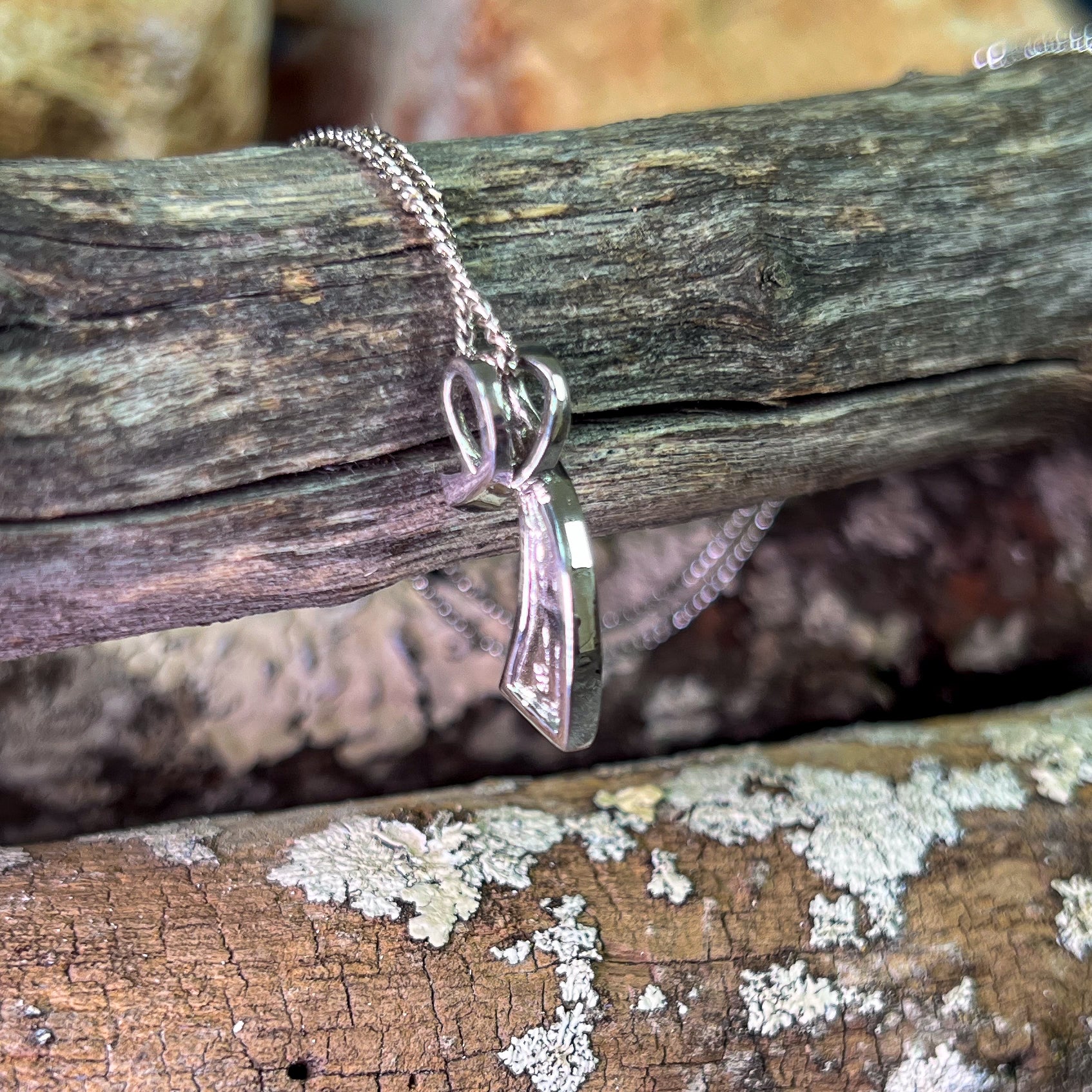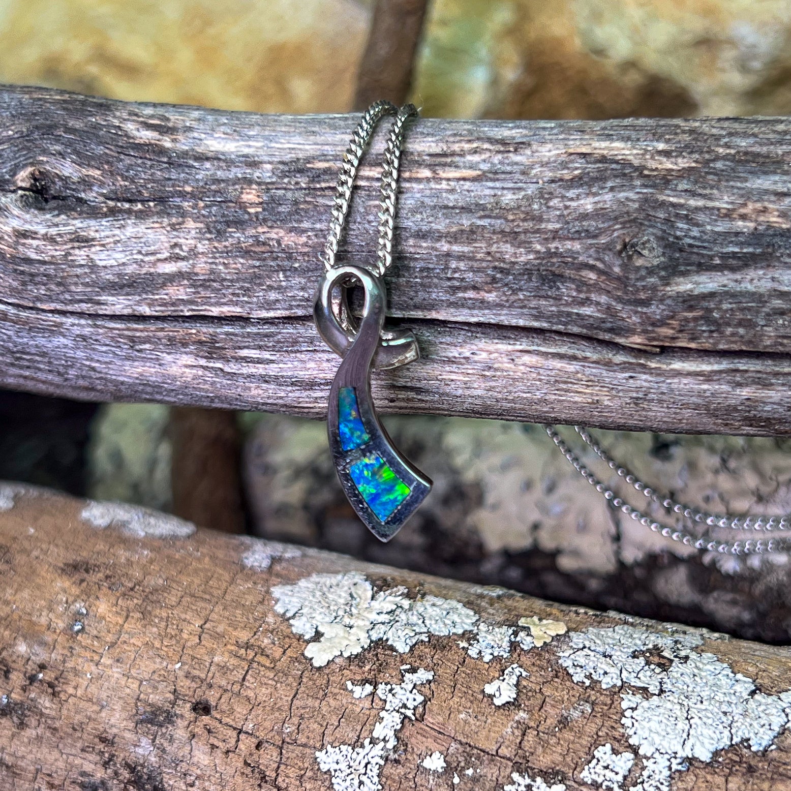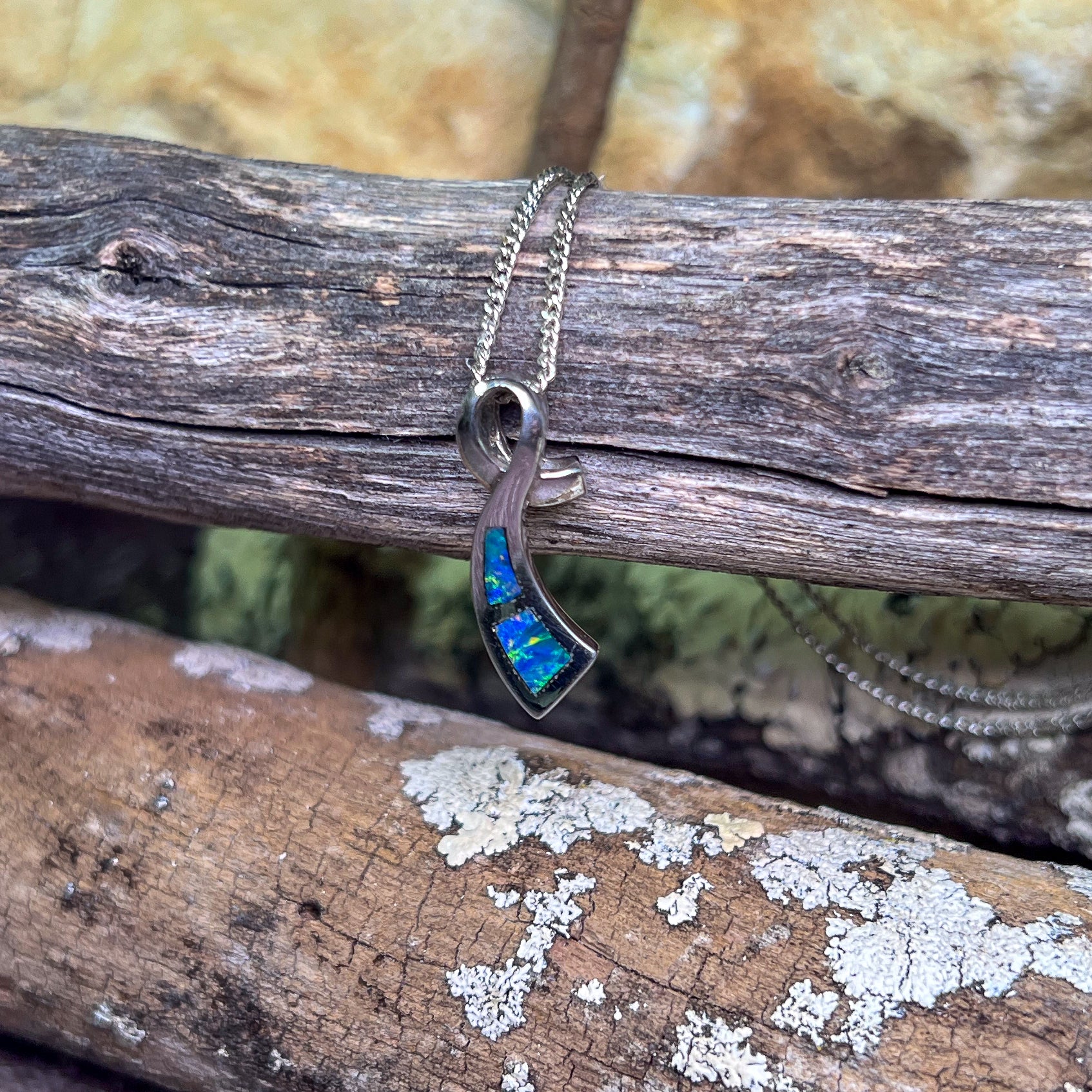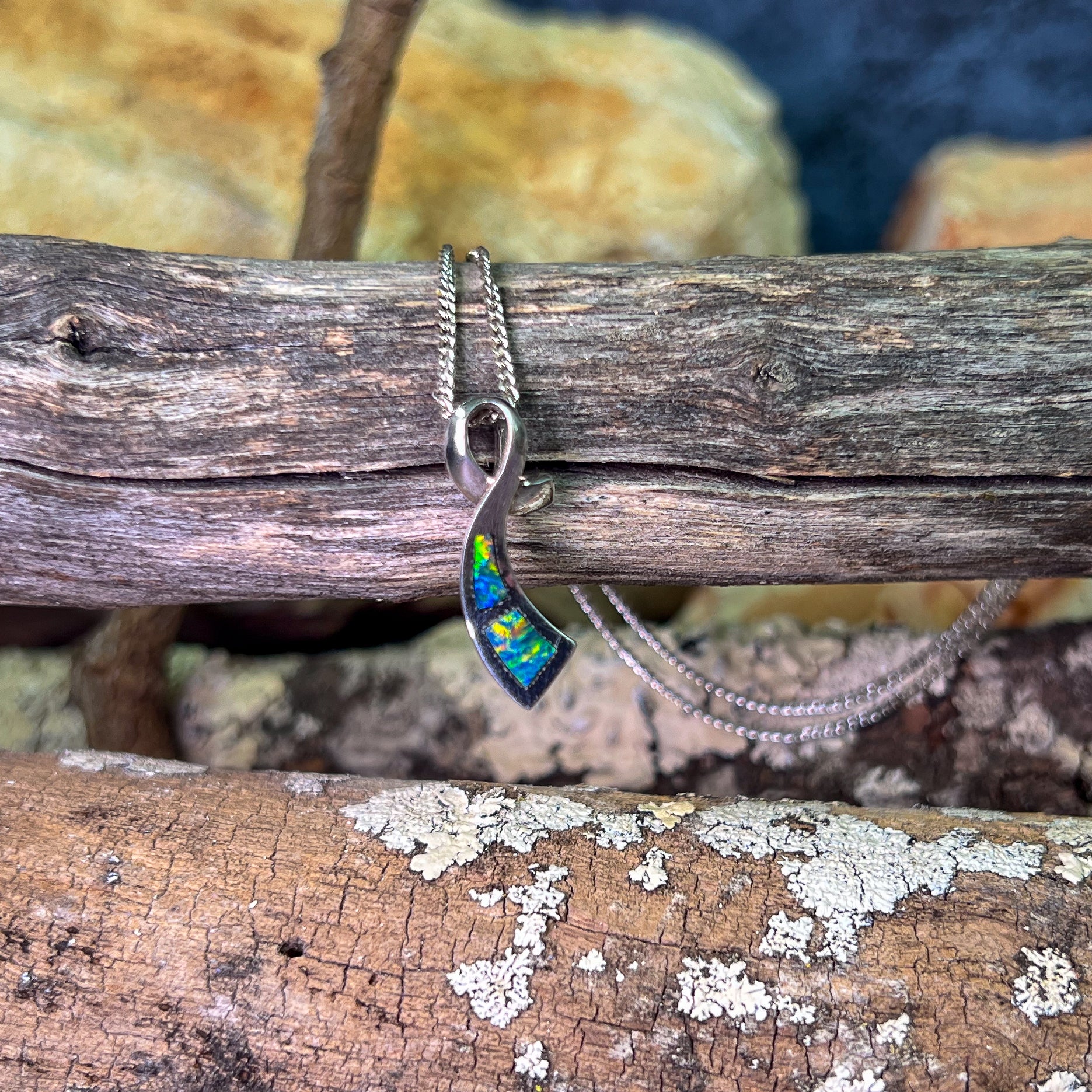 This elegant STERLING SILVER OPAL PENDANT with a unique ribbon design and striking opal inlay is the perfect gift for yourself or a loved one. The opal birthstone adds a touch of personal meaning and beauty to this necklace. A timeless and versatile piece that is sure to impress.
