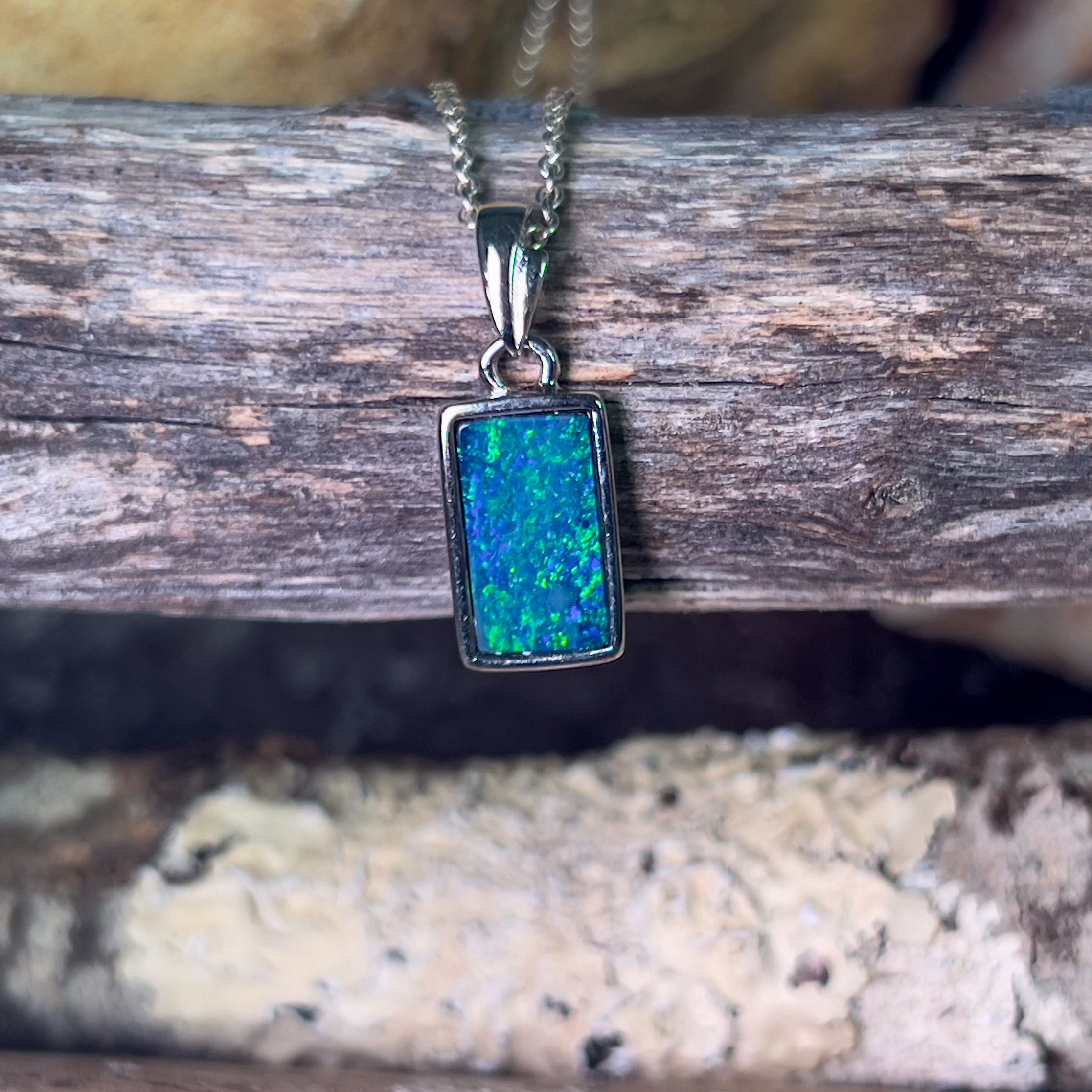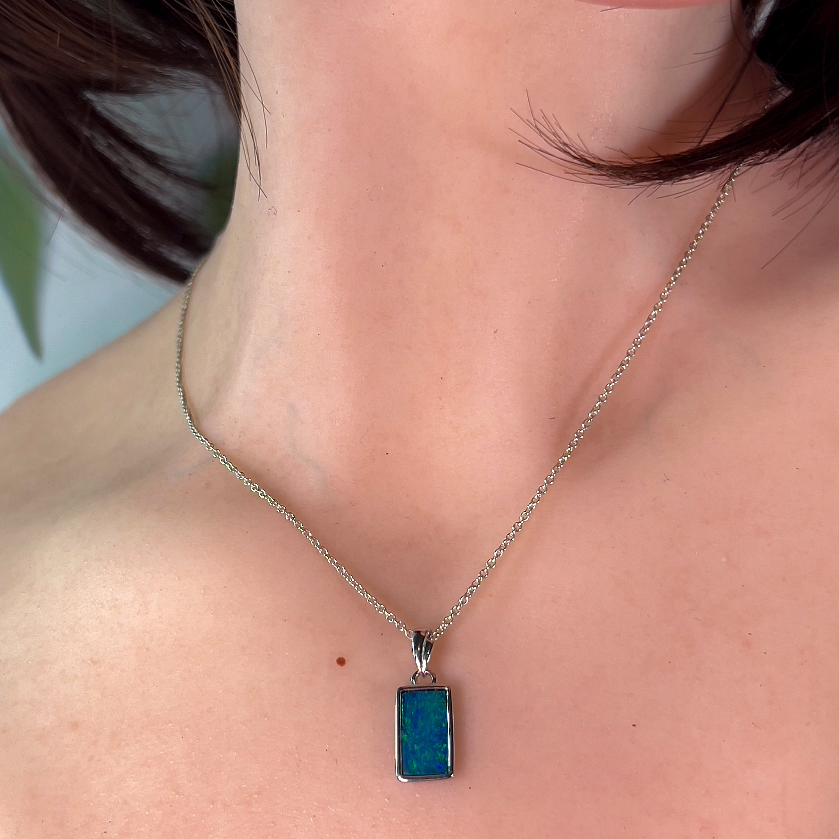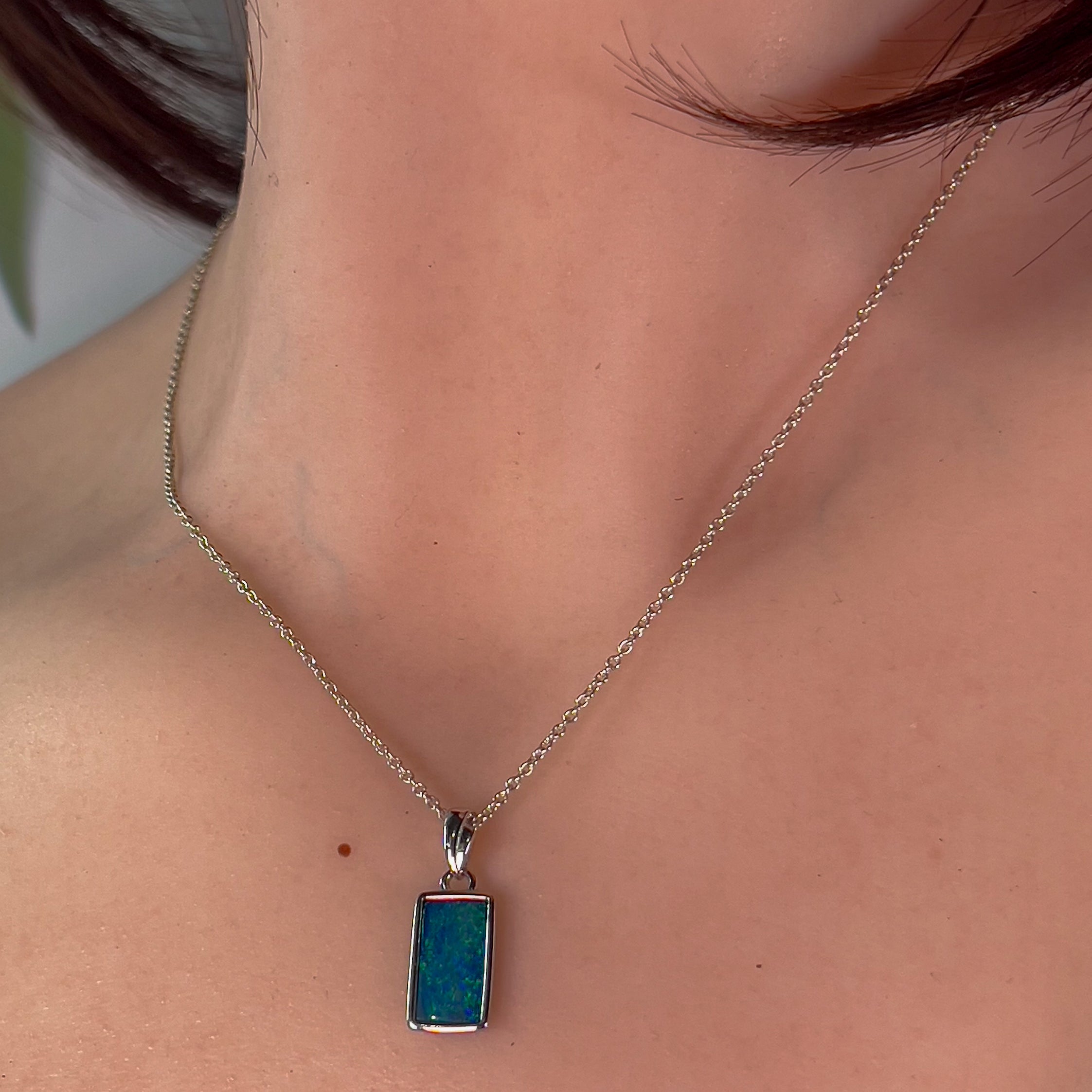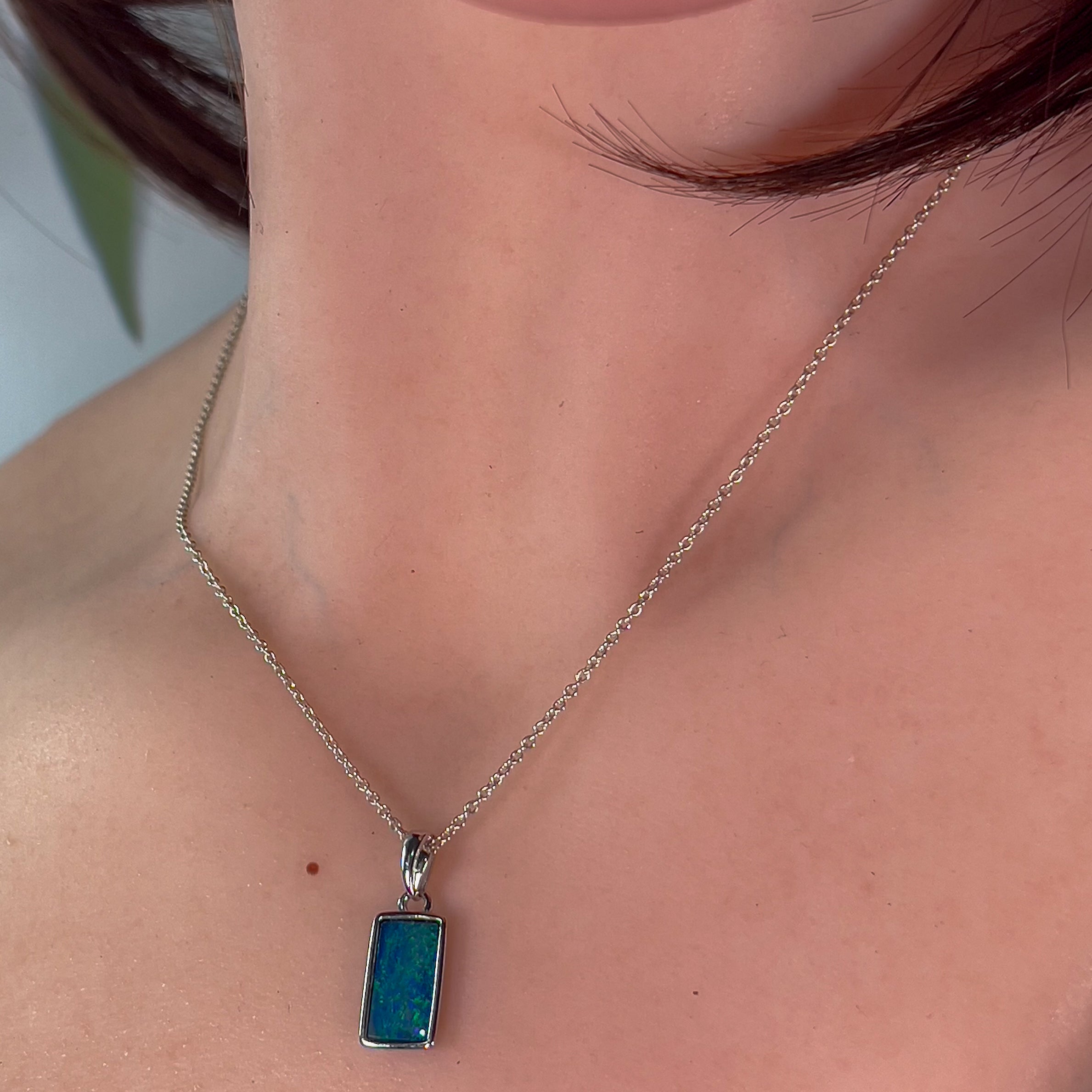 Sterling Silver Rectangle cut Opal doublet Blue Green pendant