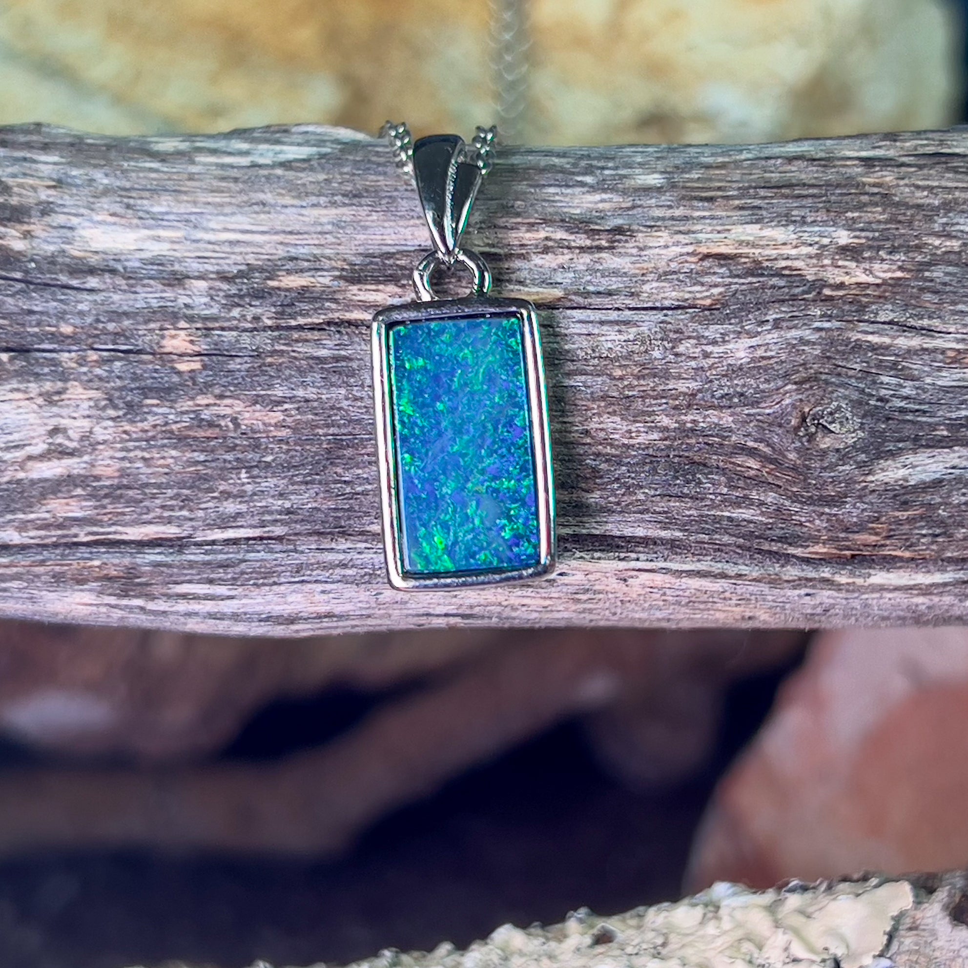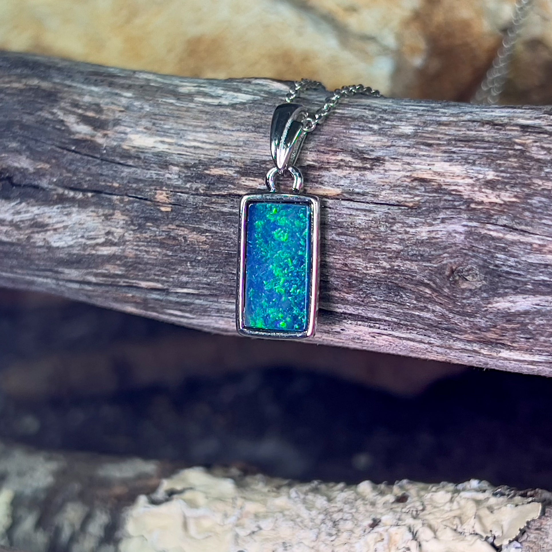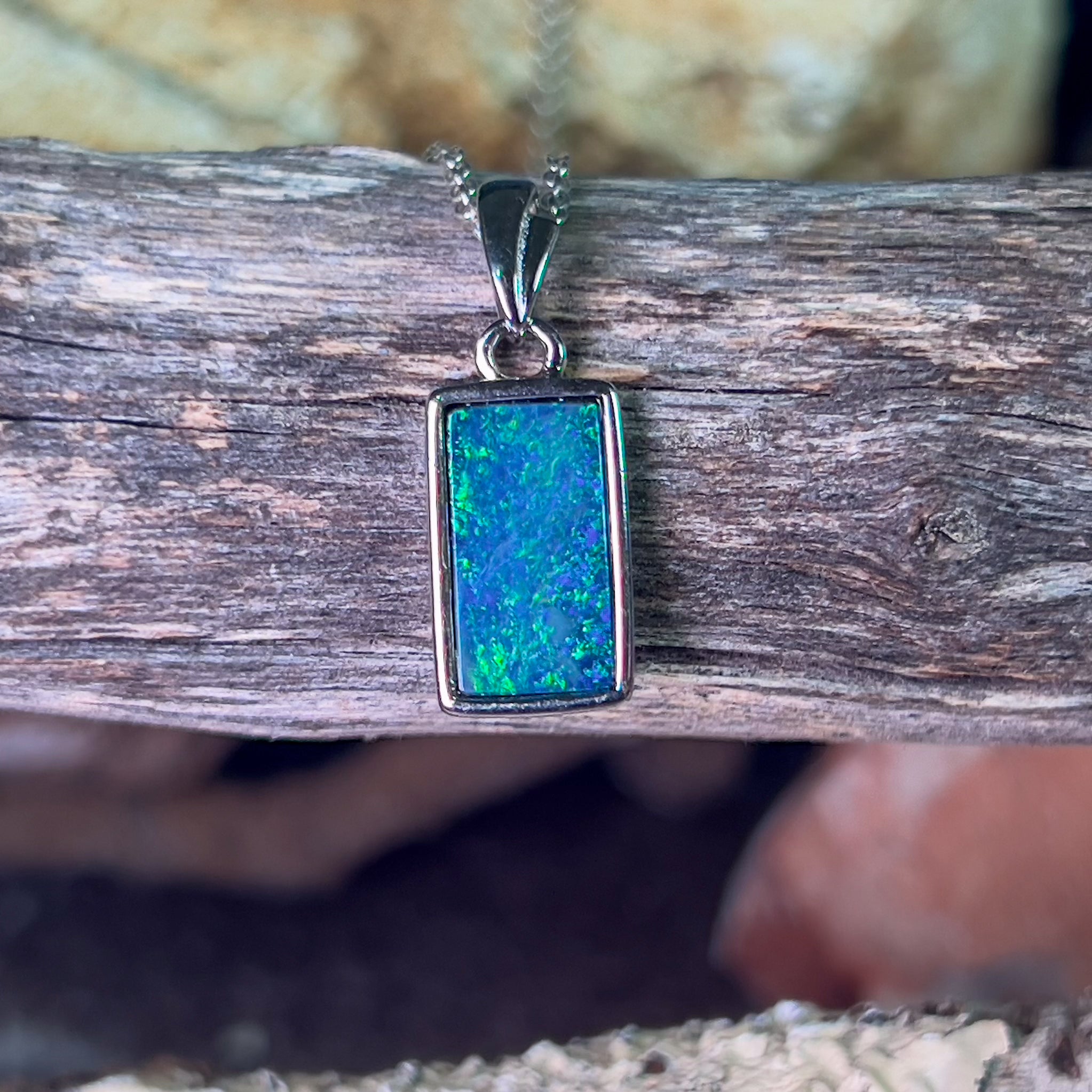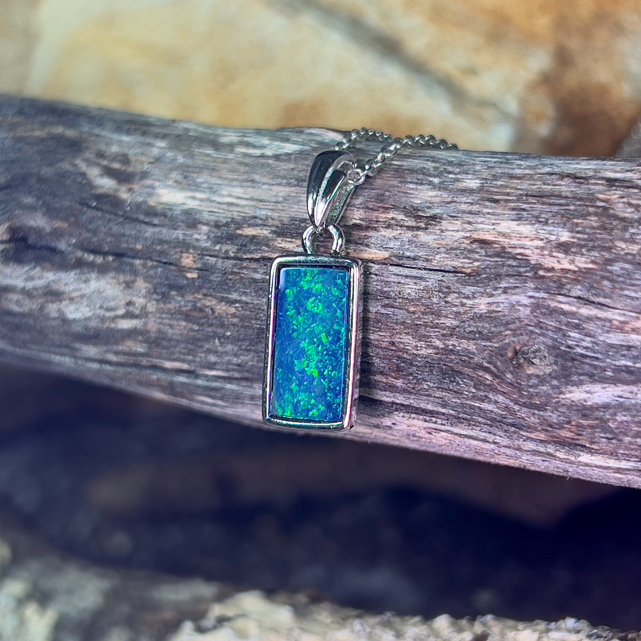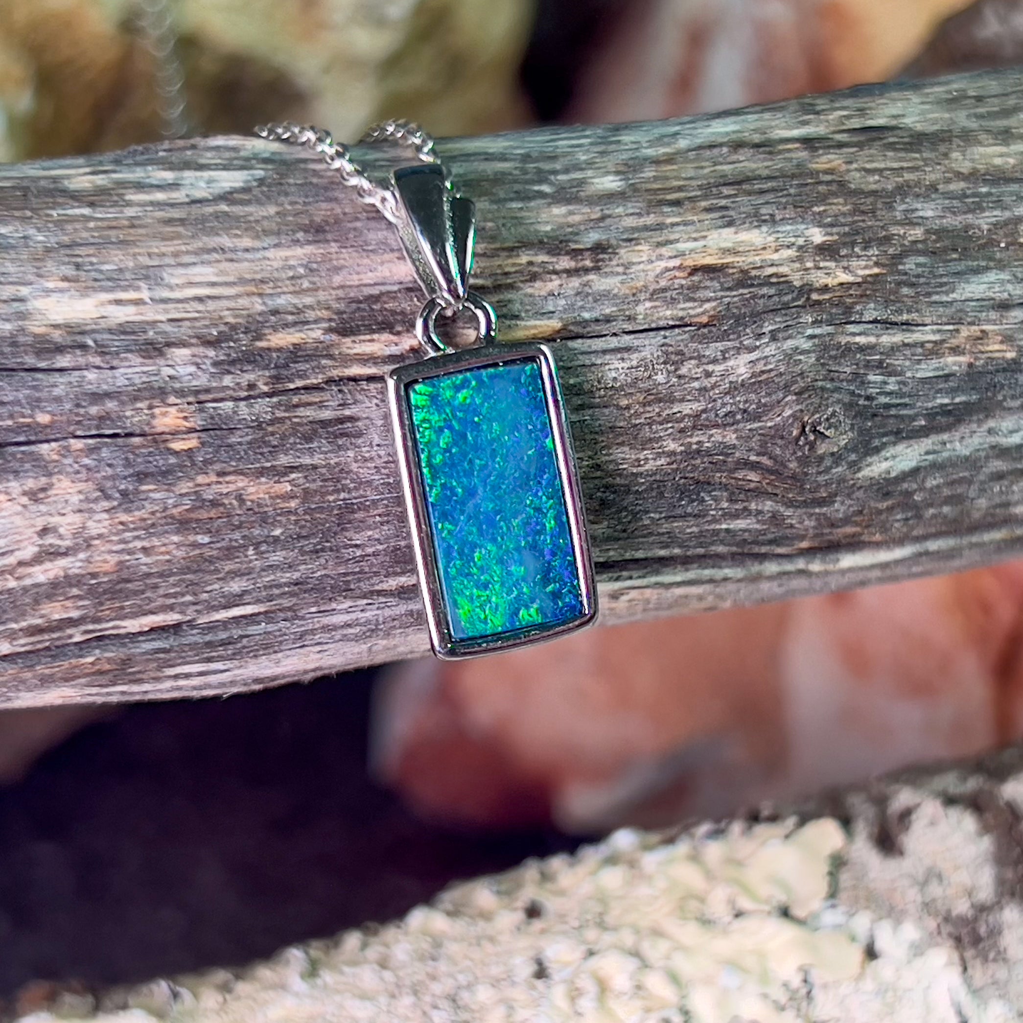 Sterling Silver Rectangle cut Opal doublet Blue Green pendant
