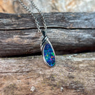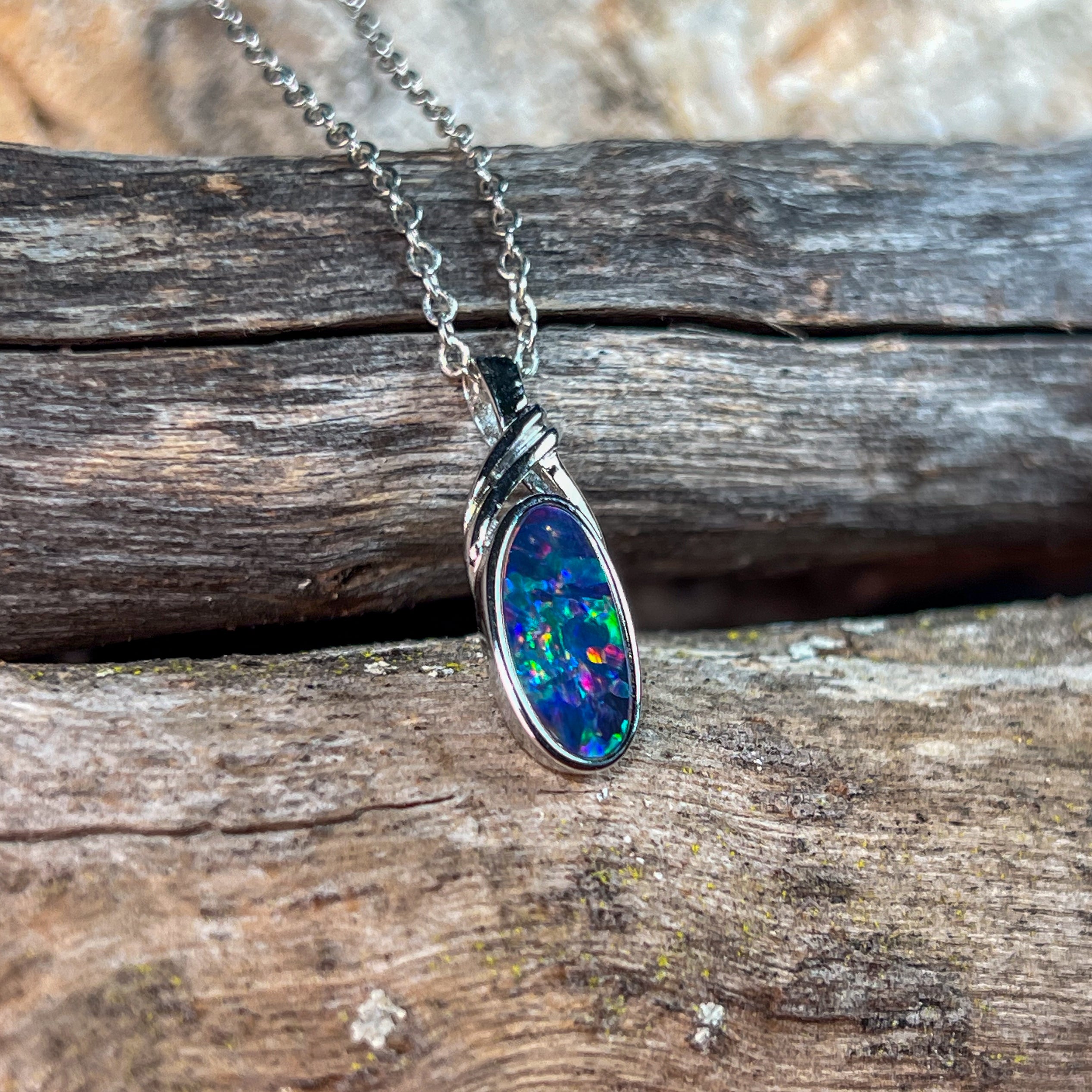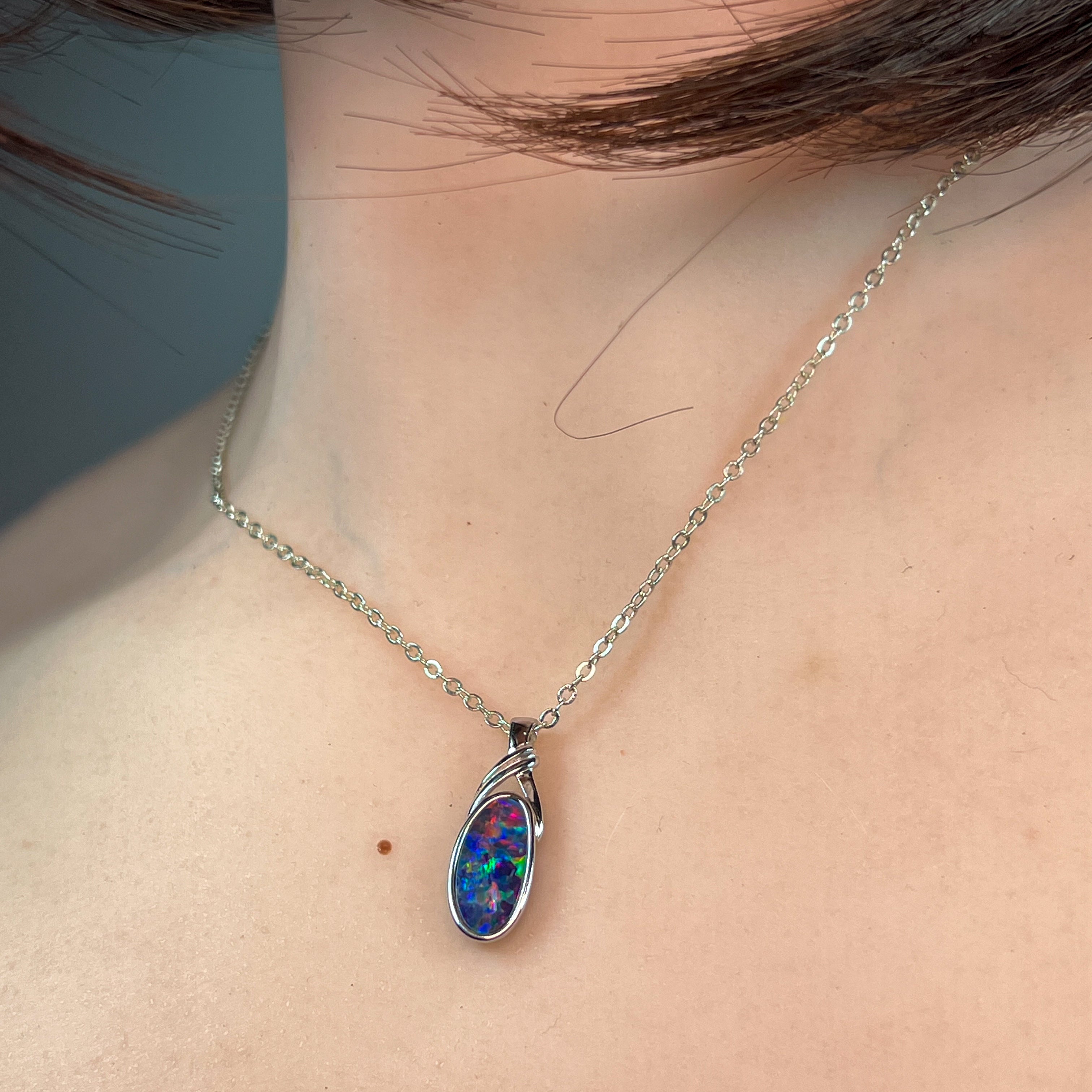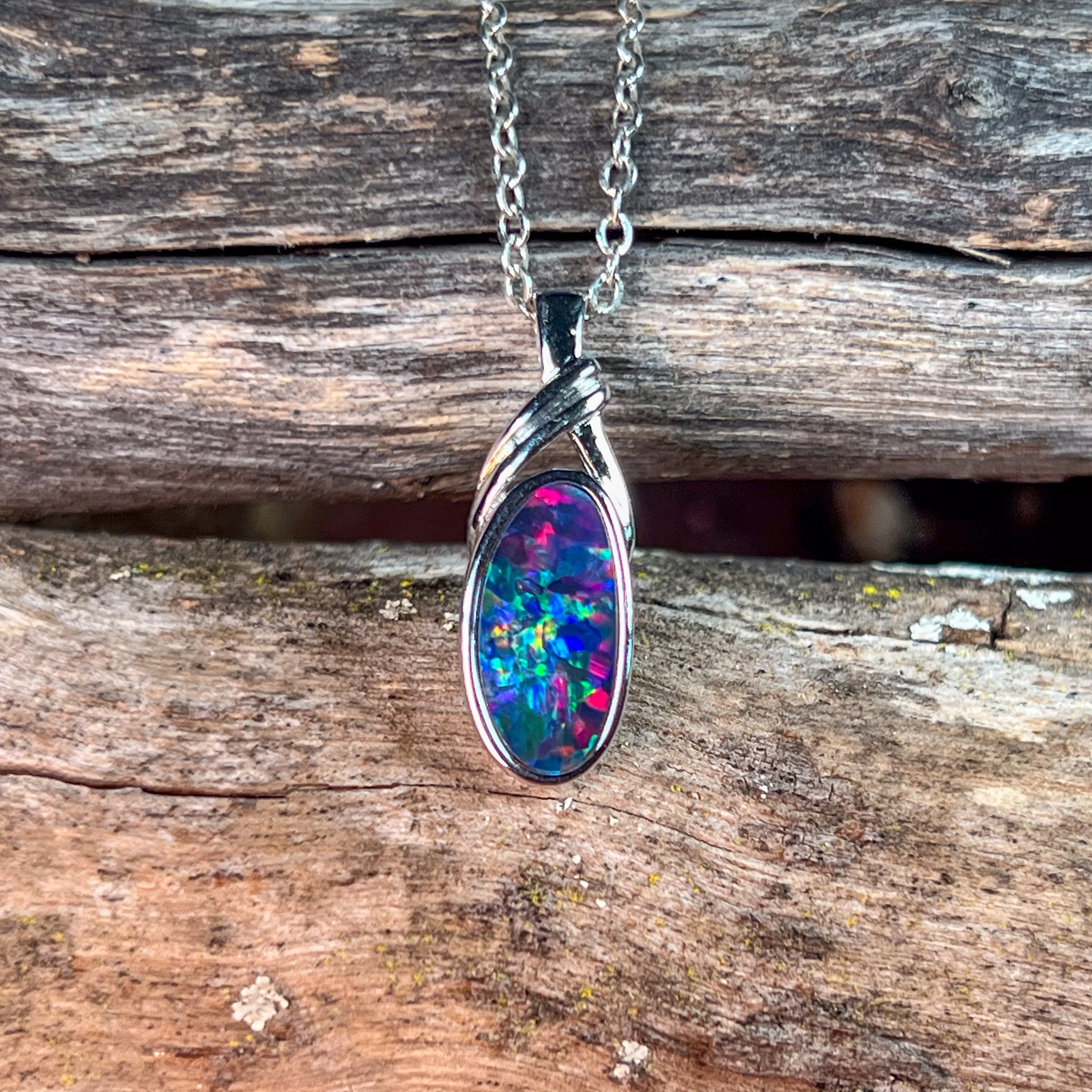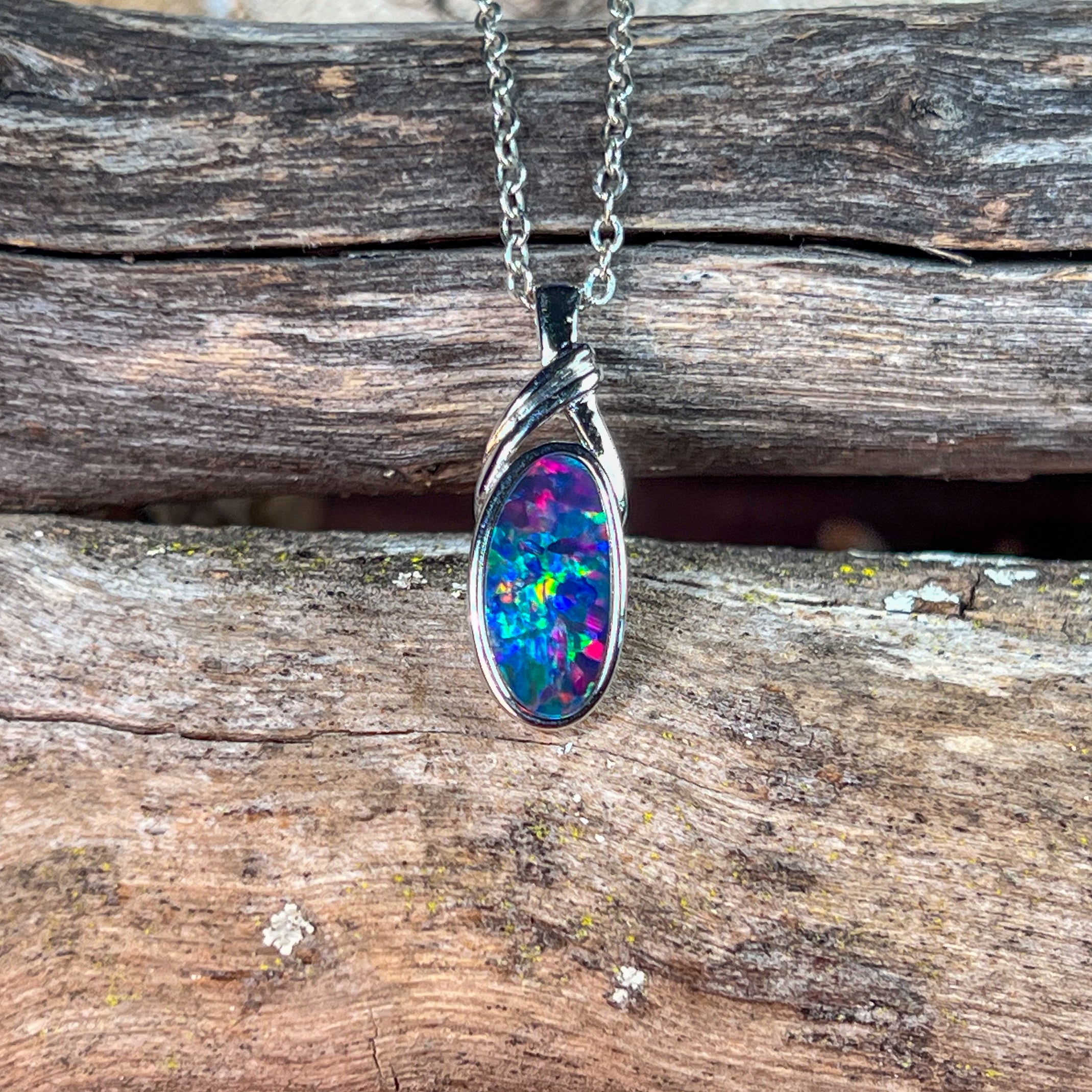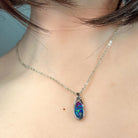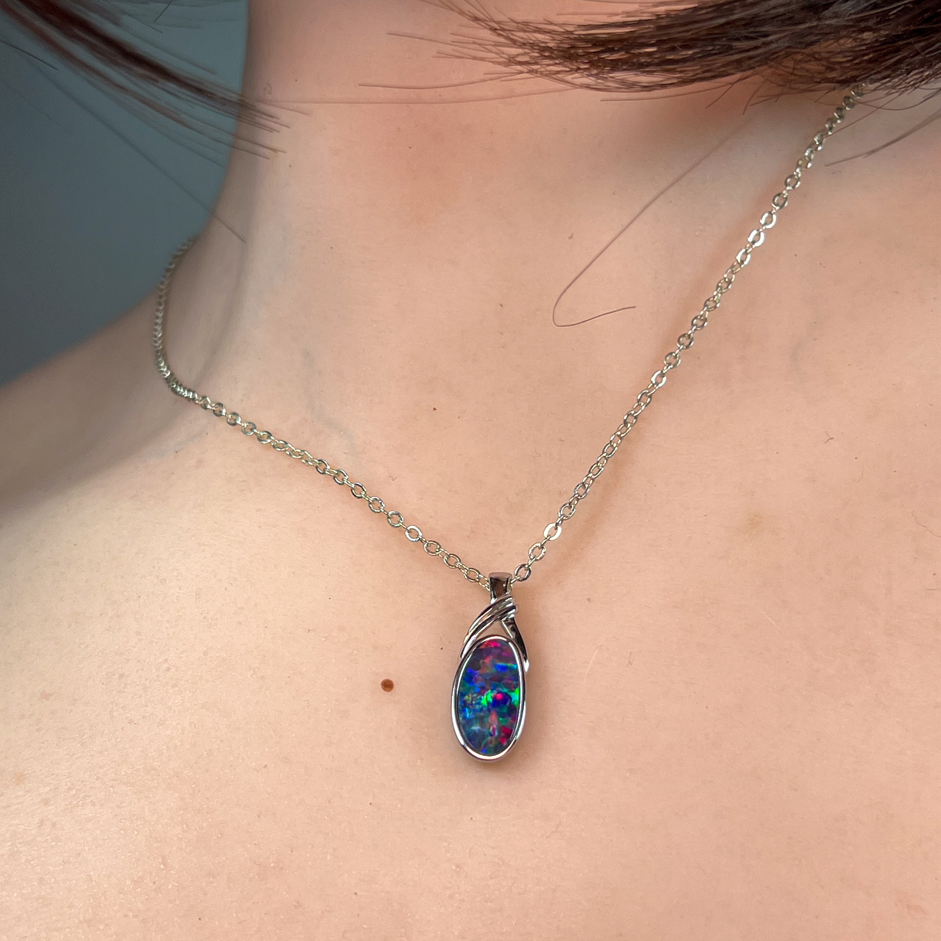 This stunning sterling silver pendant showcases a vibrant opal doublet that captures nature's most mesmerizing palette. The rich reds, deep blues, and lush greens dance across the stone's surface, creating a dynamic display of colour that shifts with every movement. Crafted in quality sterling silver, this piece combines timeless elegance with the raw beauty of genuine opal. Perfect for those who appreciate bold, eye-catching jewellery that makes a statement. A versatile treasure that elevates any outfit with its striking visual impact.