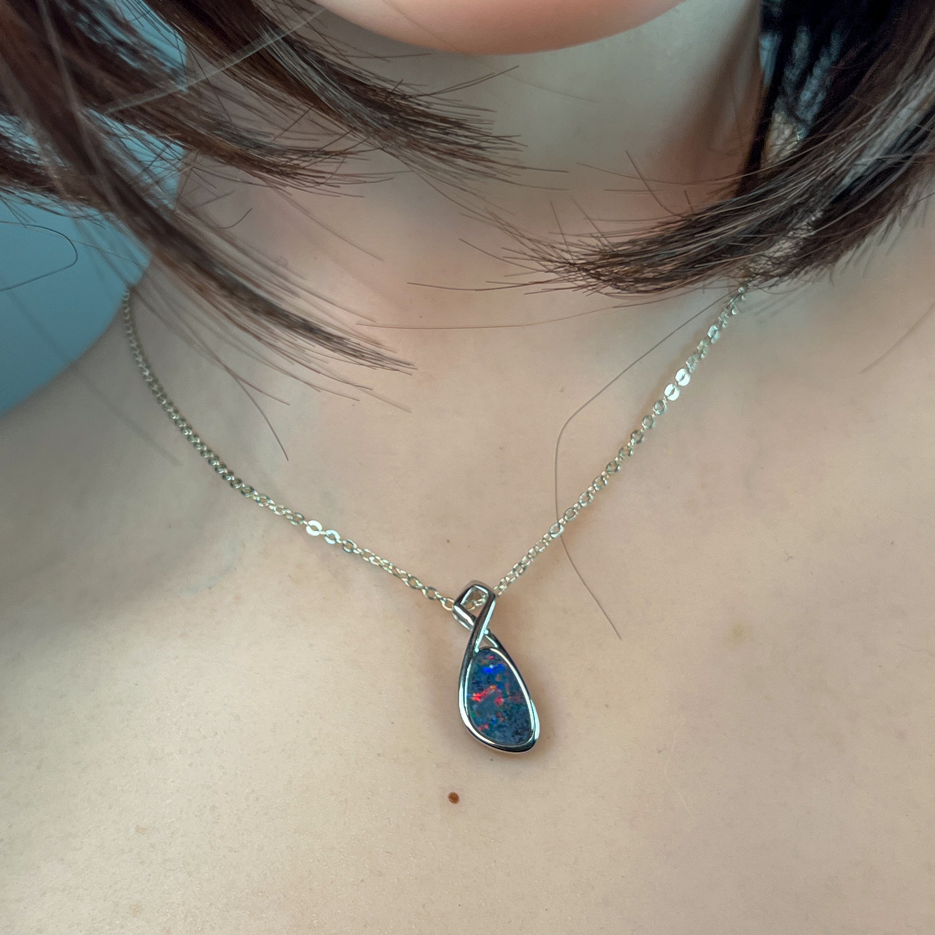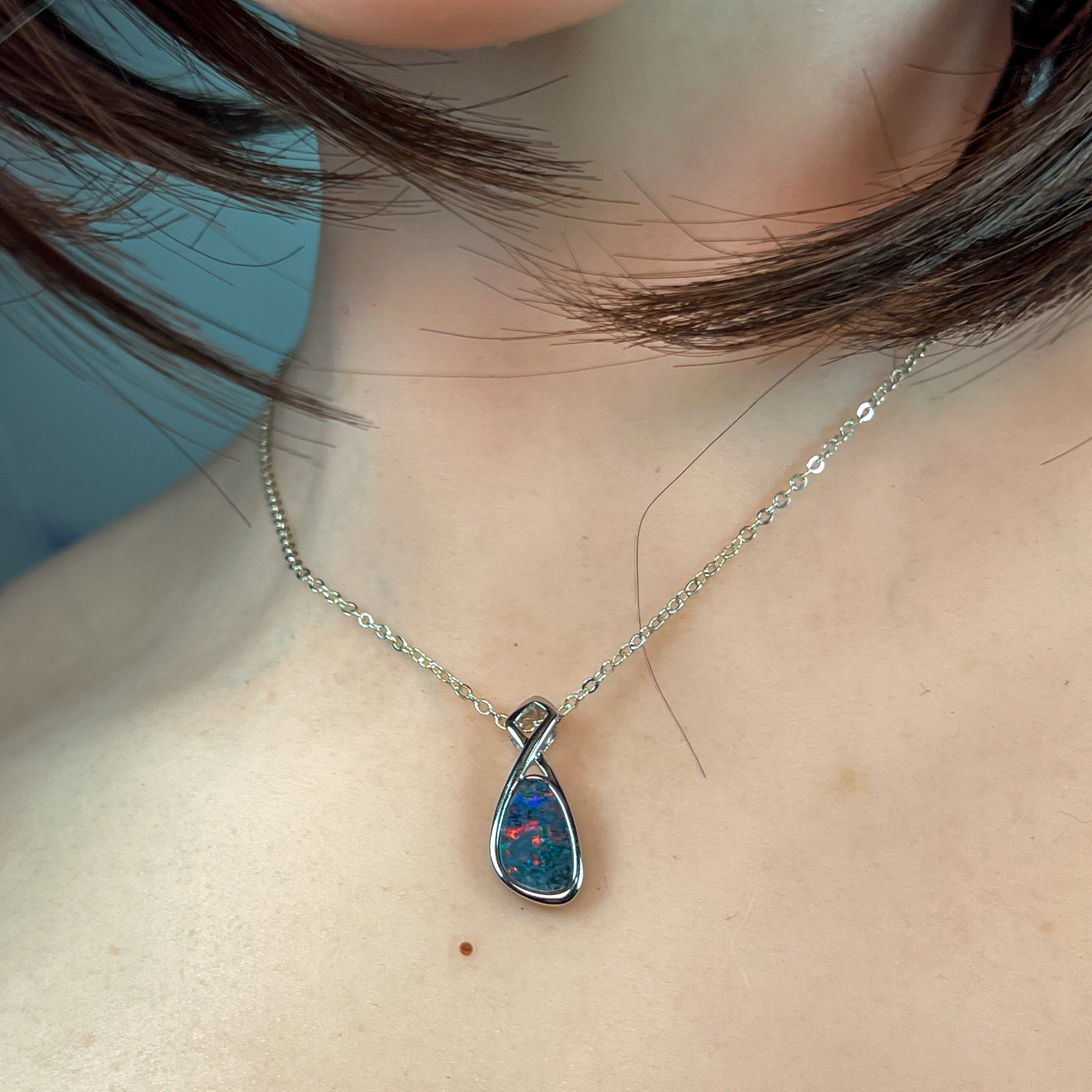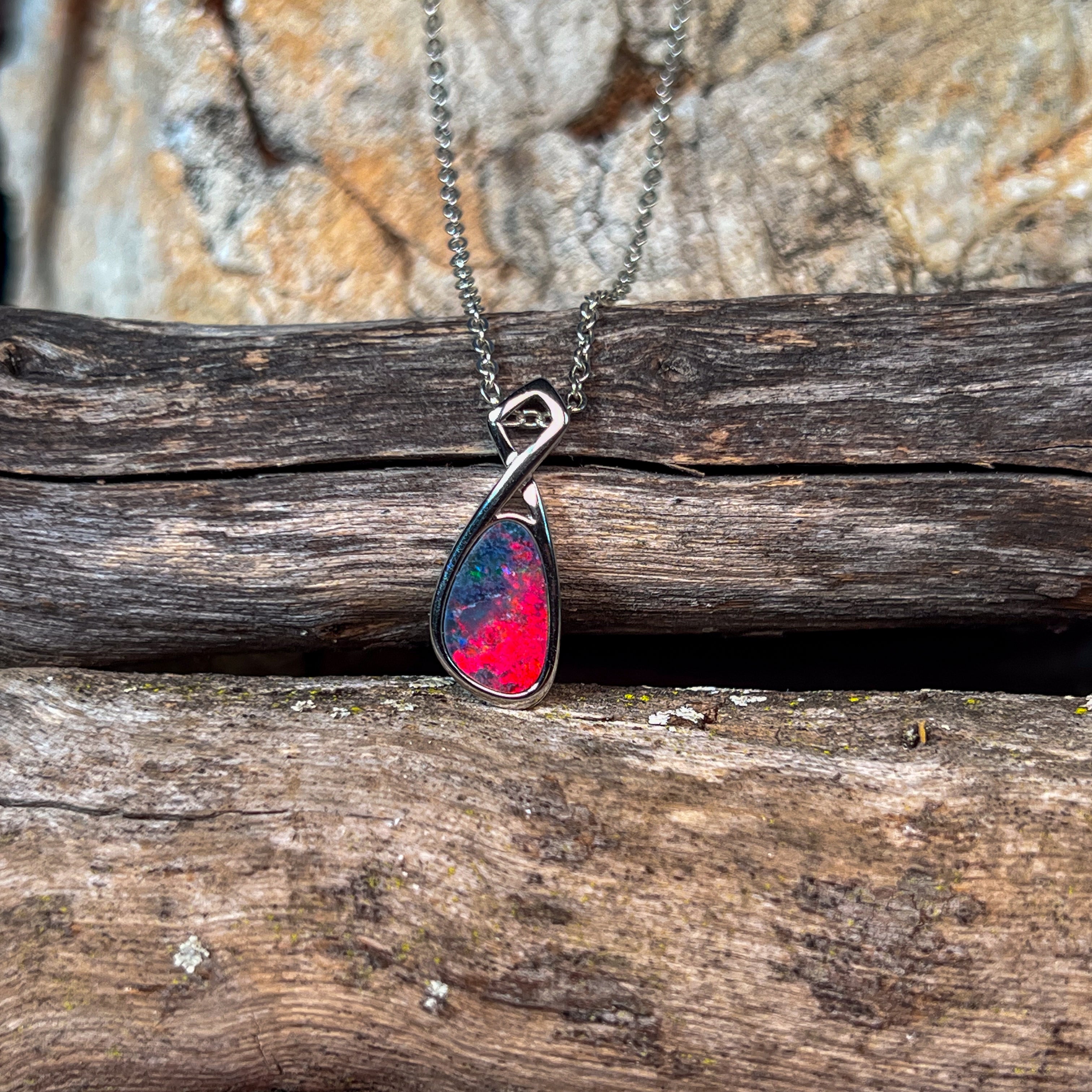 Captivate with the mesmerizing dance of colour in this sterling silver red flash opal doublet pendant. The vibrant red and orange hues burst through the stone's surface, creating a dynamic display that shifts with every movement. Crafted from genuine opal and expertly set in lustrous sterling silver, this piece combines natural beauty with timeless elegance. Perfect for those who appreciate bold, statement-making jewellery that celebrates the raw magic of Australian gemstones. A wearable work of art that transforms any outfit into something extraordinary.