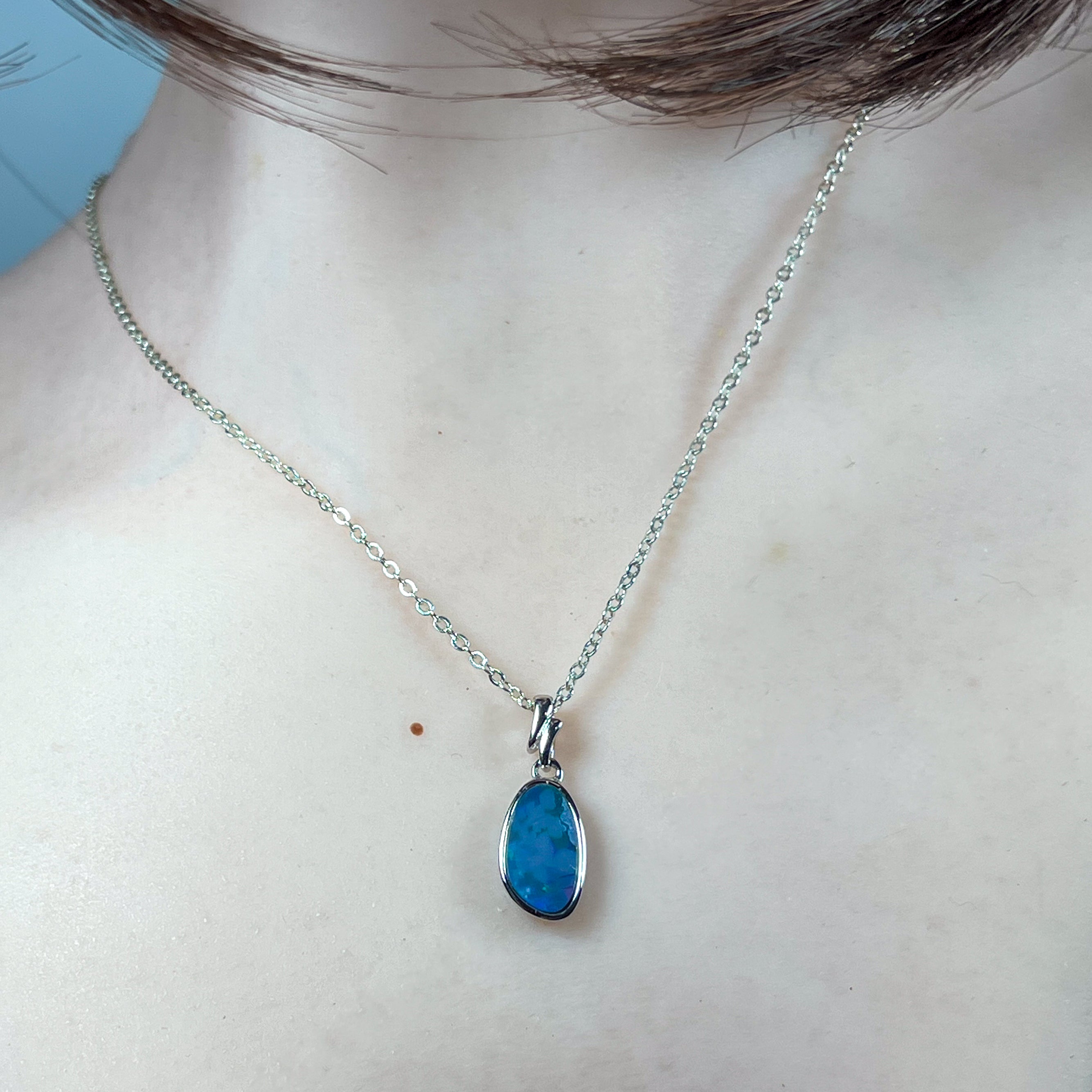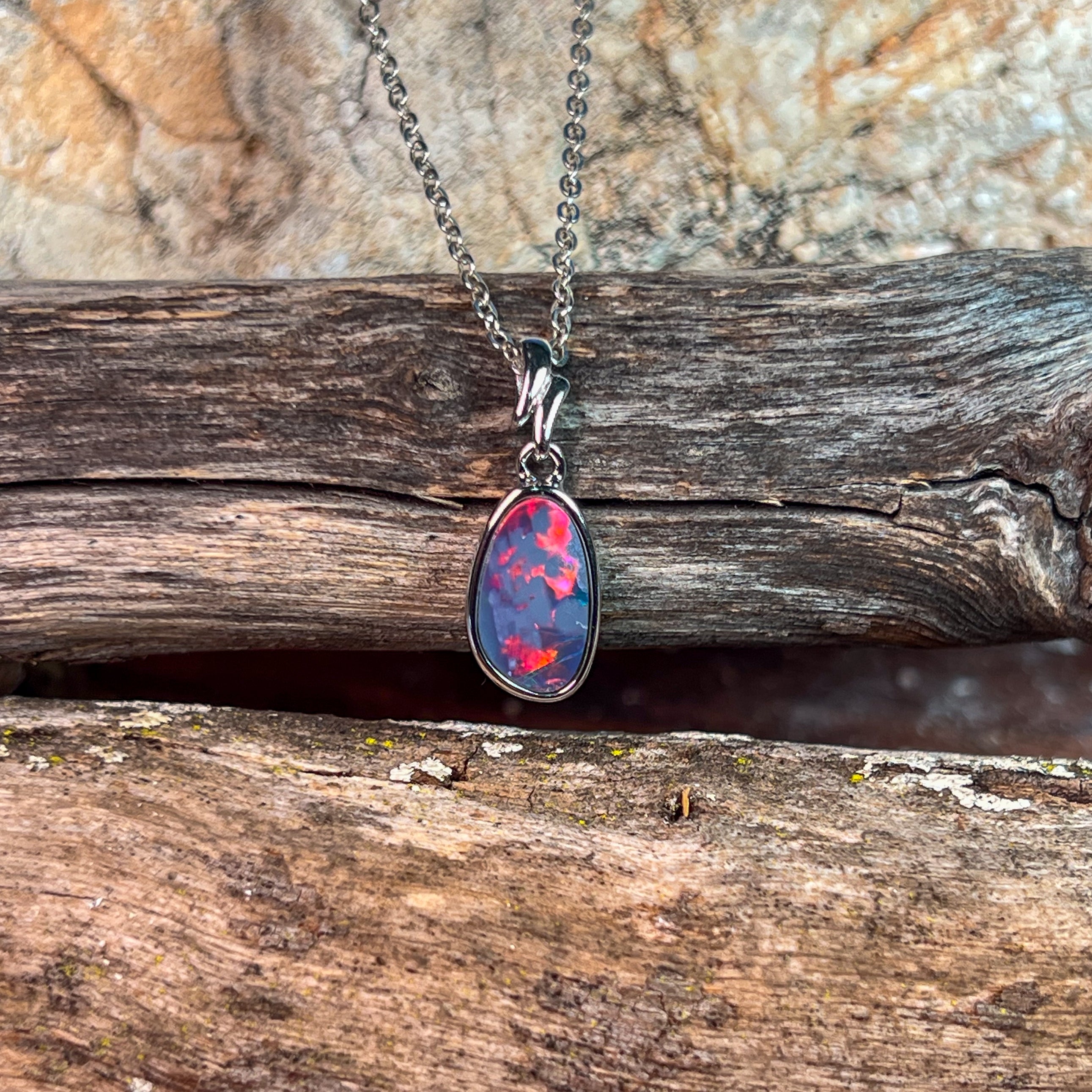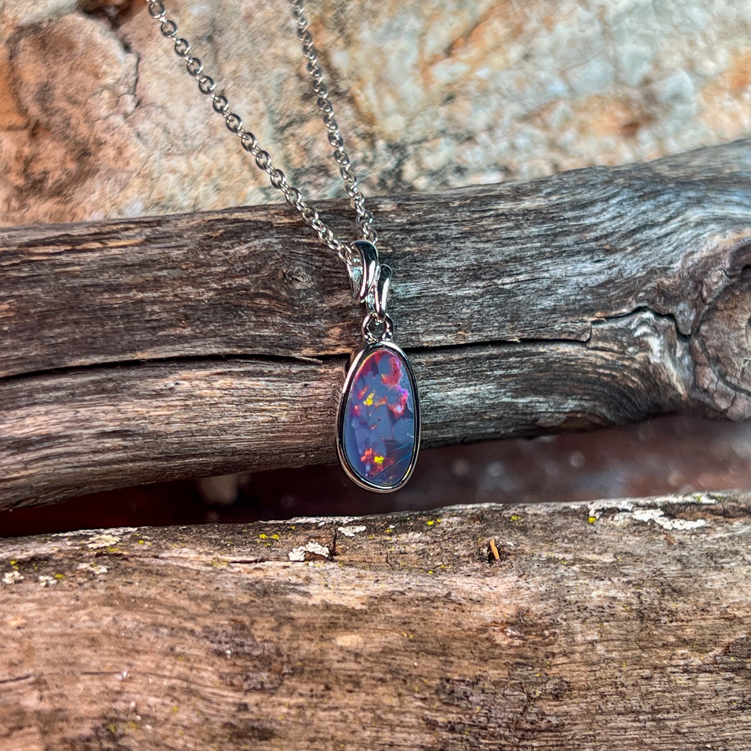 Witness the mesmerizing dance of colour in this stunning sterling silver opal doublet pendant. The vibrant red flash erupts across a rich purple base, creating a dynamic display that shifts and sparkles with every movement. Crafted from premium sterling silver, this piece combines durability with elegance, making it a captivating addition to any jewellery collection. Perfect for those who appreciate nature's most enchanting gemstones and desire a pendant that truly commands attention.