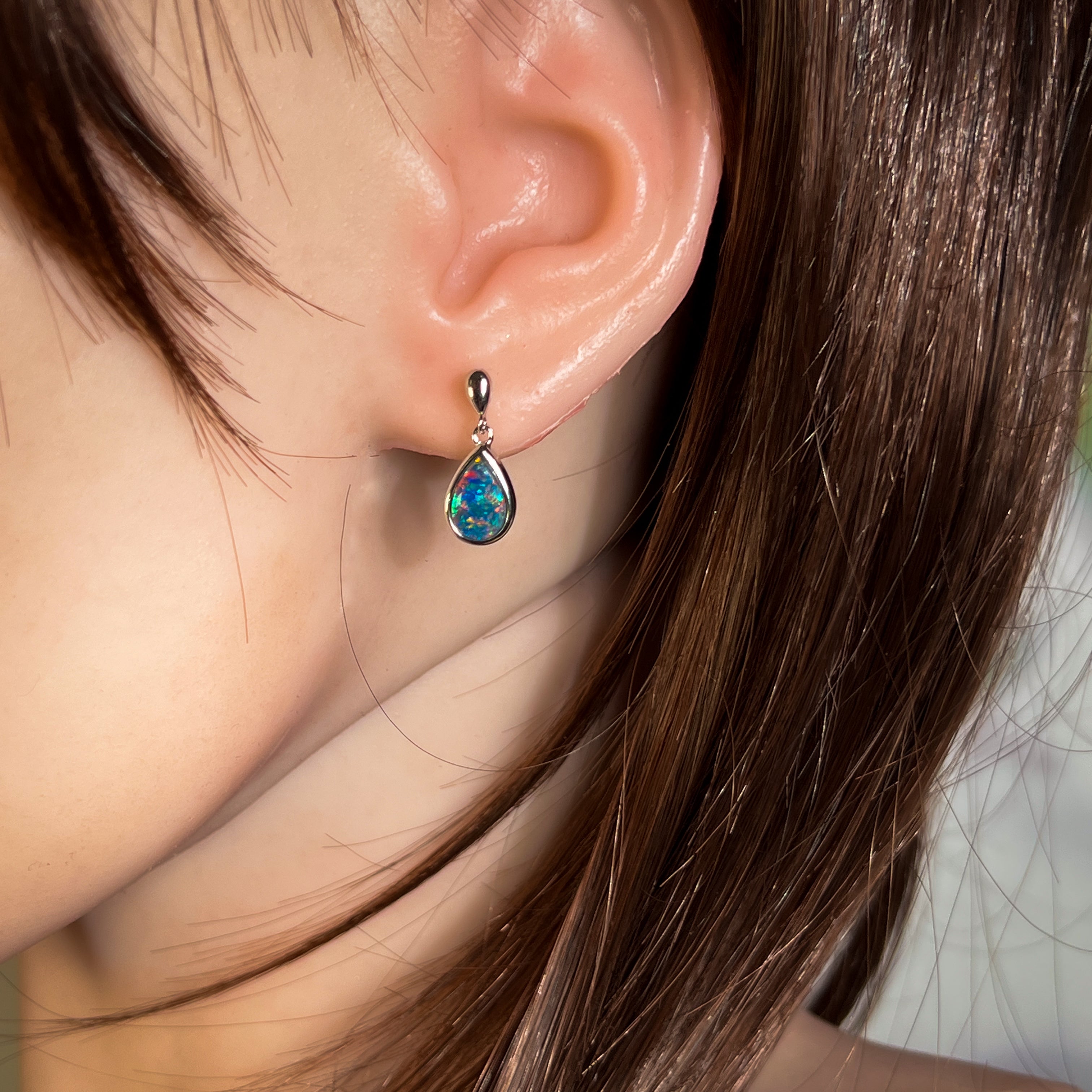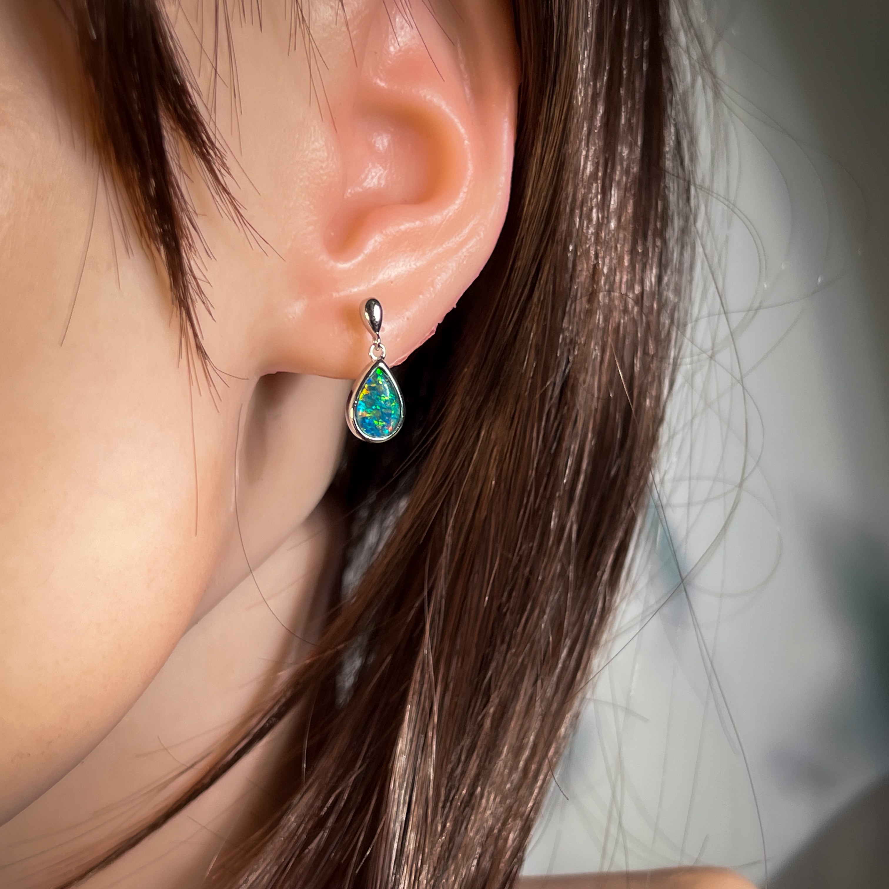 Experience the elegance of our Sterling Silver Opal Triplet featuring a mesmerizing 9x6mm pear-shaped stone. The dangling design adds a touch of movement to your outfit, making you stand out from the crowd. Elevate your style with the captivating beauty of this unique piece of jewelry.