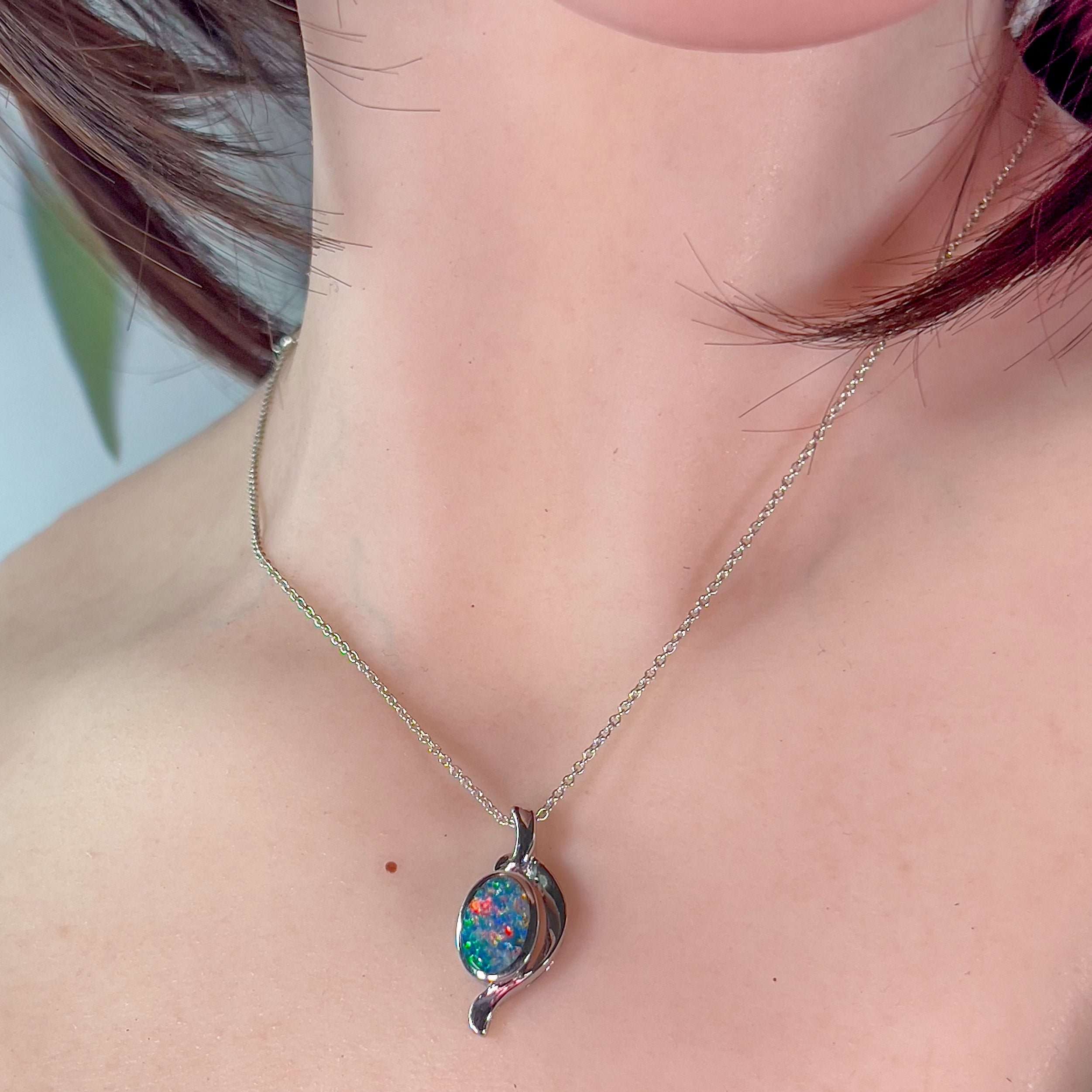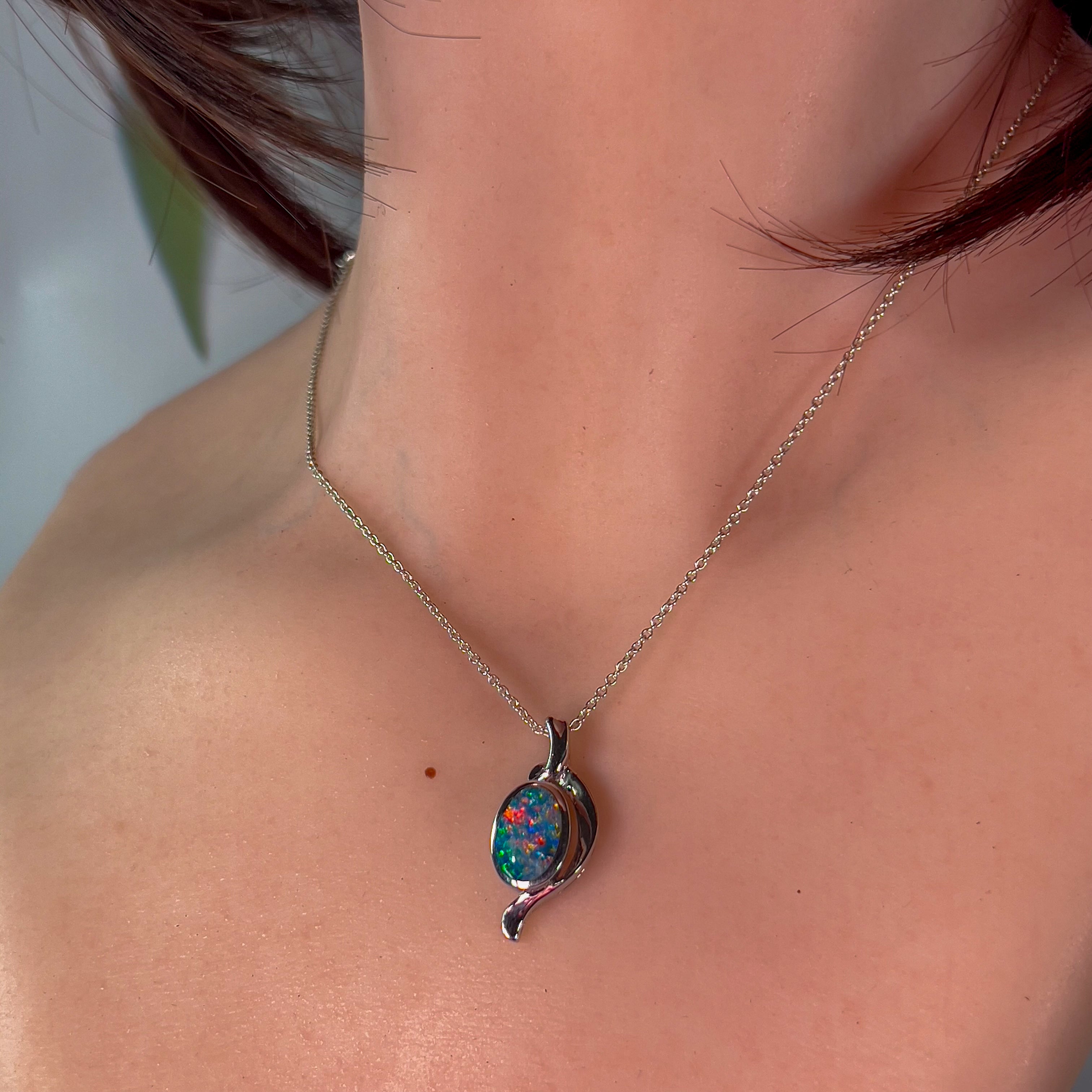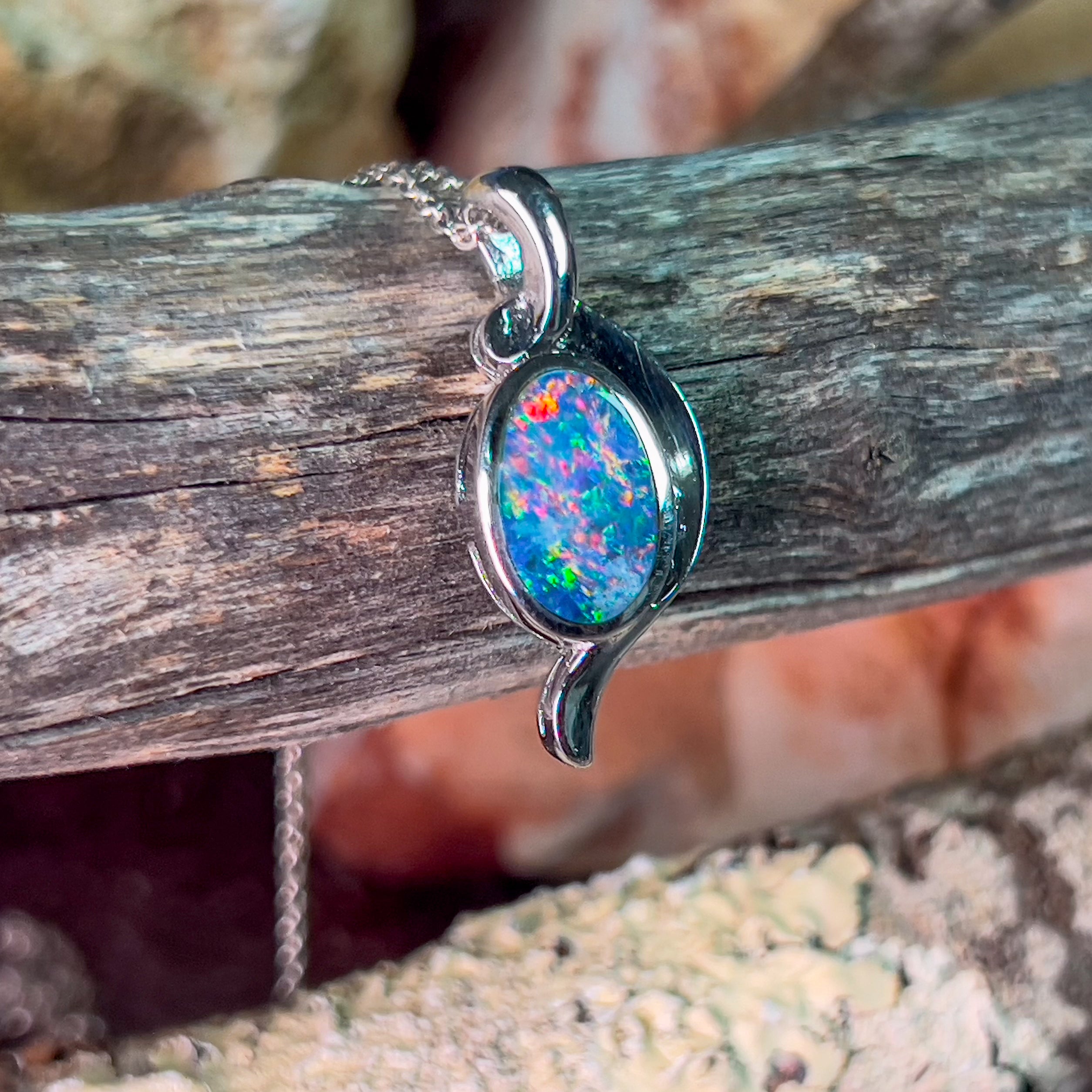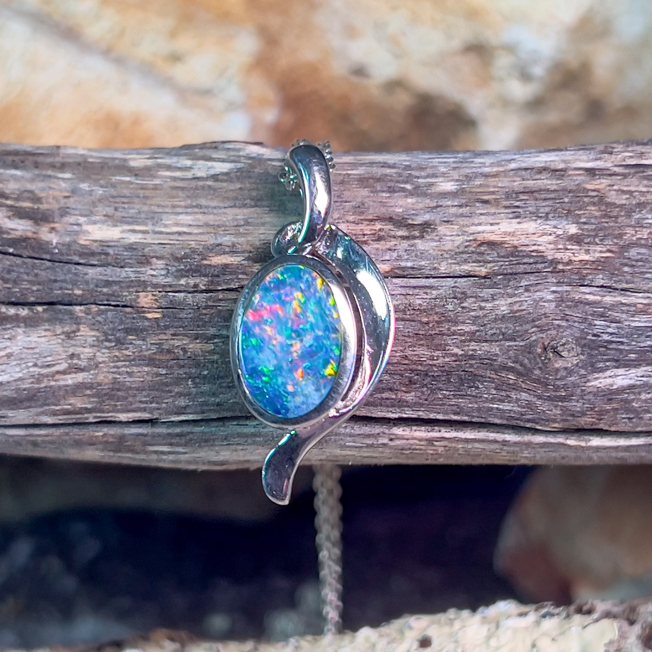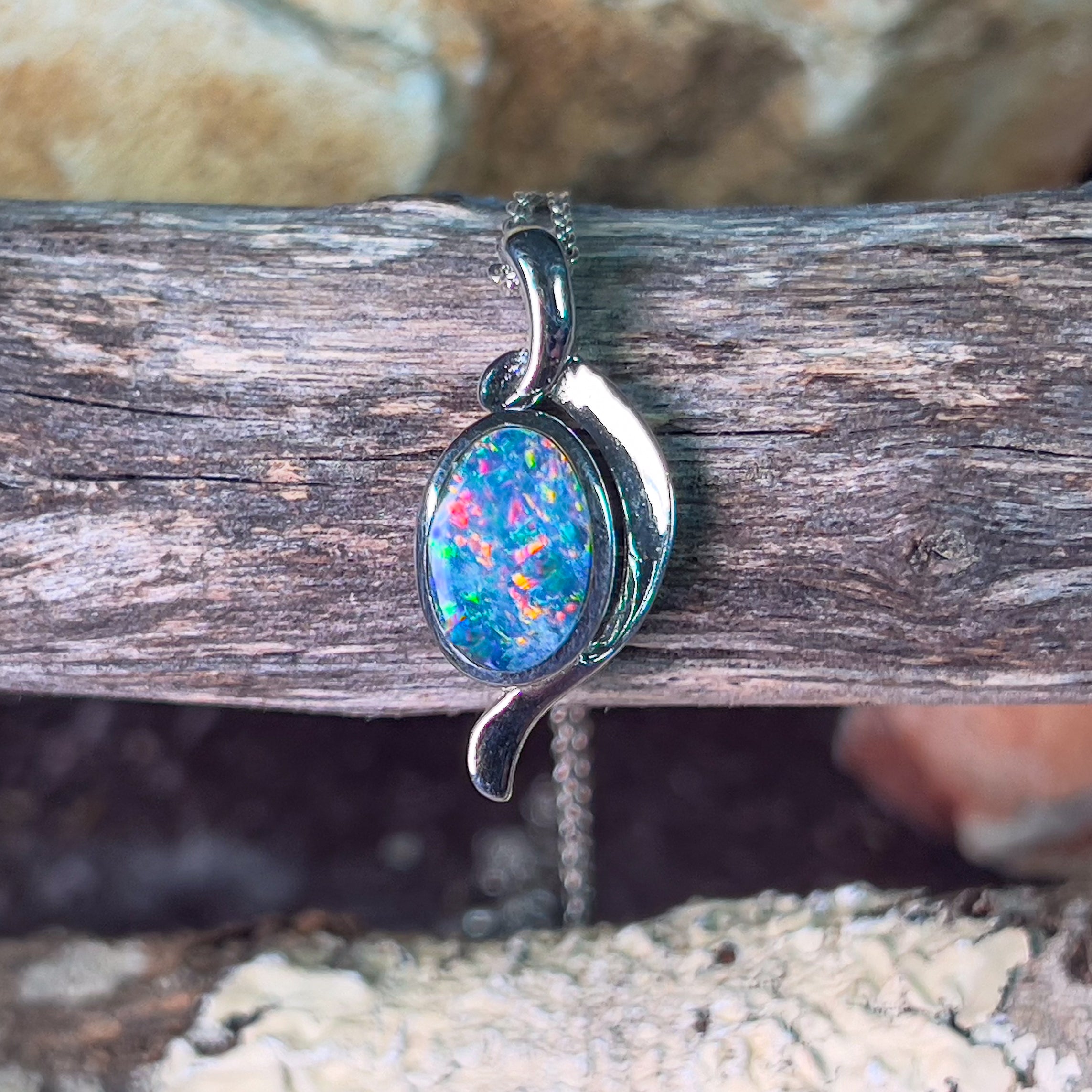 Elevate your style with the stunning Sterling Silver swirl drop pendant! The beautiful Oval Opal doublet pendant adds a touch of elegance to any outfit while the swirl design adds a unique and eye-catching element. This pendant is sure to make a statement and leave you feeling confident and stylish.