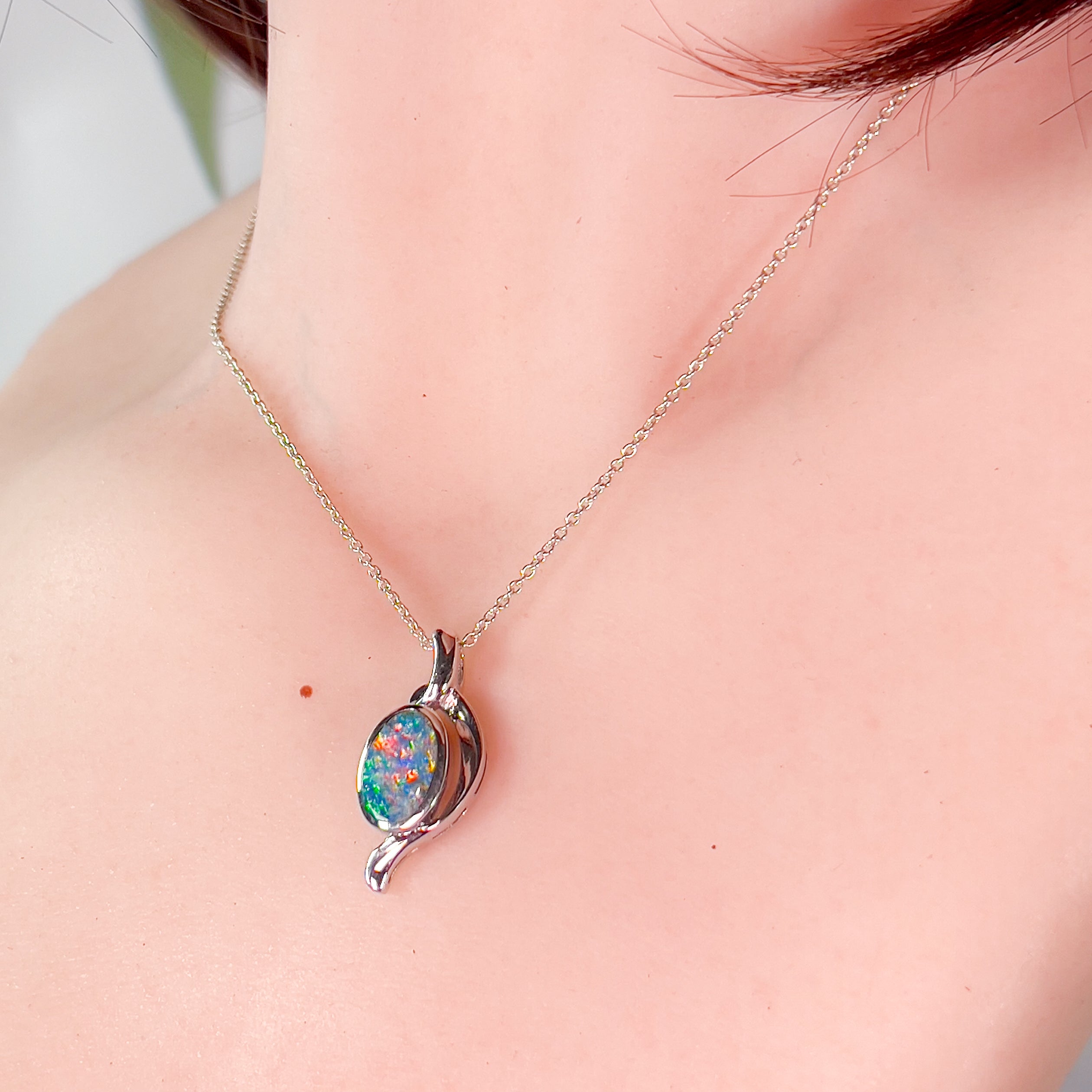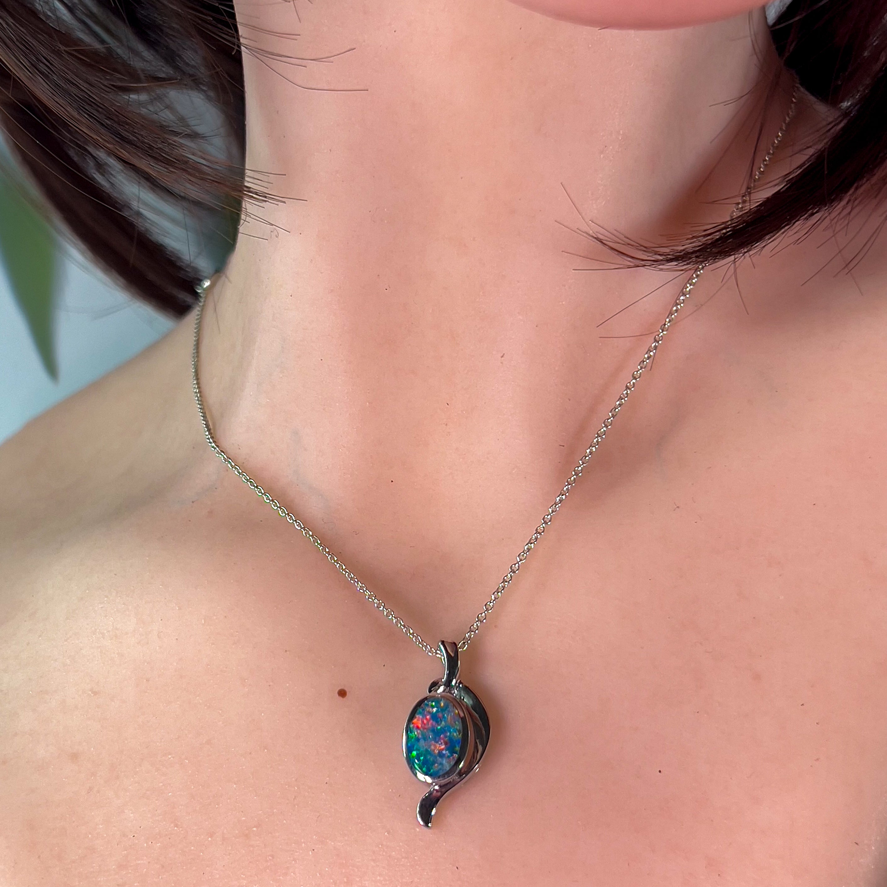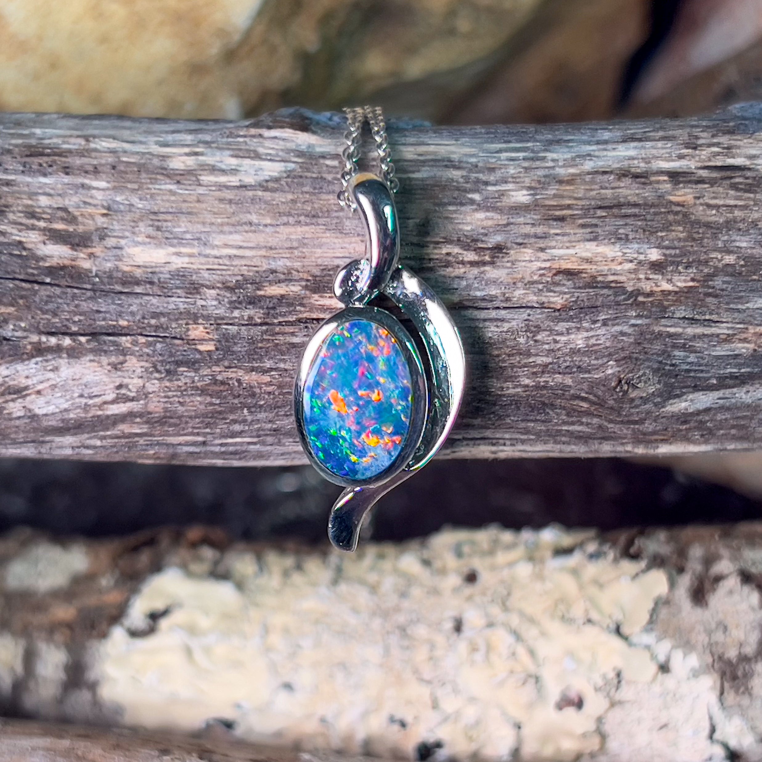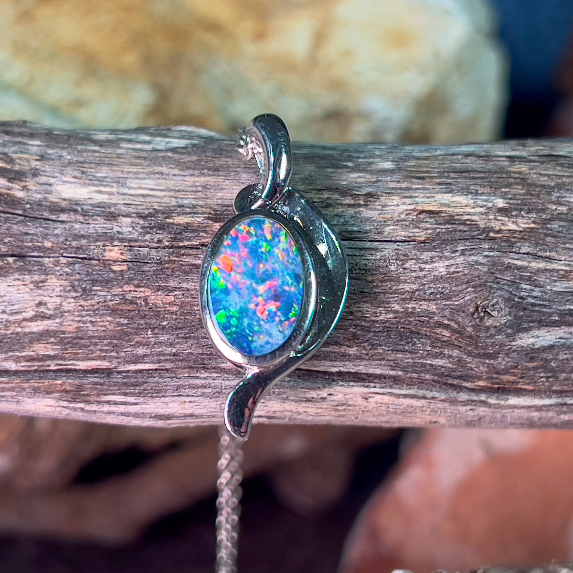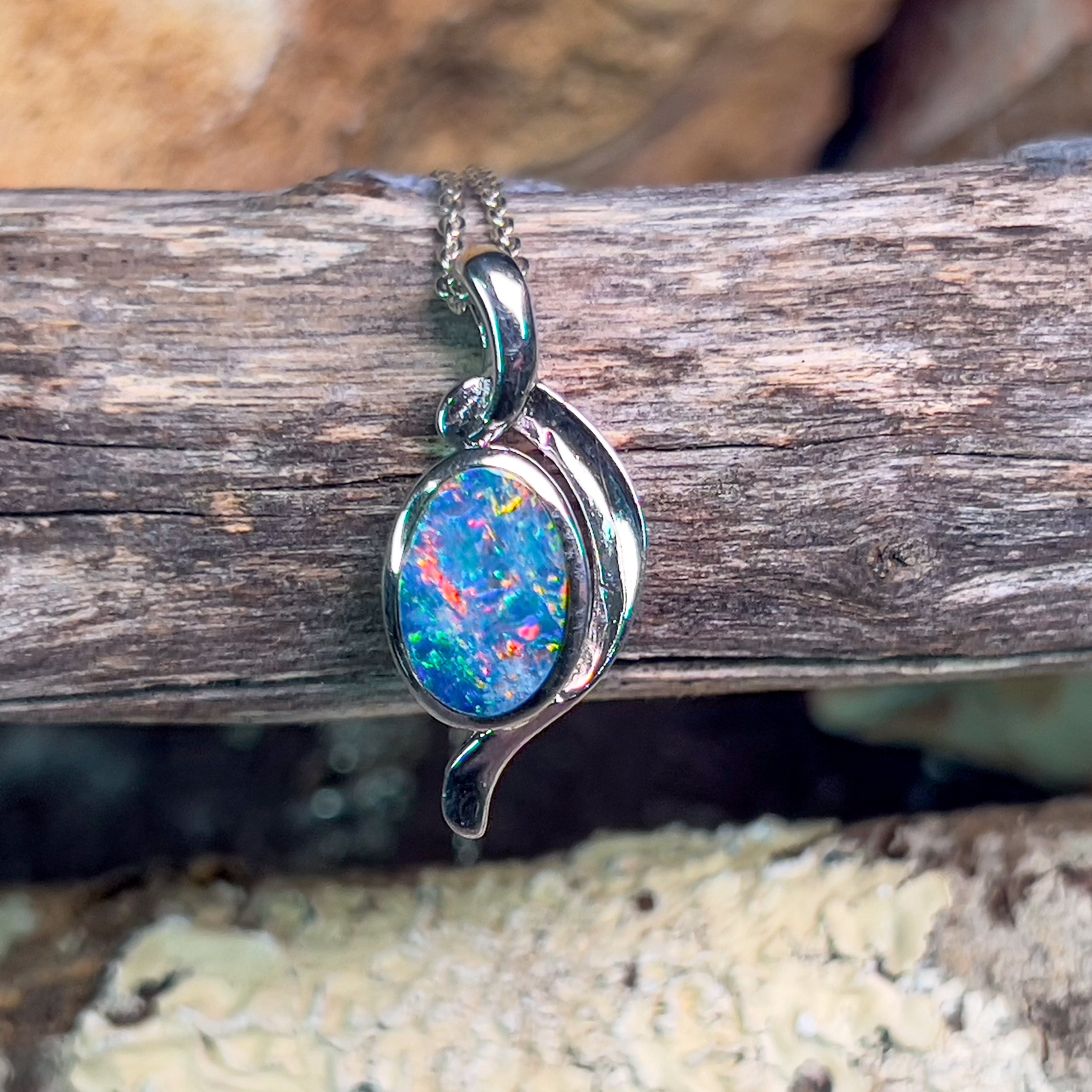 Elevate your style with the stunning Sterling Silver swirl drop pendant! The beautiful Oval Opal doublet pendant adds a touch of elegance to any outfit while the swirl design adds a unique and eye-catching element. This pendant is sure to make a statement and leave you feeling confident and stylish.