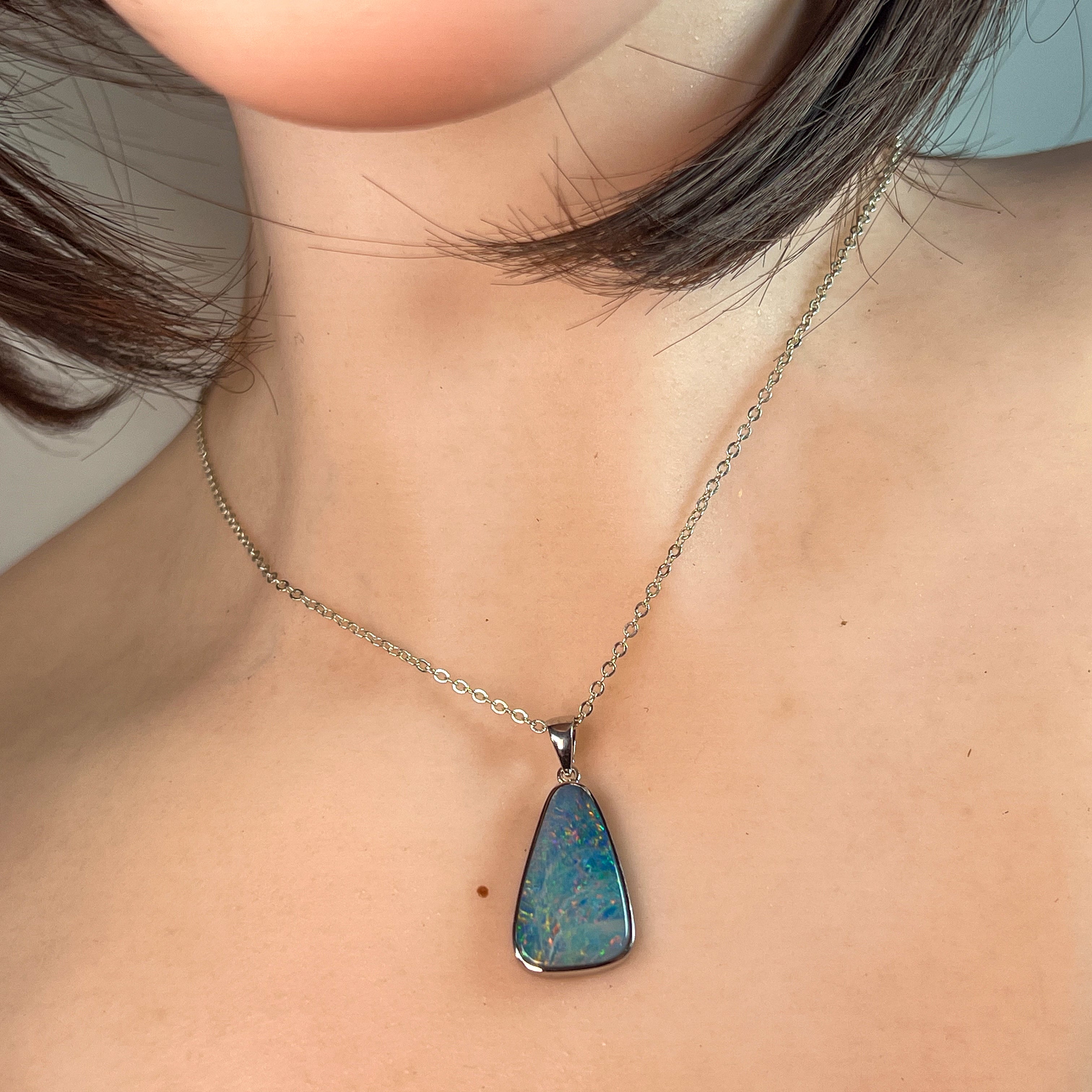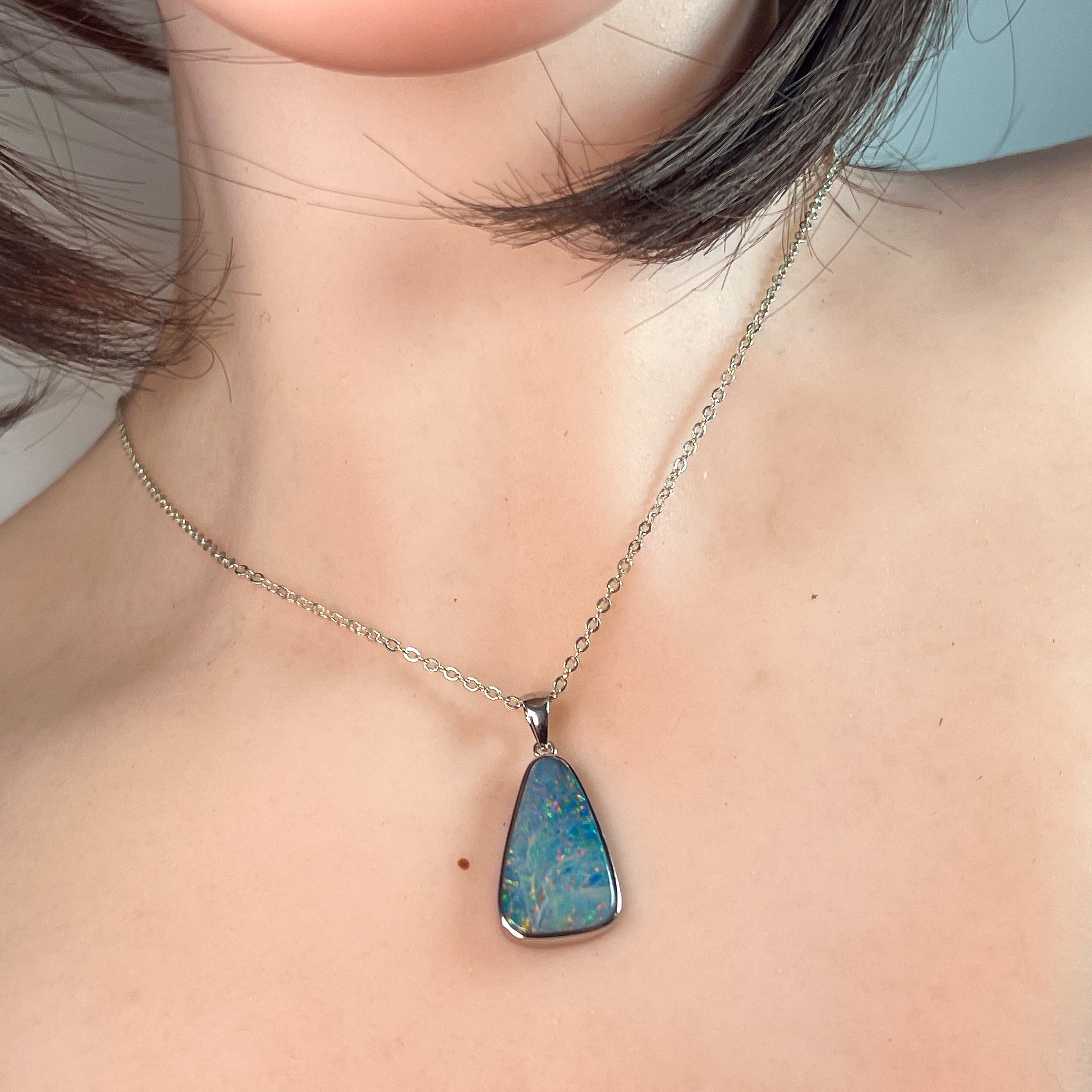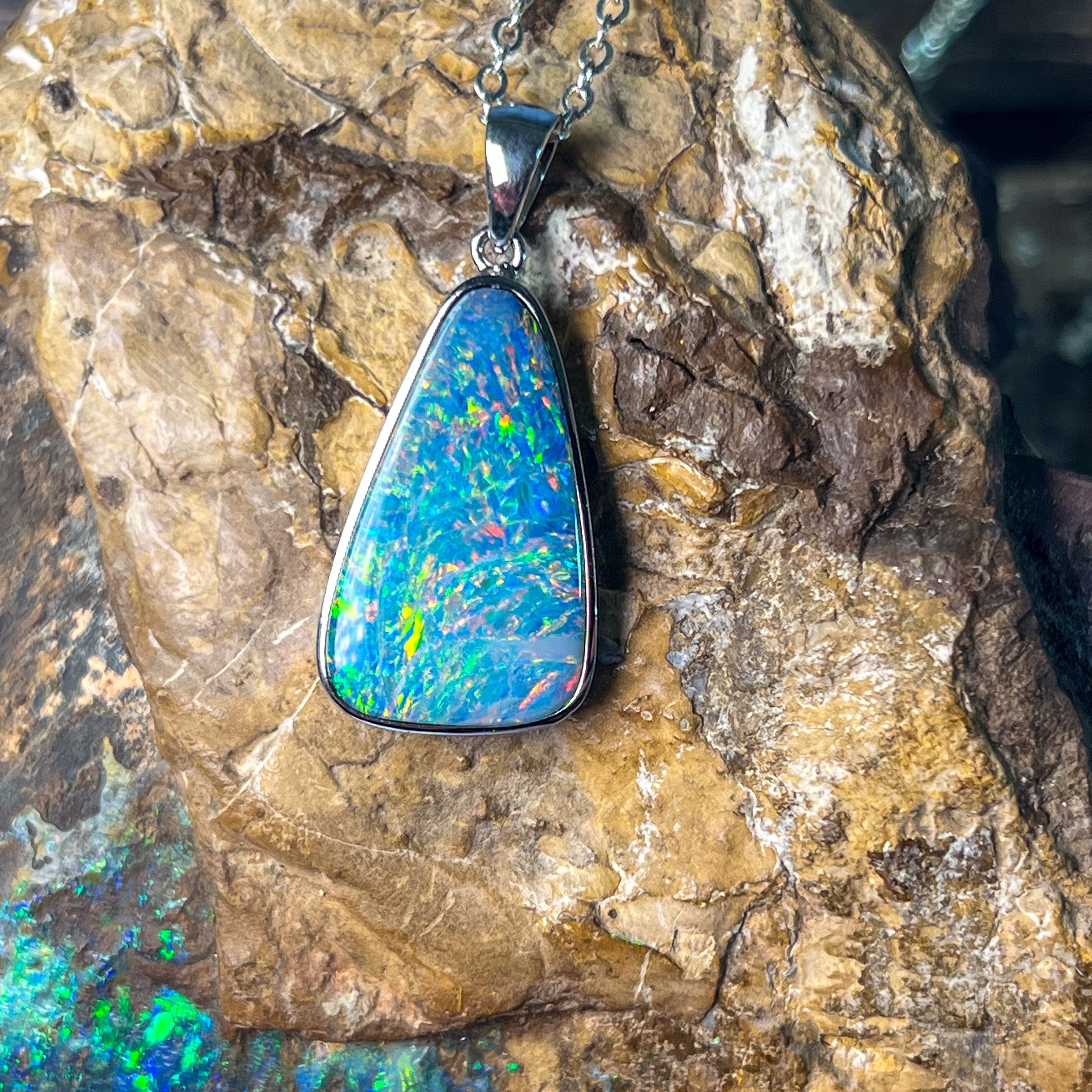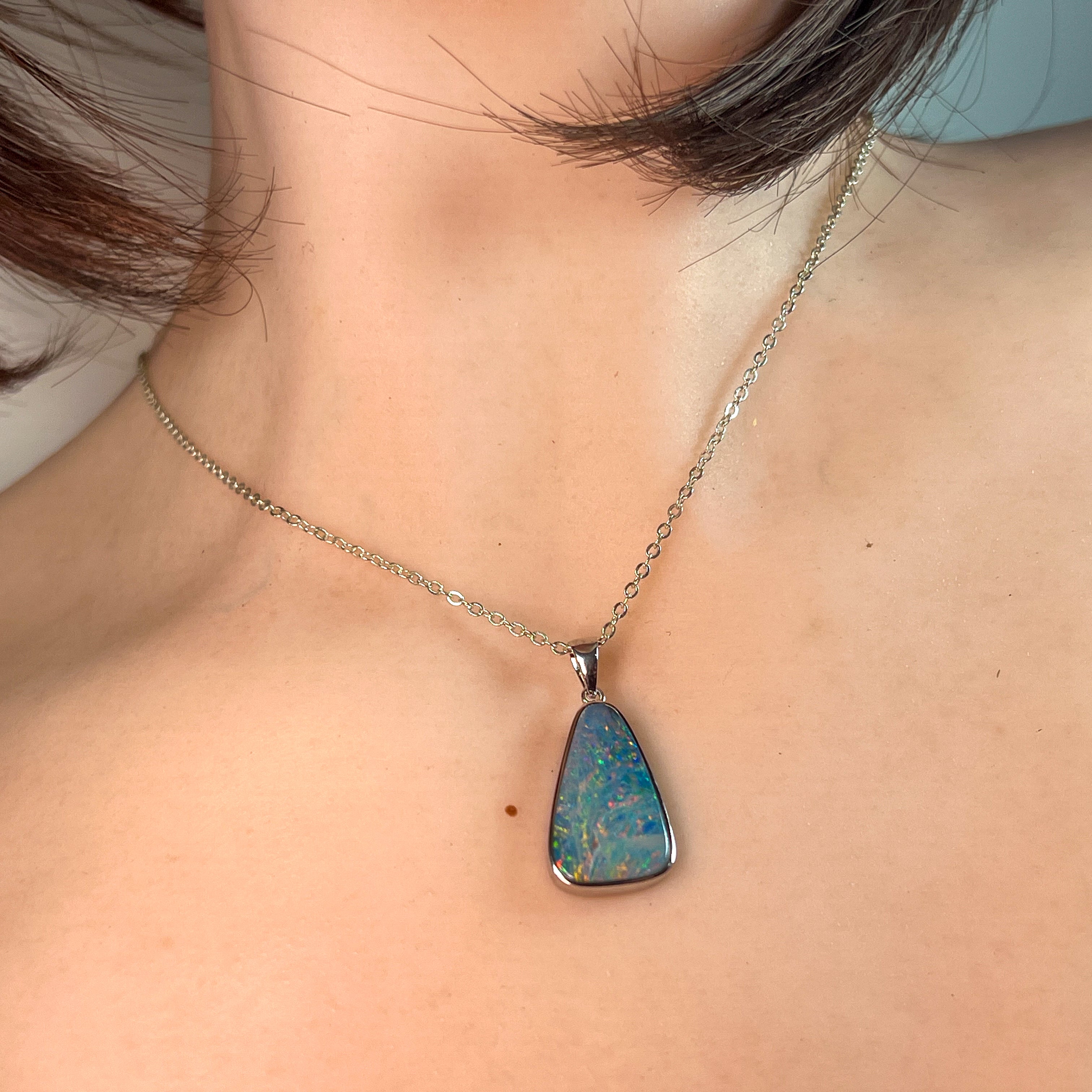 Elevate your style with this Sterling Silver pendant featuring a striking triangle drop shape. The captivating green and orange Opal doublet gleams with vibrant colors, adding a unique and elegant touch to any outfit. Crafted to highlight the stone’s natural beauty, this pendant combines timeless design with eye-catching appeal, making it a perfect accessory for both everyday wear and special occasions.