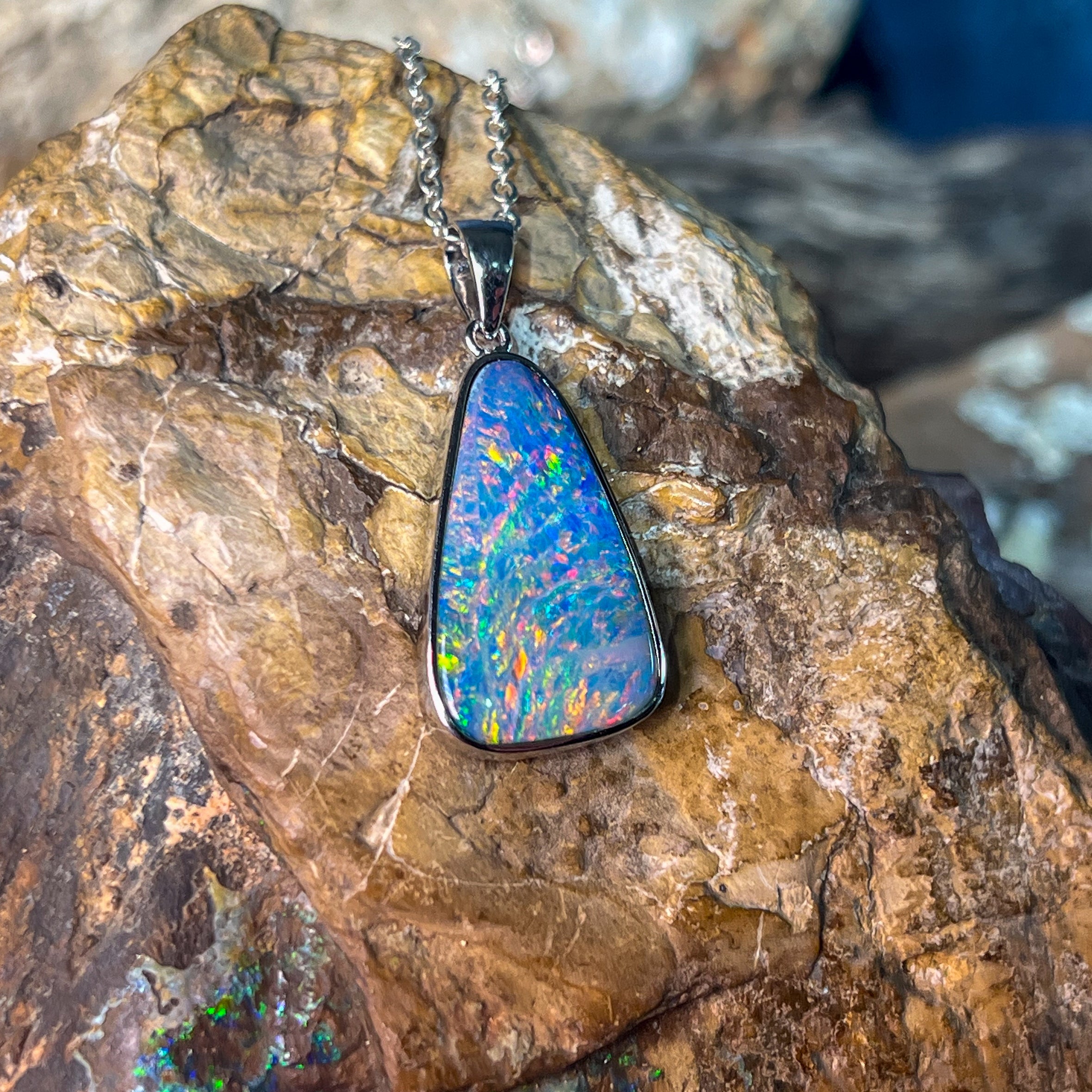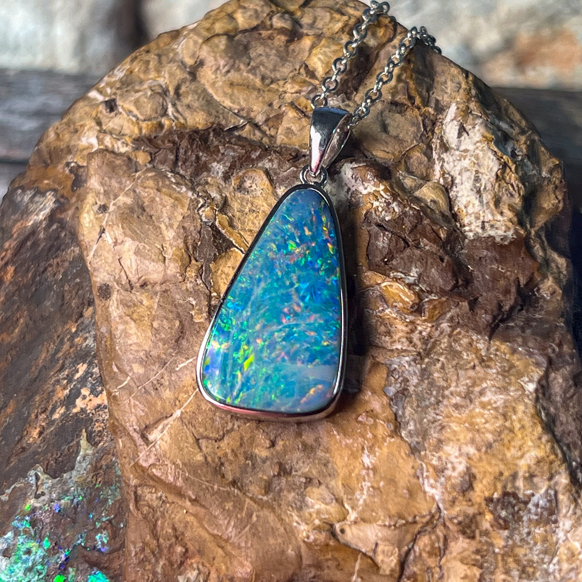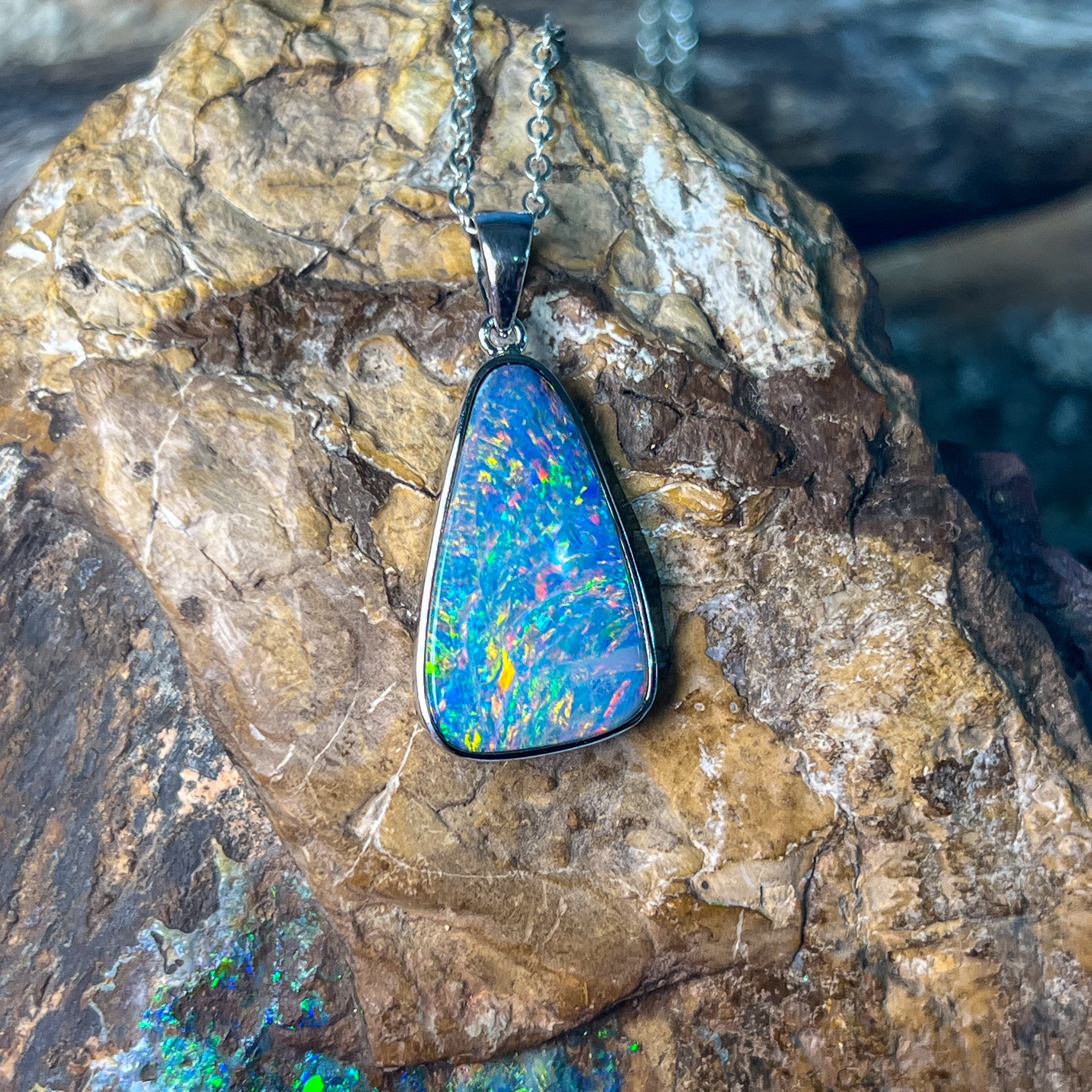 Elevate your style with this Sterling Silver pendant featuring a striking triangle drop shape. The captivating green and orange Opal doublet gleams with vibrant colors, adding a unique and elegant touch to any outfit. Crafted to highlight the stone’s natural beauty, this pendant combines timeless design with eye-catching appeal, making it a perfect accessory for both everyday wear and special occasions.