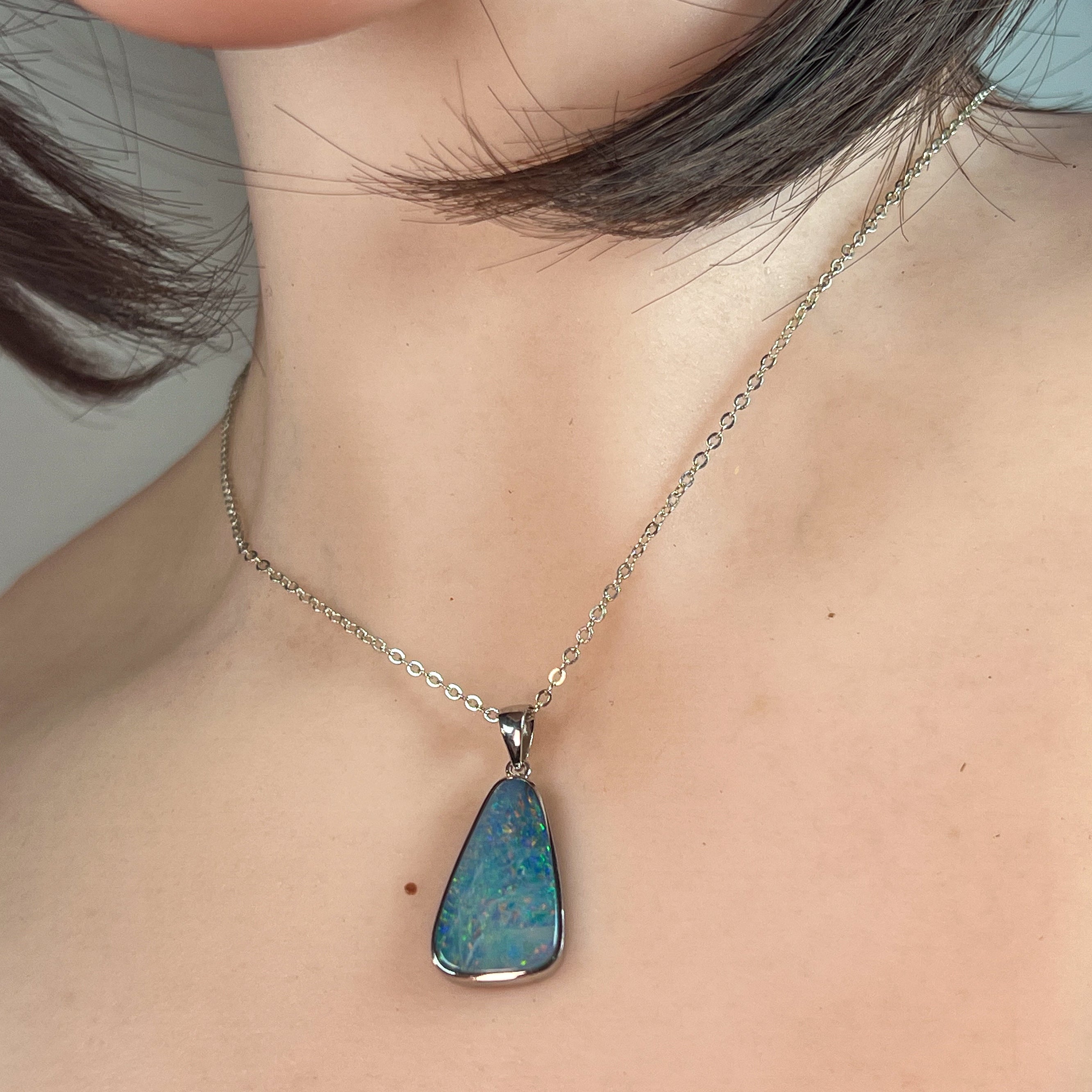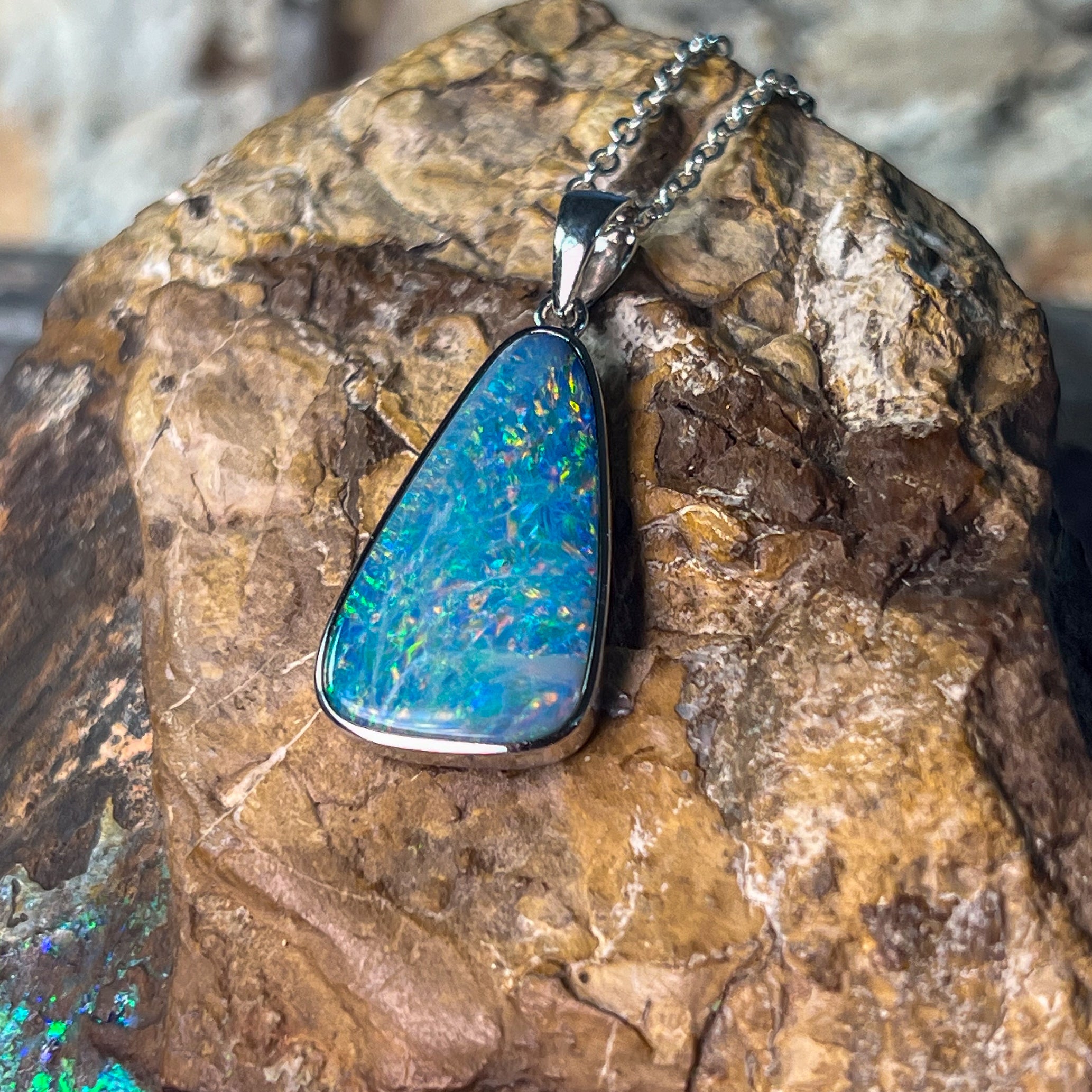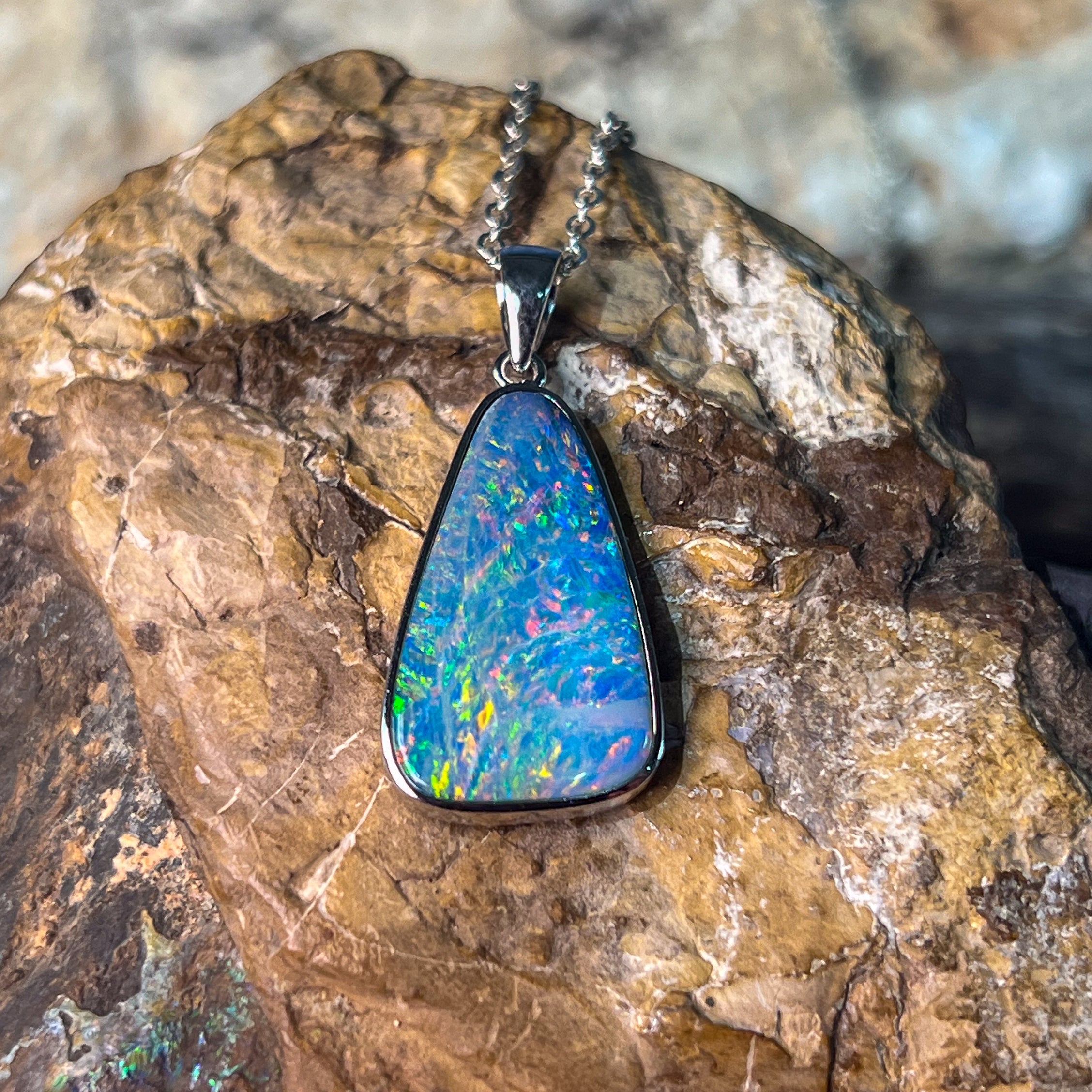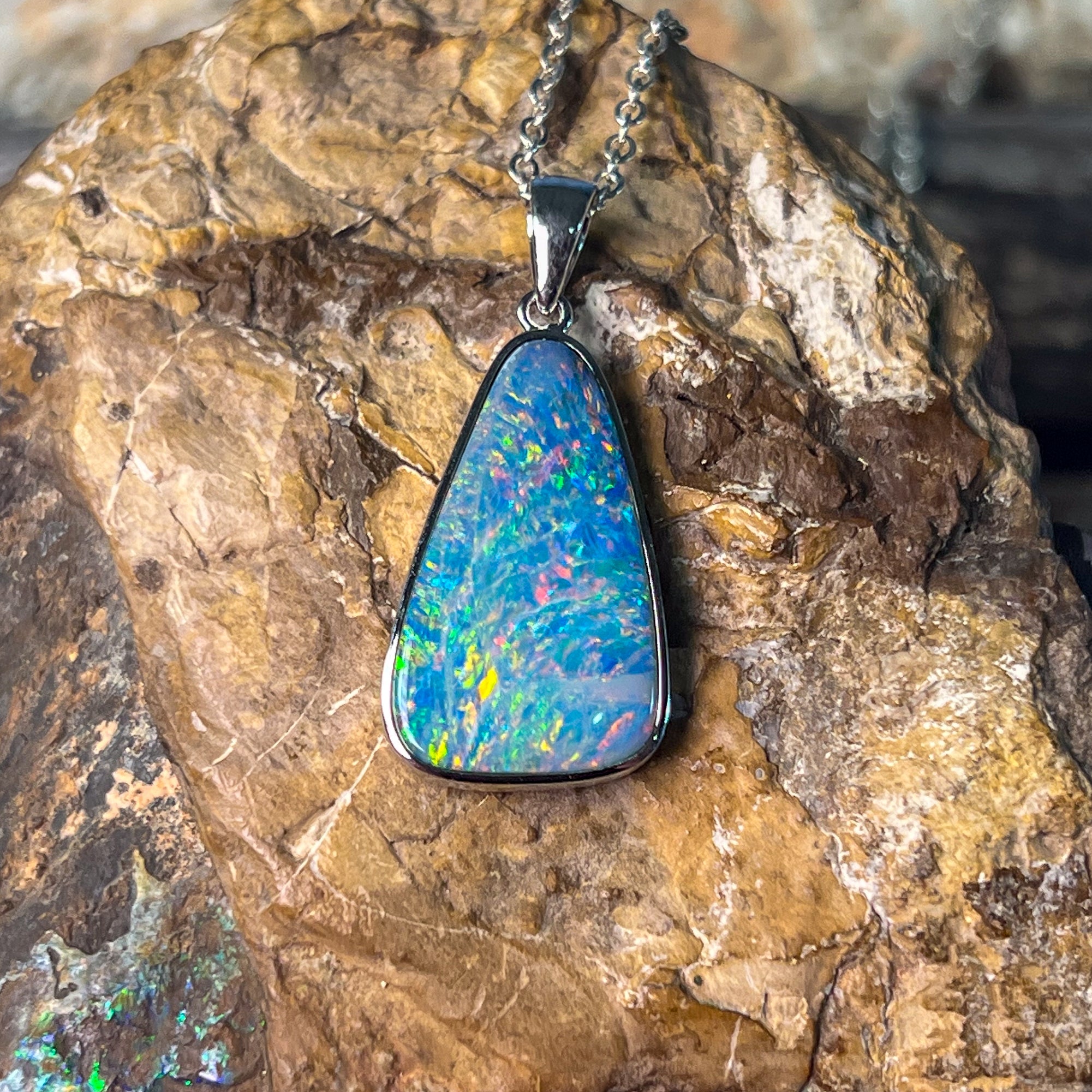 Elevate your style with this Sterling Silver pendant featuring a striking triangle drop shape. The captivating green and orange Opal doublet gleams with vibrant colors, adding a unique and elegant touch to any outfit. Crafted to highlight the stone’s natural beauty, this pendant combines timeless design with eye-catching appeal, making it a perfect accessory for both everyday wear and special occasions.