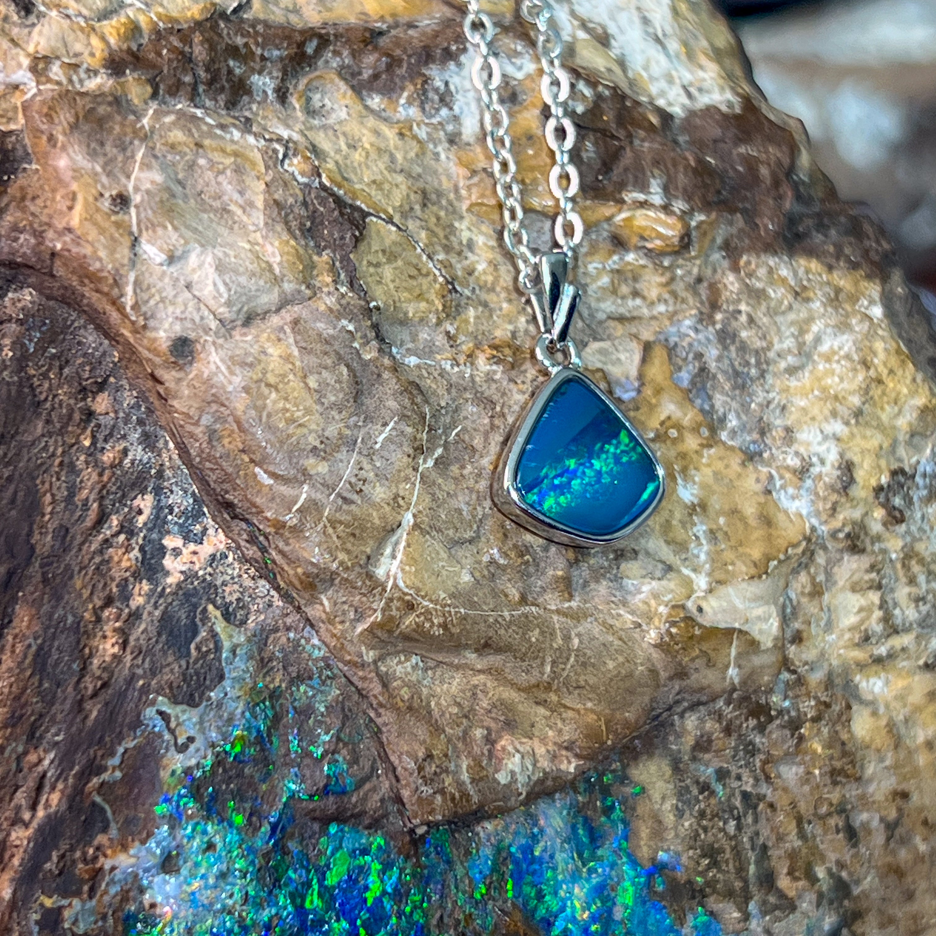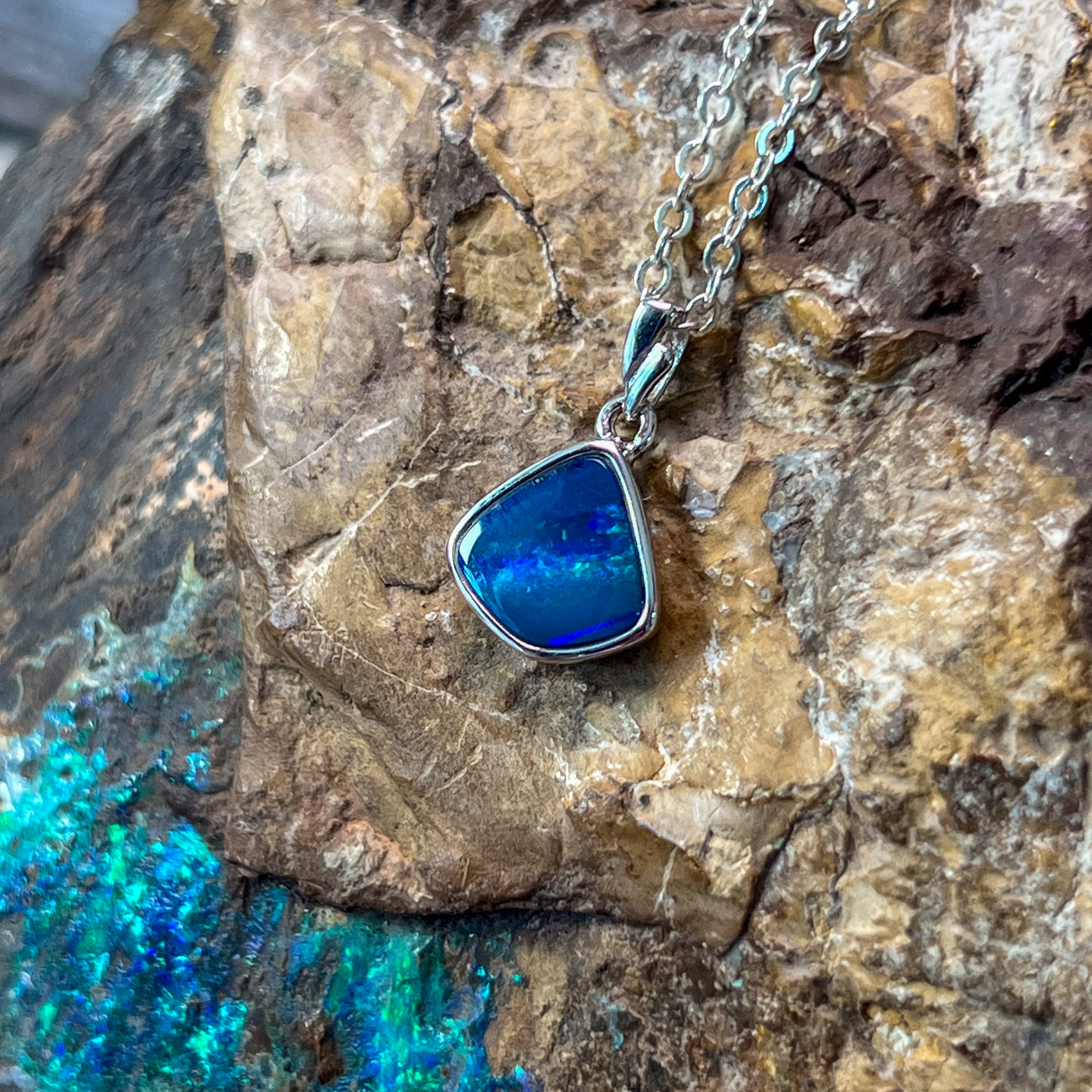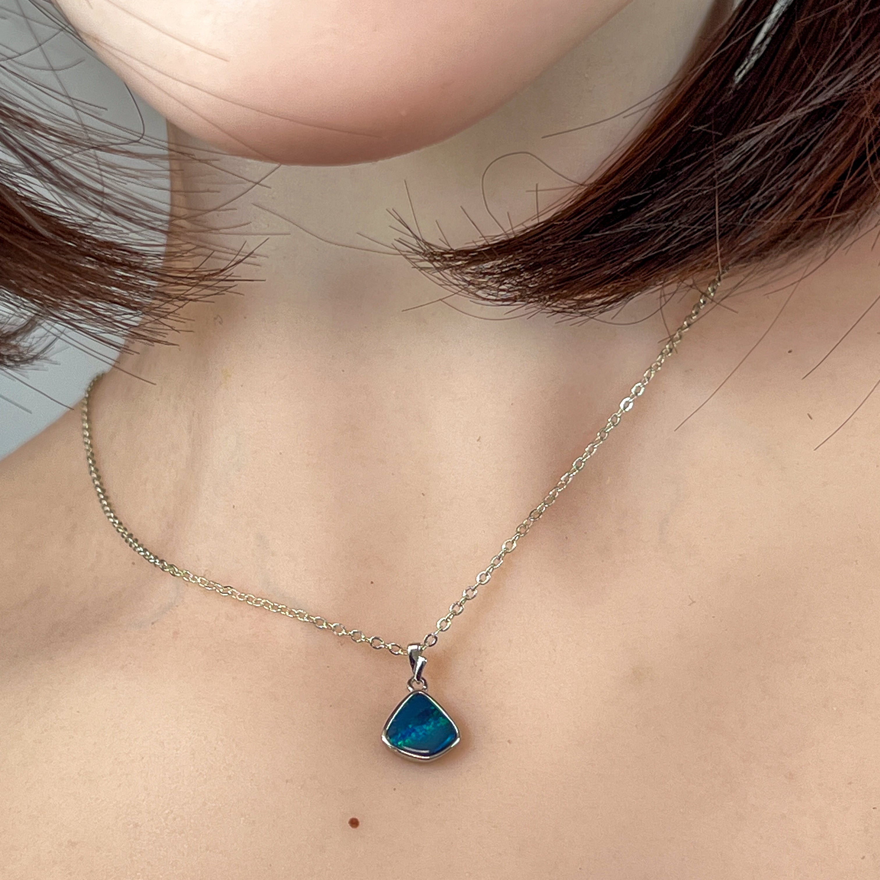 This sterling silver pendant features a striking triangle shape with a blue-green striped opal doublet, evoking the serene hues of the ocean. Its elegant design and vibrant colors make it a refined accessory that adds a touch of sophistication to any ensemble. Perfect for those who appreciate unique craftsmanship and timeless style.