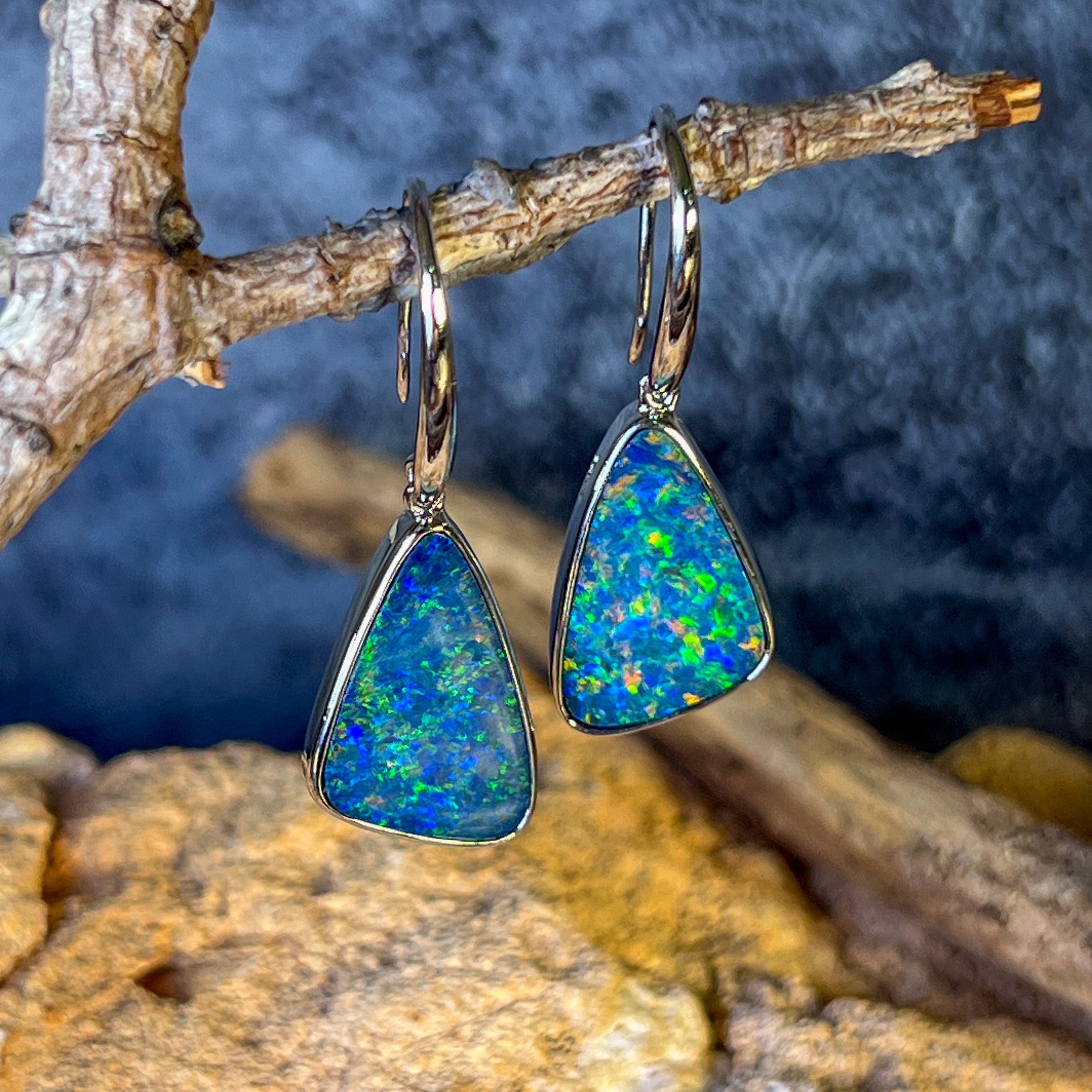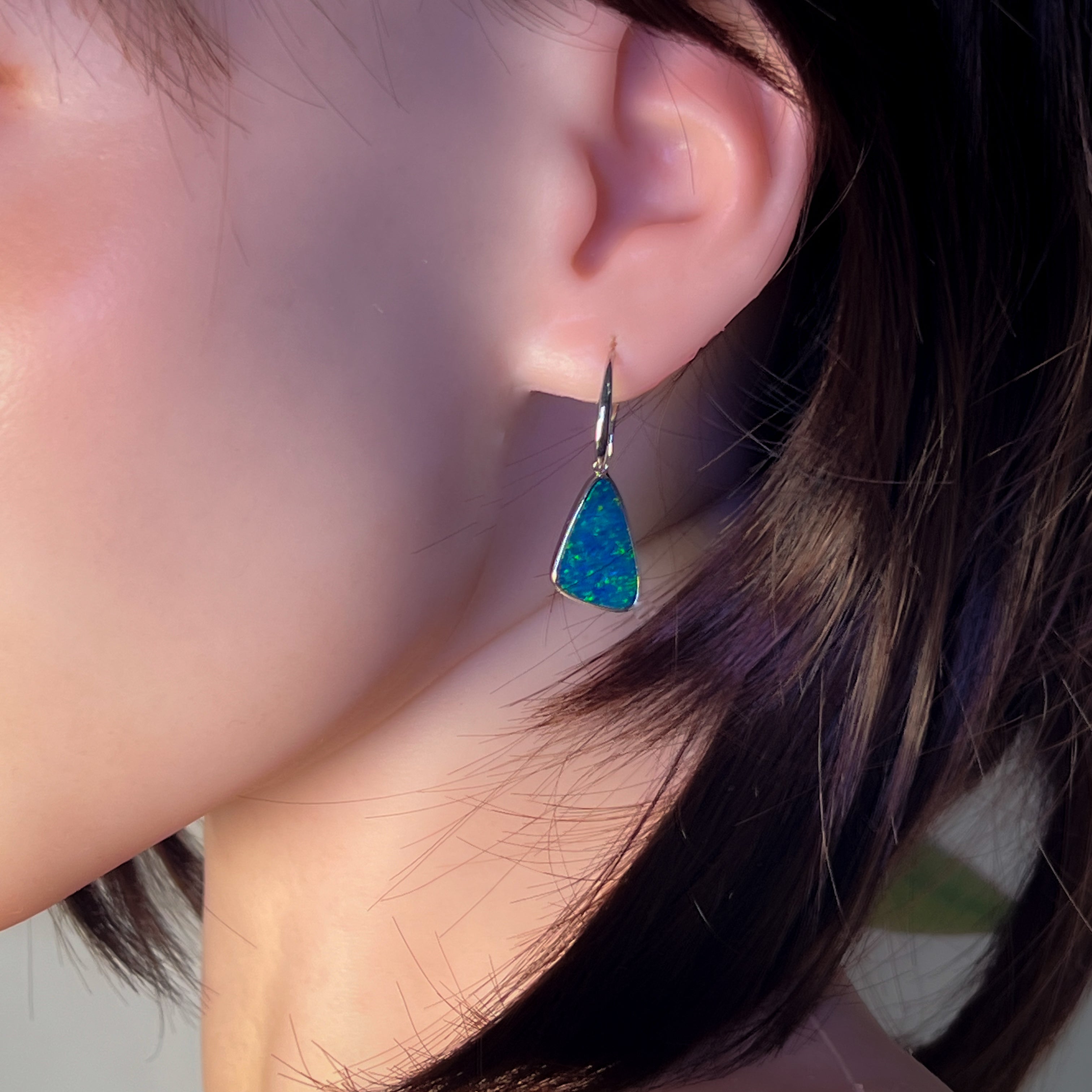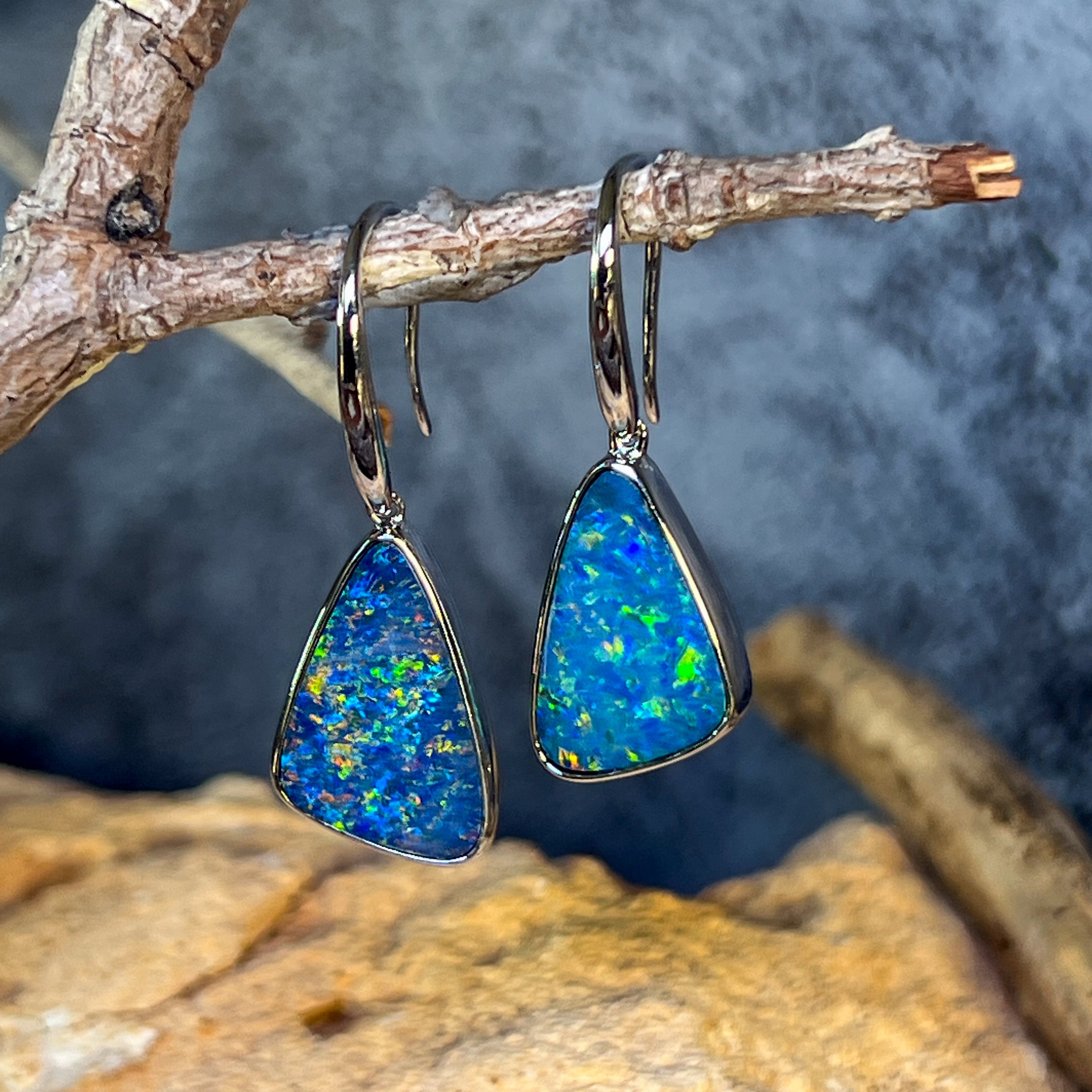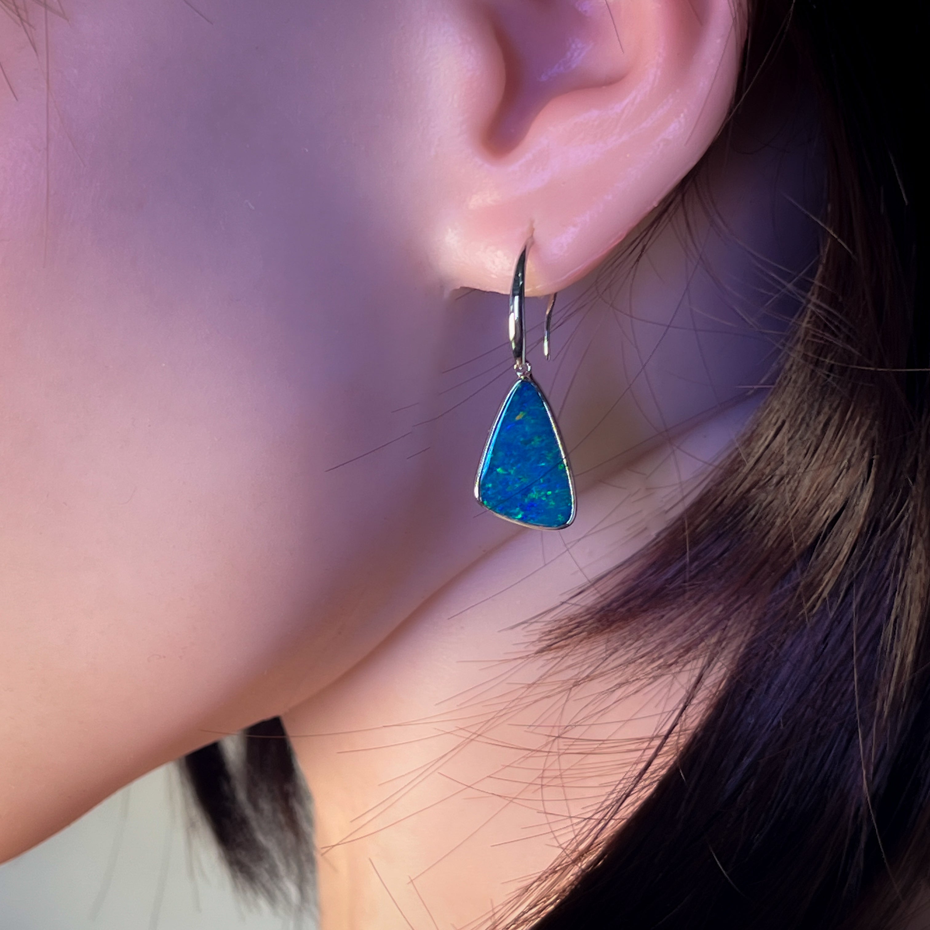 Add a touch of sophistication to any outfit with our Sterling Silver Triangle shape Opal doublet earrings! Featuring a unique triangle shape and large drop design, these earrings are sure to make a statement. The shimmering opal doublet adds a touch of luxury and elegance. Elevate your style with these stunning earrings!