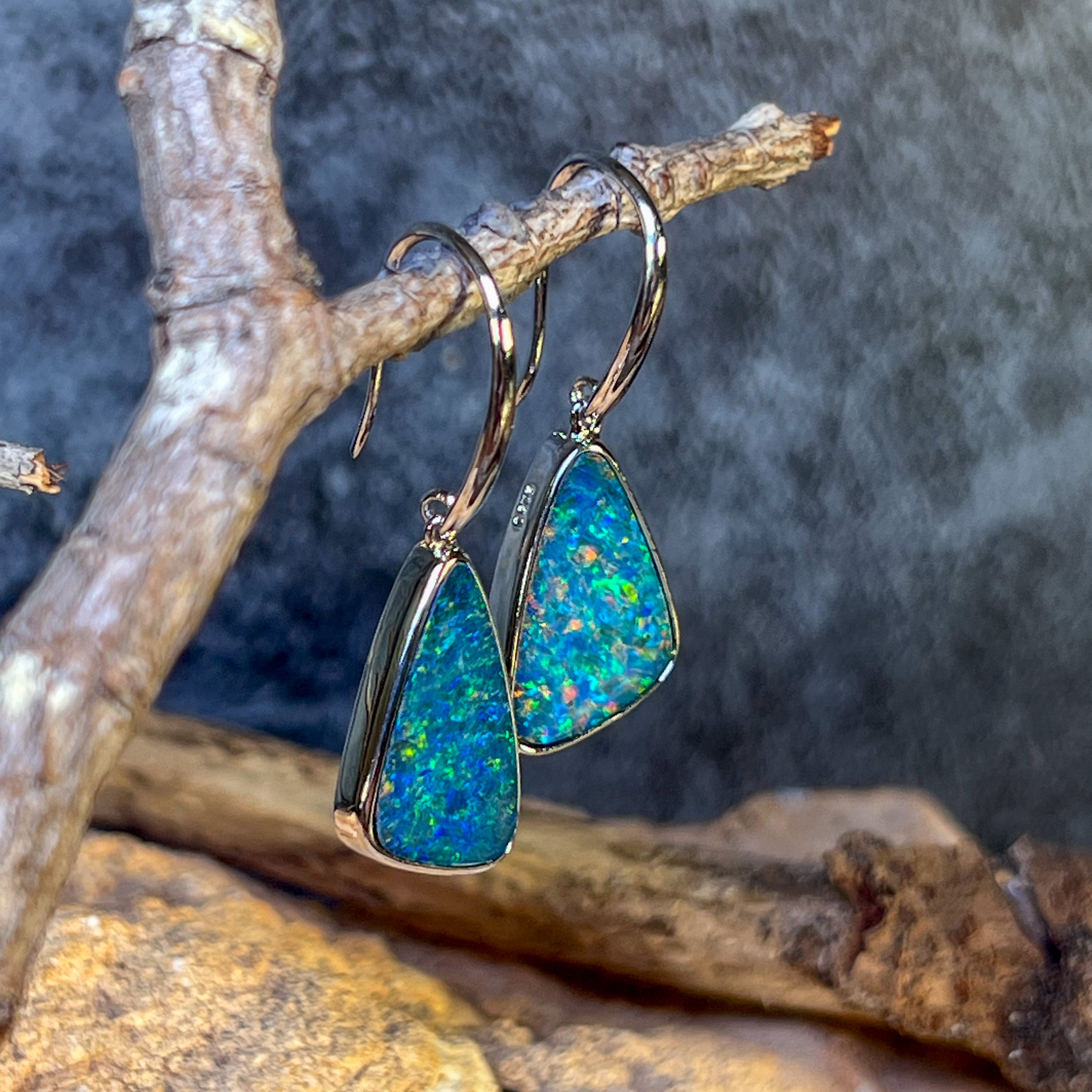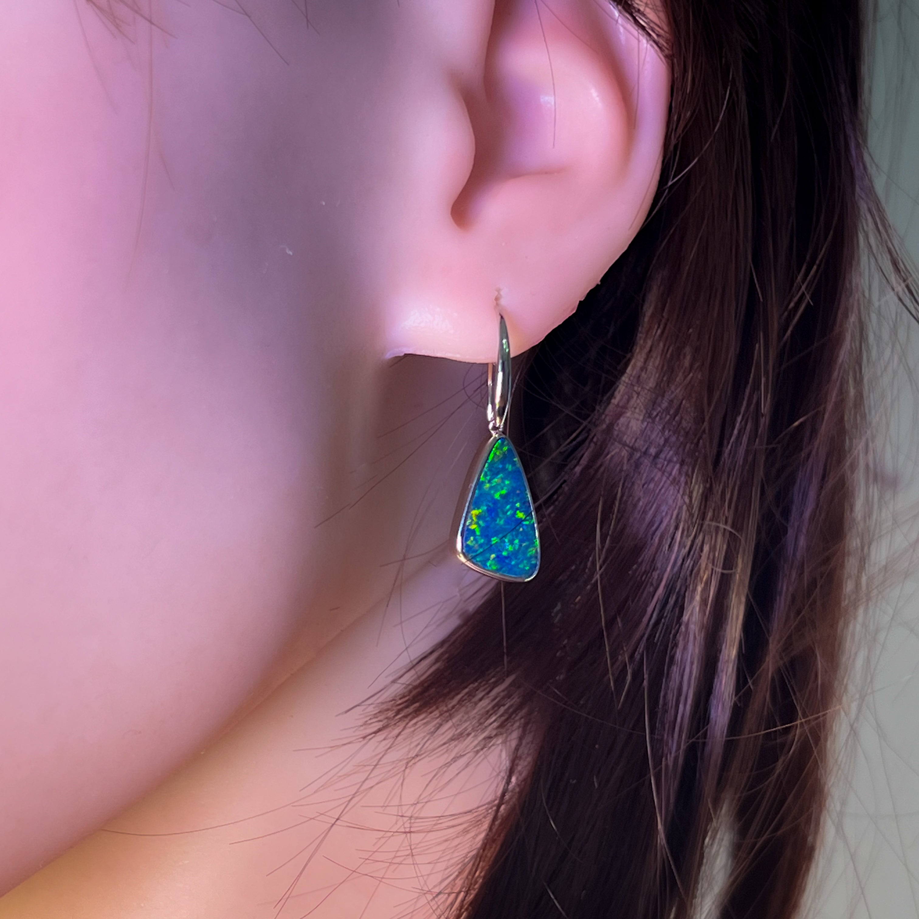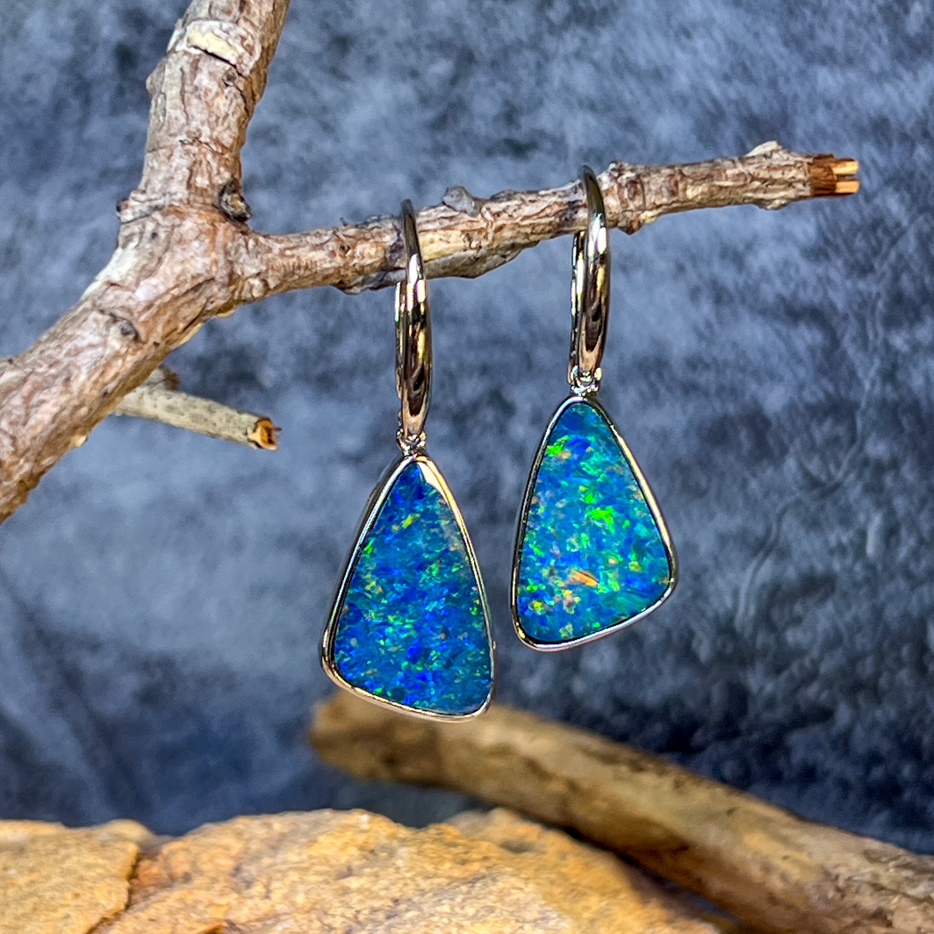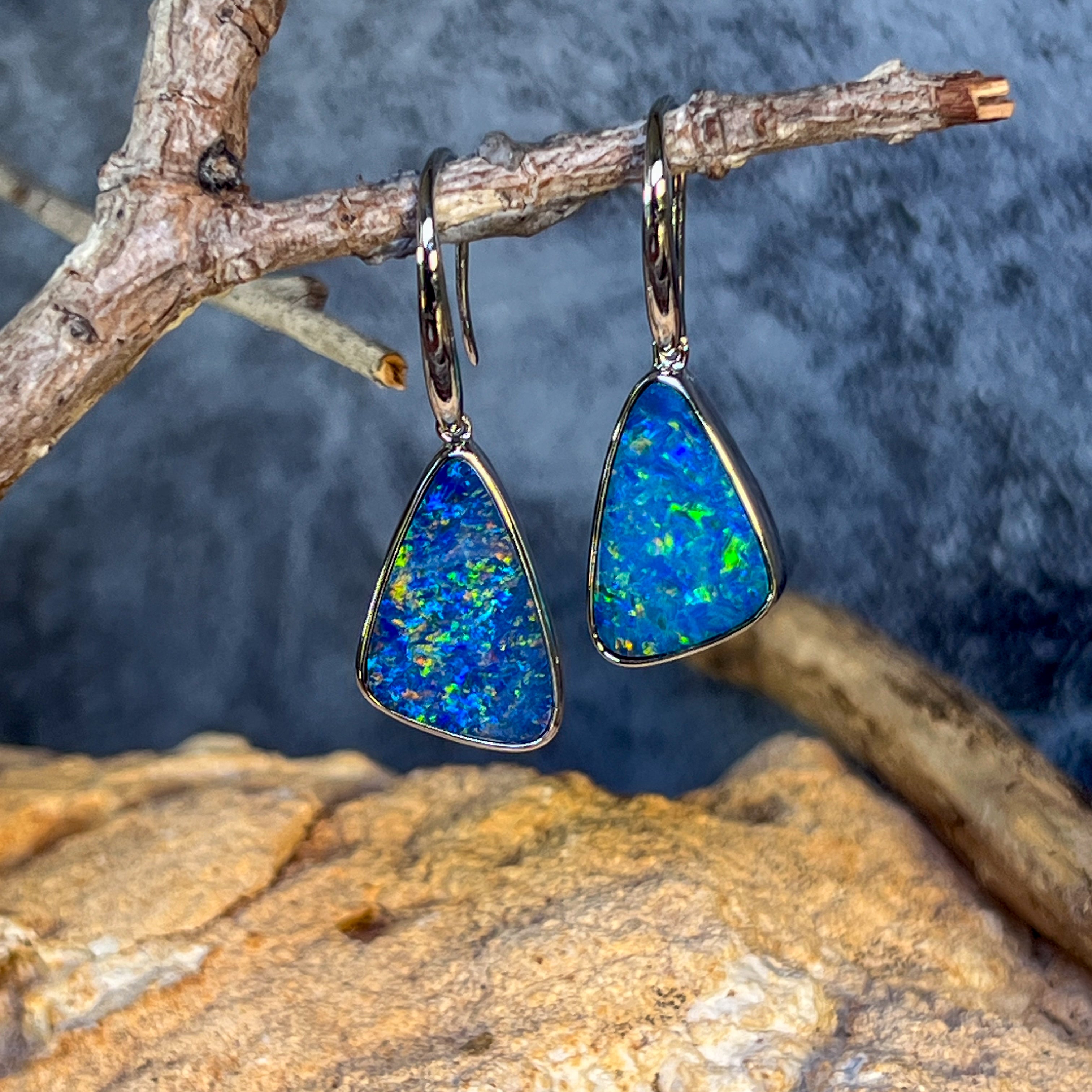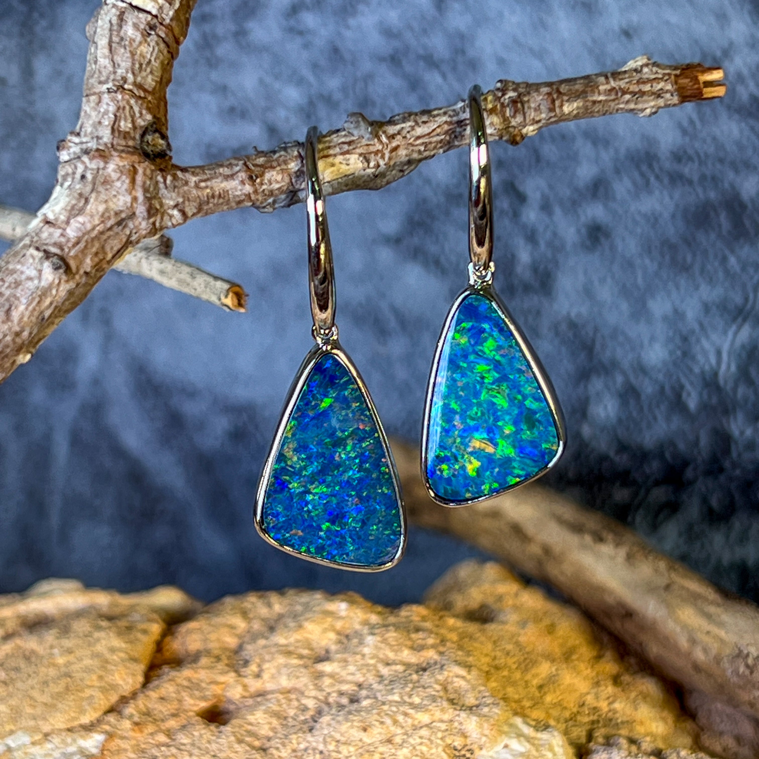 Add a touch of sophistication to any outfit with our Sterling Silver Triangle shape Opal doublet earrings! Featuring a unique triangle shape and large drop design, these earrings are sure to make a statement. The shimmering opal doublet adds a touch of luxury and elegance. Elevate your style with these stunning earrings!