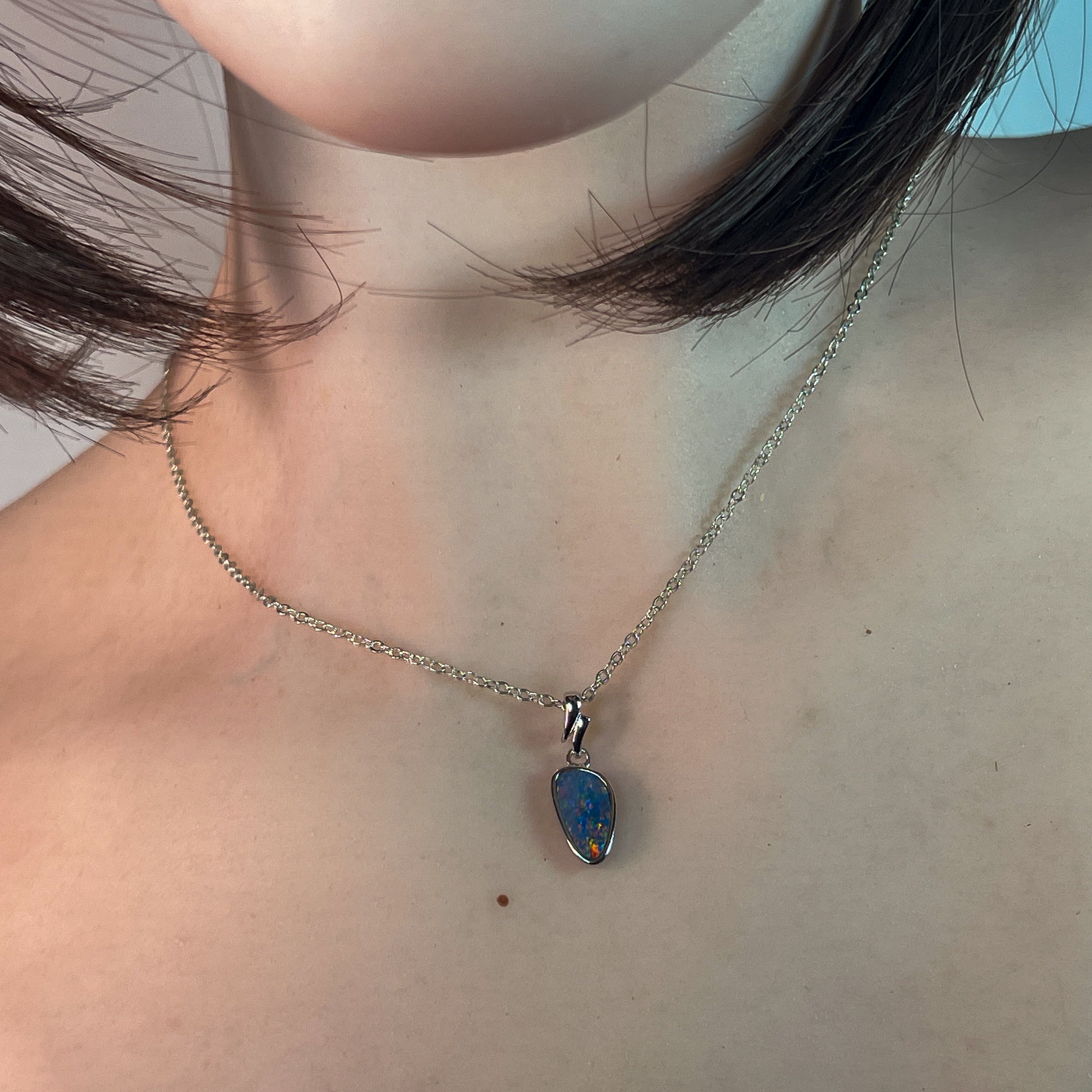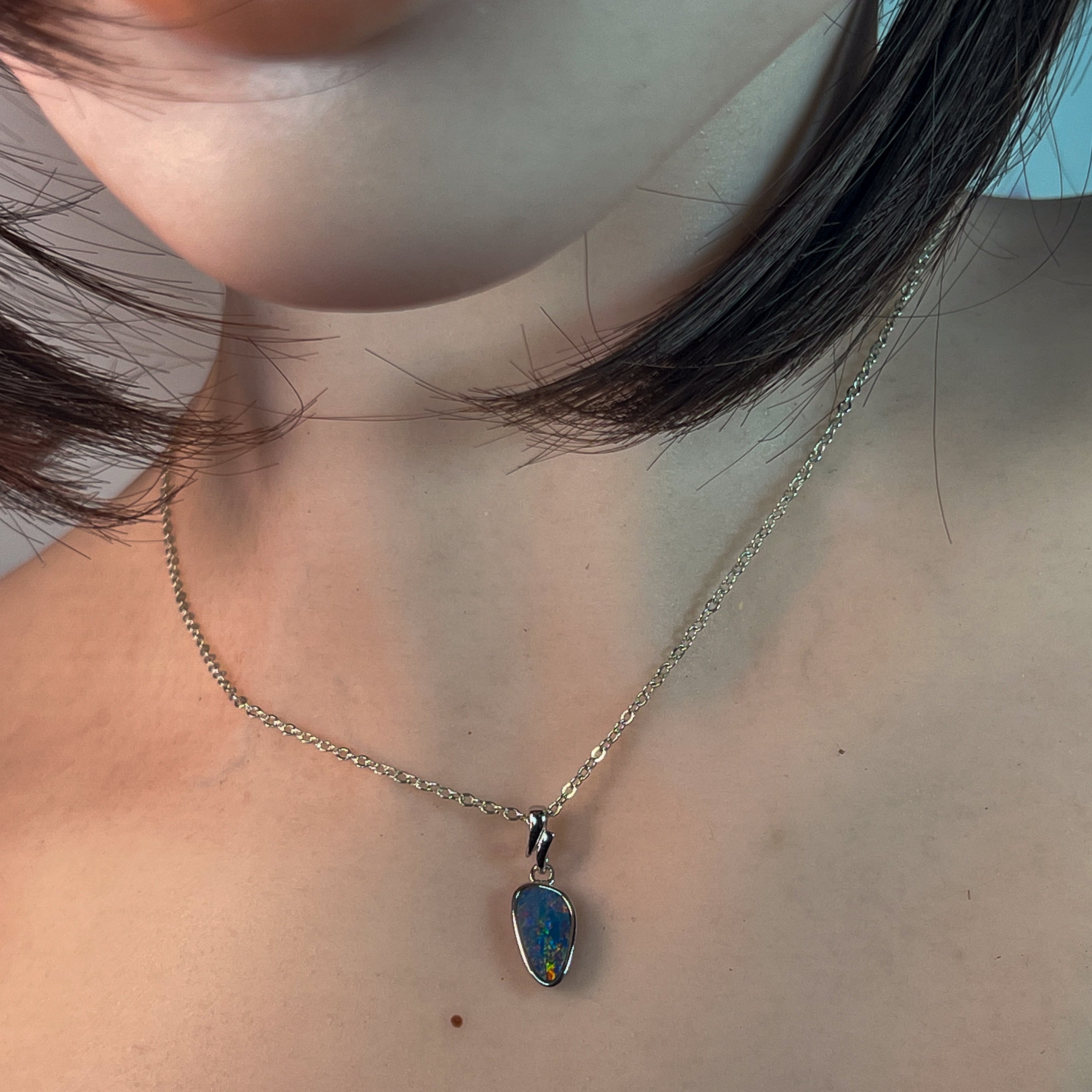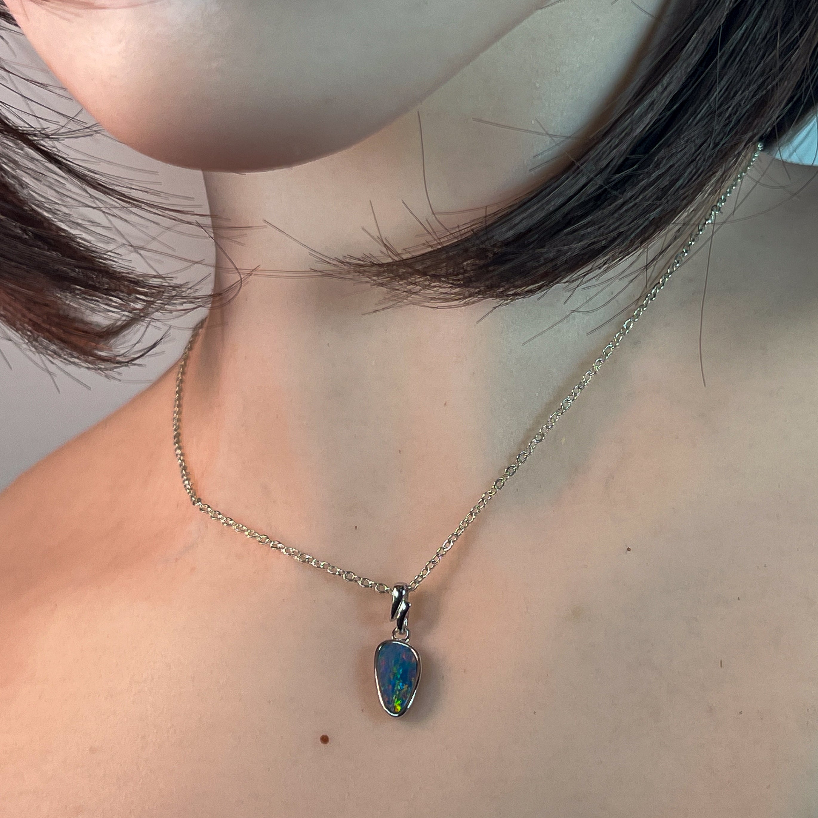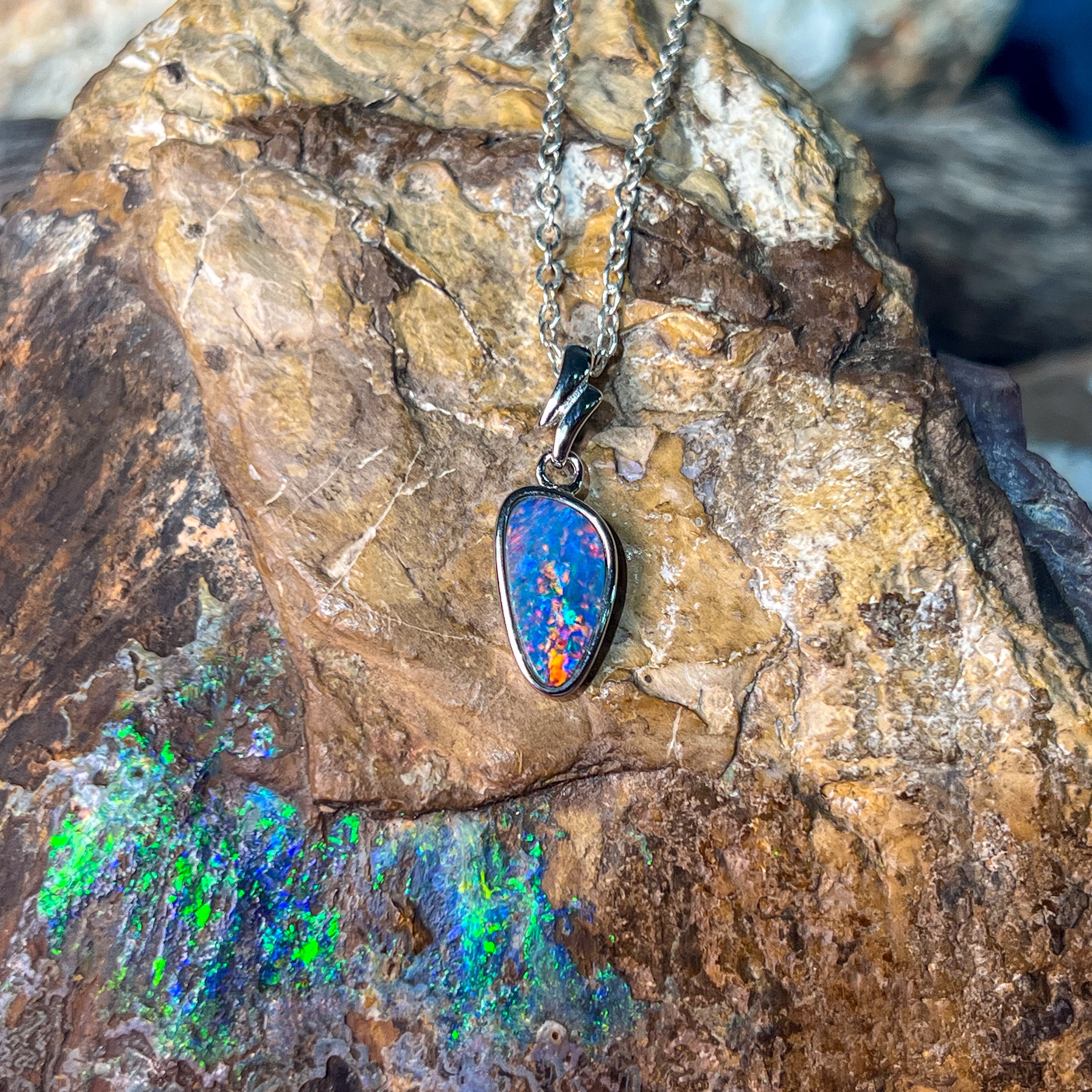 This sterling silver pendant features a striking triangle-shaped opal doublet, showcasing vibrant red and green flashes. Its elegant design adds a unique touch to any outfit, making it a perfect accessory for everyday wear or special occasions.