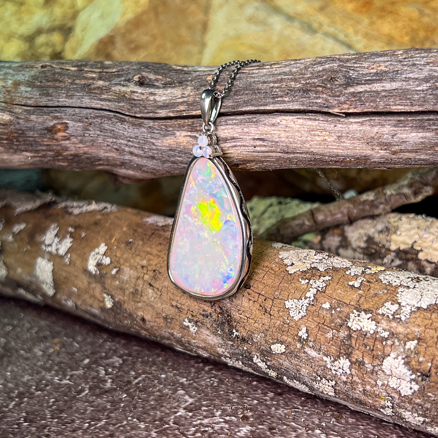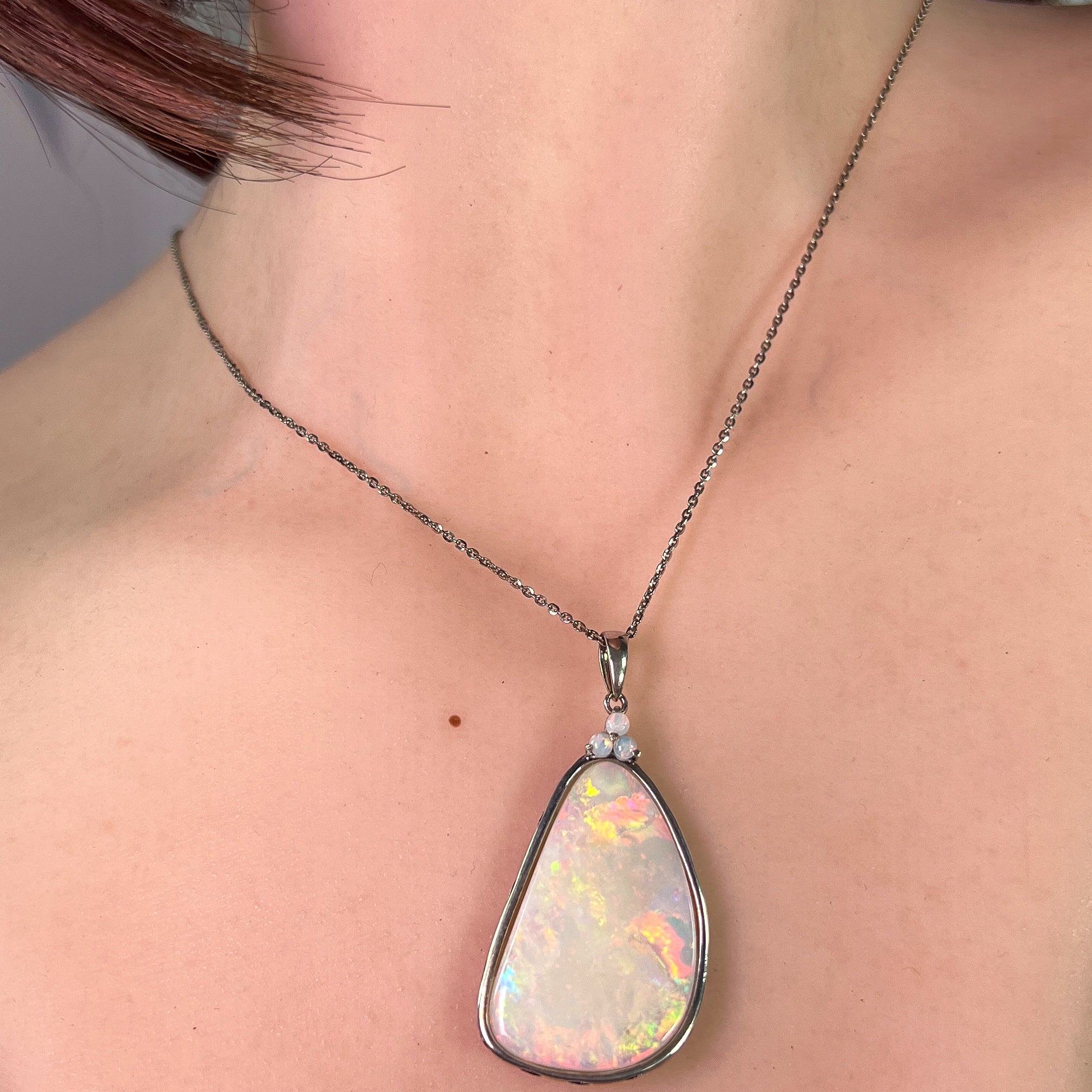 This stunning Sterling Silver White Opal pendant will make a bold and elegant statement. Featuring a beautiful white opal, this pendant is sure to catch the eye and add a touch of sophistication to any outfit. Elevate your style with the shimmering beauty of this opal pendant.