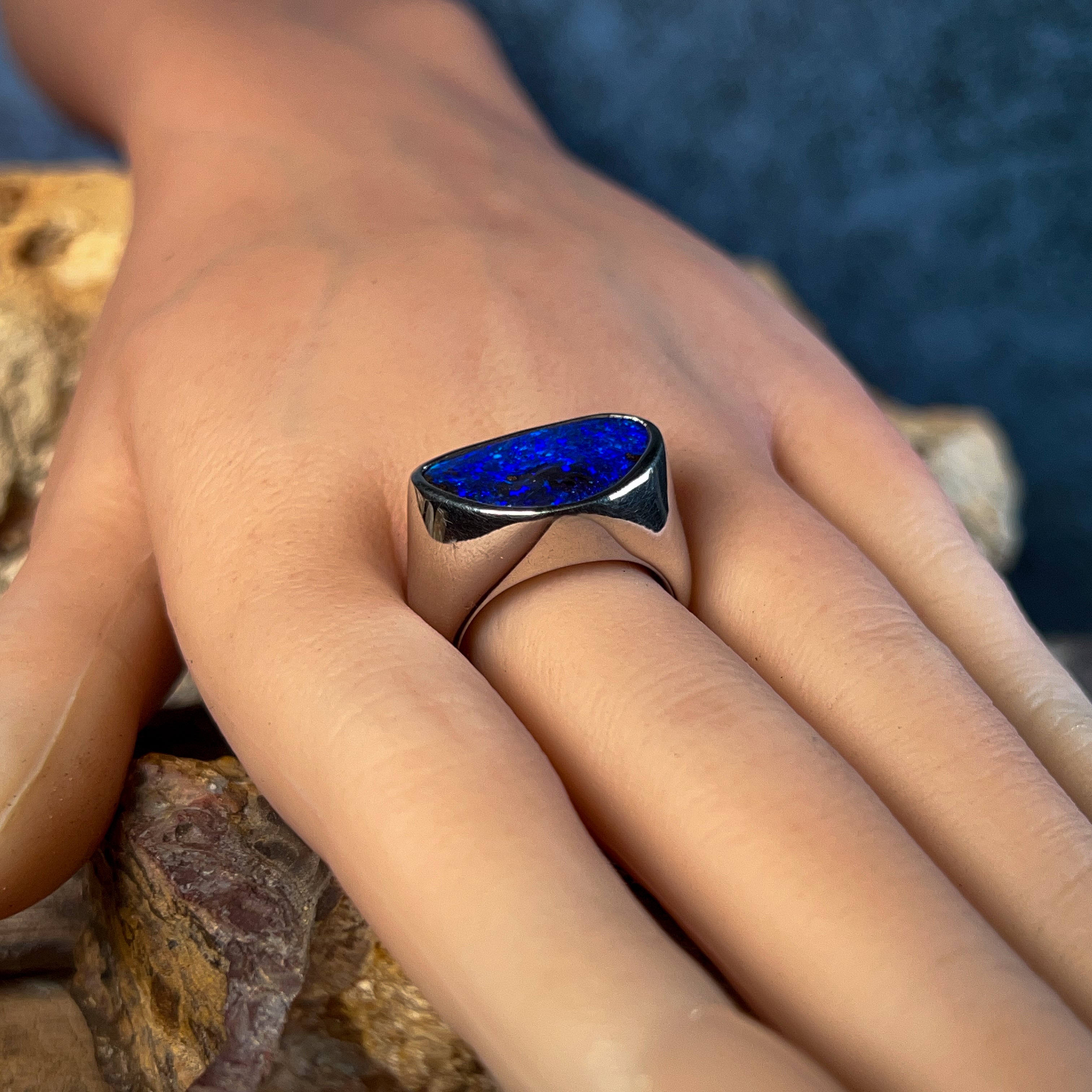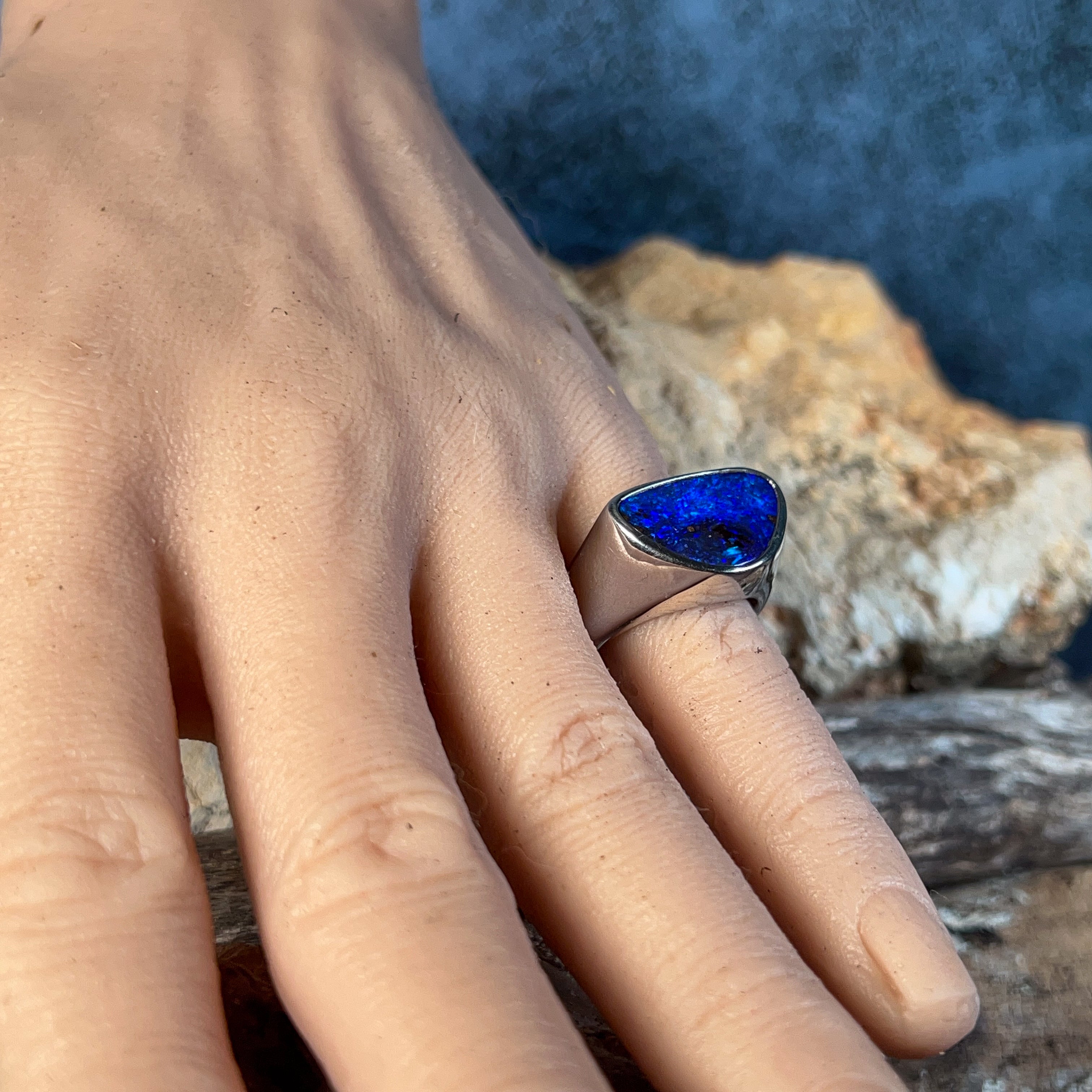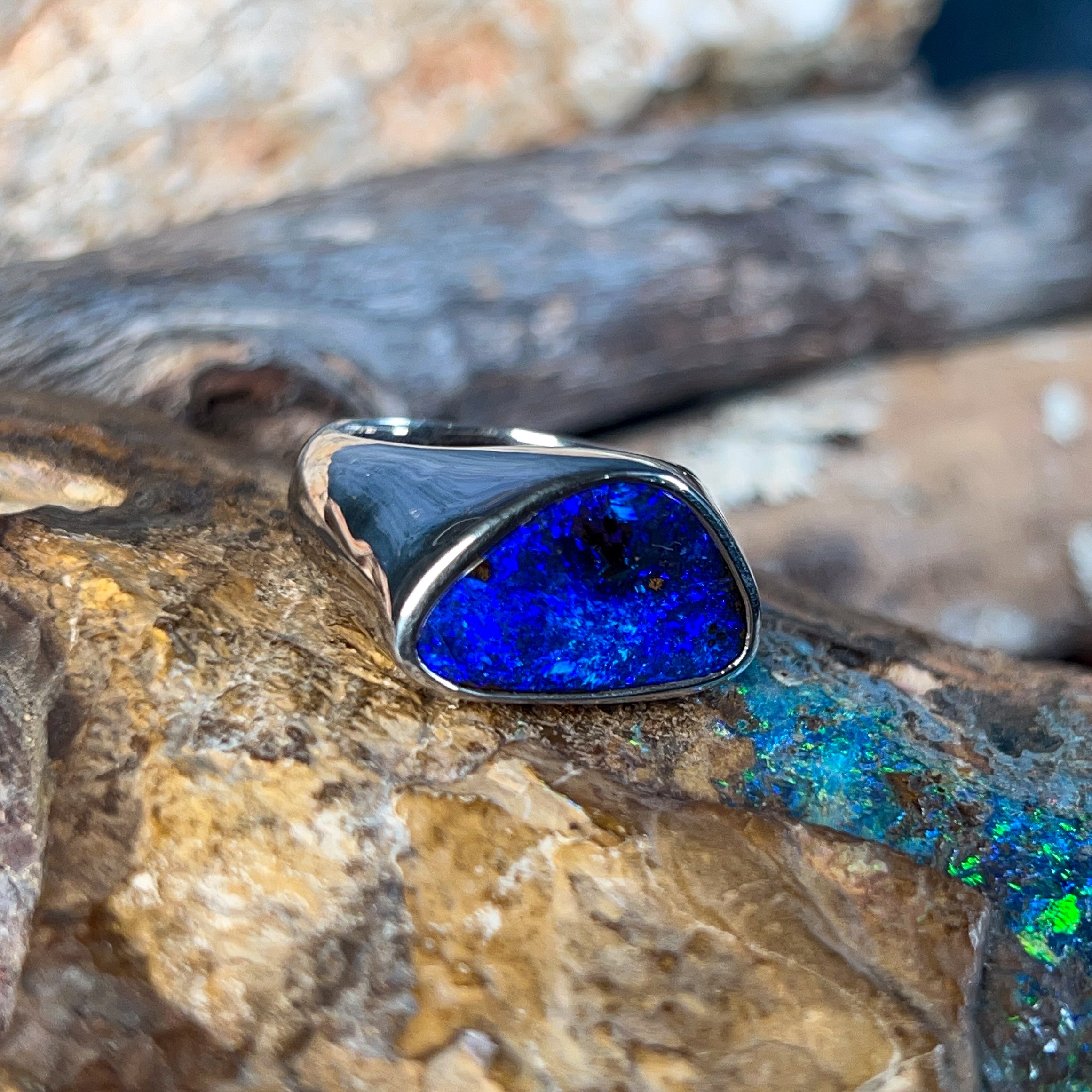 Sterling Silver Freeform Boulder Opal Green dark Blue bezel set mens ring