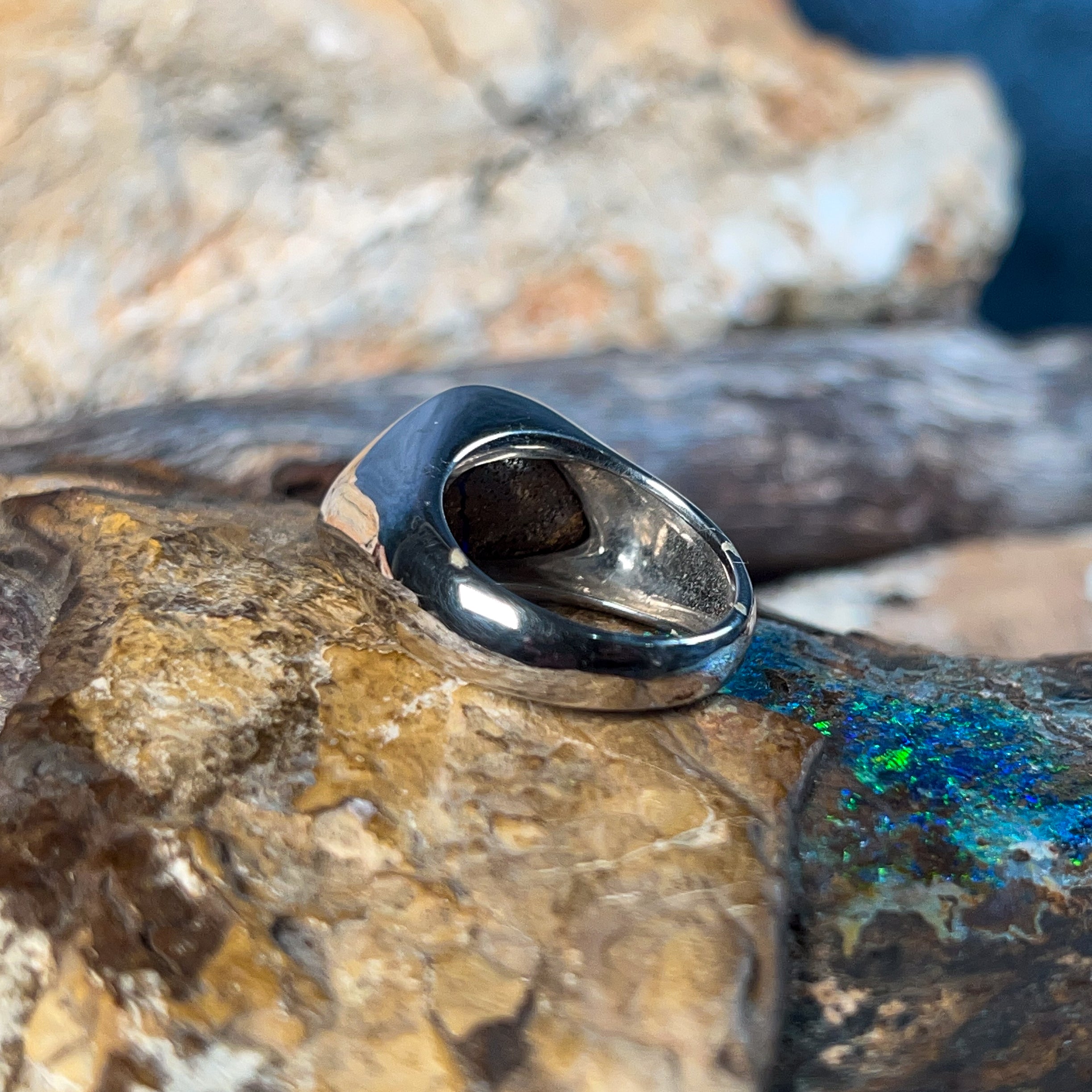 Sterling Silver Bezel set Boulder Opal green flashes ring