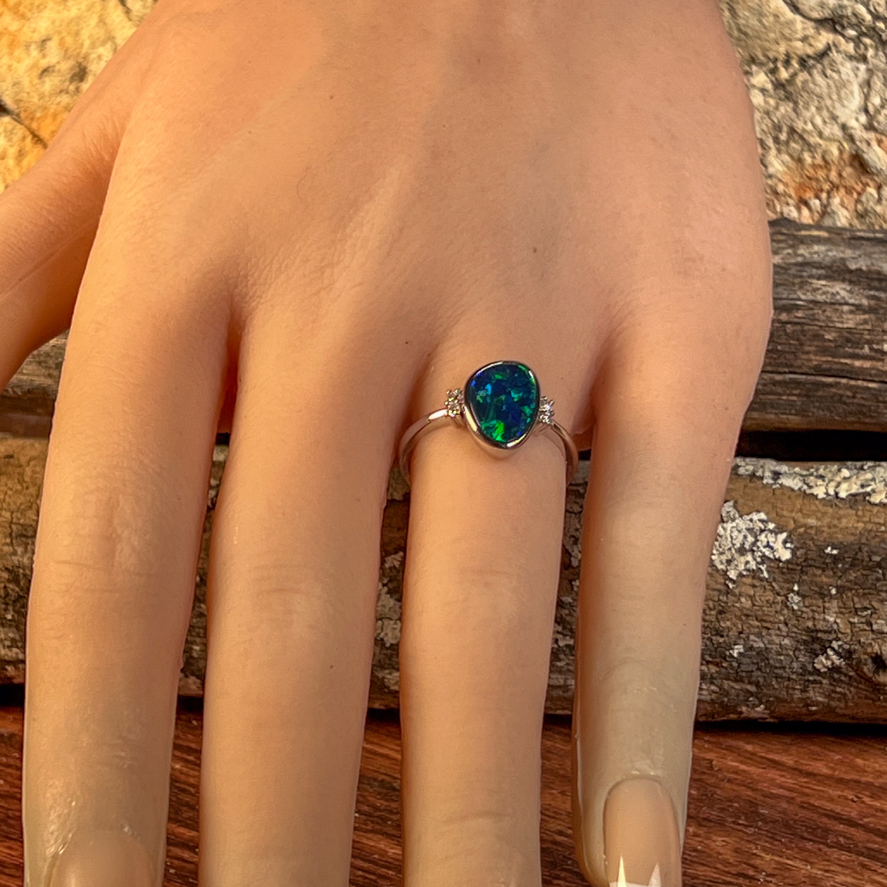 Dive into enchantment with this stunning 14kt white gold ring, where a mesmerizing 1.58ct opal doublet steals the show with its deep forest and ocean hues. Complemented by sparkling 0.08ct diamonds that catch the light like dewdrops on morning leaves, this piece captures the magic of nature's most captivating palette. Perfect for those who adore jewellery that tells a story of mystery and wonder, this ring brings a touch of the wild, serene beauty of untamed landscapes straight to your finger.