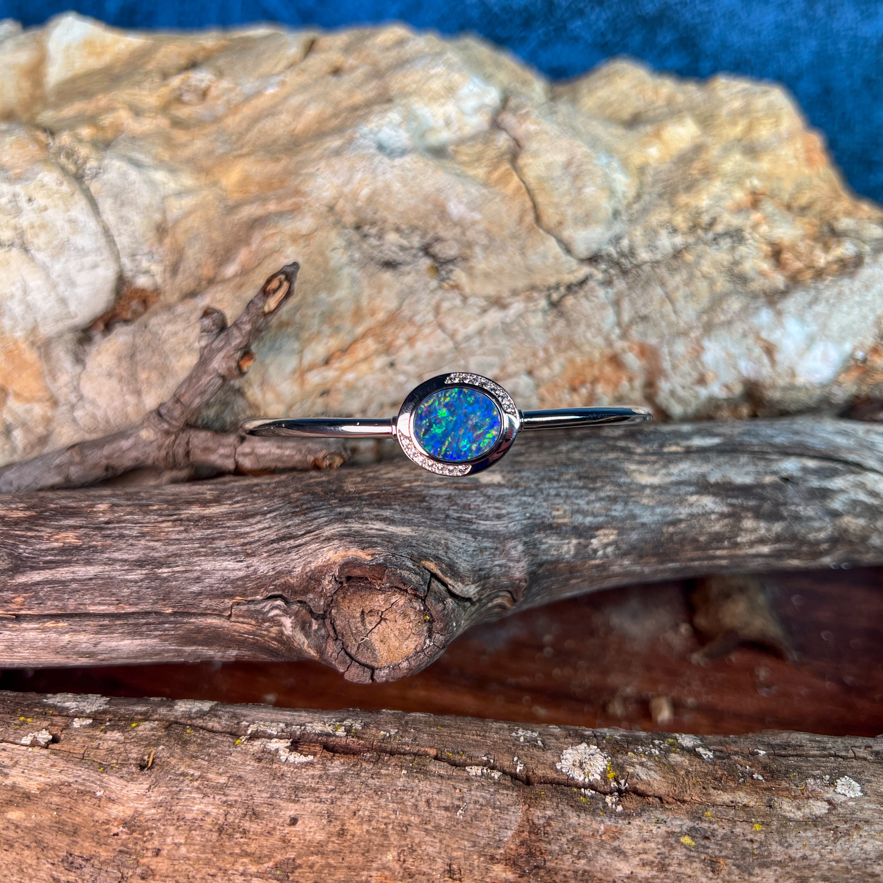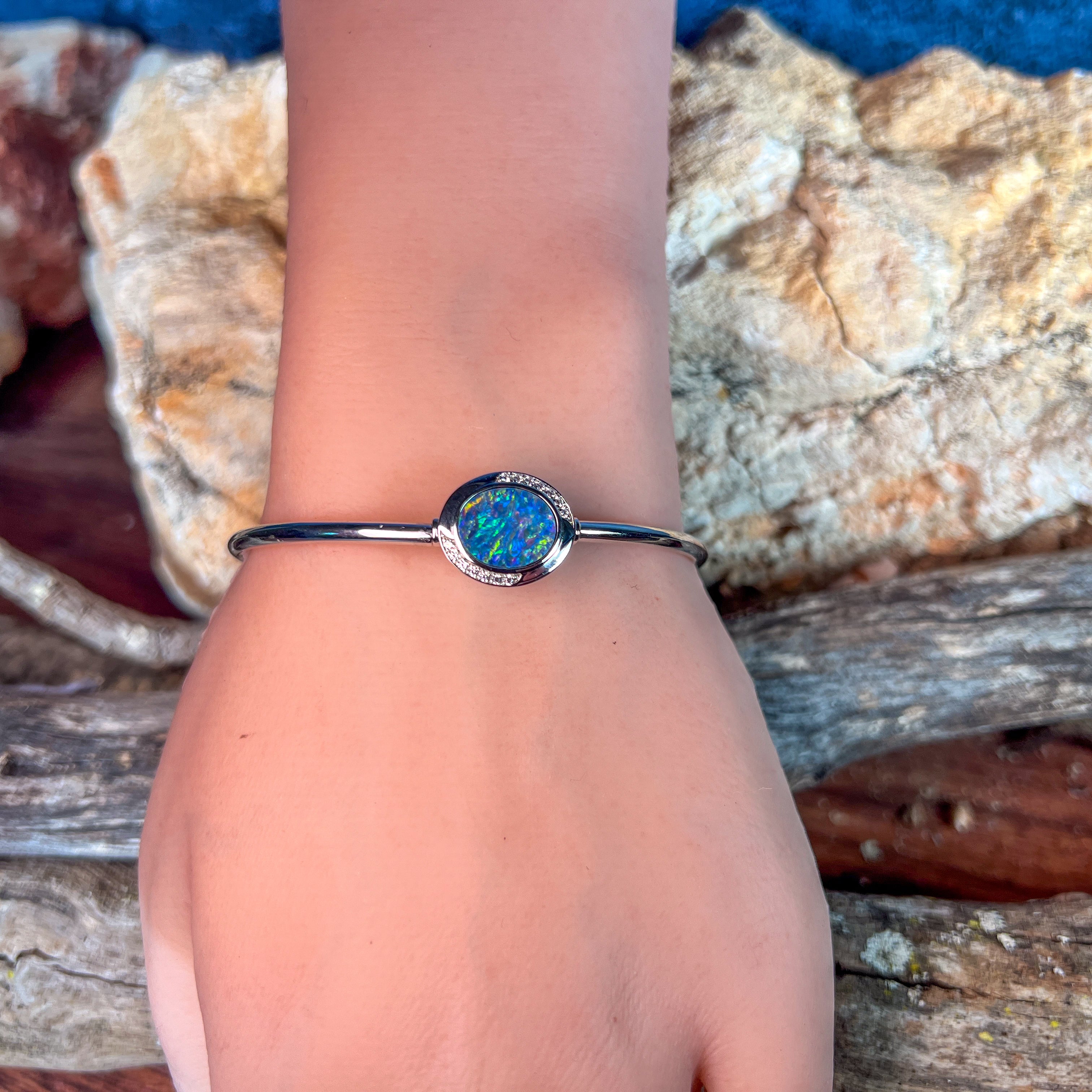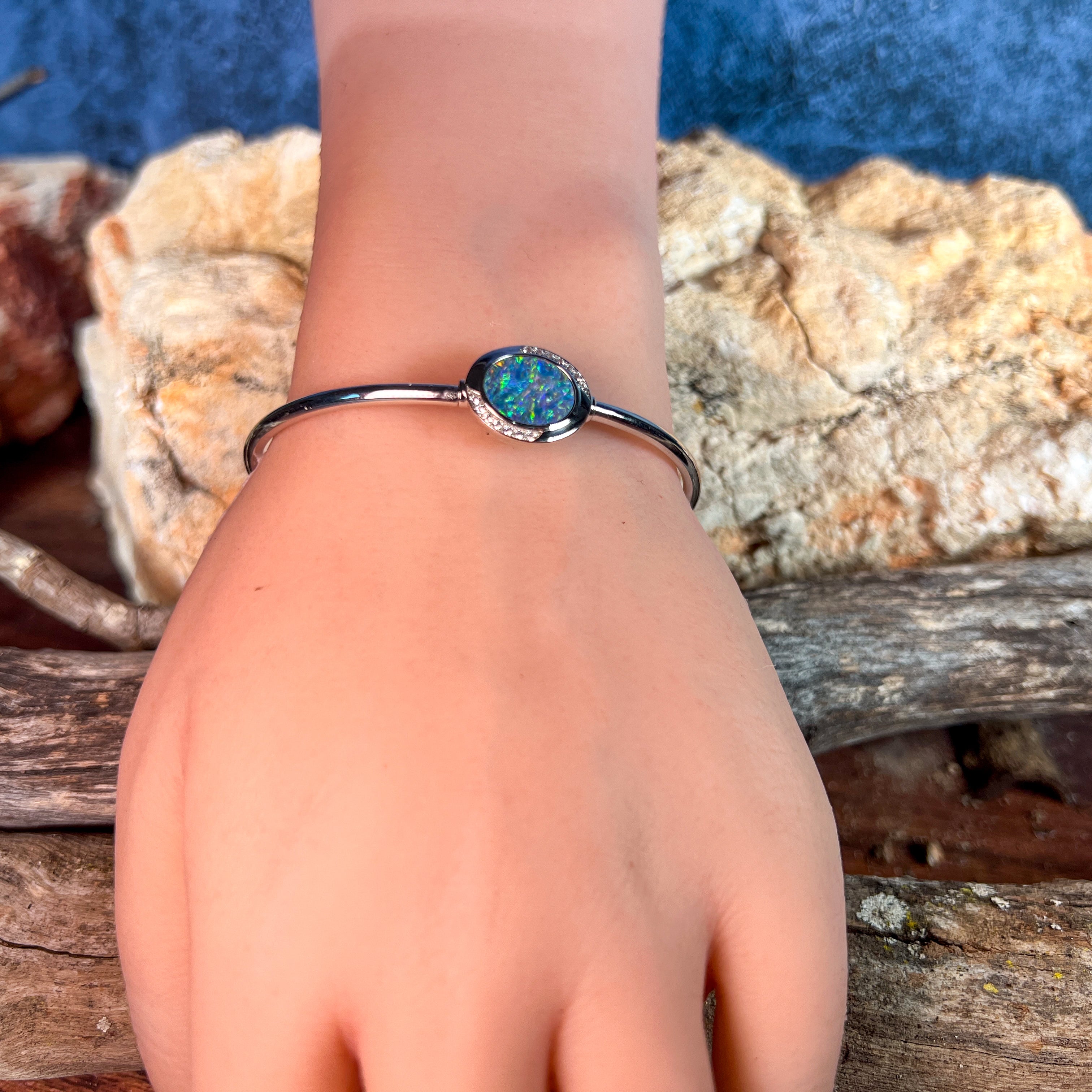 Elevate your style with this Sterling Silver Opal Doublet Bangle, featuring a stunning 11x9mm opal centerpiece. The sleek sterling silver band perfectly complements the vibrant opal, adding a touch of refined elegance to any outfit. Lightweight yet durable, this classic bangle is perfect for everyday wear or special occasions, making it a versatile addition to your jewellery collection. Experience timeless beauty and sophisticated charm with this exquisite piece.