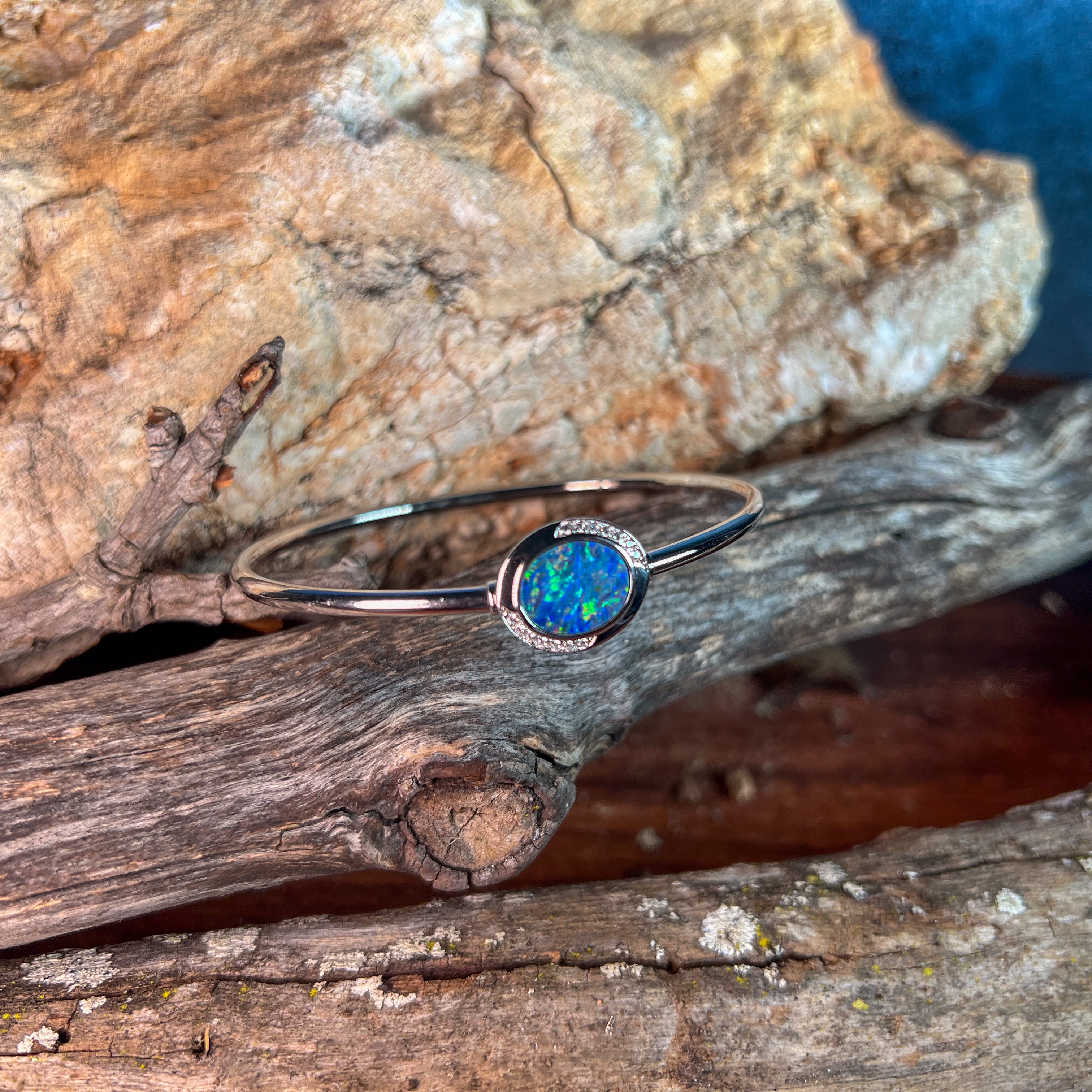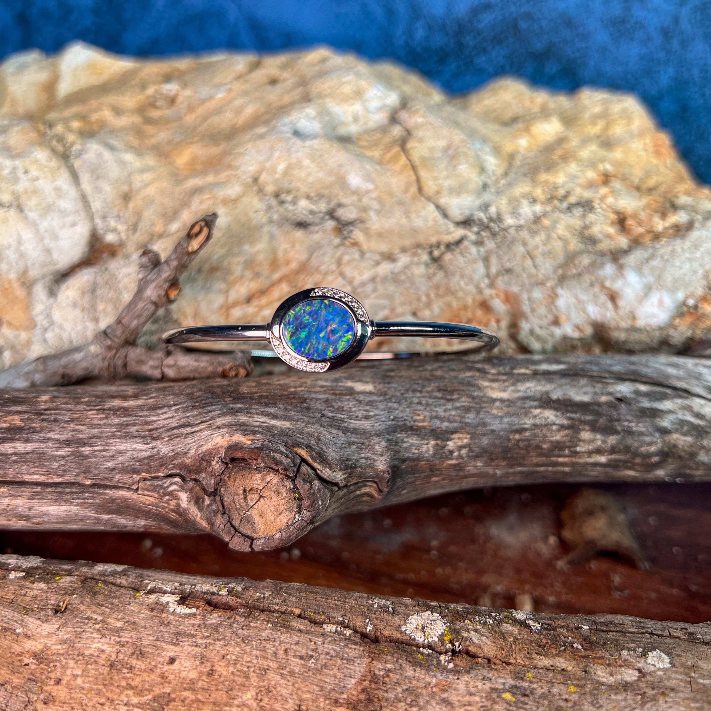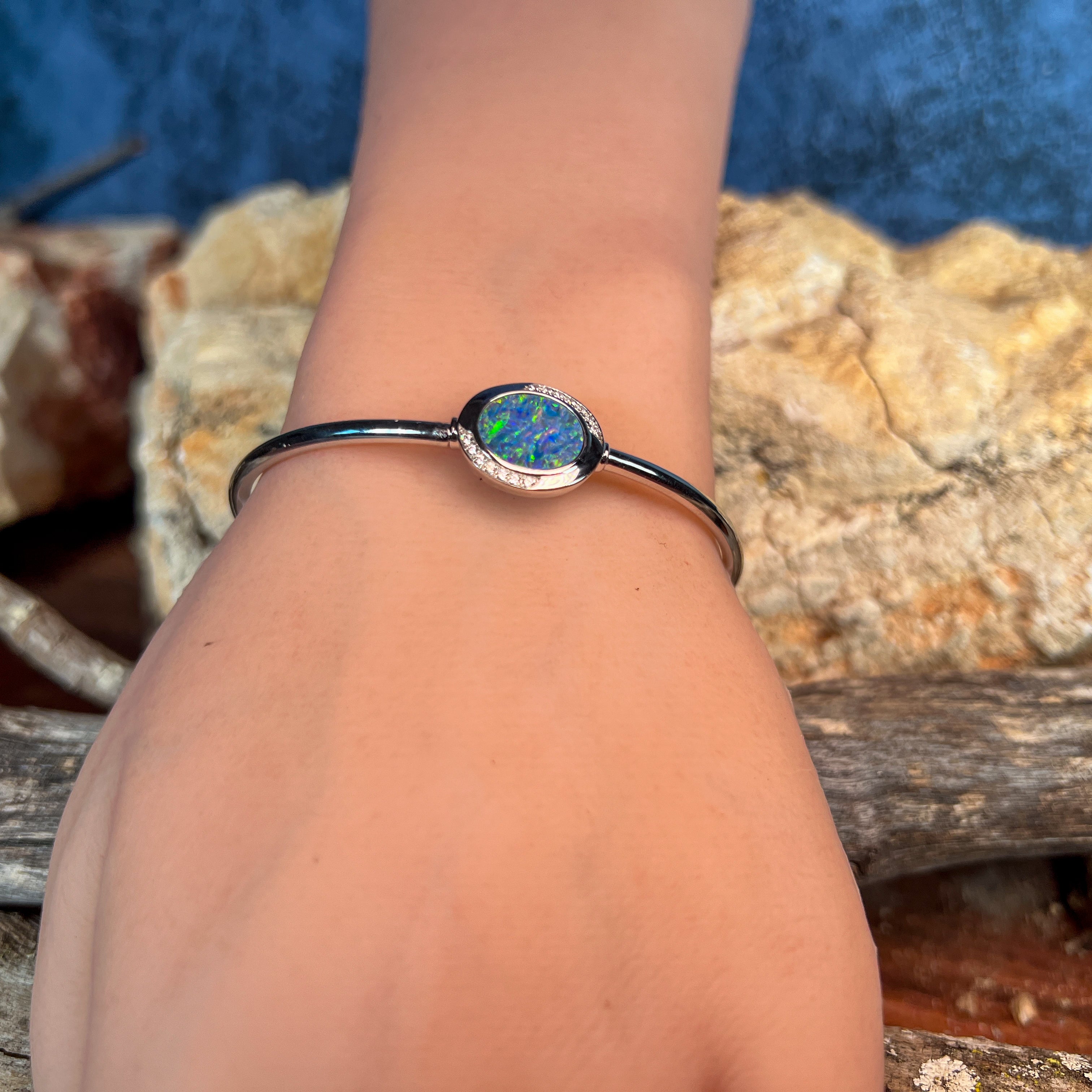 Elevate your style with this Sterling Silver Opal Doublet Bangle, featuring a stunning 11x9mm opal centerpiece. The sleek sterling silver band perfectly complements the vibrant opal, adding a touch of refined elegance to any outfit. Lightweight yet durable, this classic bangle is perfect for everyday wear or special occasions, making it a versatile addition to your jewellery collection. Experience timeless beauty and sophisticated charm with this exquisite piece.