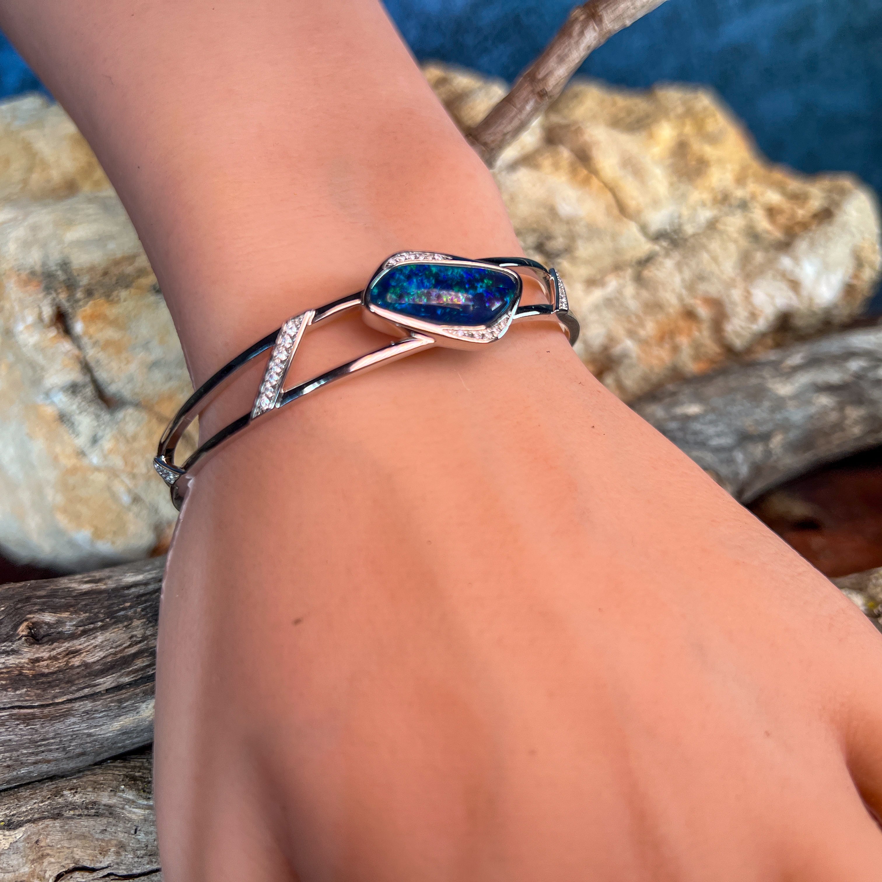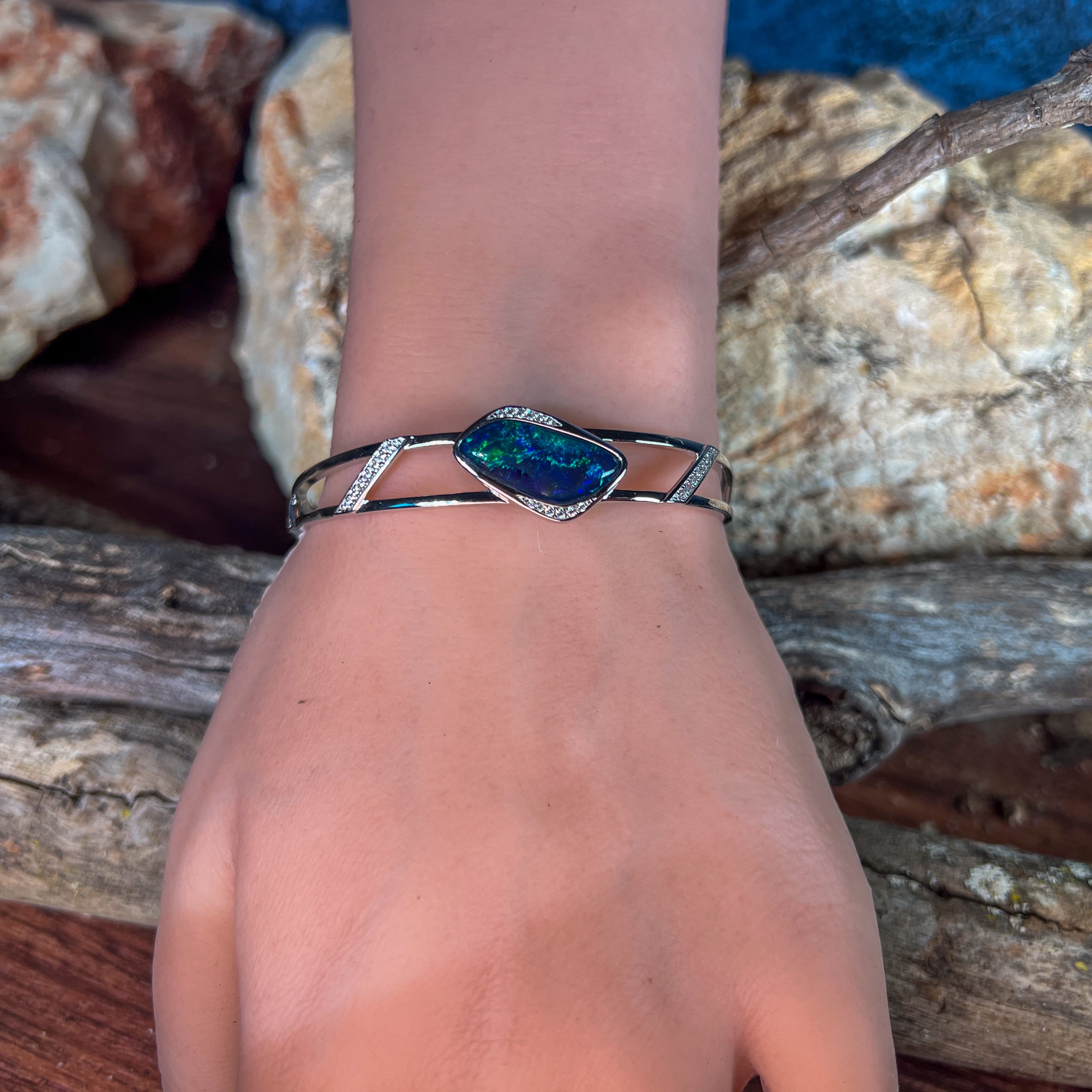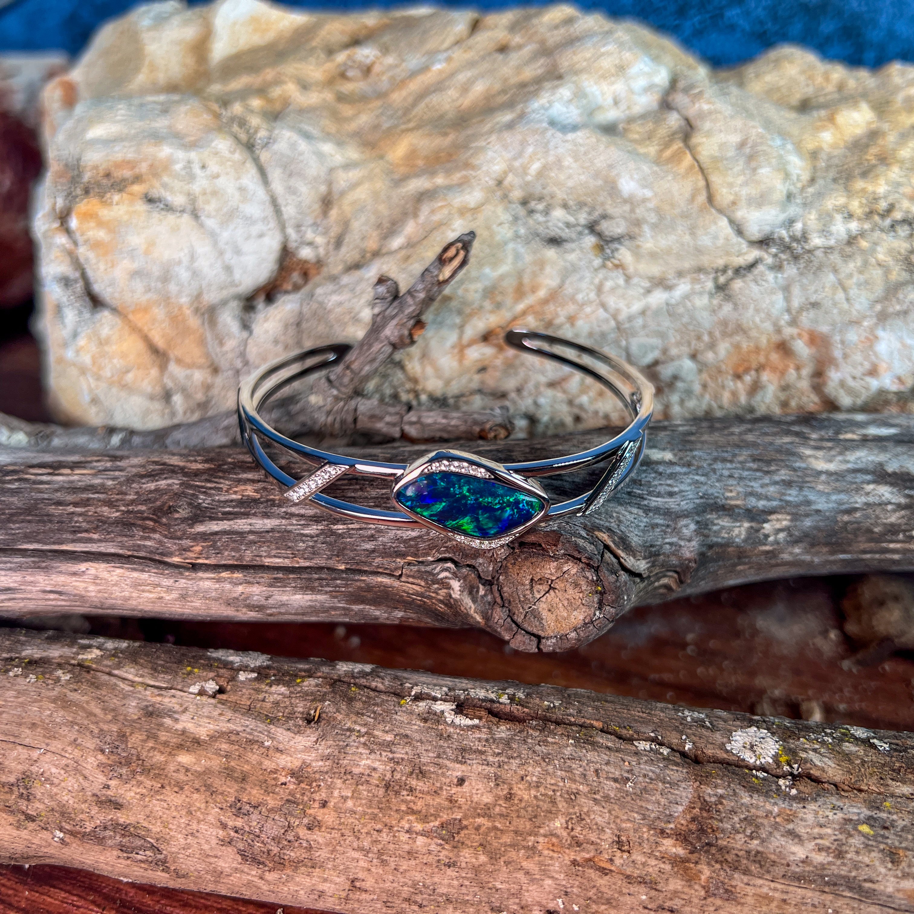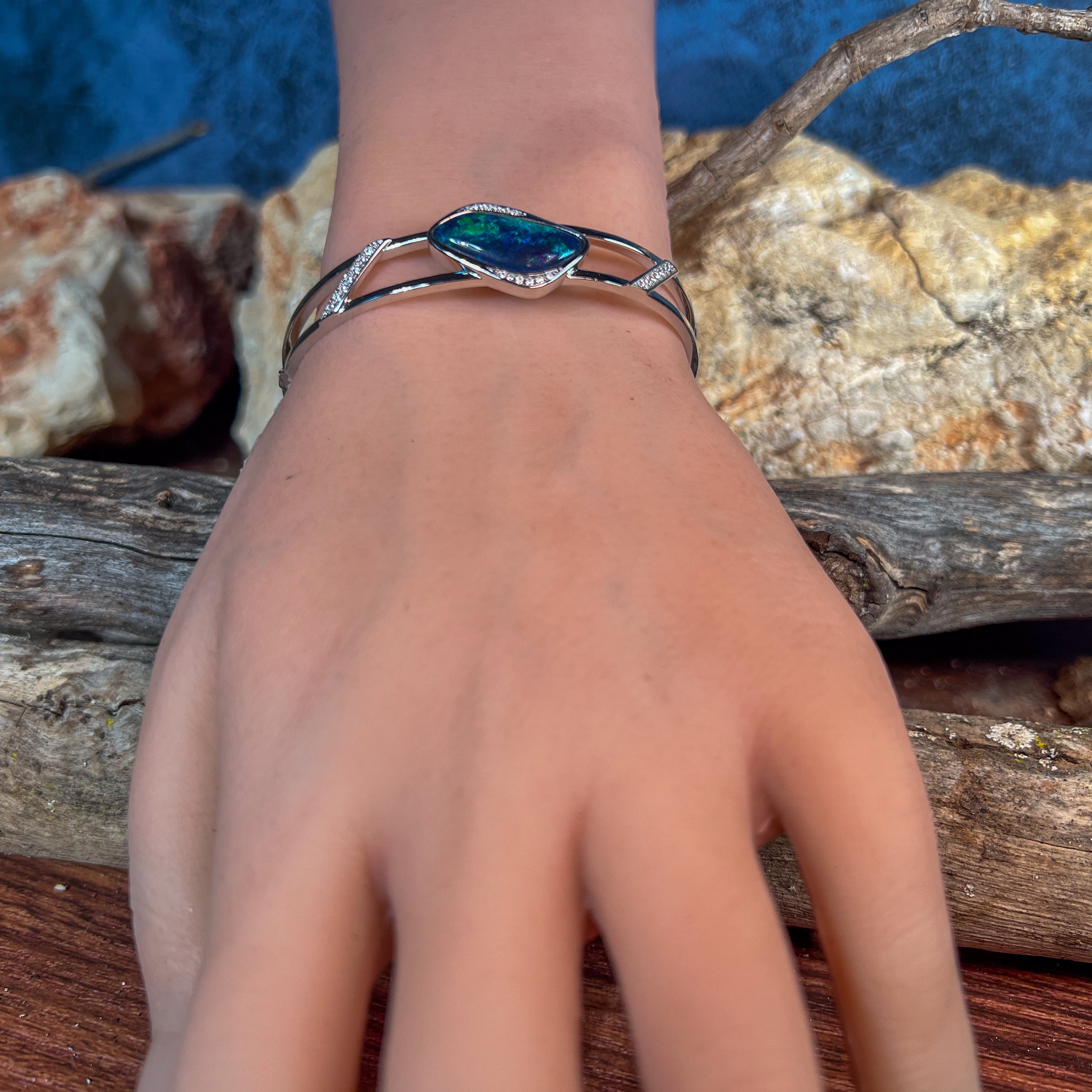 This sterling silver bangle features a modern open cut design, highlighting a stunning opal triplet with a unique freeform shape. The sleek craftsmanship combines contemporary style with expert attention to detail, making it an elegant statement piece that complements any outfit with subtle sophistication. Durable yet refined, it offers both comfort and visual intrigue for everyday wear or special occasions.
