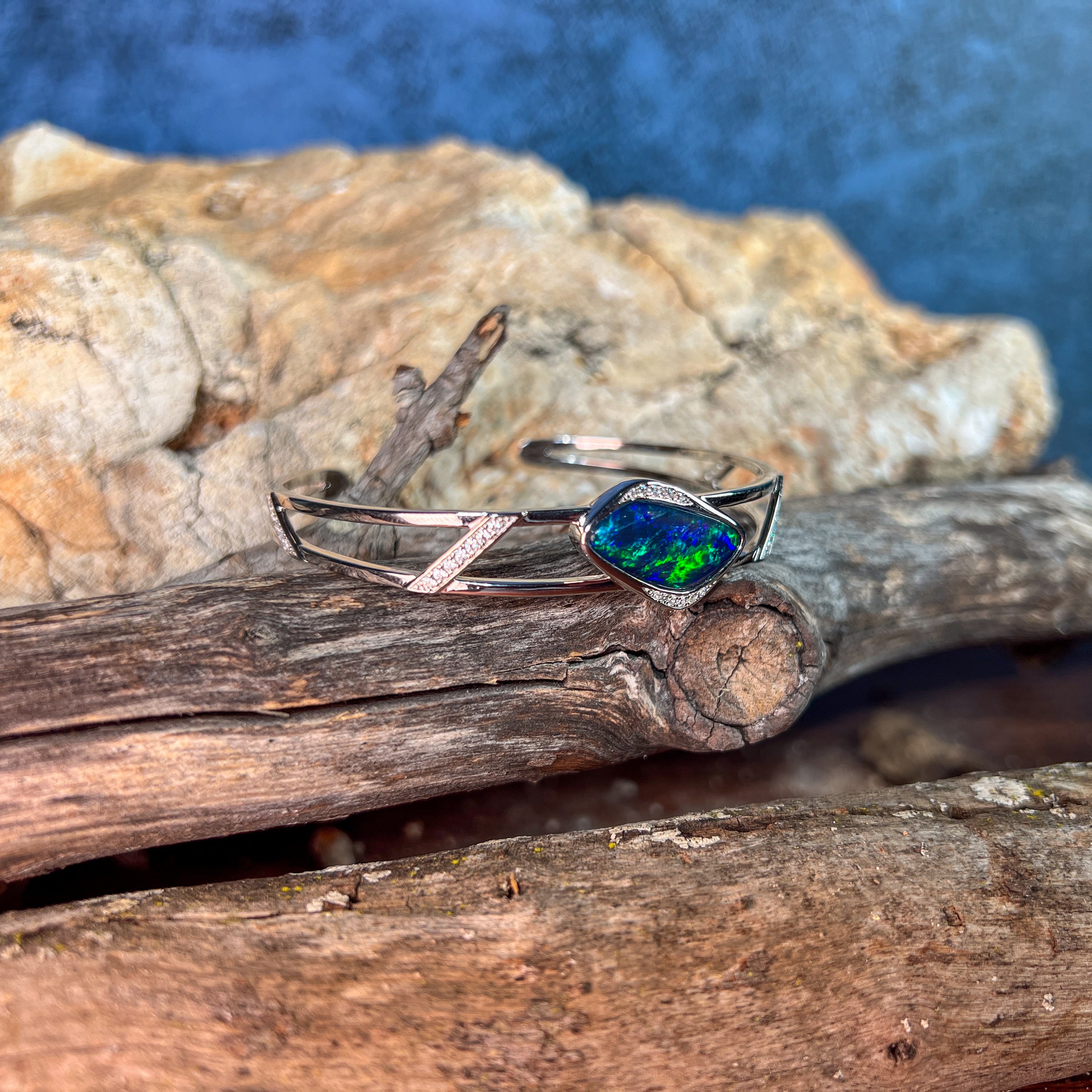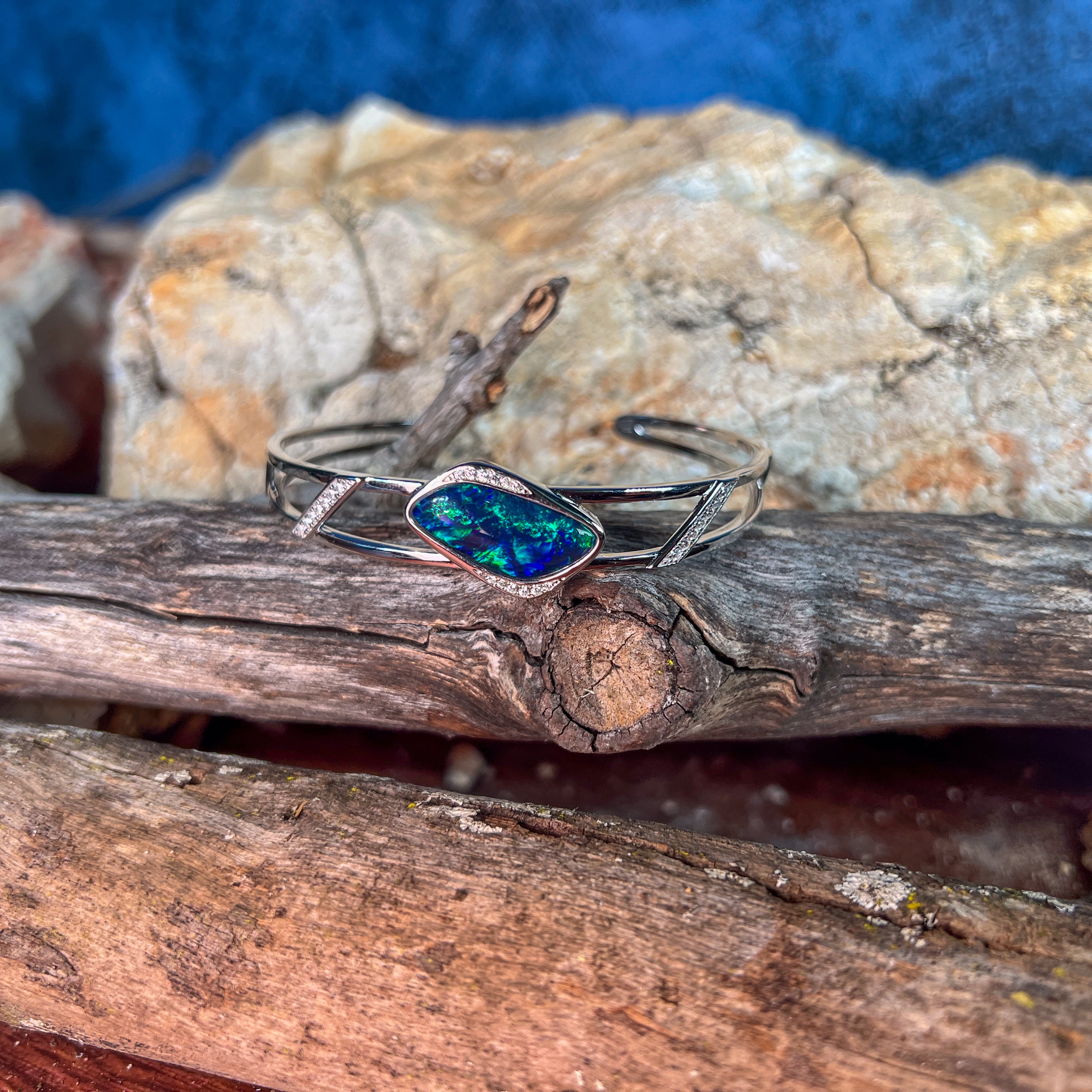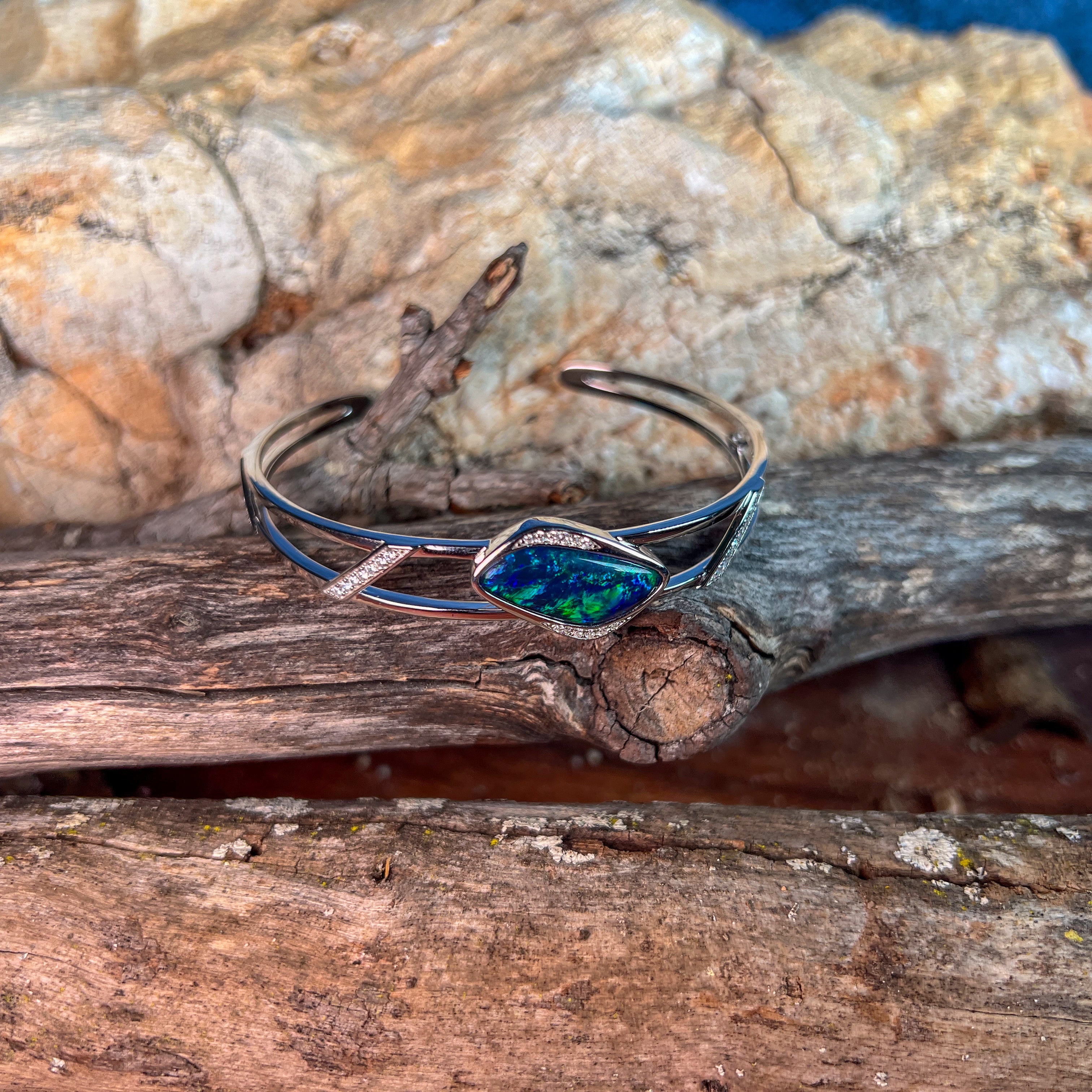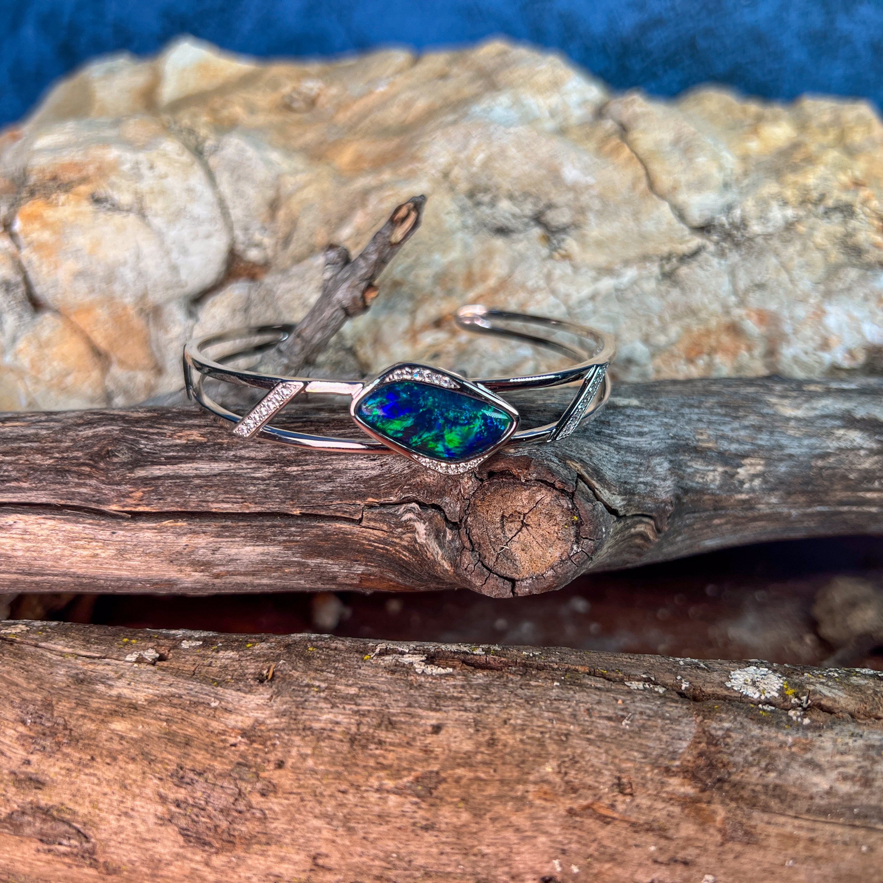This sterling silver bangle features a modern open cut design, highlighting a stunning opal triplet with a unique freeform shape. The sleek craftsmanship combines contemporary style with expert attention to detail, making it an elegant statement piece that complements any outfit with subtle sophistication. Durable yet refined, it offers both comfort and visual intrigue for everyday wear or special occasions.