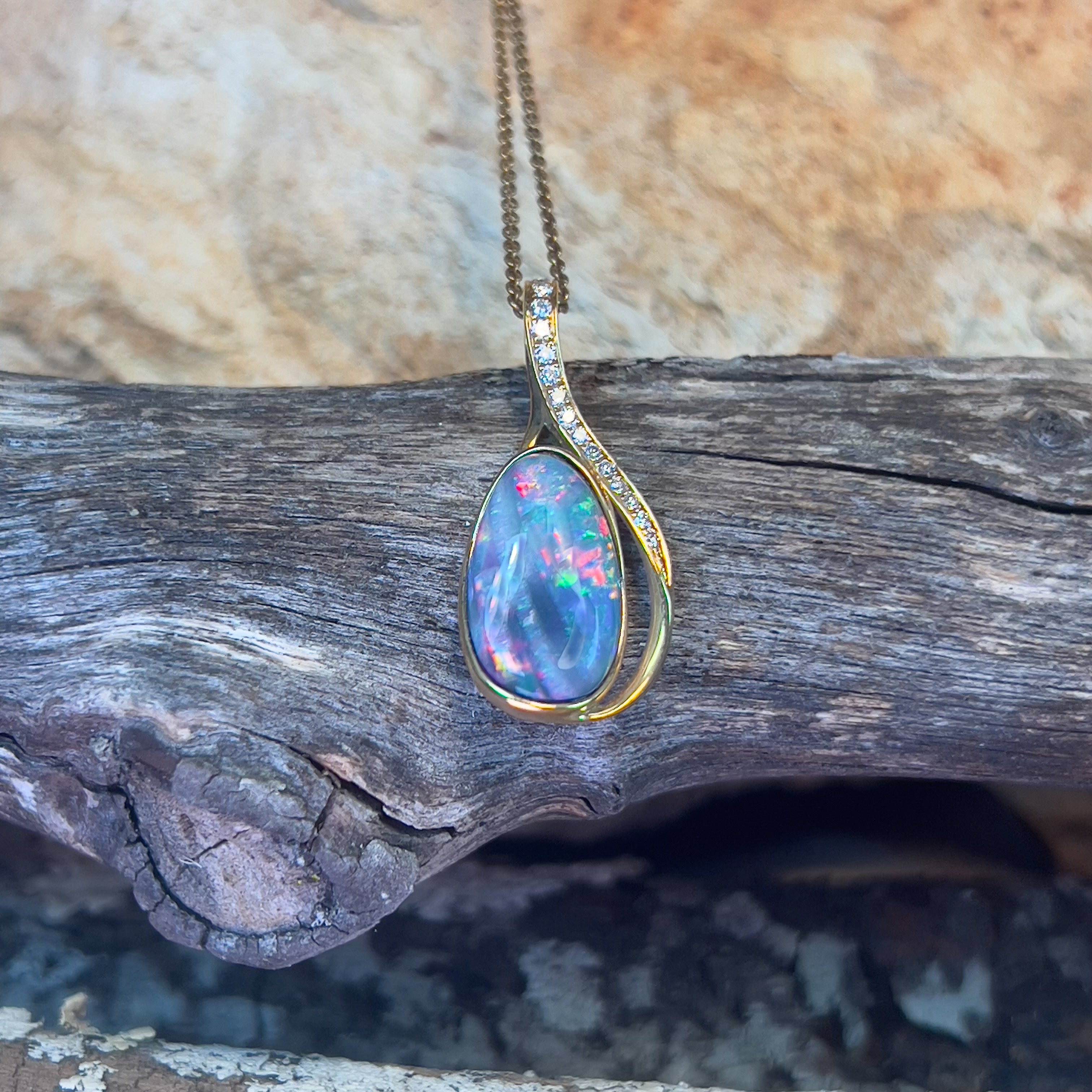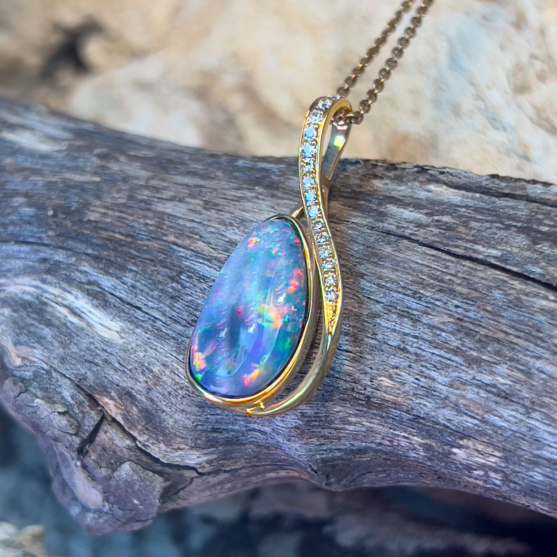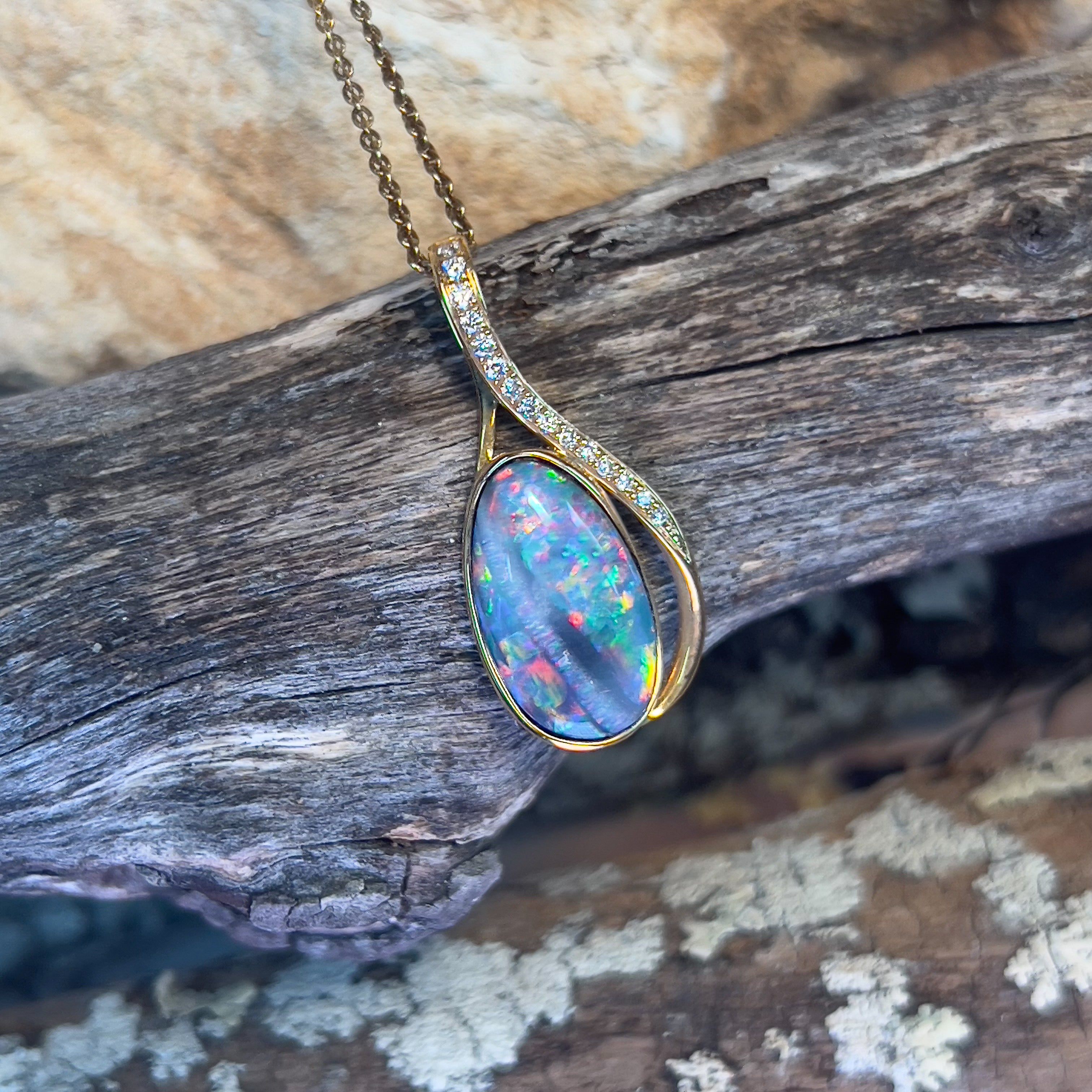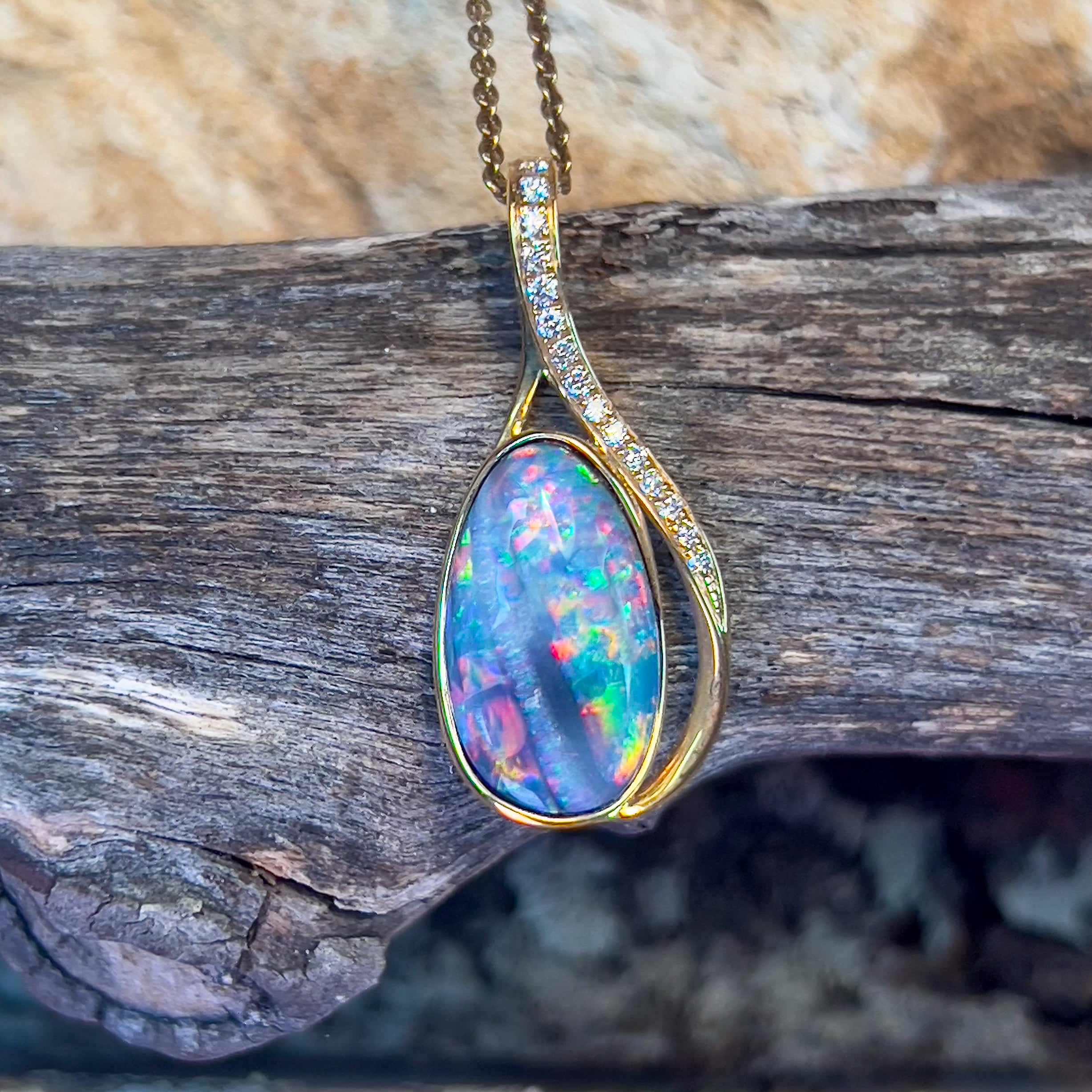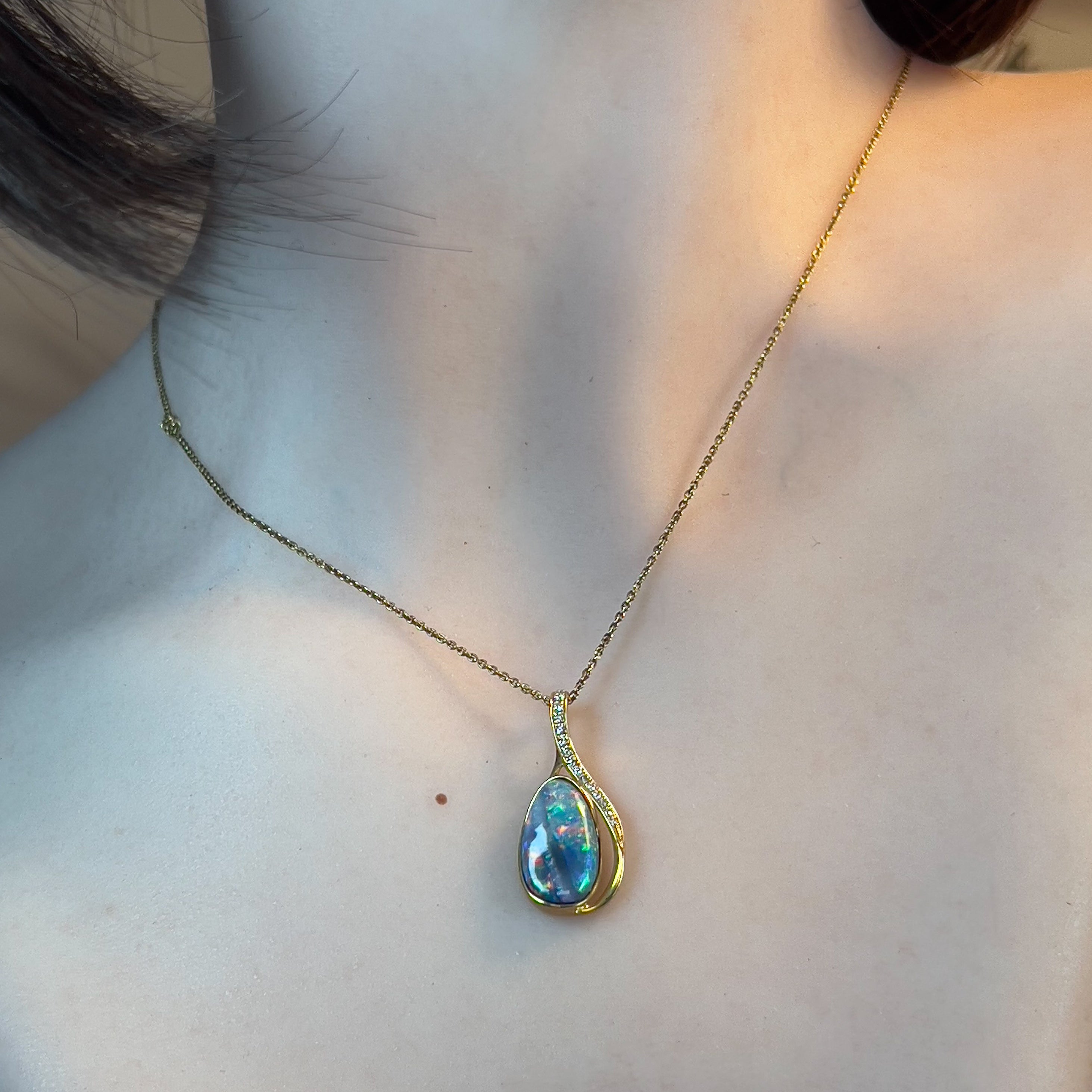 Crafted from luxurious 18kt yellow gold, this stunning pendant features a mesmerizing 4.05ct opal doublet and sparkling 0.1ct diamonds. Perfect for any special occasion, this gold necklace for women exudes elegance and sophistication while adding a touch of glamour to any outfit. Elevate your style with this exquisite accessory.