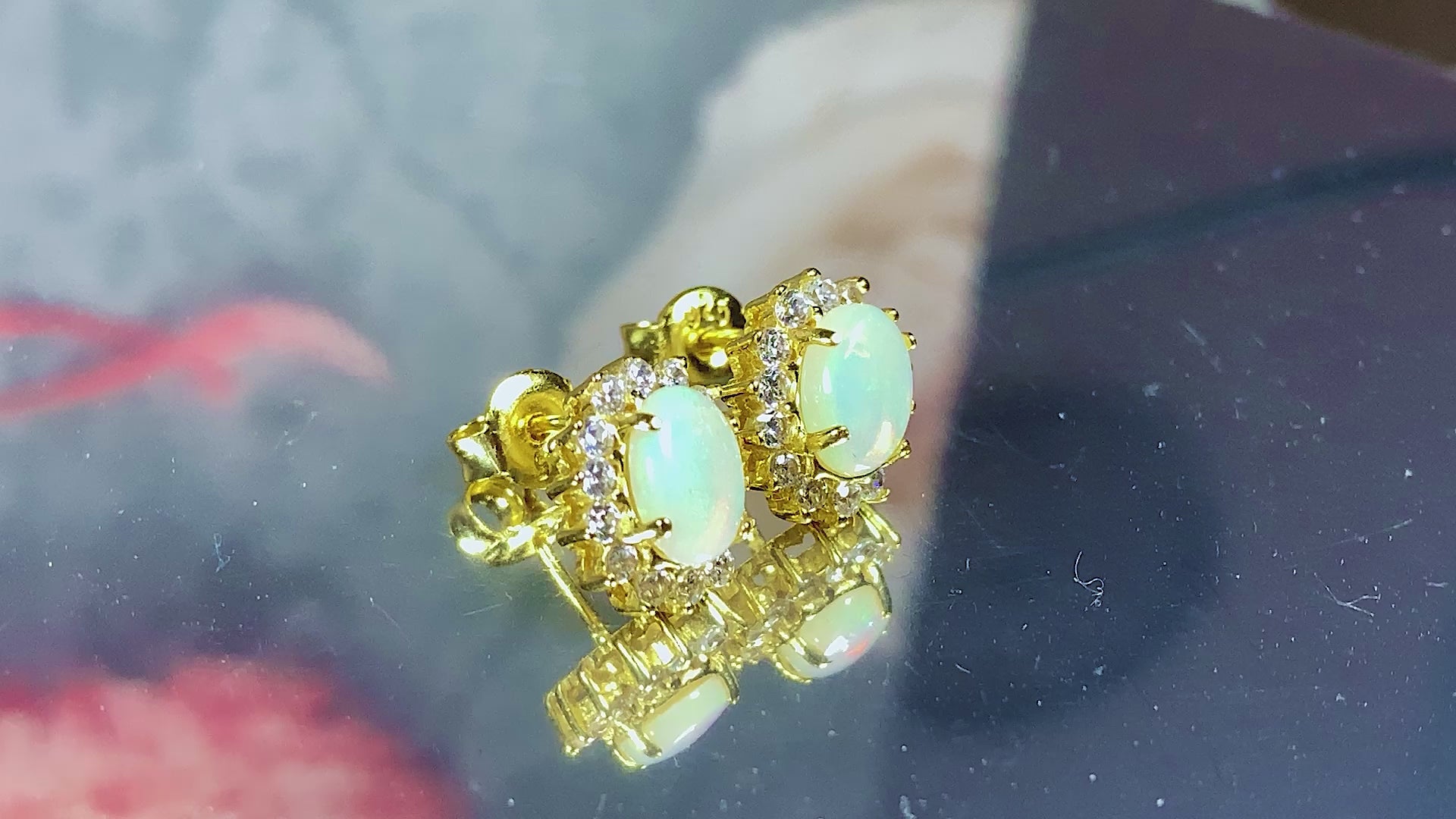 These opulent gold-plated silver earrings feature a stunning cluster design with 7x5mm white opals. An exquisite addition to any jewelry collection, these earrings make for a luxuriously indulgent gift for the woman of taste and refinement.