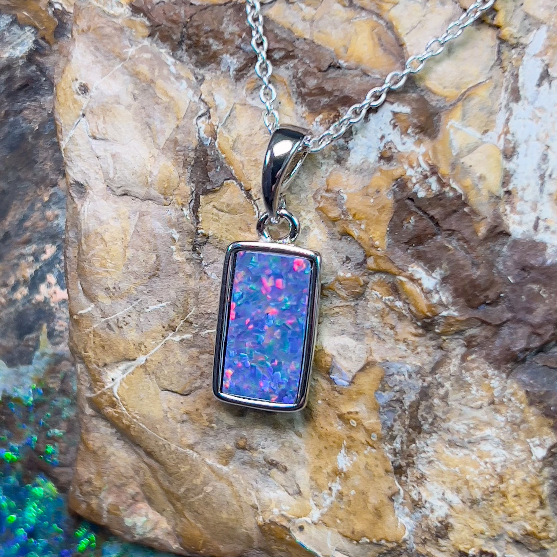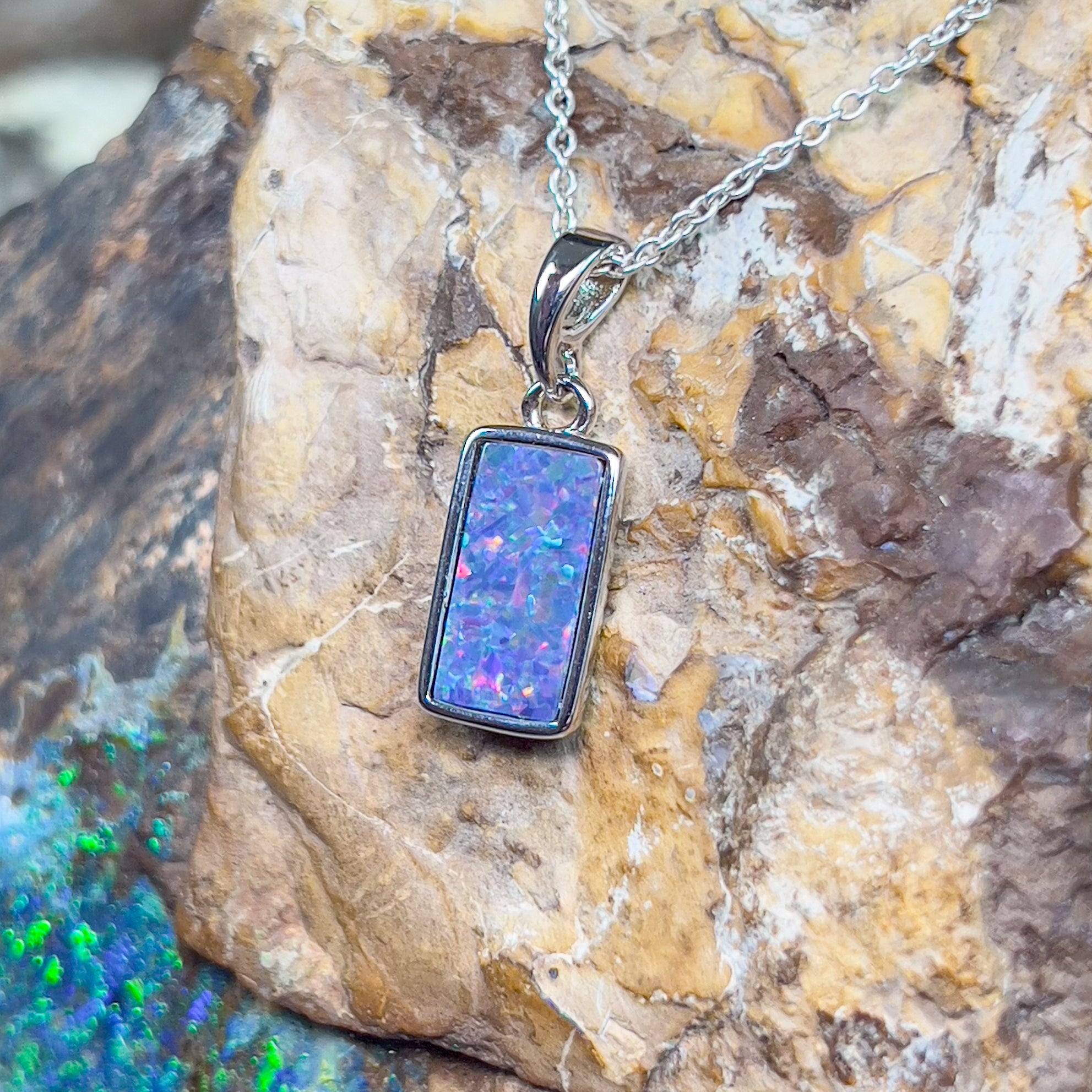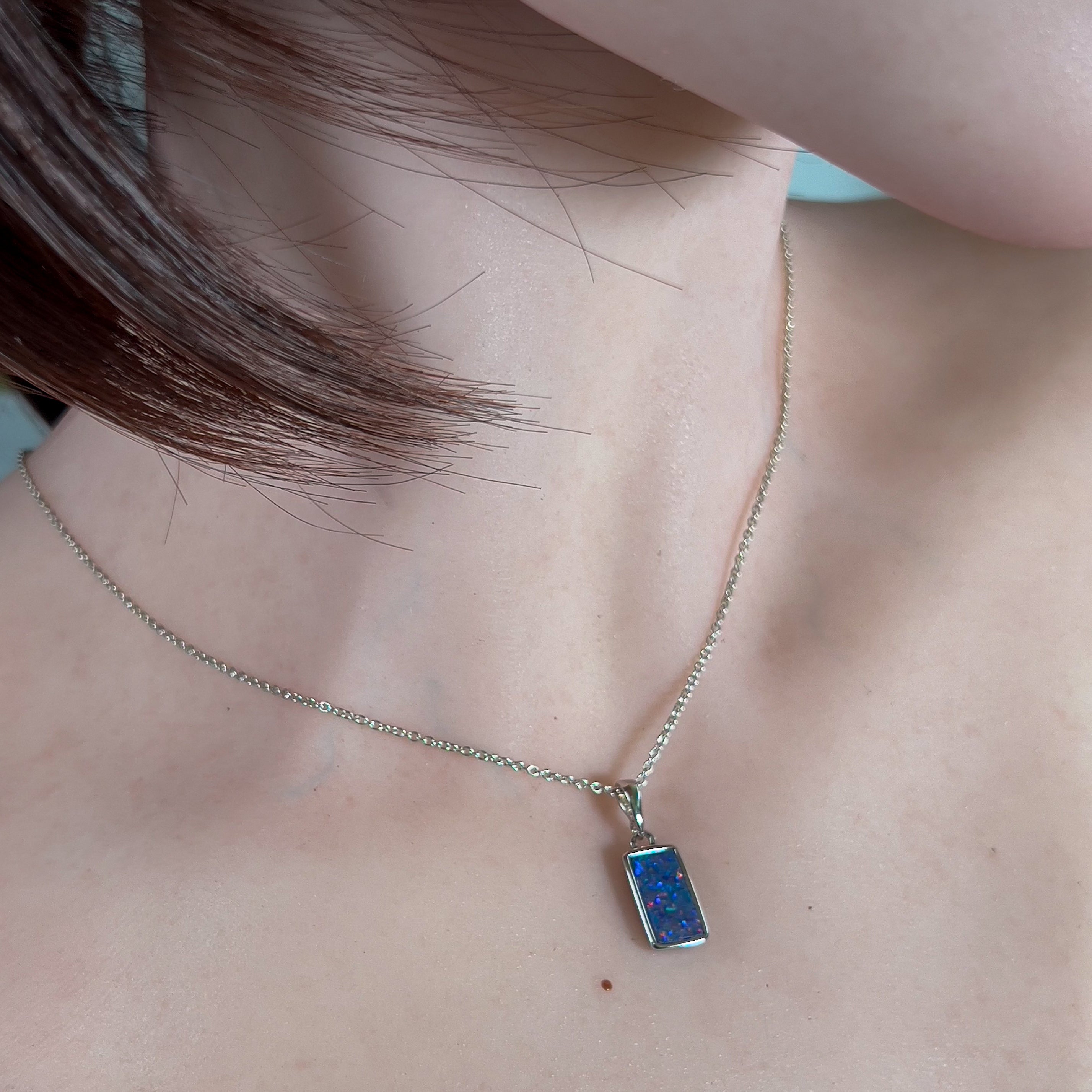 Experience the captivating beauty of our Sterling Silver Rectangular Opal doublet 12x7mm pendant. Its unique rectangle shape adds a touch of elegance to any outfit. This stunning pendant will make you stand out and feel confident in any setting. Don't miss out on this timeless accessory!