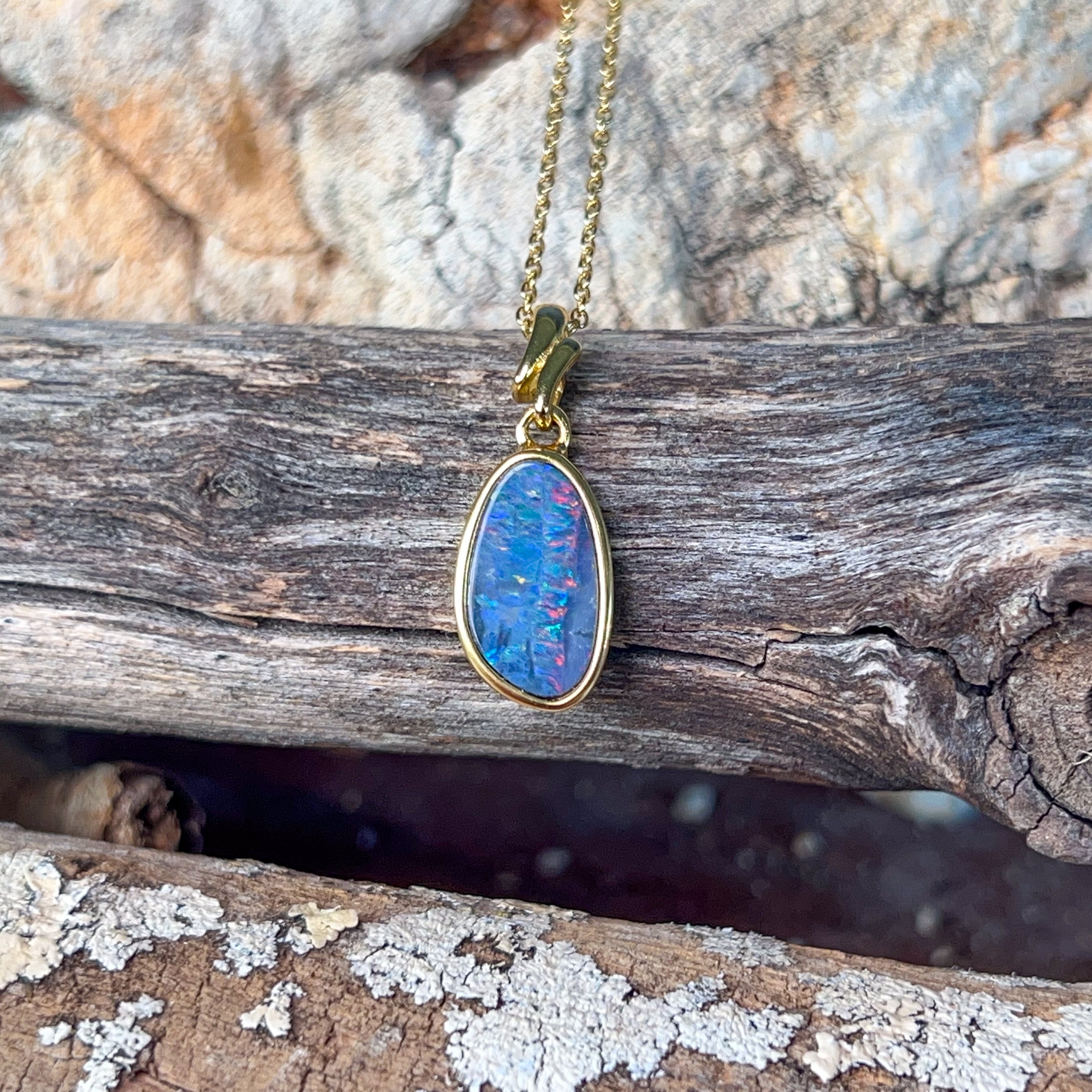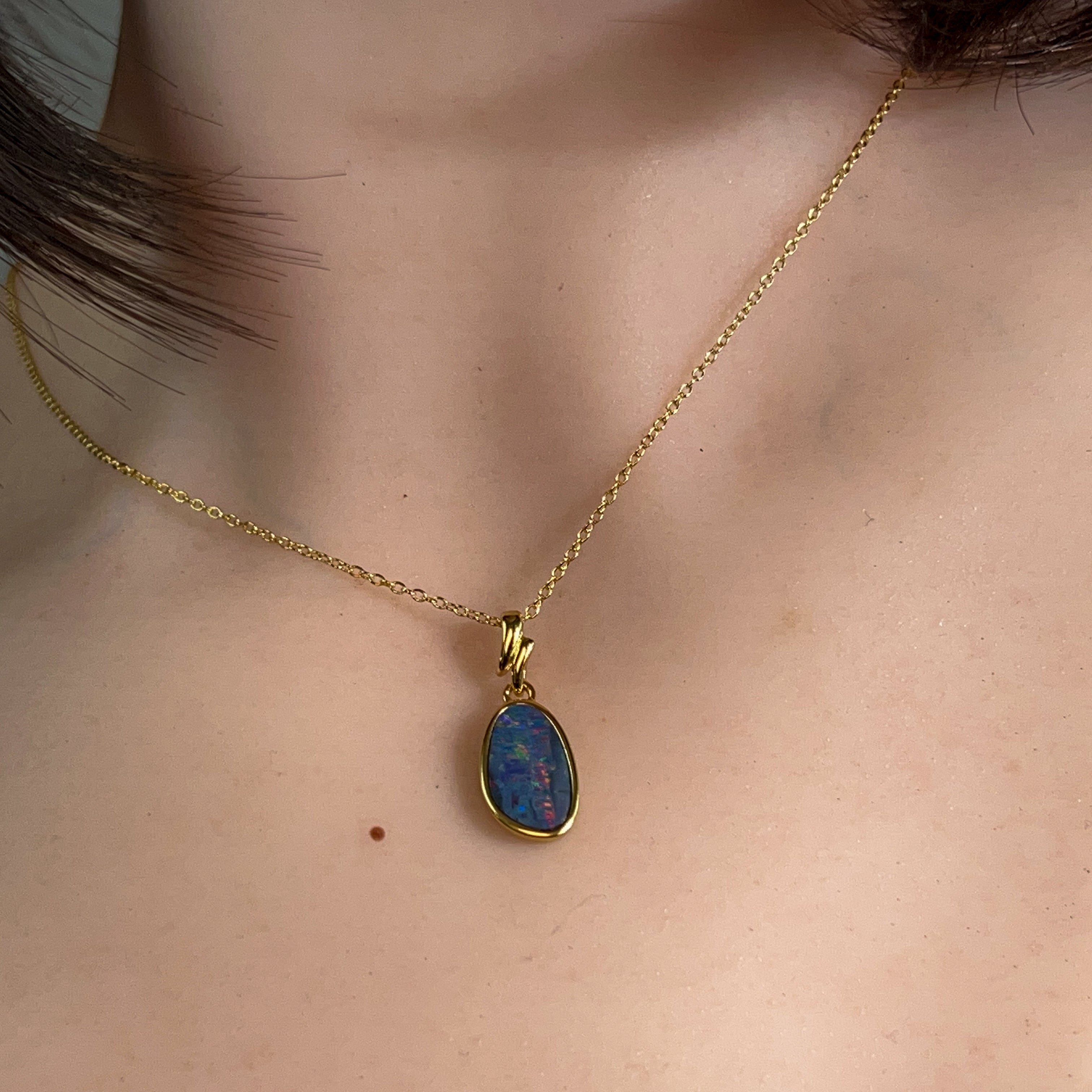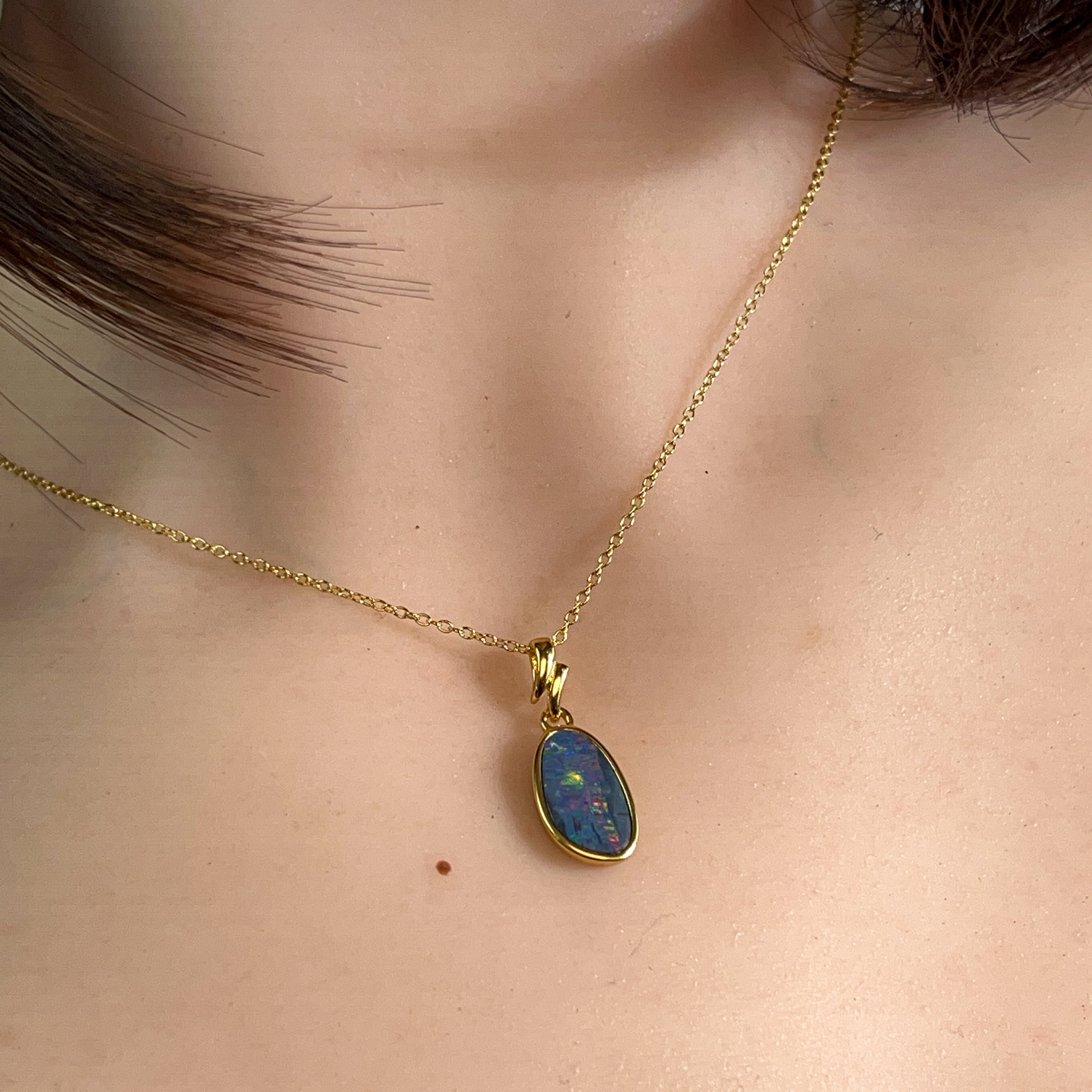 Elevate your everyday elegance with this stunning gold-plated silver opal pendant. Featuring a captivating 14x9mm doublet opal, this piece combines the mesmerizing play-of-colour that opals are renowned for with the timeless sophistication of precious metals. The doublet construction offers exceptional durability while maintaining that coveted opal brilliance. Perfect for layering or wearing solo, this pendant makes a refined statement that transitions effortlessly from day to night. A modern essential for opal lovers seeking quality craftsmanship and contemporary style.