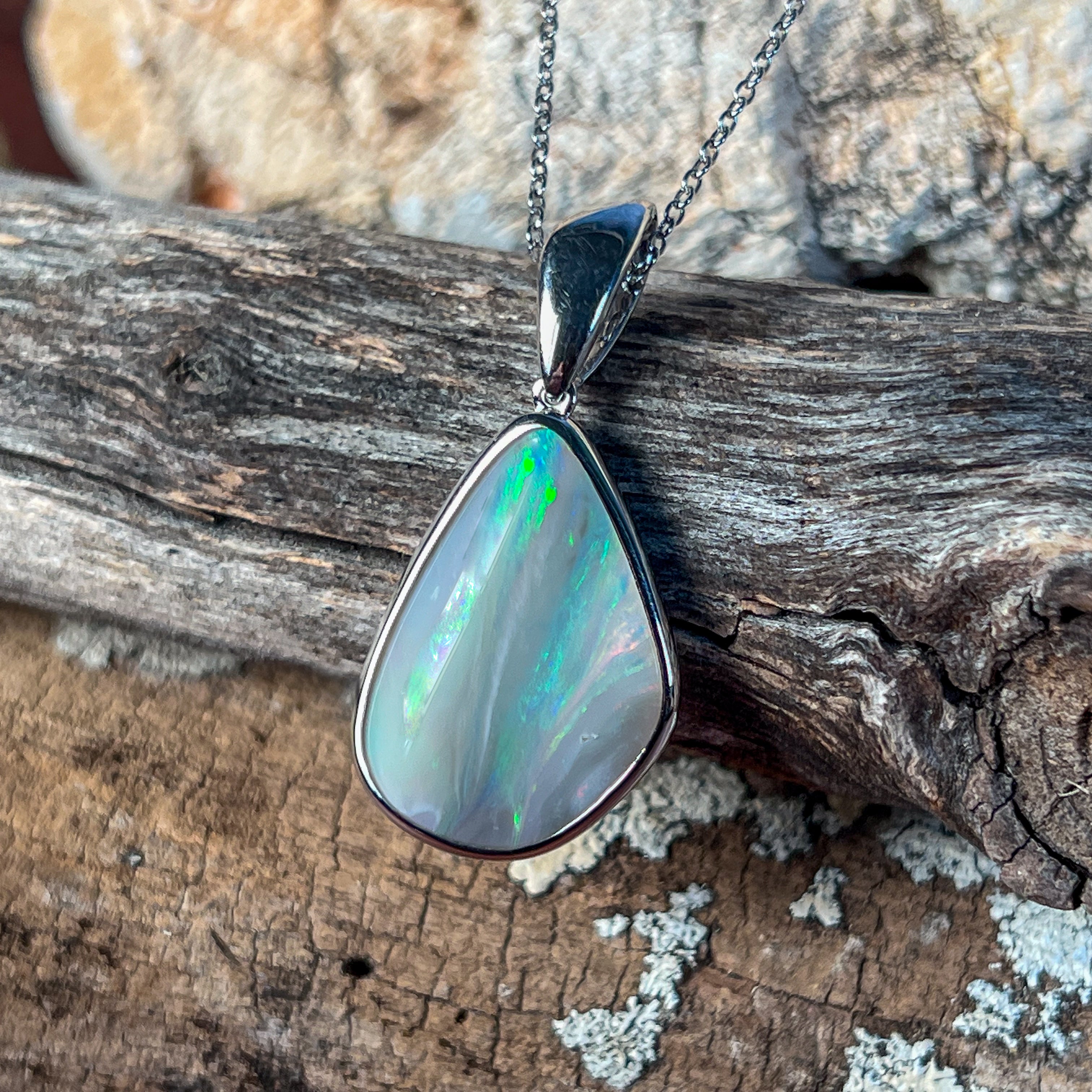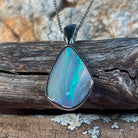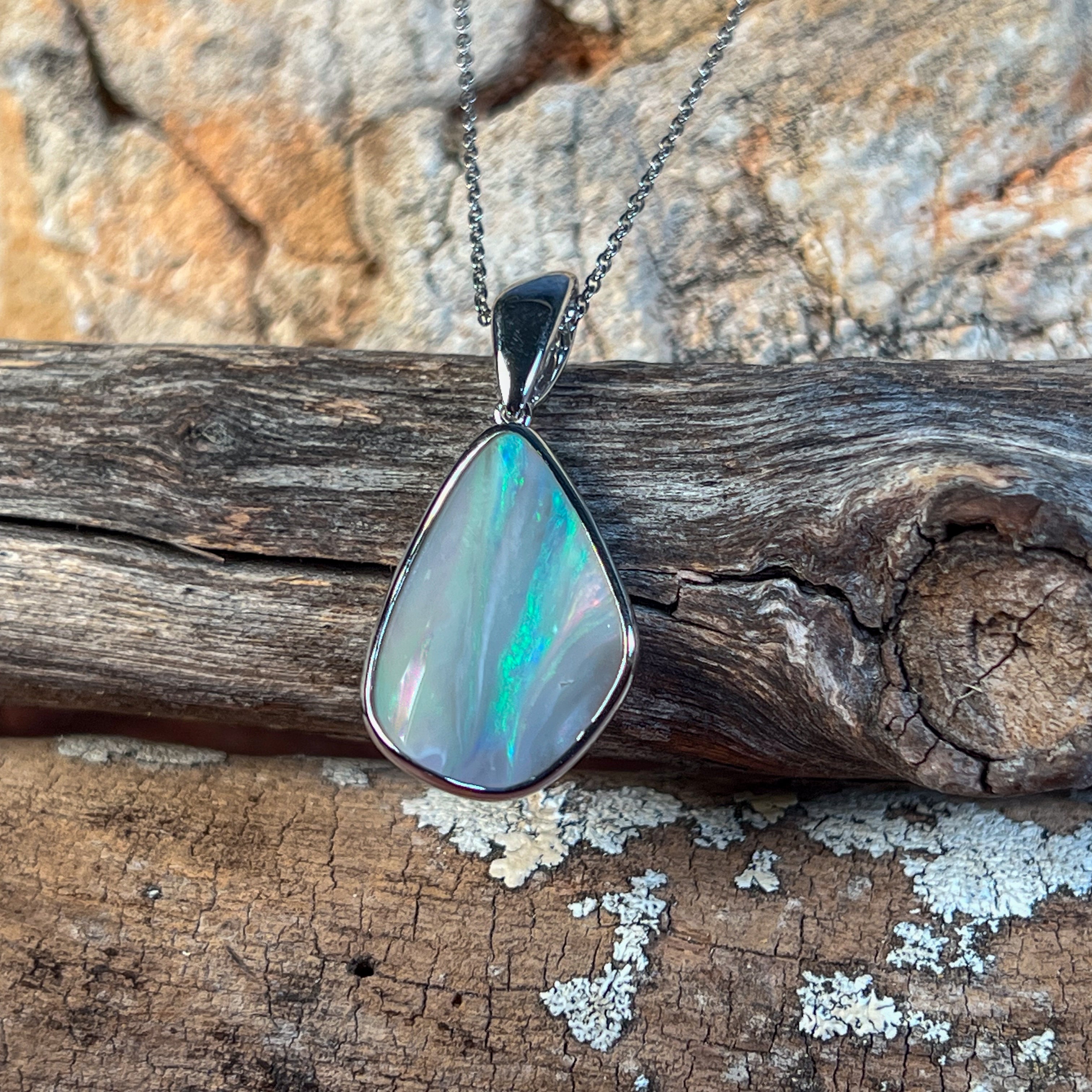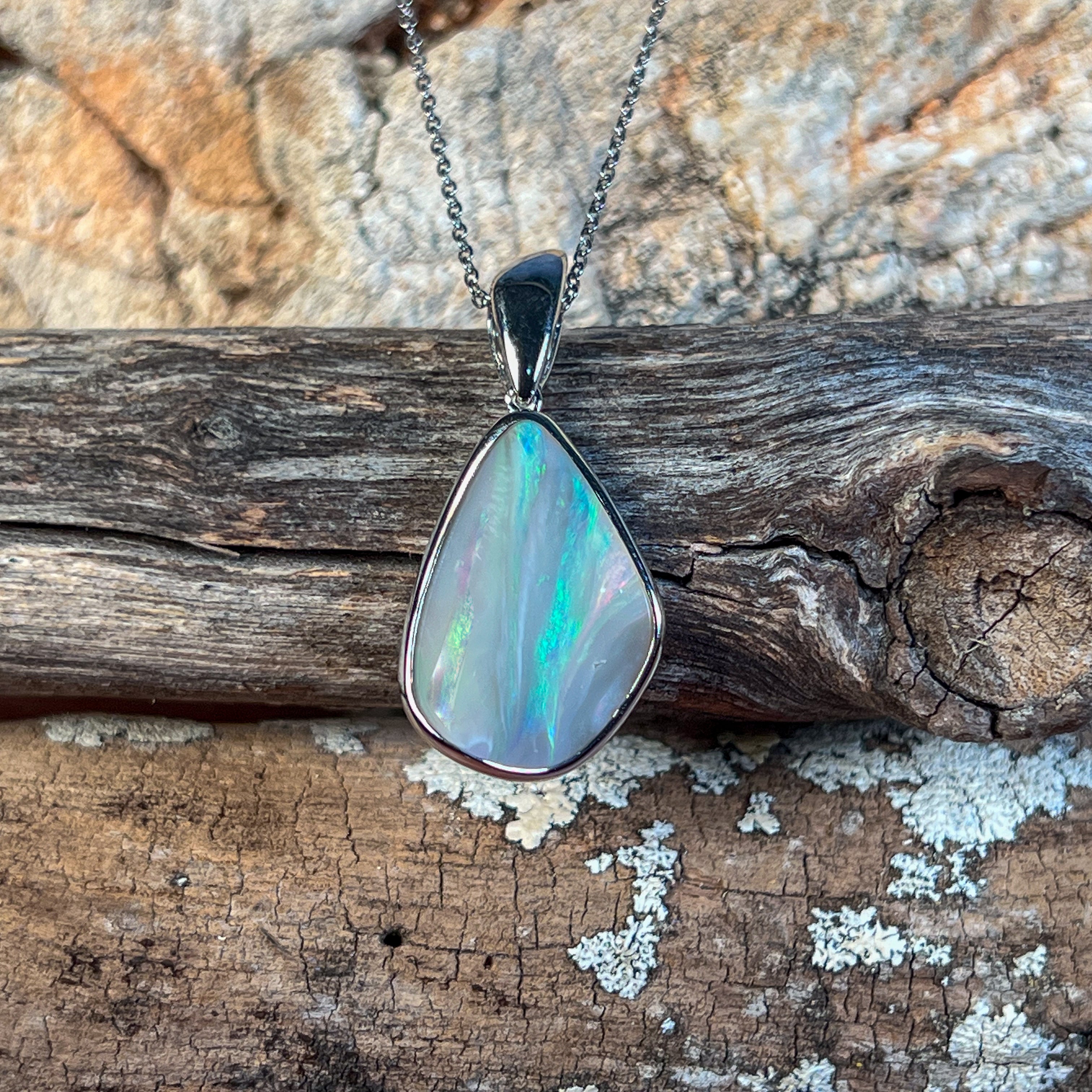 This stunning freeform pendant showcases a mesmerizing black opal in soft, dreamy pastel hues that dance across its surface. Crafted from lustrous sterling silver, it's the perfect piece for anyone who loves nature-inspired jewellery with a whimsical touch. The organic shape celebrates the opal's natural beauty, while the gentle colour palette adds a touch of magic to any outfit. Whether you're dressing up or keeping it casual, this pendant brings a playful sparkle to your day.