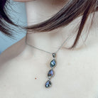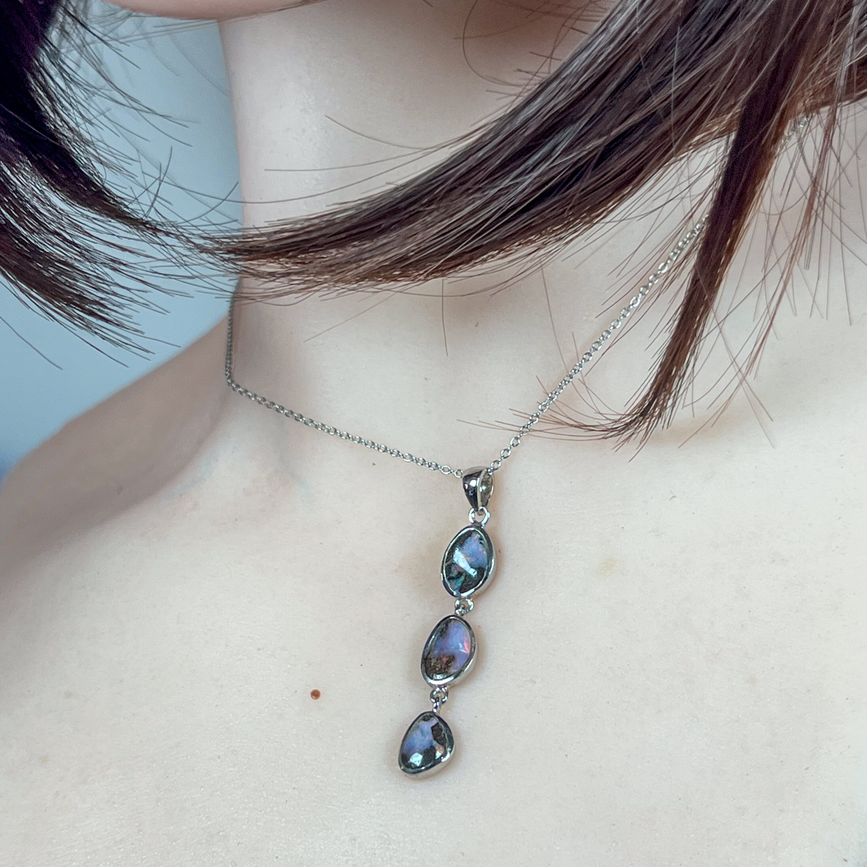 Elevate your everyday sparkle with this stunning three-stone drop pendant that's equal parts sophisticated and fun. Featuring genuine boulder opal in a sleek sterling silver setting, it catches the light with mesmerizing flashes of colour that shift and dance as you move. The cascading design adds movement and dimension to any outfit, while the quality craftsmanship ensures it'll be a cherished piece for years to come. Perfect for opal lovers who refuse to compromise on style or substance.