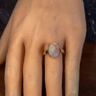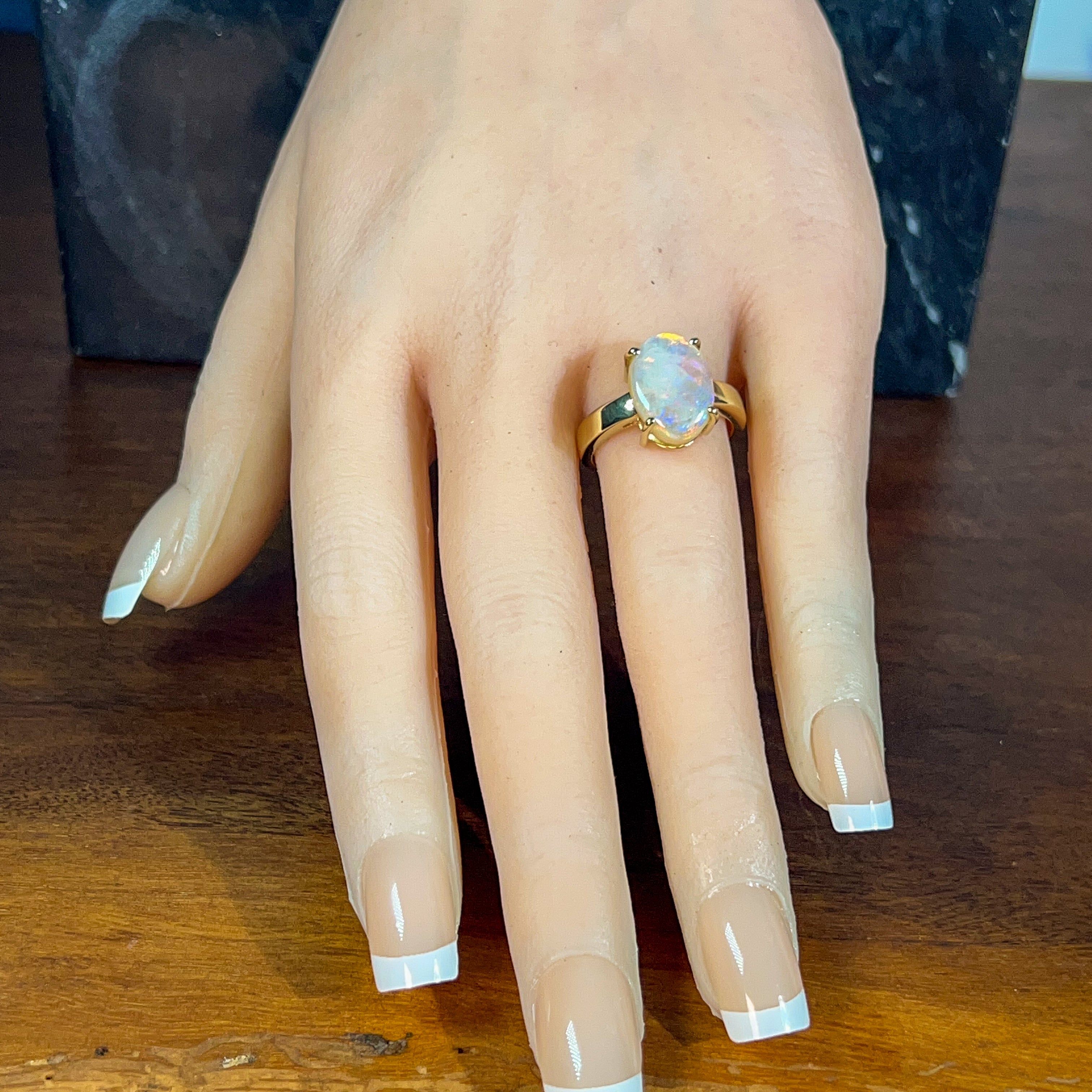 This stunning 14kt yellow gold solitaire ring features a magnificent 2.81ct Australian light opal that commands attention with its spectacular play of fire. The oval opal (14x10mm) displays a vibrant spectrum of colours—pink, red, yellow, blue, and green—creating a mesmerising statement piece that catches the light from every angle. Expertly set in a classic claw setting, this ring showcases the opal's natural beauty while the secure mounting ensures lasting wear. Perfect for those who appreciate bold, colourful gemstones that make a lasting impression. Ring size O 1/2, weighing 4.85g.