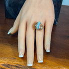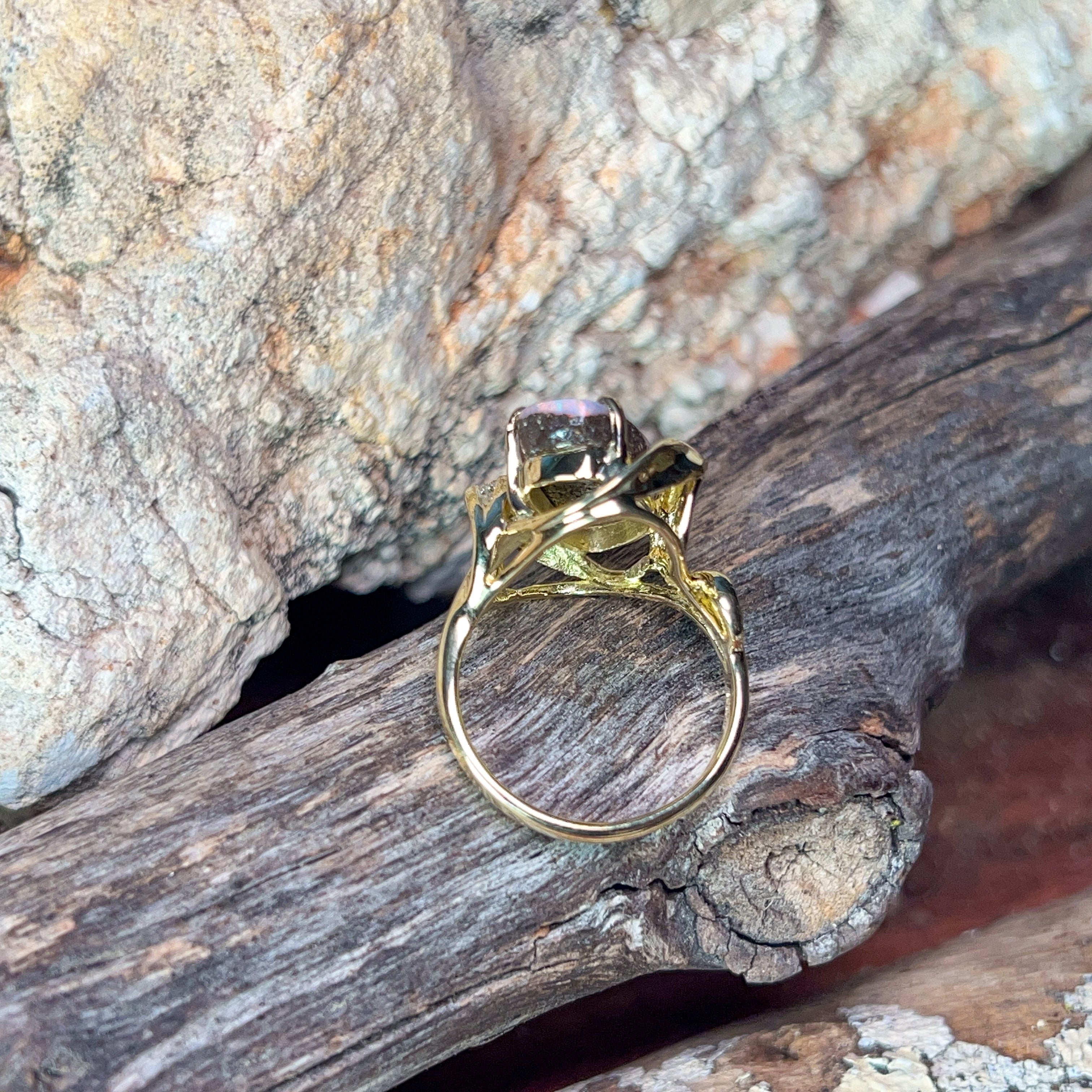 This exquisite 18kt yellow gold ring showcases a stunning 5.7ct Australian boulder opal in a freeform design, displaying captivating pink, red, blue, and green hues. Seven brilliant-cut diamonds (0.12ct, F colour, VS clarity) accentuate the opal's natural beauty with refined sparkle. The organic swirl setting celebrates the opal's unique character while the precious metal craftsmanship ensures lasting elegance. A true statement piece for those who appreciate distinctive gemstone artistry. Size M 1/2.