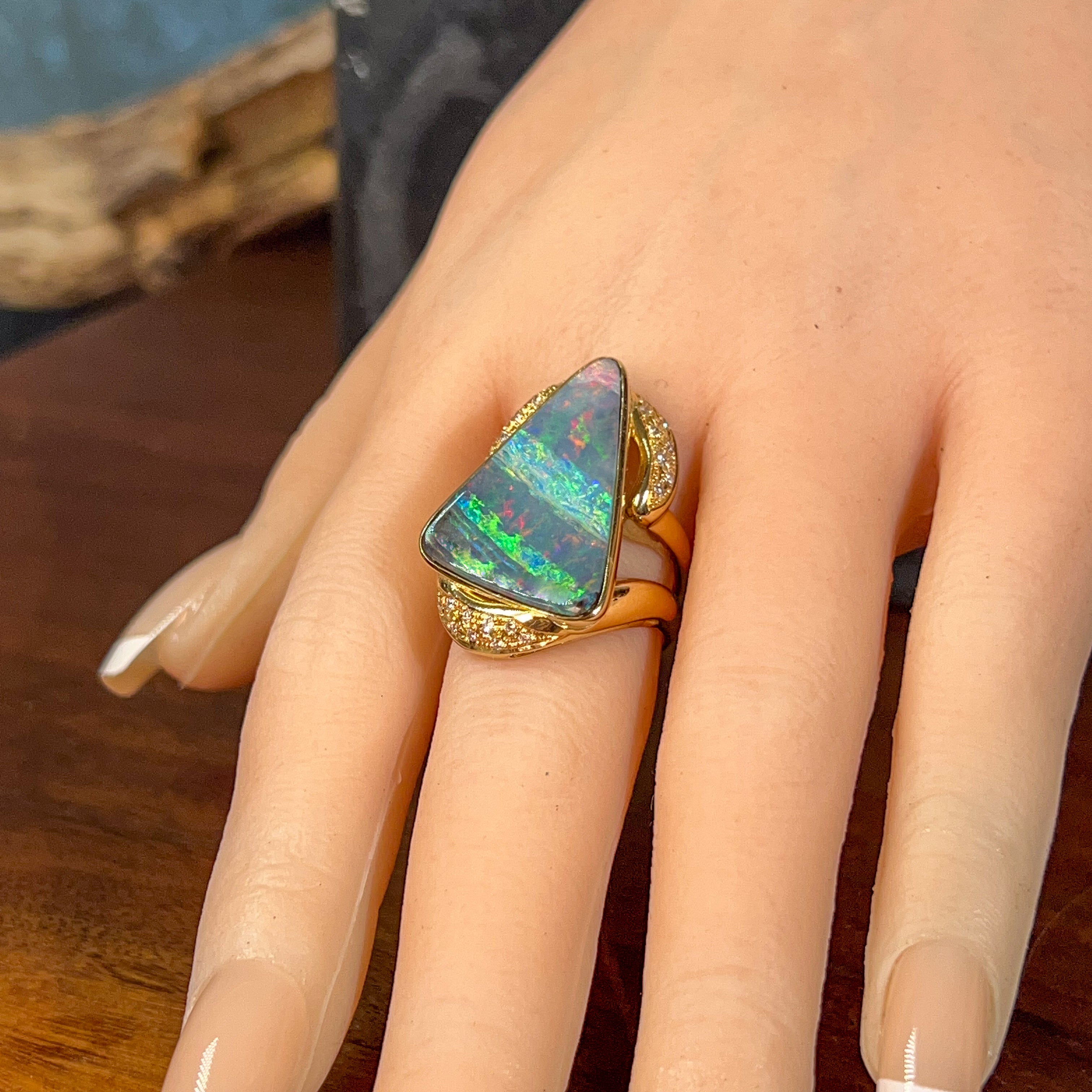 Make a striking impression with this luxurious 18kt yellow gold statement ring, featuring a stunning 9-carat Australian boulder opal in a long triangle cut. The opal displays a mesmerizing blend of pink, yellow, blue, and green hues that shift beautifully in the light. Complementing the opal are 18 round brilliant-cut diamonds (0.18ct, F colour, VS clarity) that frame the stone with elegant sparkle. Weighing 13.15g and sized at O 1/2, this bold piece combines the natural beauty of Australian opal with timeless diamond sophistication—perfect for those who appreciate distinctive, high-quality jewellery.