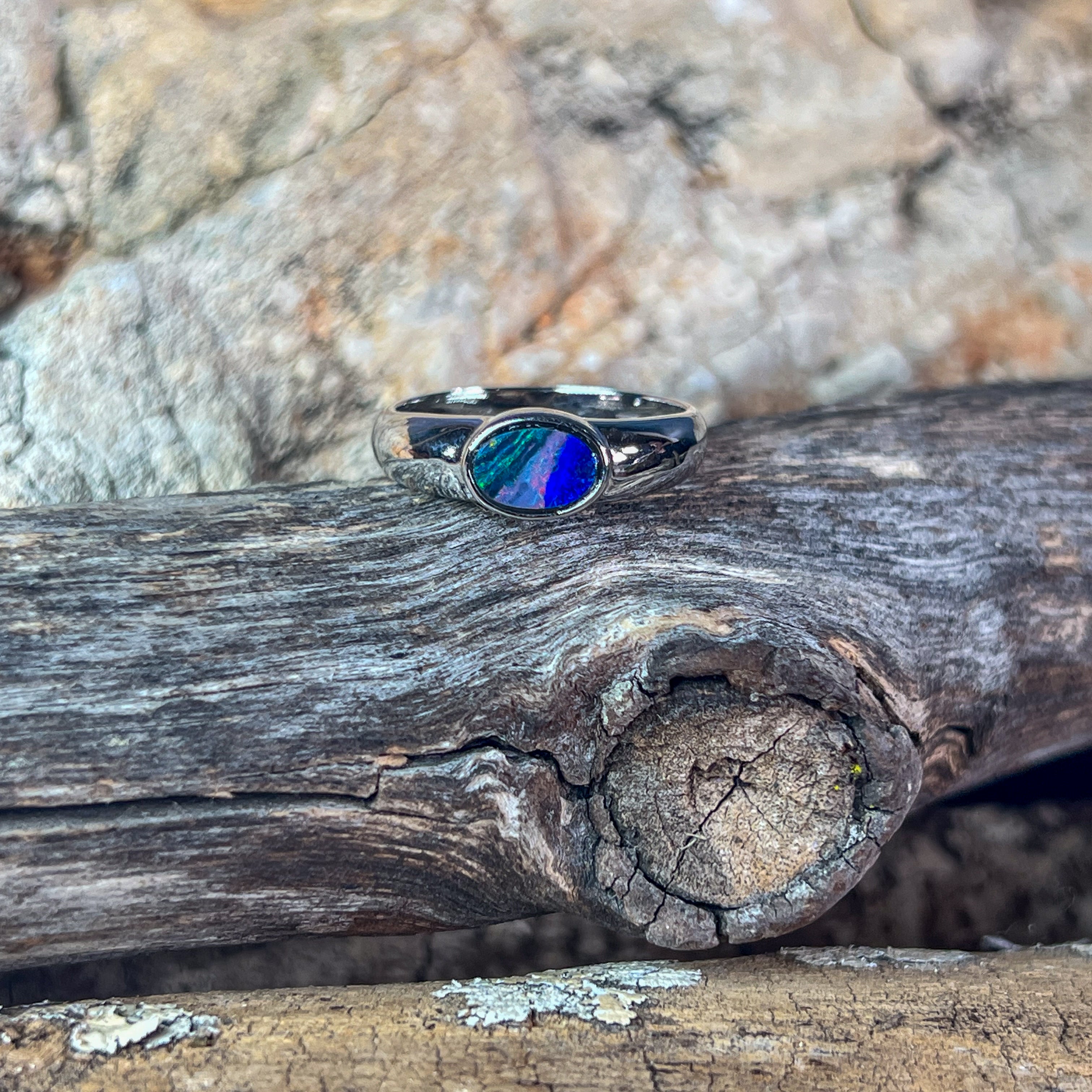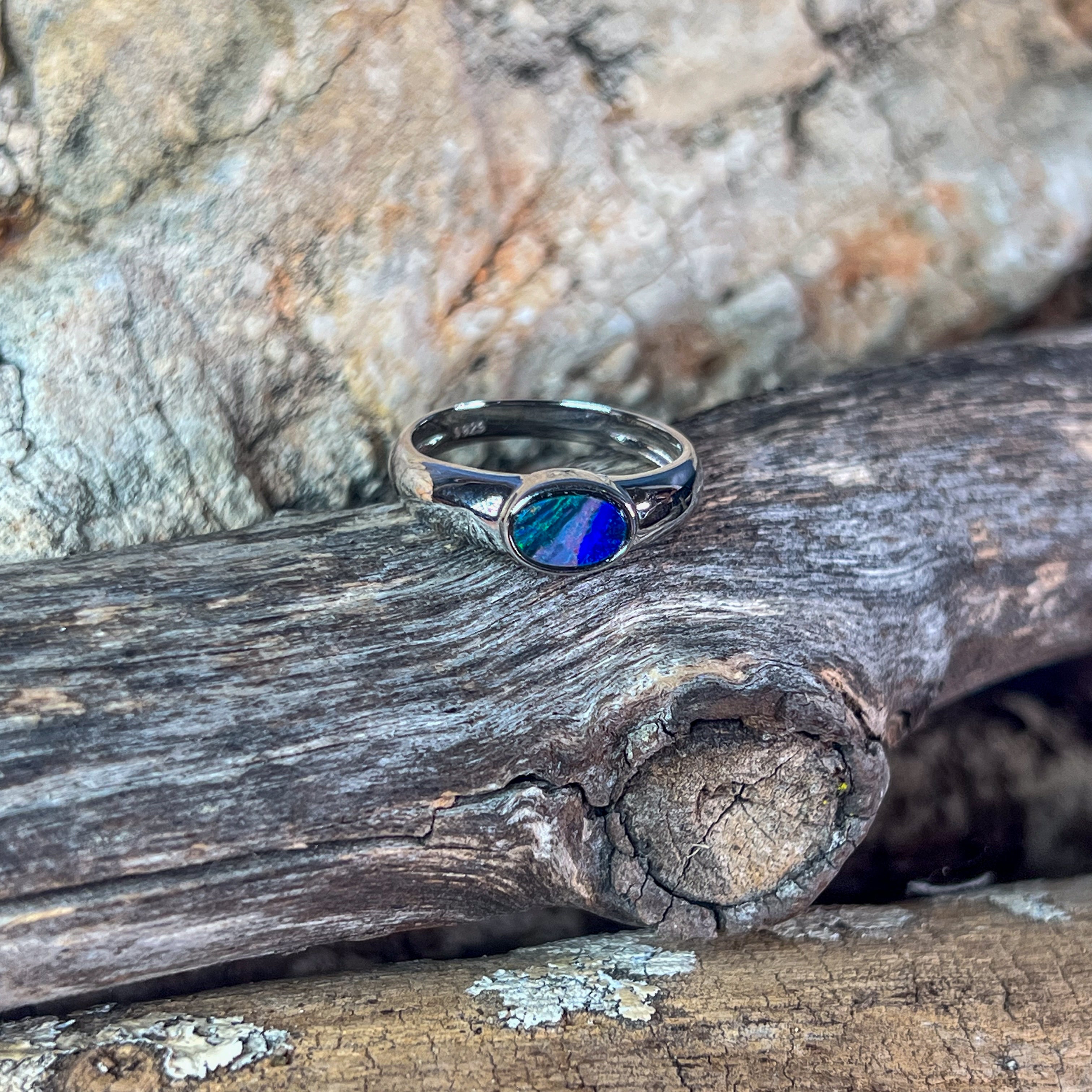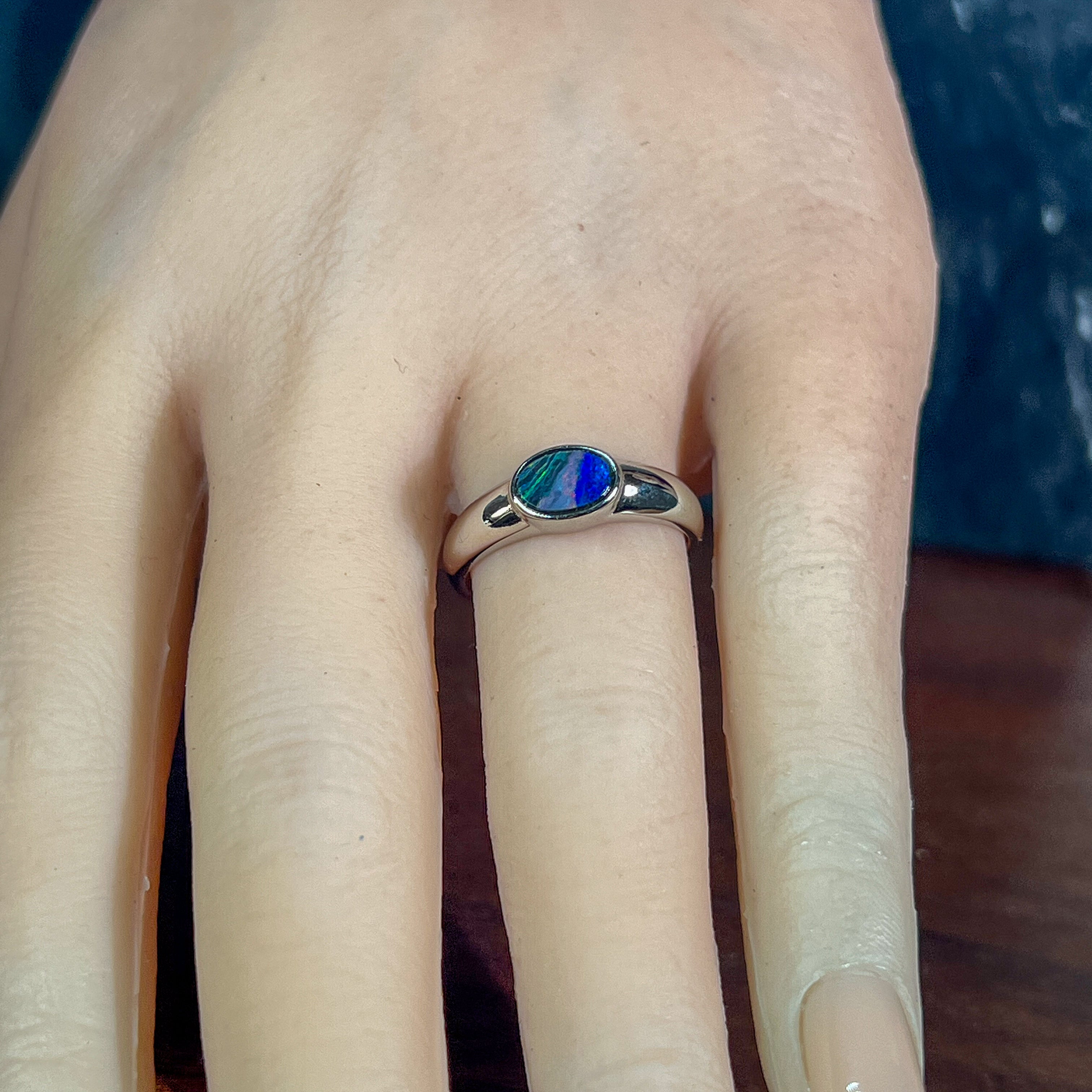 Sterling silver band crafted to showcase your oval opal doublet. The bezel setting holds the stone securely while allowing light to dance through the vibrant play of red, violet, blue, and green hues. Comfortable everyday wear with elegant horizontal orientation.