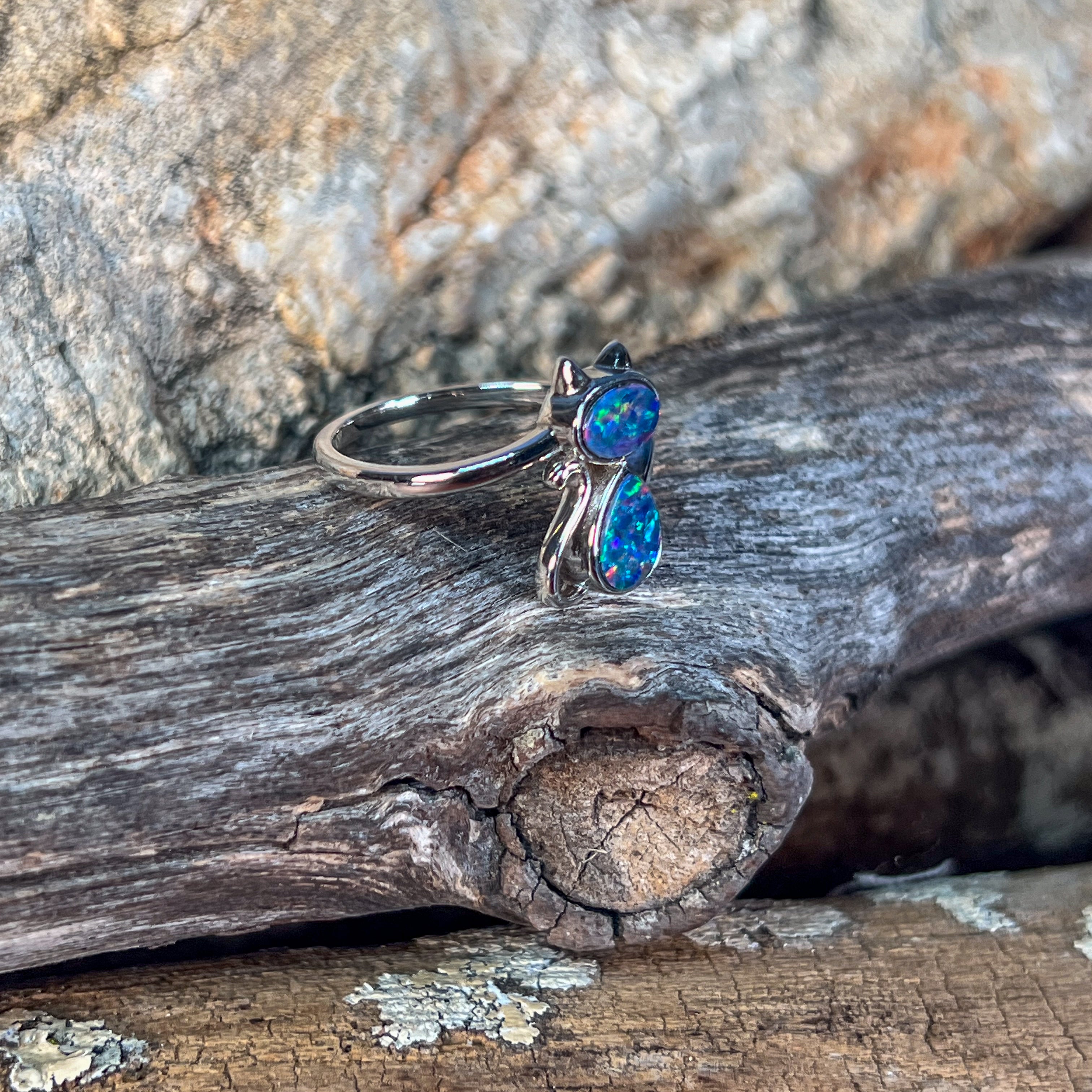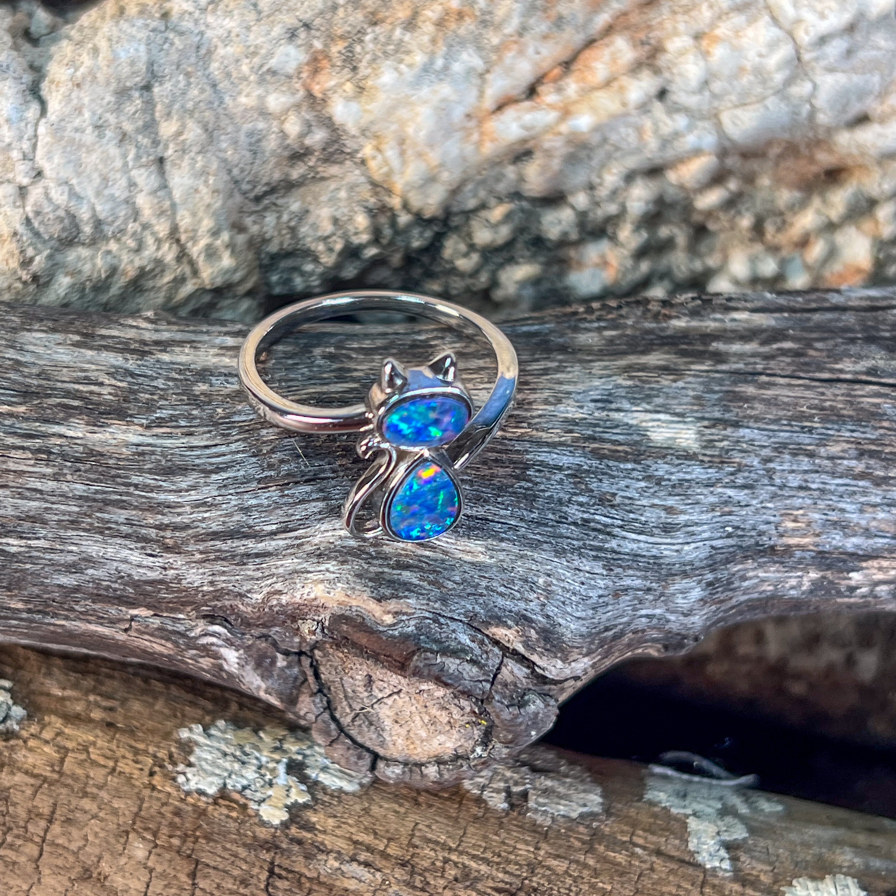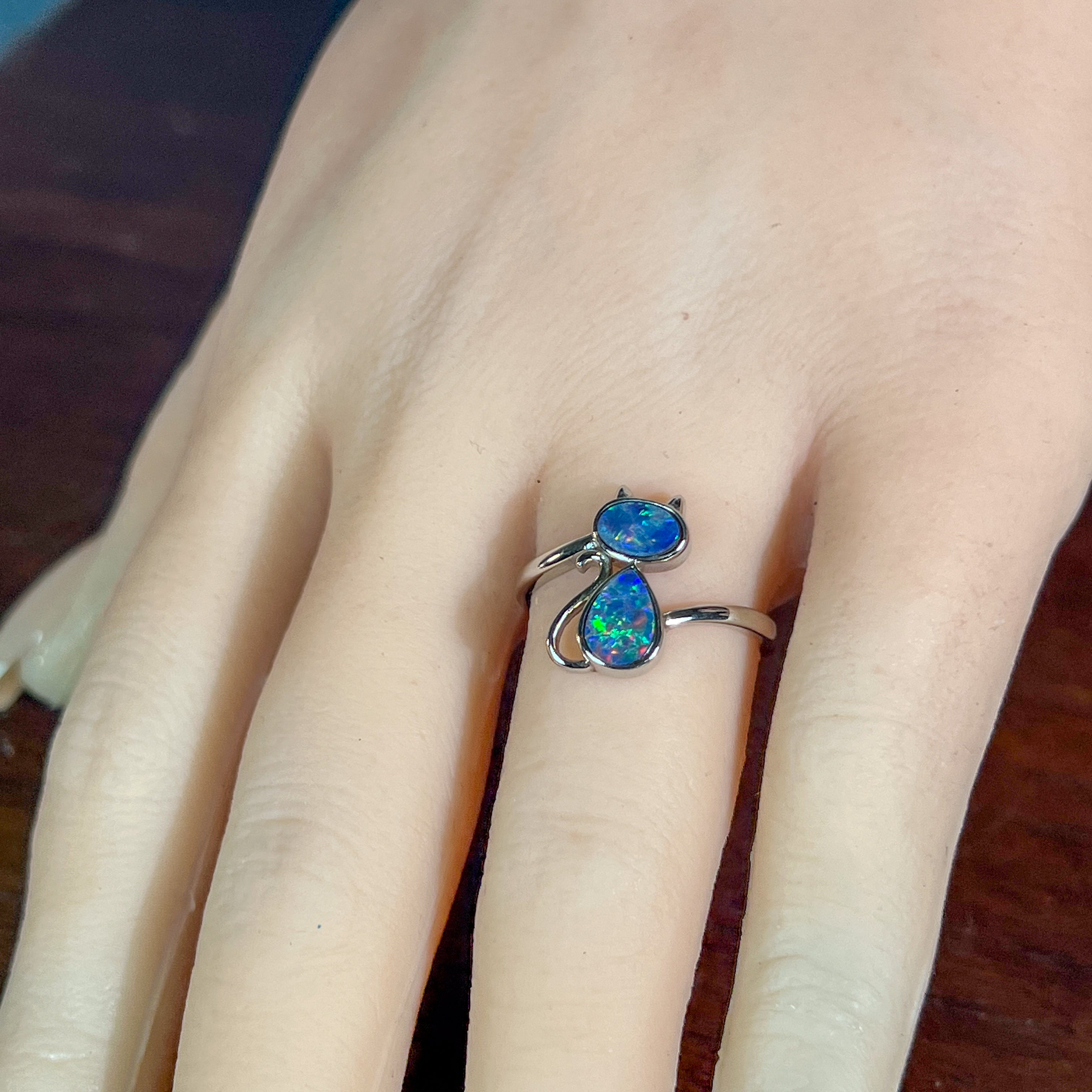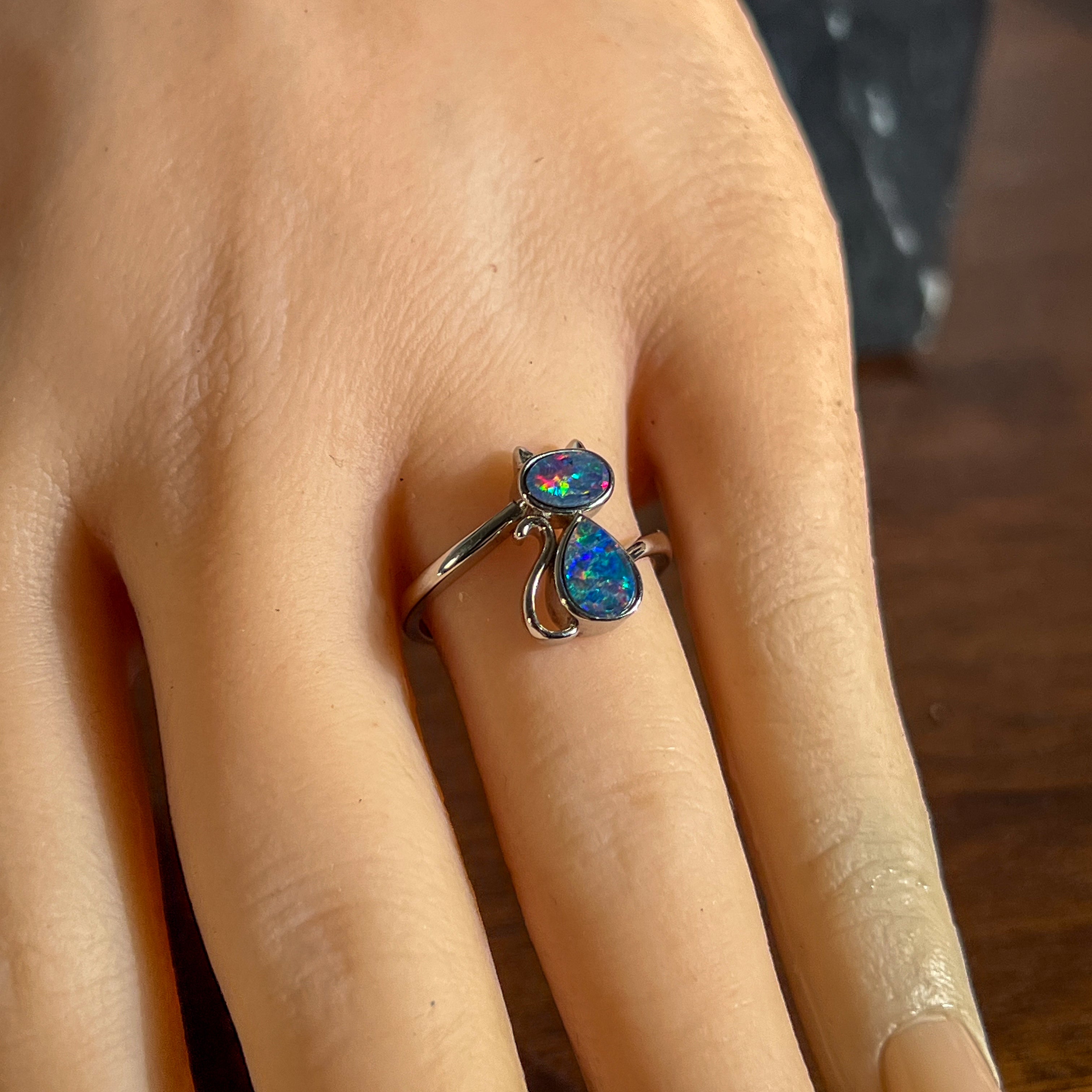 Adorable sterling silver cat ring featuring two freeform Australian opal doublets with a charming wave split pattern design. Each opal is bezel set and displays a mesmerising play of red, violet, blue, and green colours. The smaller opal measures 6x4mm while the larger sits at 7.5x5.2mm, totalling 0.5ct of natural beauty. Perfect for opal lovers and cat enthusiasts alike. Size N 1/2, weighing 2.35g of pure sterling silver charm.