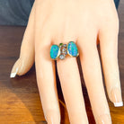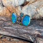 Discover the artistry of this striking Sterling Silver two-tone split ring design, where two freeform Australian Opal Doublets take centre stage in bezel settings. Each opal (12x9.3mm and 14x8mm) showcases a mesmerising play of yellow, red, blue, and green hues totalling 5.19ct. Complementing the opals are a Tsavorite, Blue Topaz, and three Tanzanites (0.40ct combined), creating a sophisticated colour palette. The unique split ring design adds contemporary elegance to this one-of-a-kind piece. Finger size N 1/2. Weight: 7.4g.