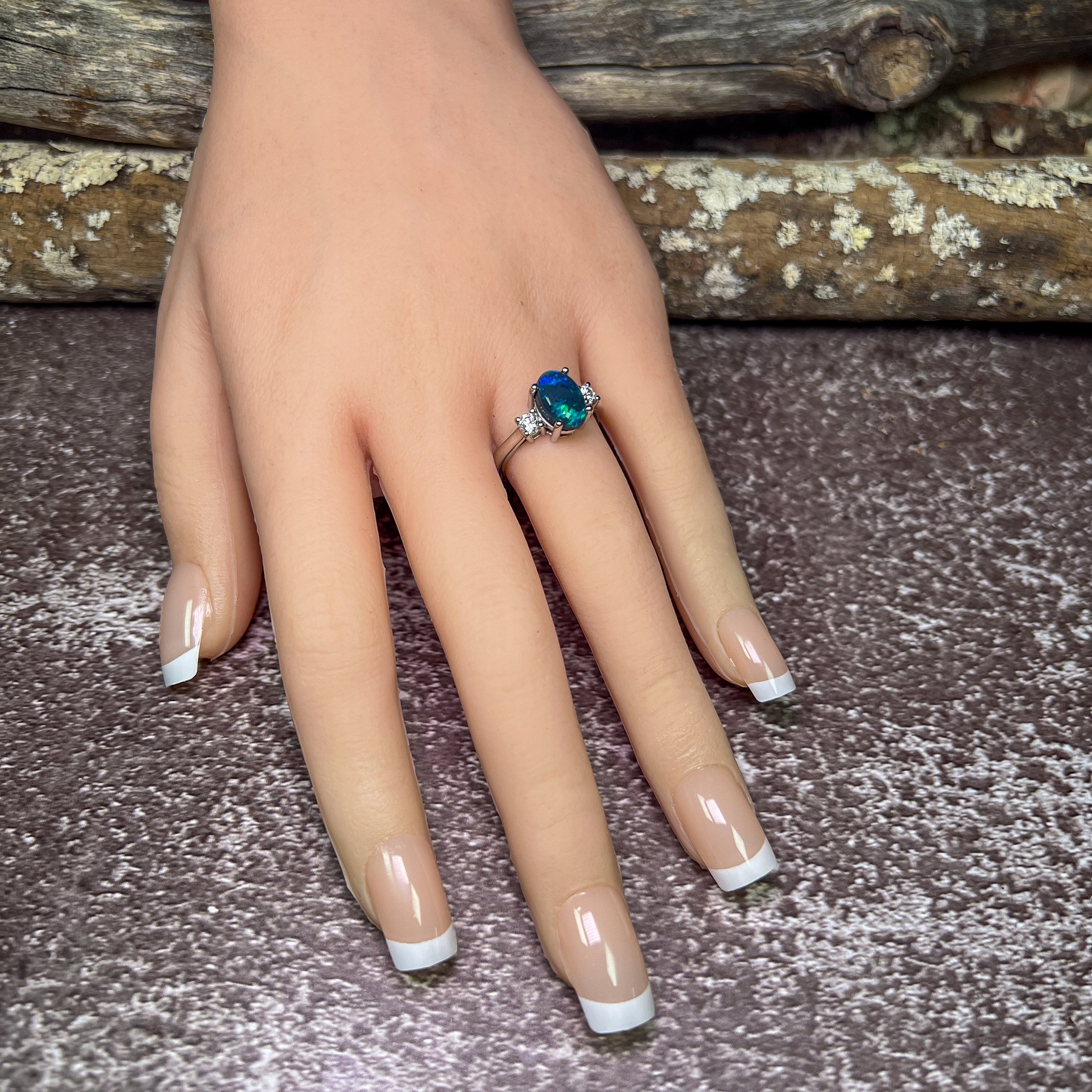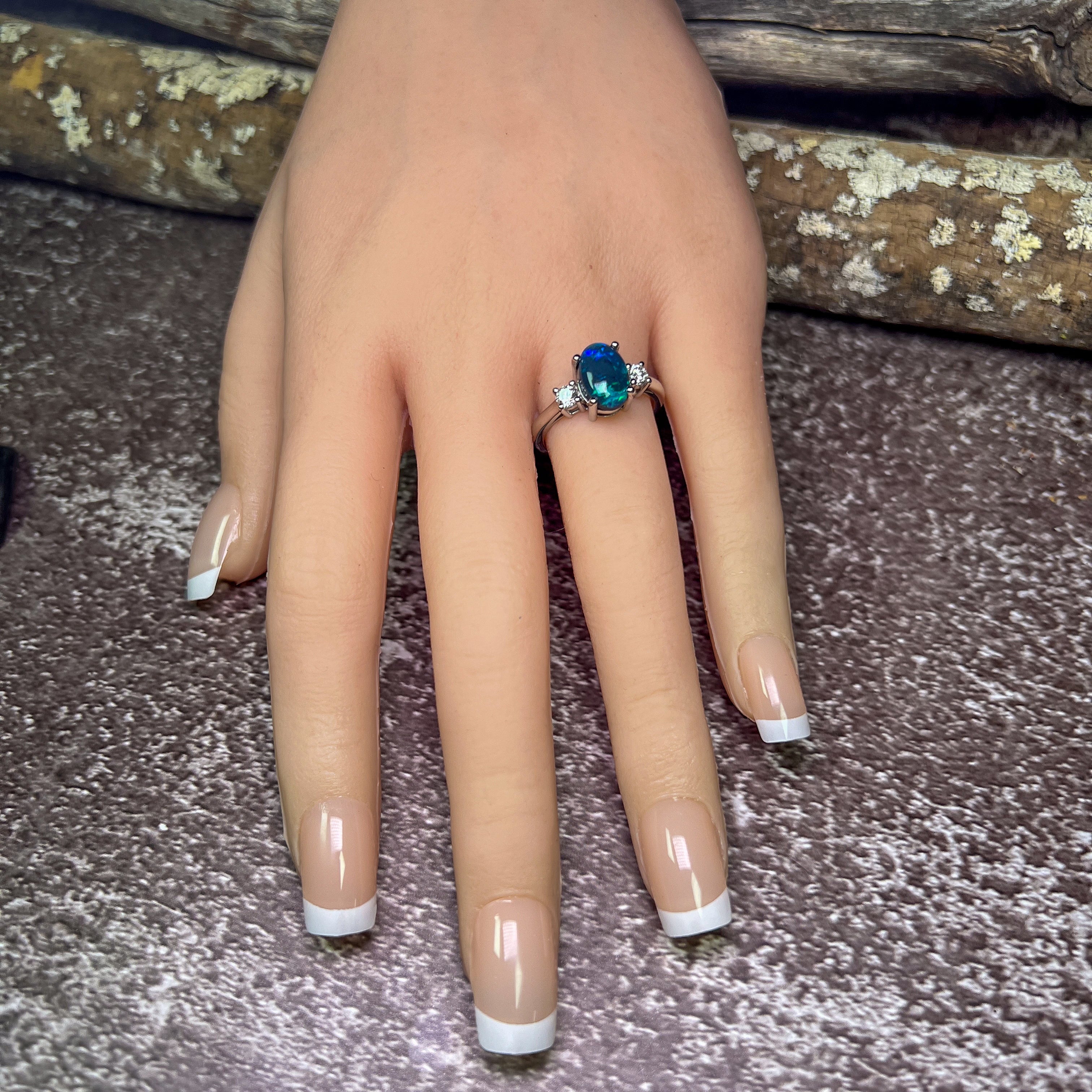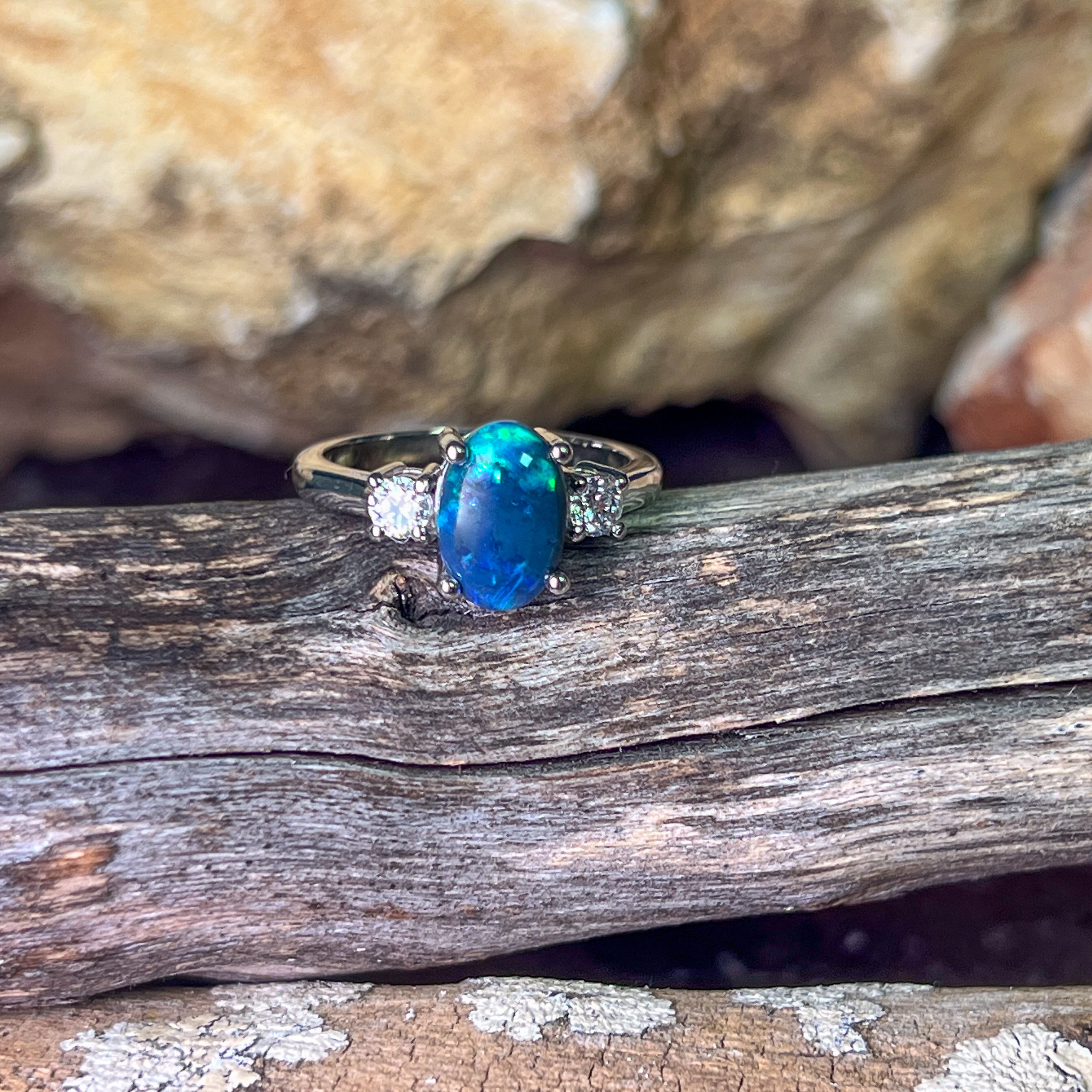 Experience the luxury and opulence of our Platinum Black Opal and Diamond trilogy ring. Featuring a stunning deep ocean Blue opal, this trilogy design will take your breath away. Elevate your engagement with a touch of elegance.
