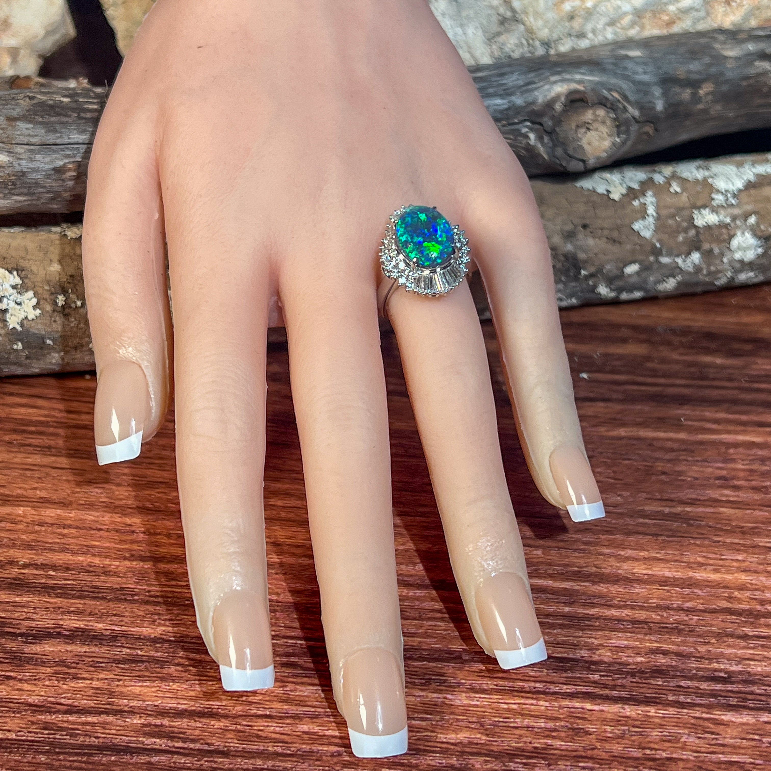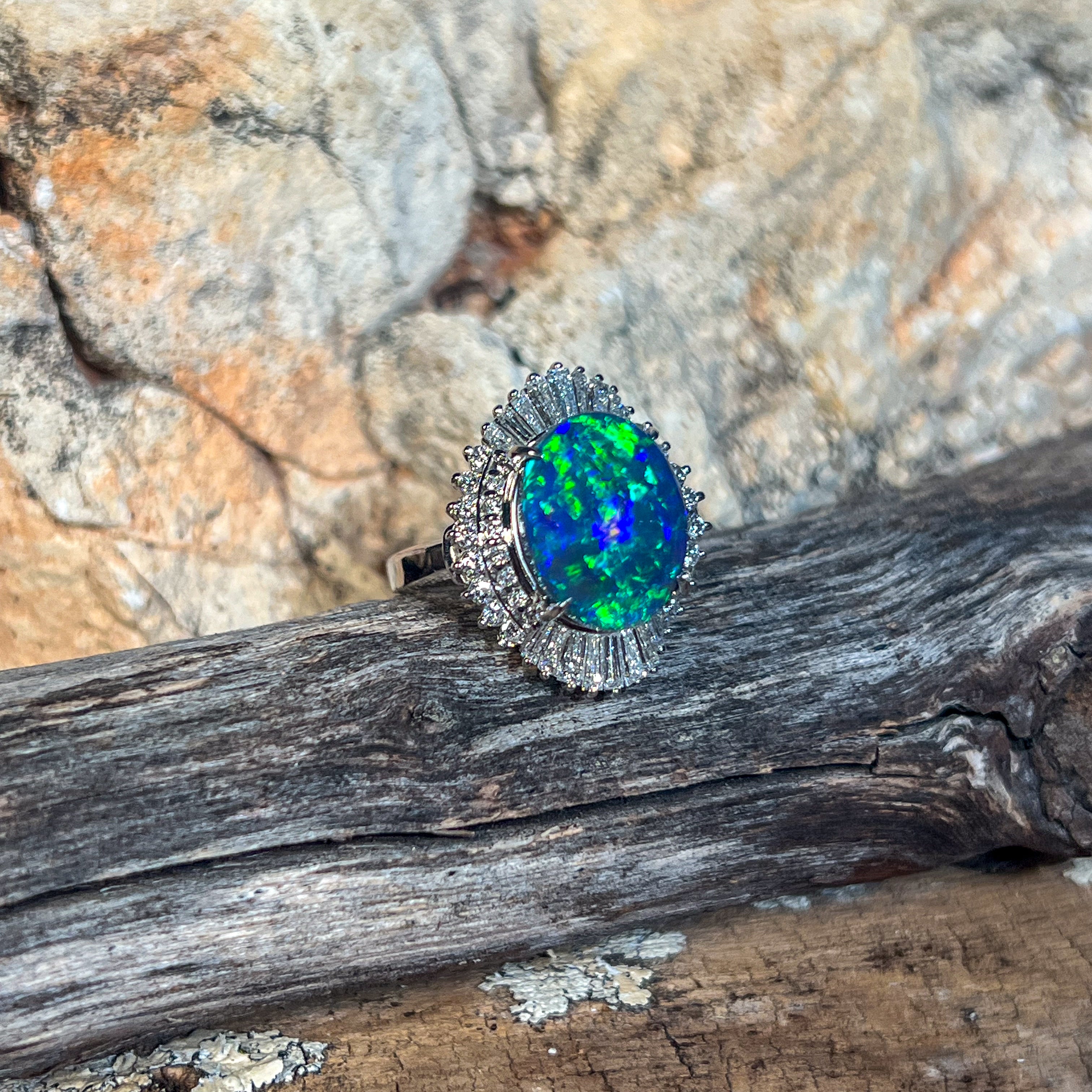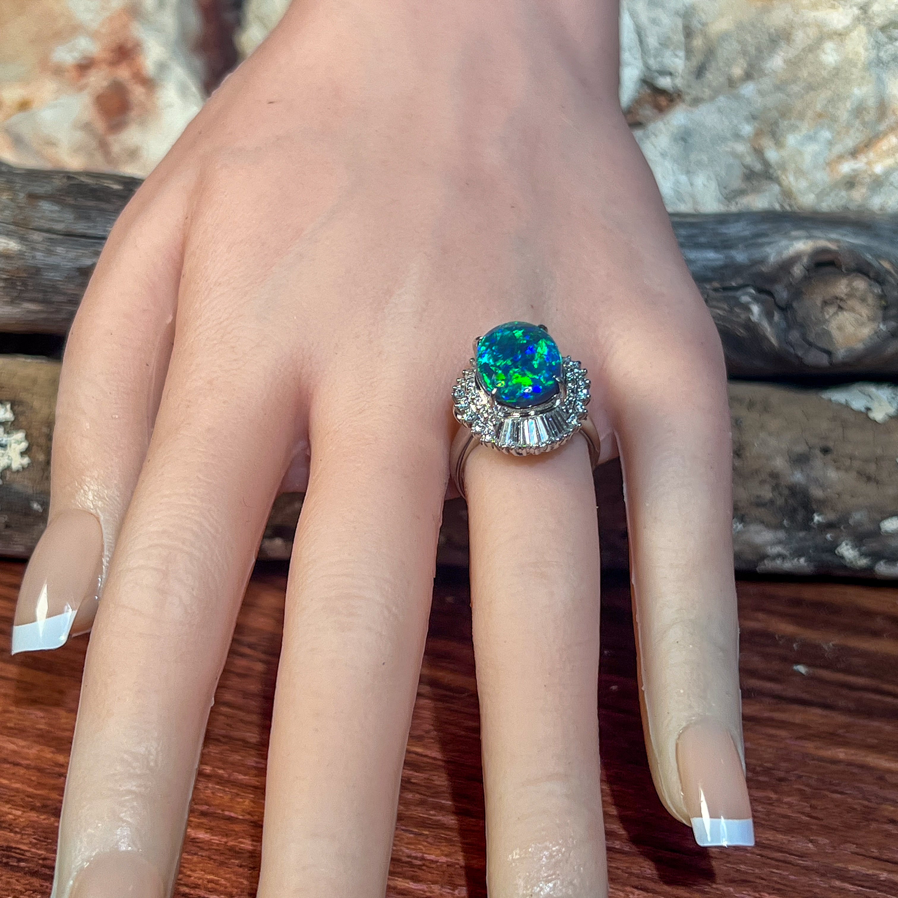 Elevate your style with this stunning platinum cluster ring featuring a mesmerizing 4.82ct black opal surrounded by sparkling diamonds. Its bold design makes a powerful statement, perfect for those who appreciate unique elegance and timeless luxury. This ring not only captivates with its vibrant colors but also offers lasting quality and sophistication for any special occasion.