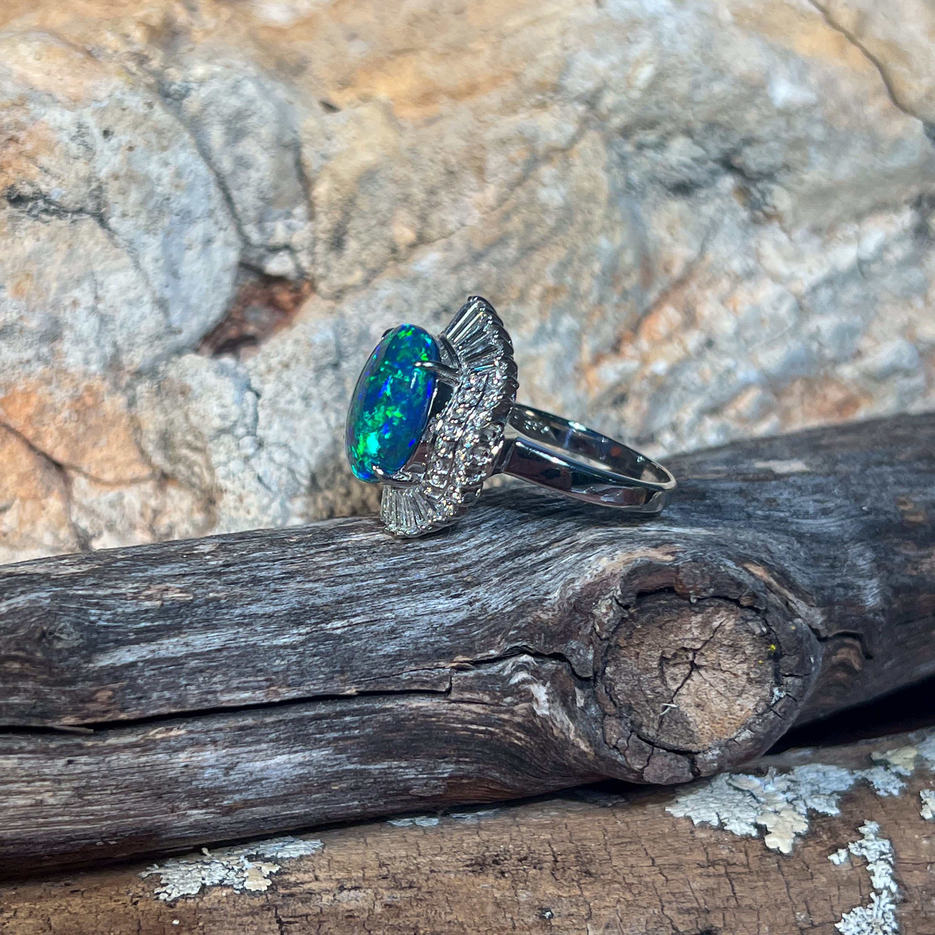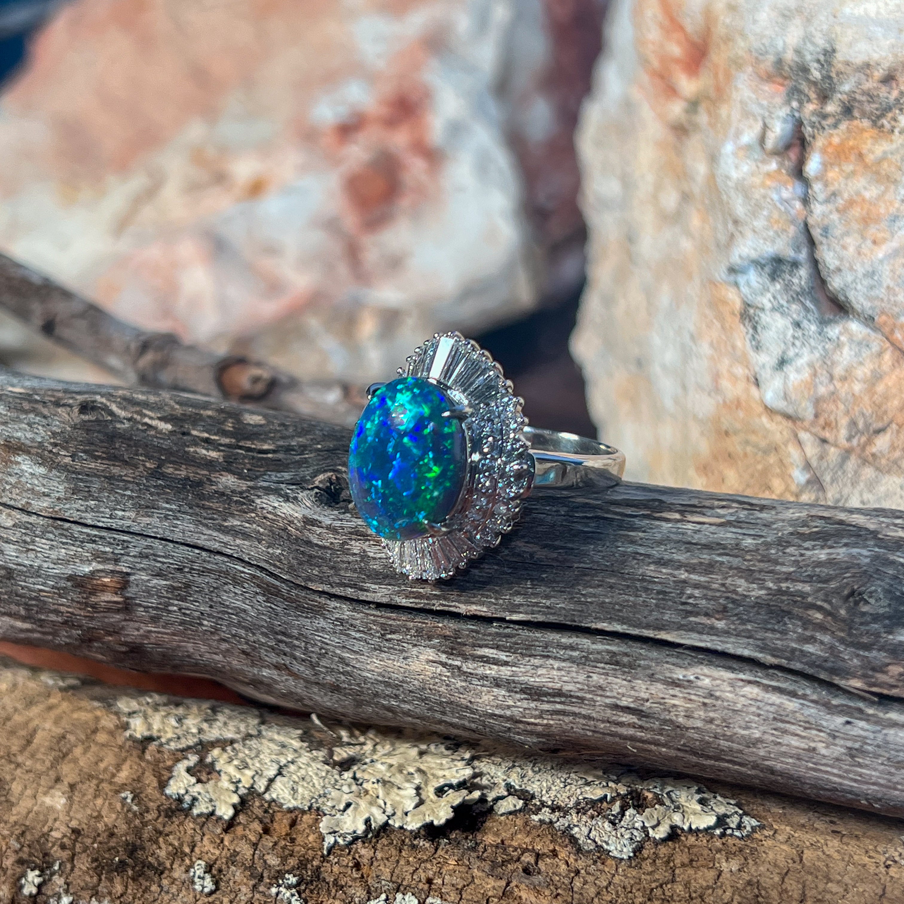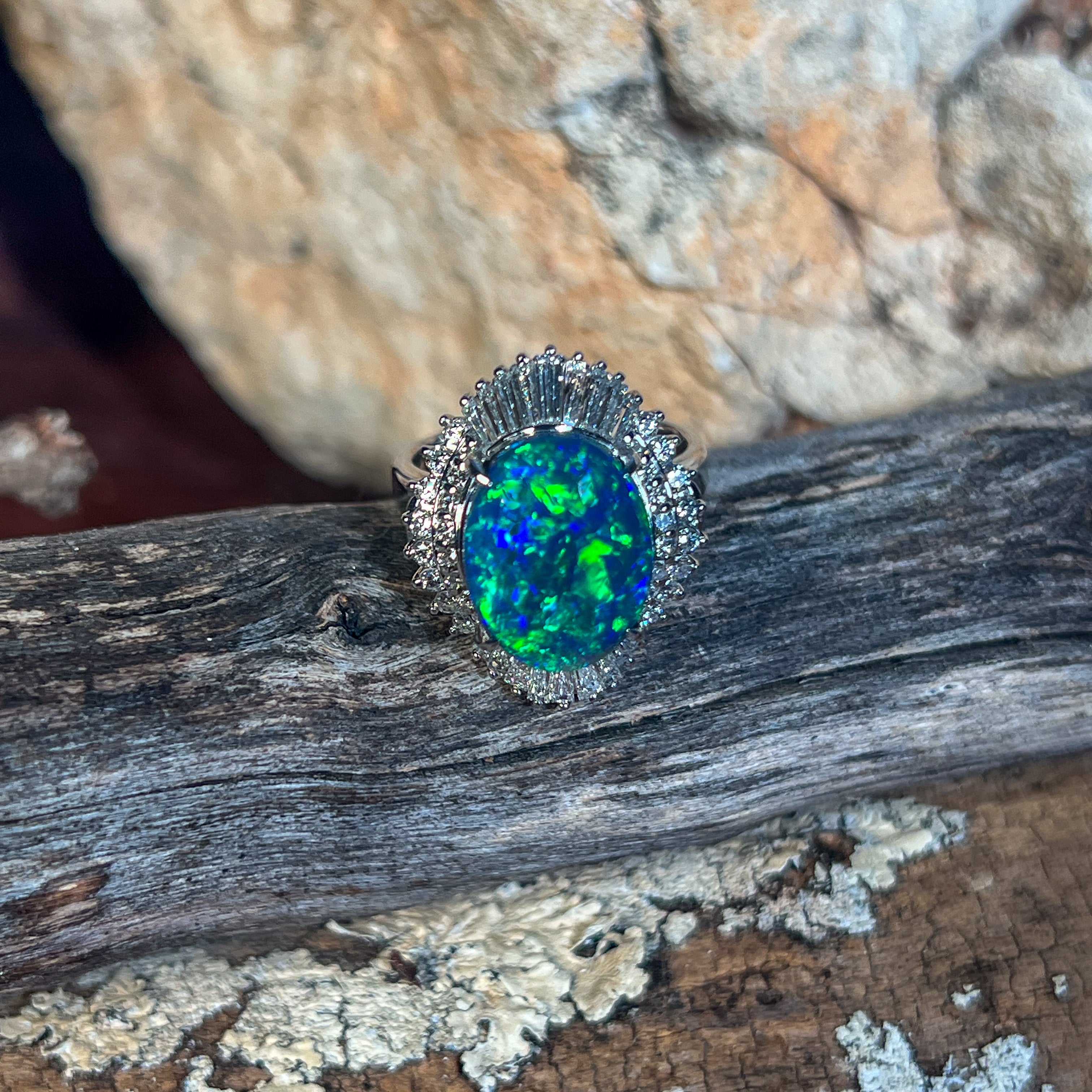 Elevate your style with this stunning platinum cluster ring featuring a mesmerizing 4.82ct black opal surrounded by sparkling diamonds. Its bold design makes a powerful statement, perfect for those who appreciate unique elegance and timeless luxury. This ring not only captivates with its vibrant colors but also offers lasting quality and sophistication for any special occasion.